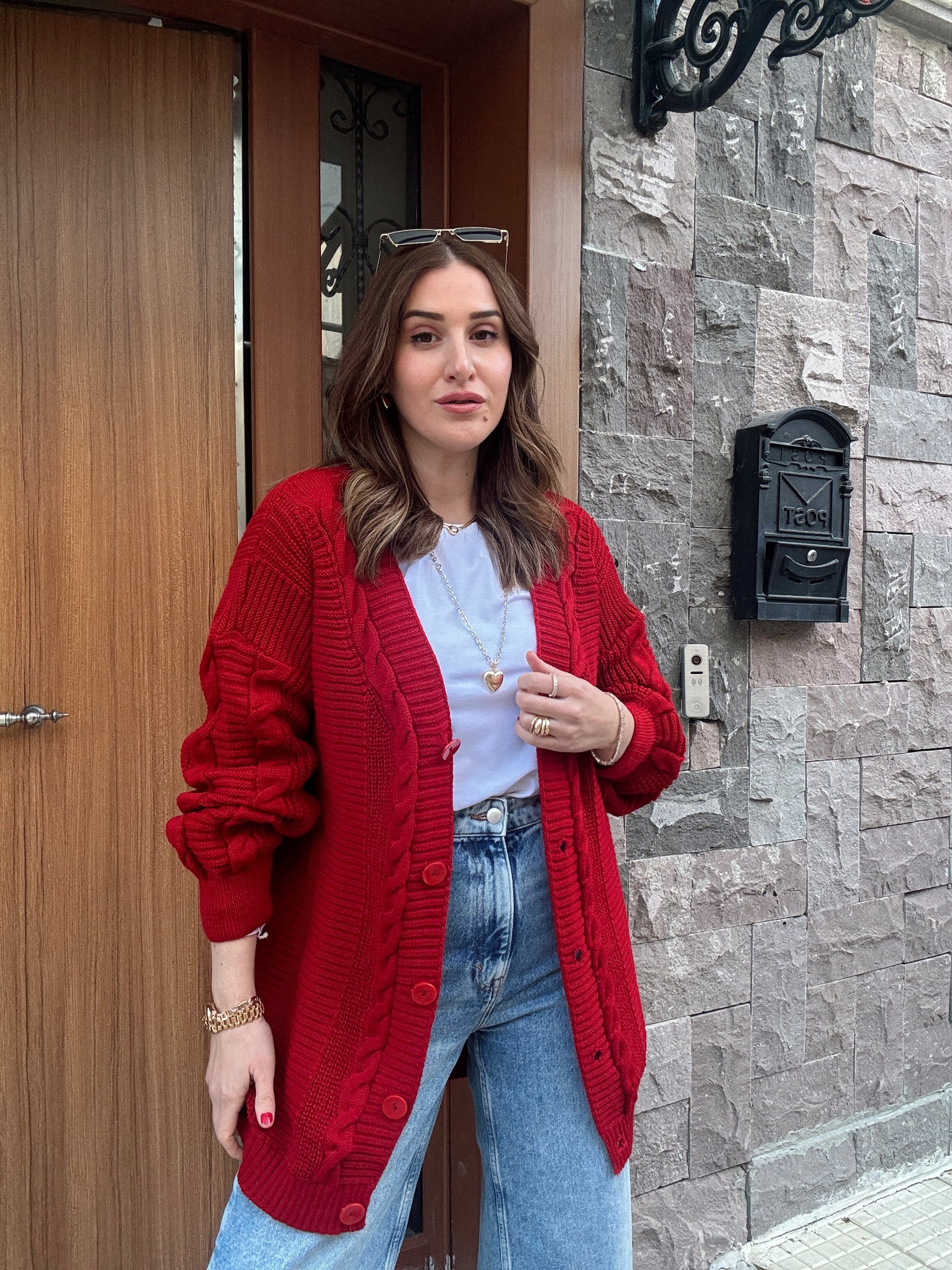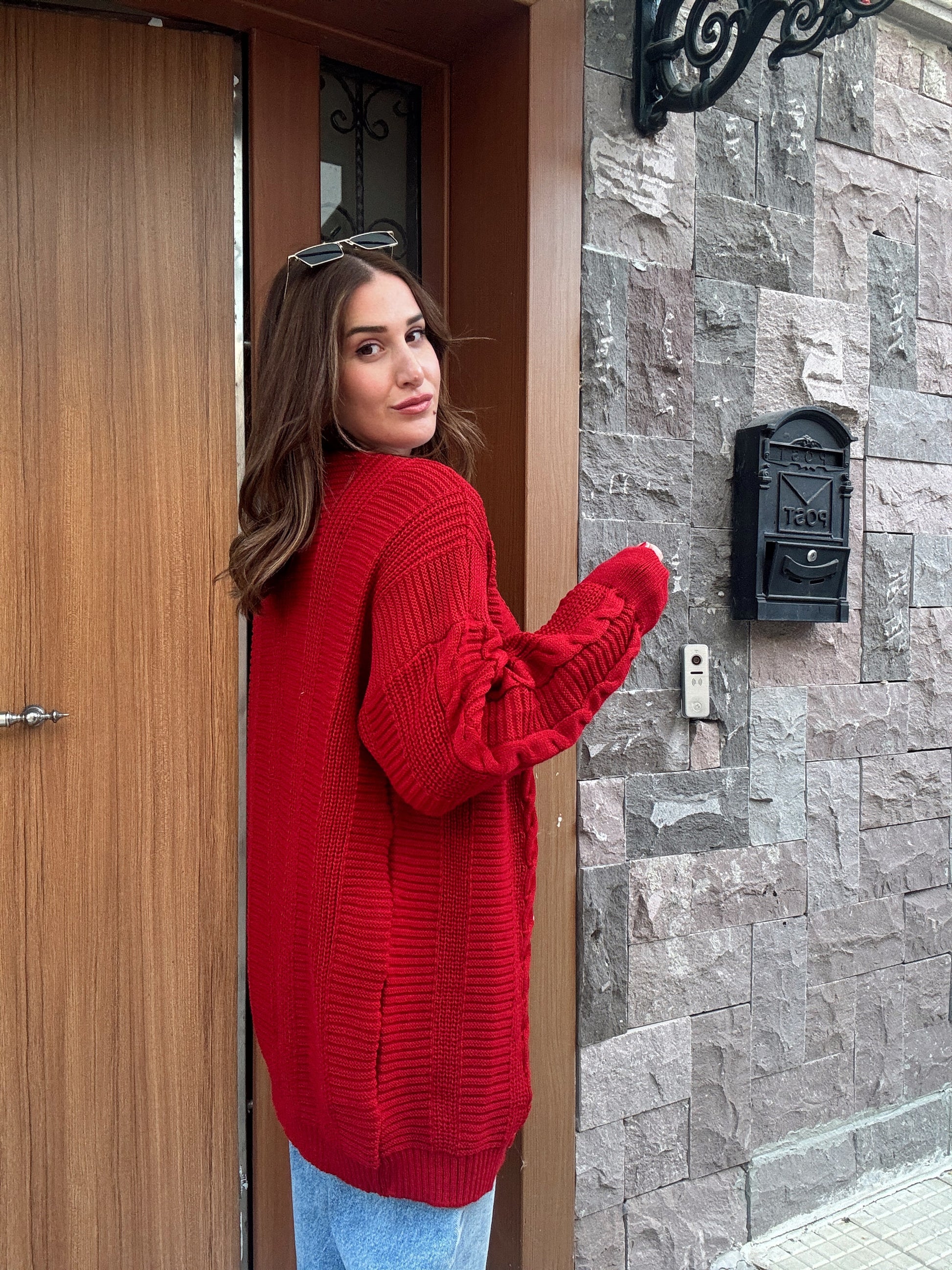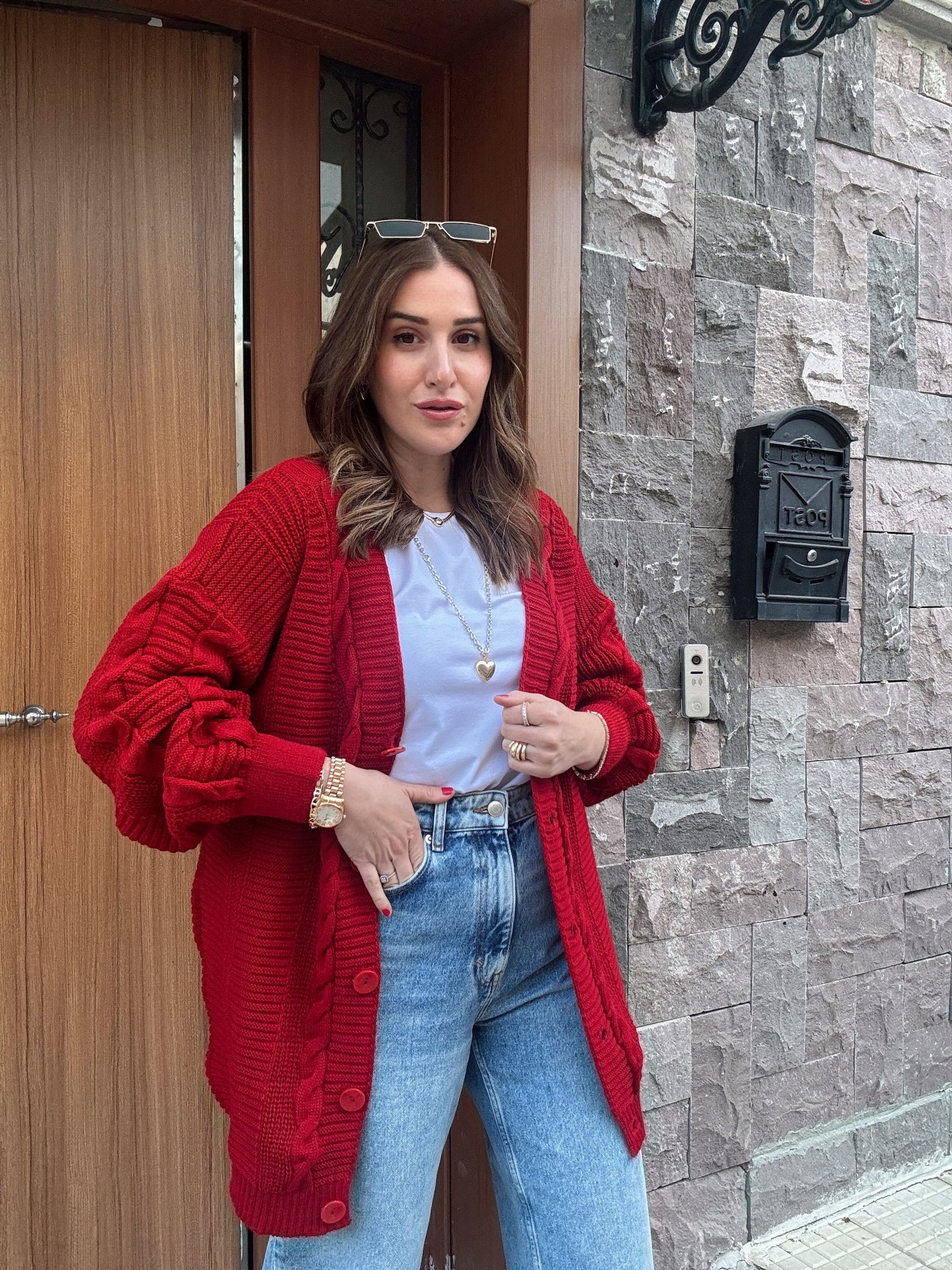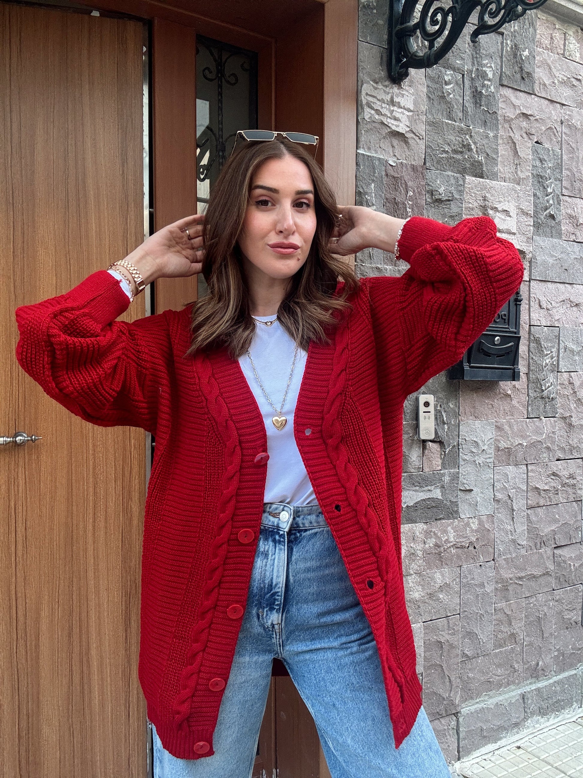 5 Düğmeli Saç Örgü Biyeli Hırka KIRMIZI