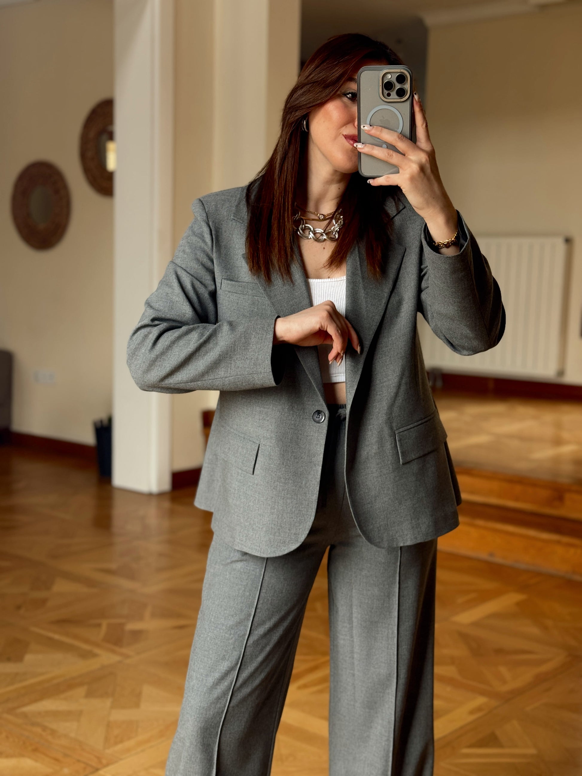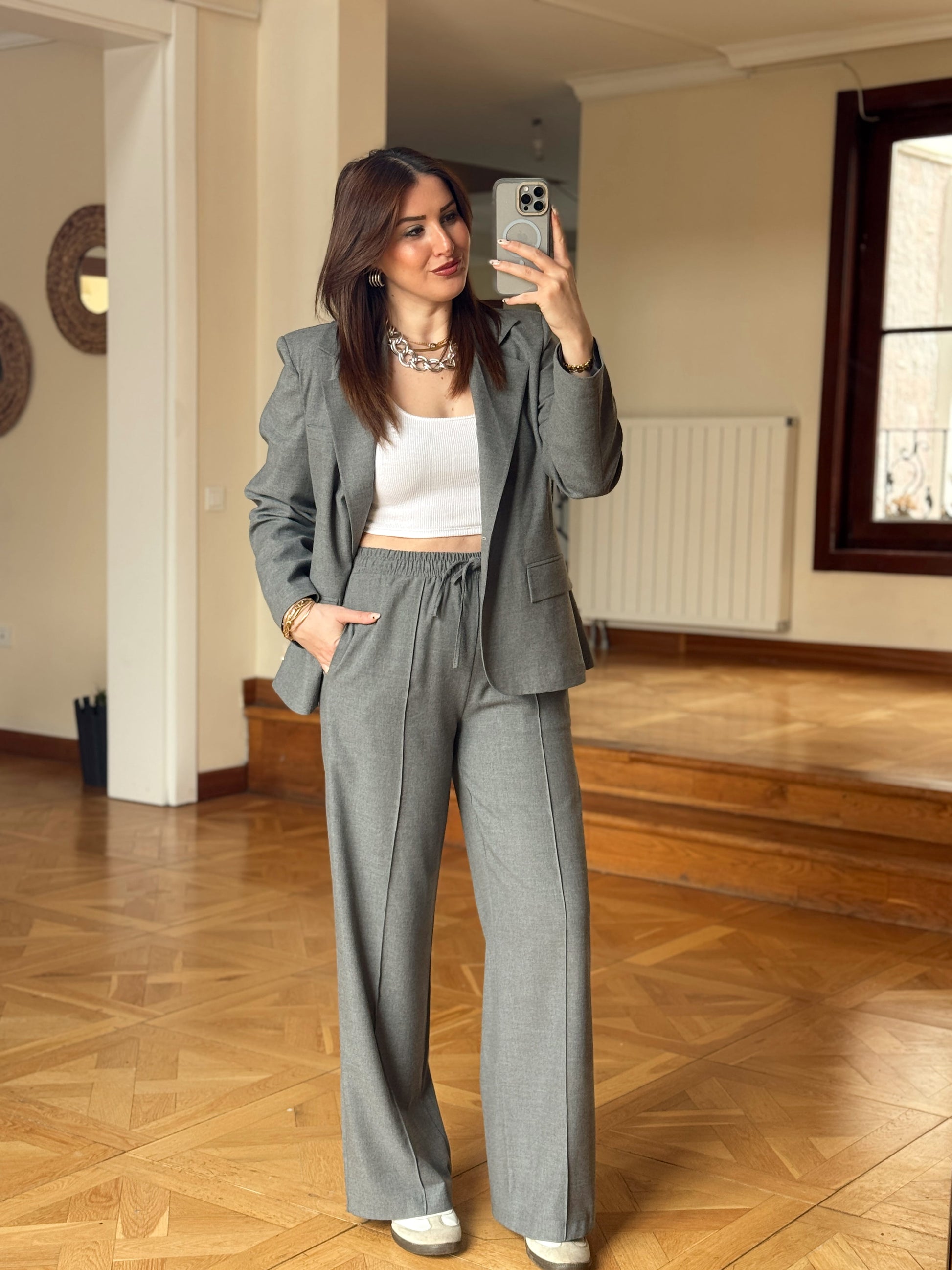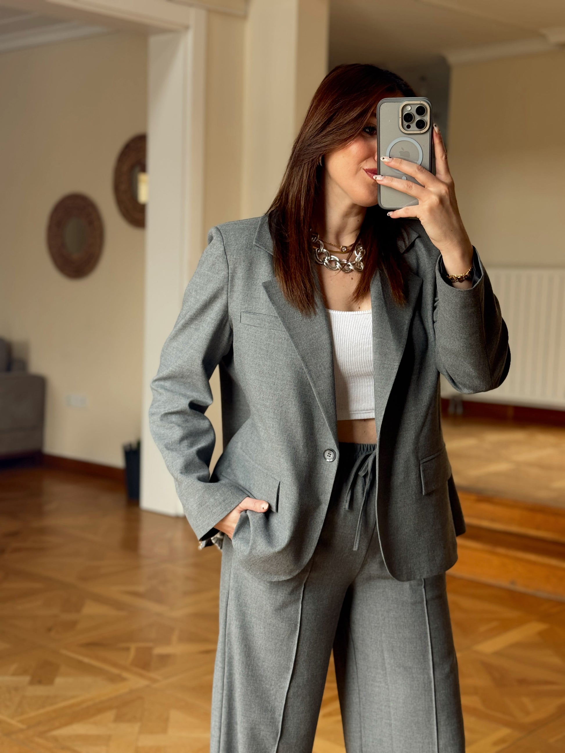 Arkası Düğme Detaylı Çizgili Takım-ANTRASİT