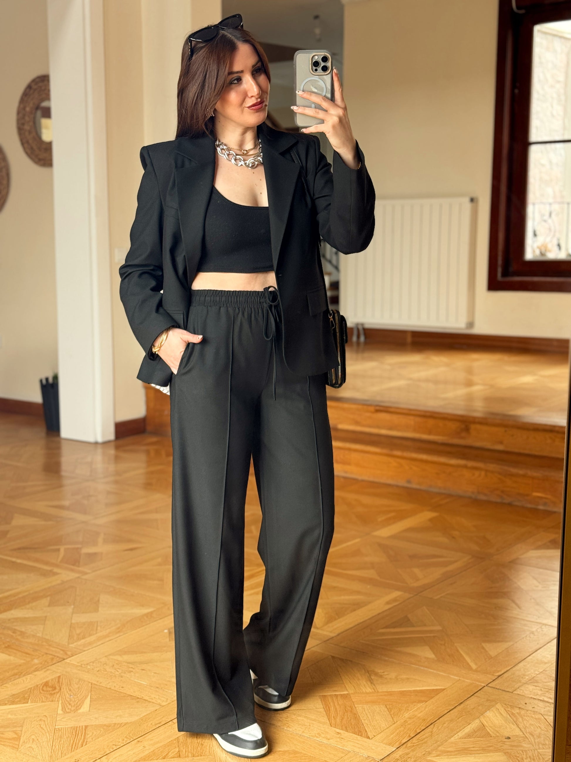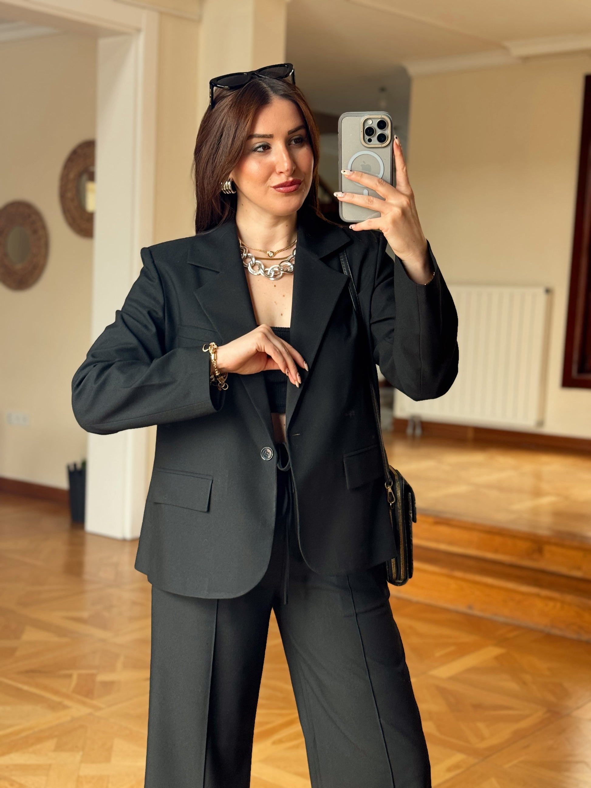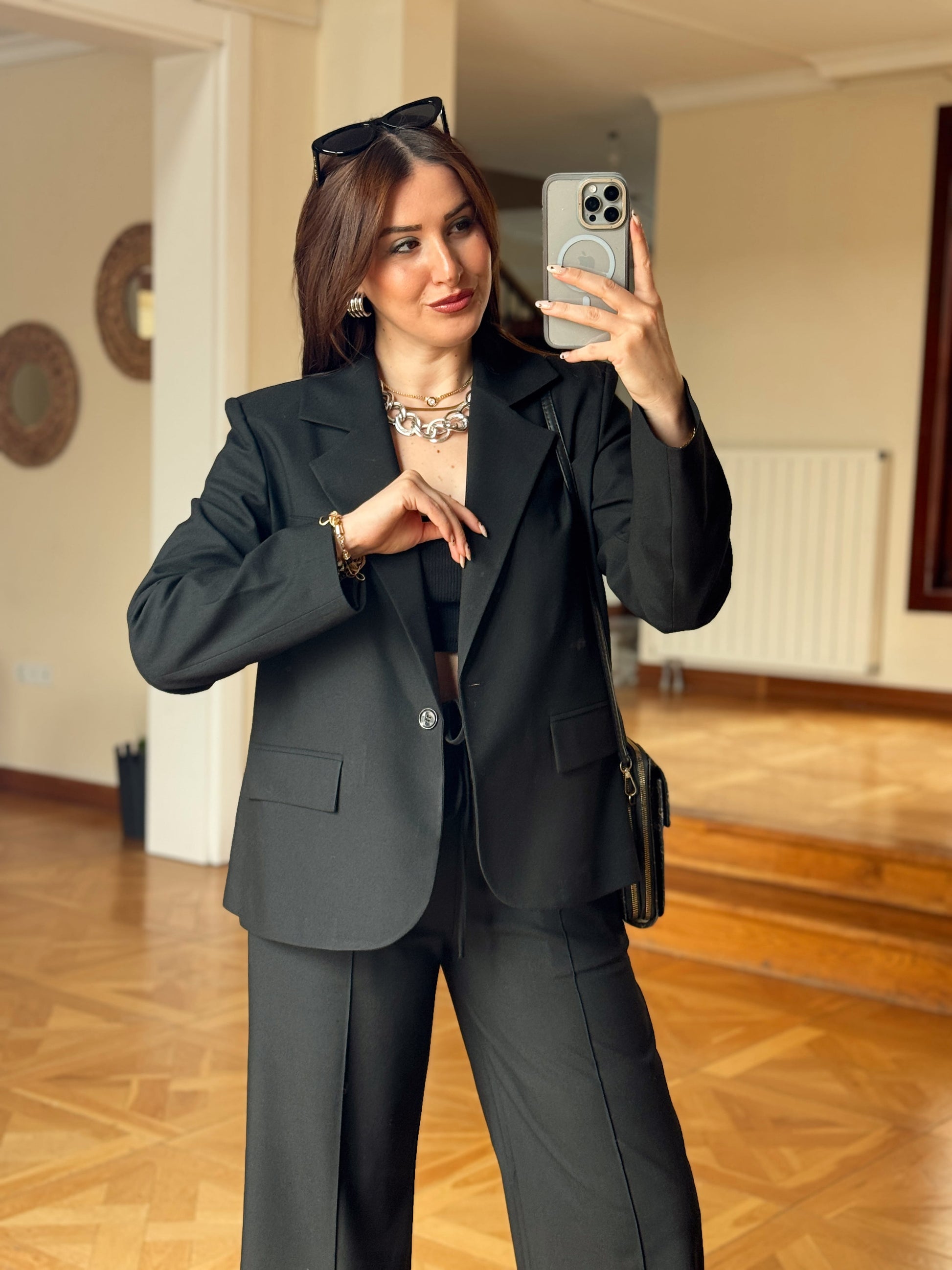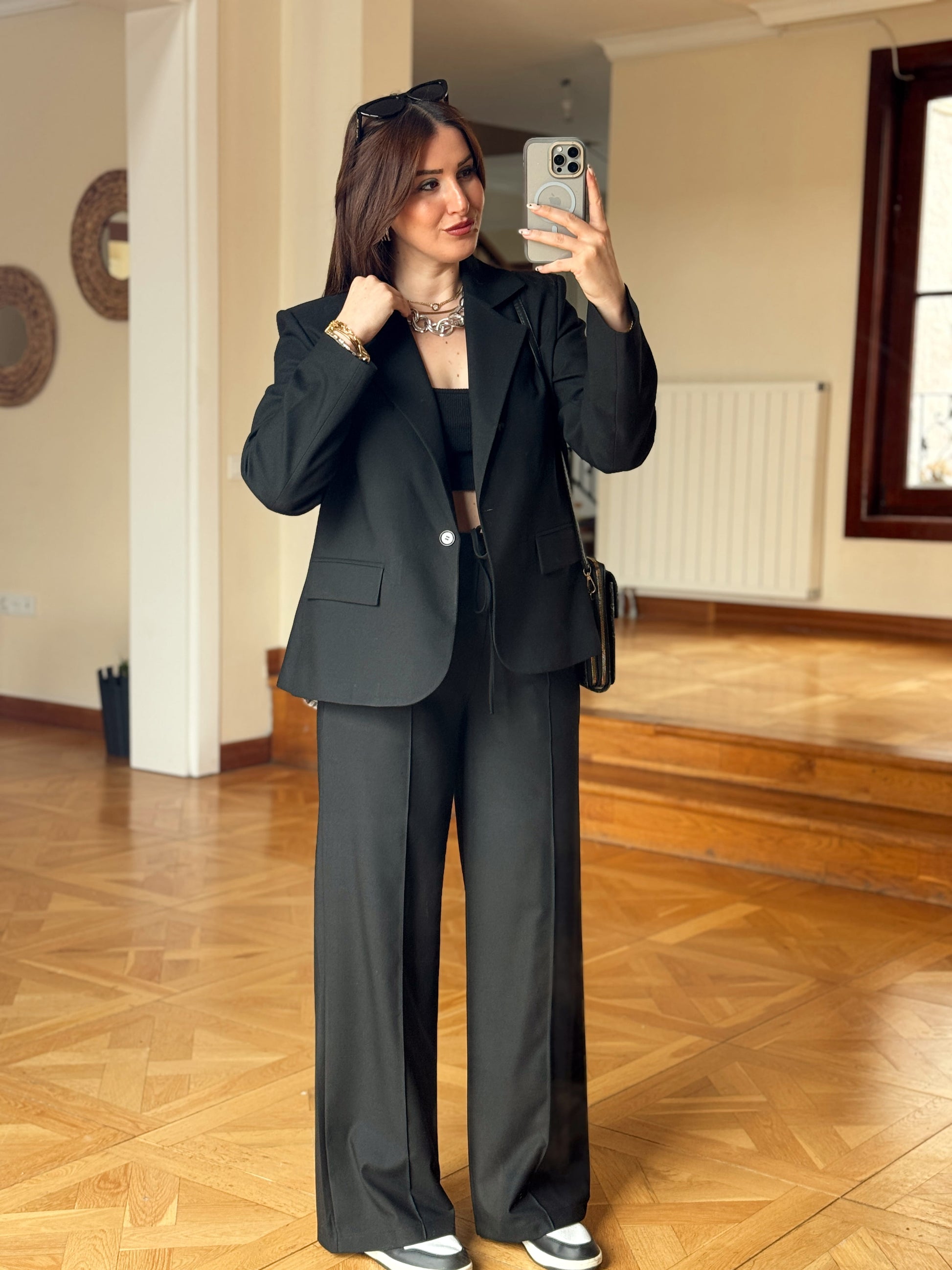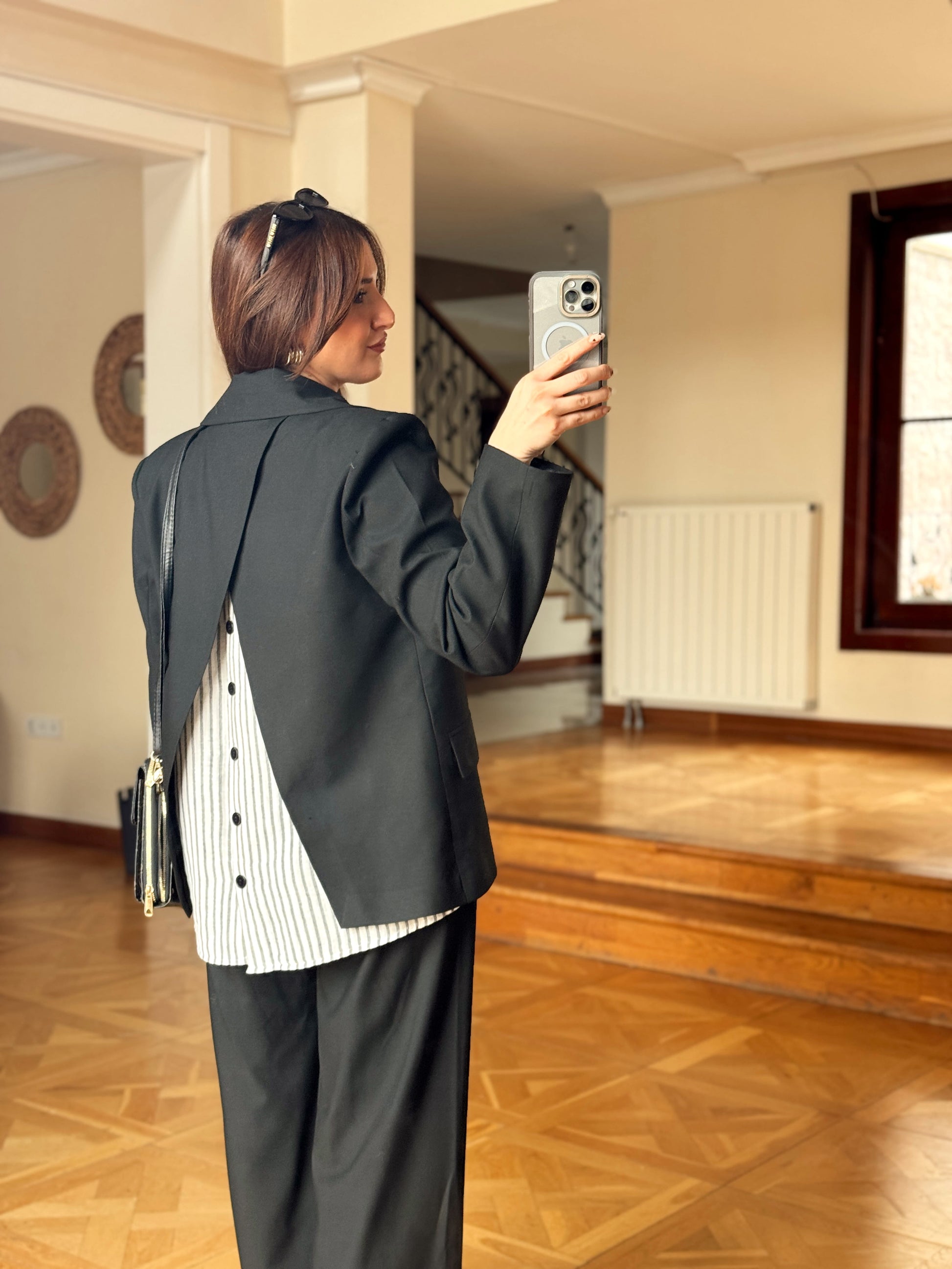 Arkası Düğme Detaylı Çizgili Takım-SİYAH