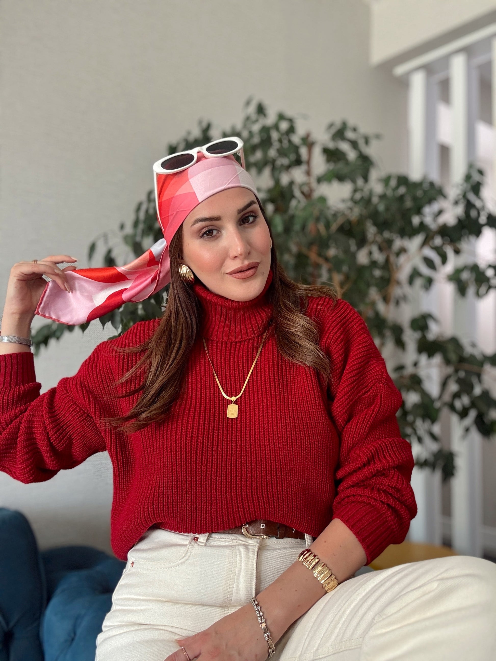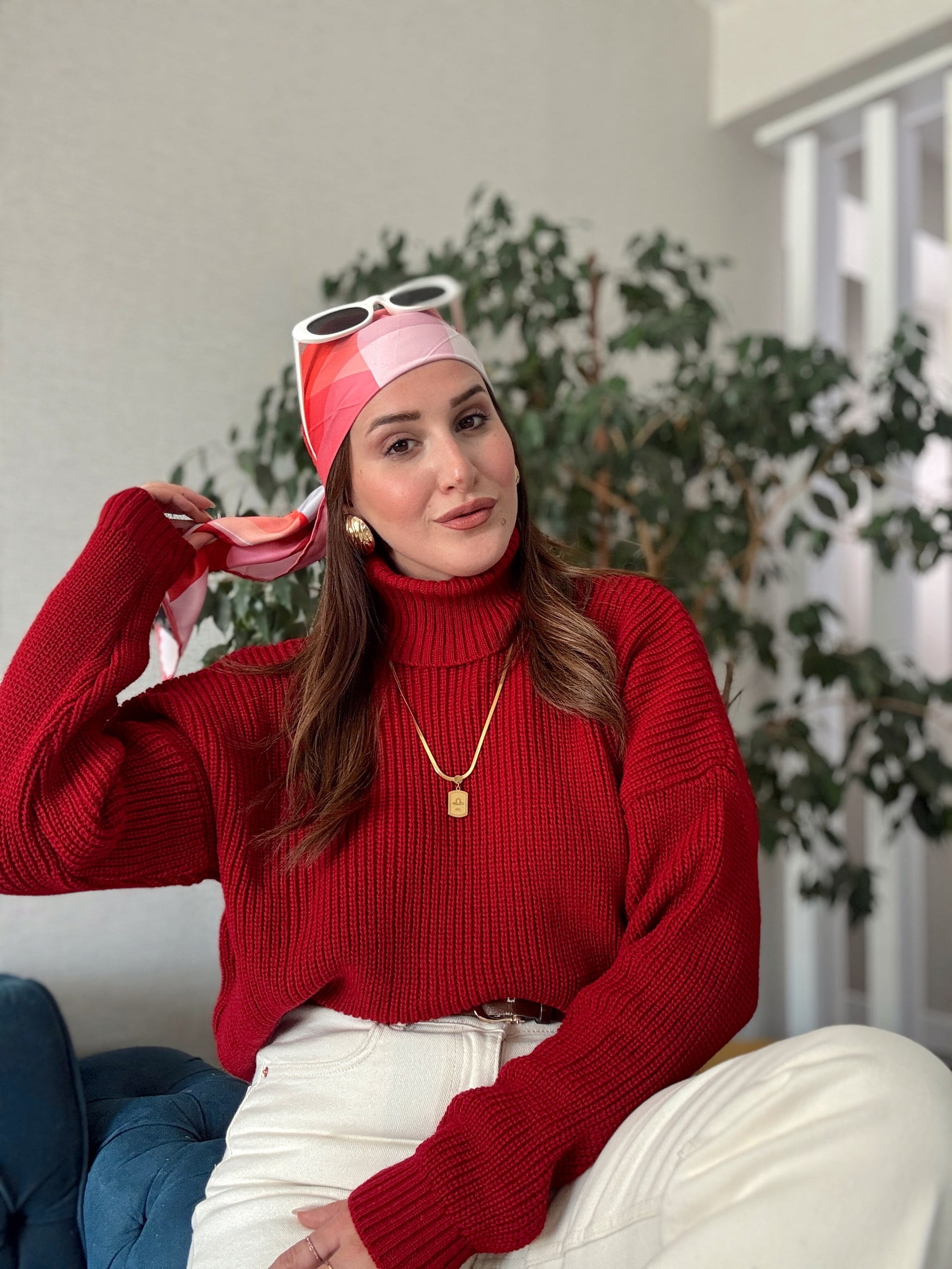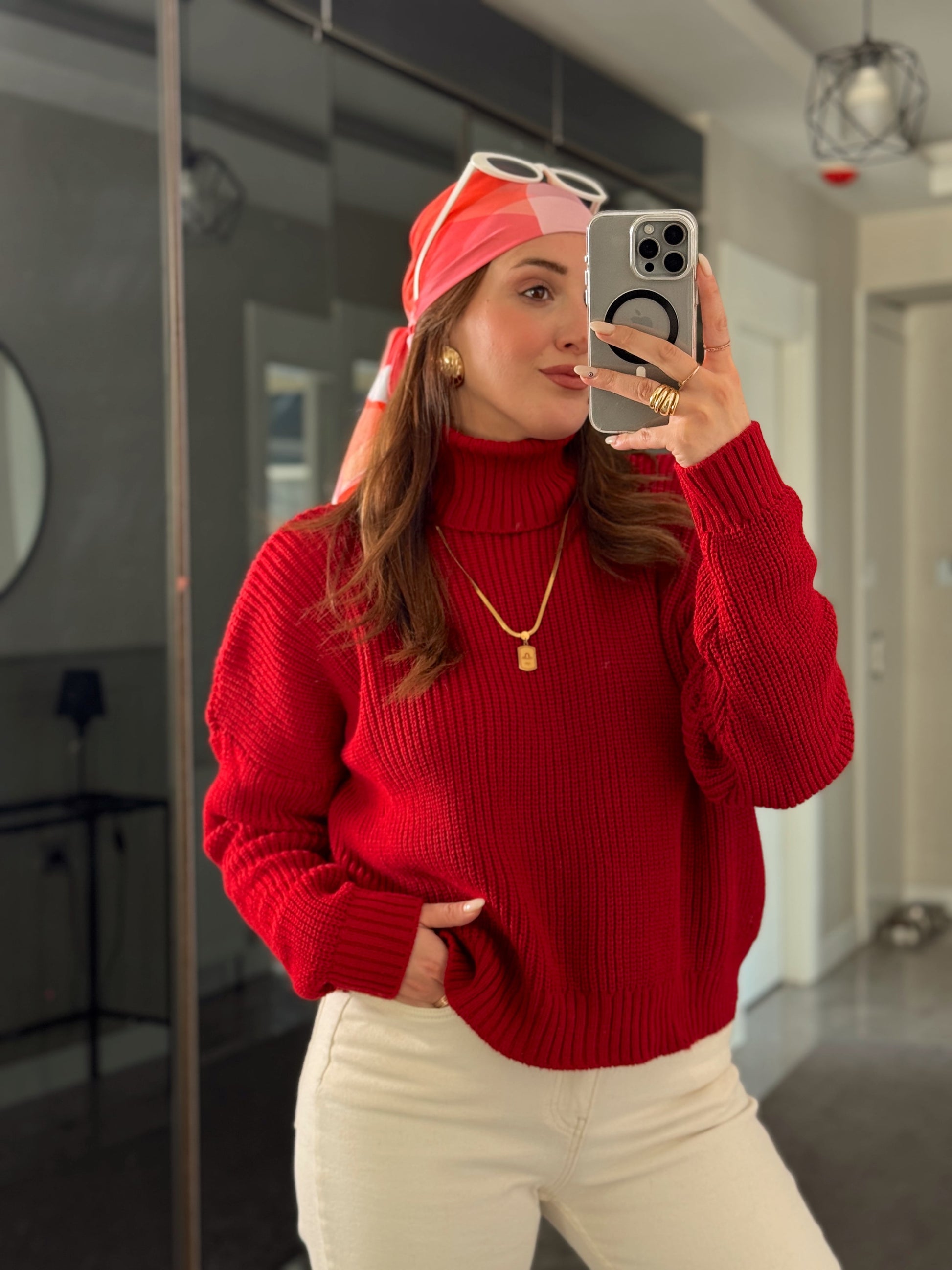 Balıkçı Yaka Selanik Örgü Kazak KIRMIZI