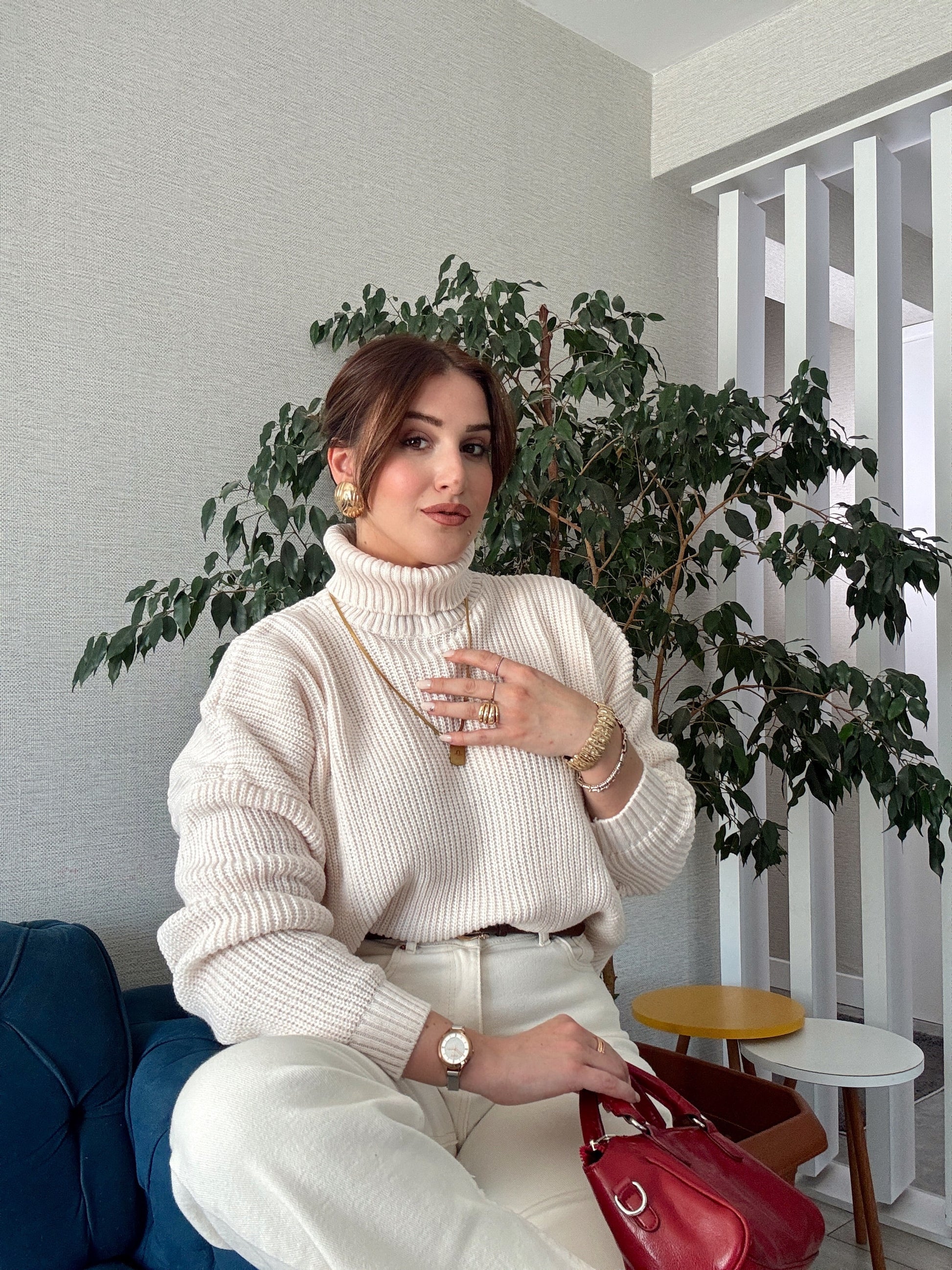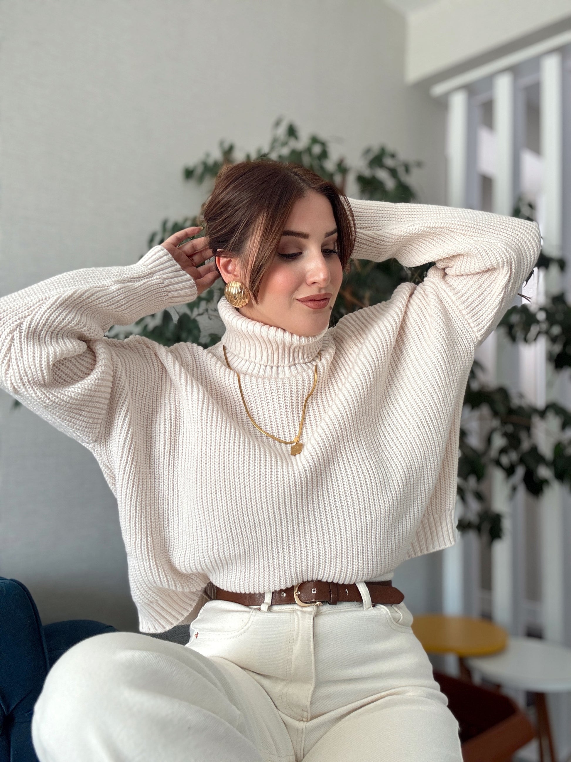 Balıkçı Yaka Selanik Örgü Kazak LATTE