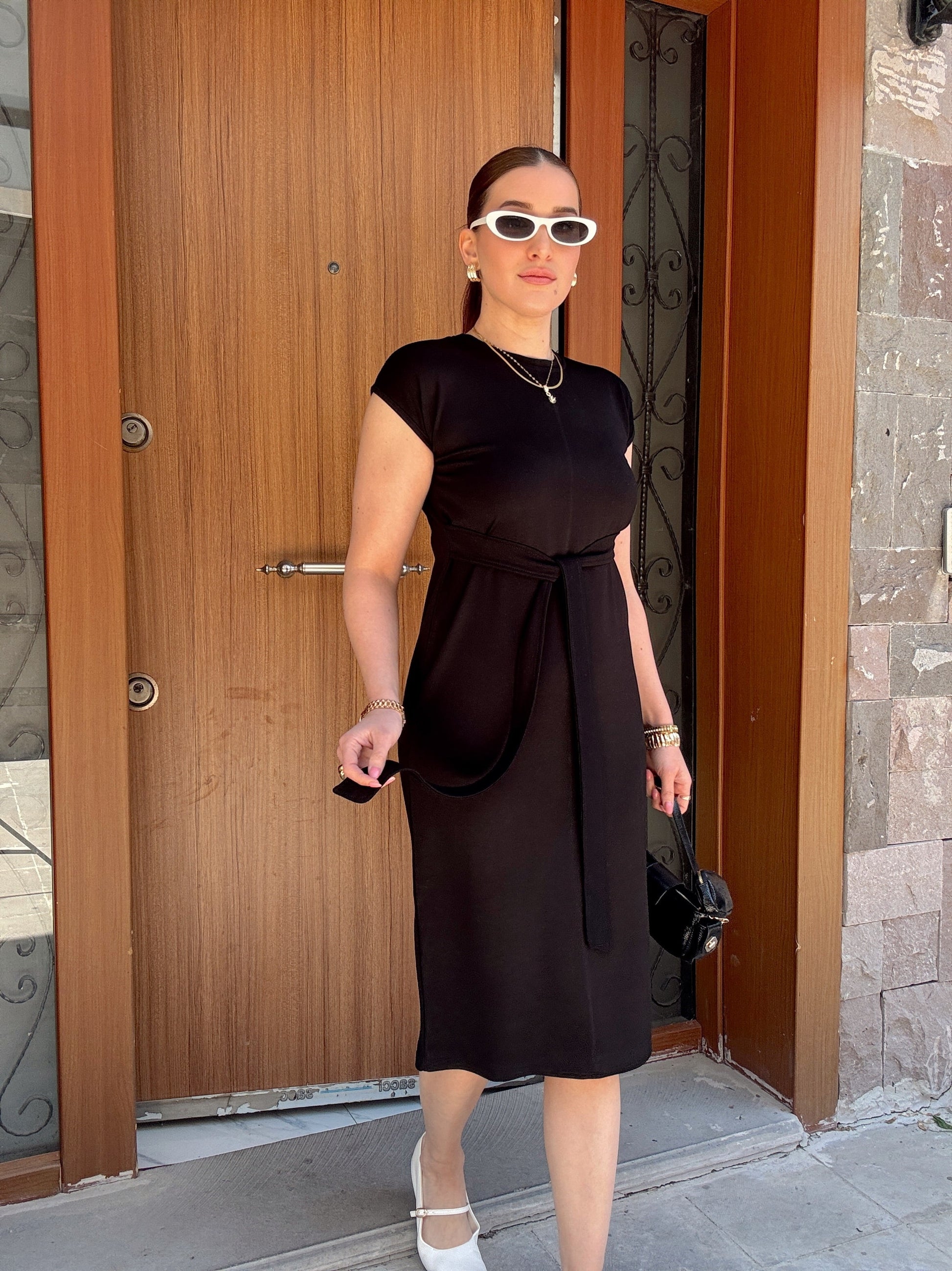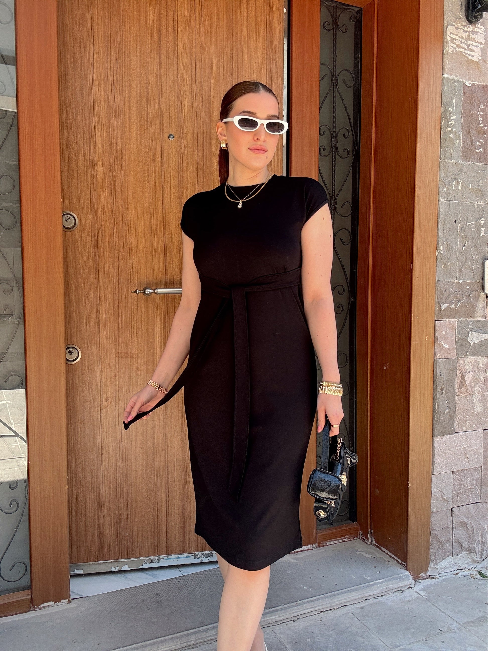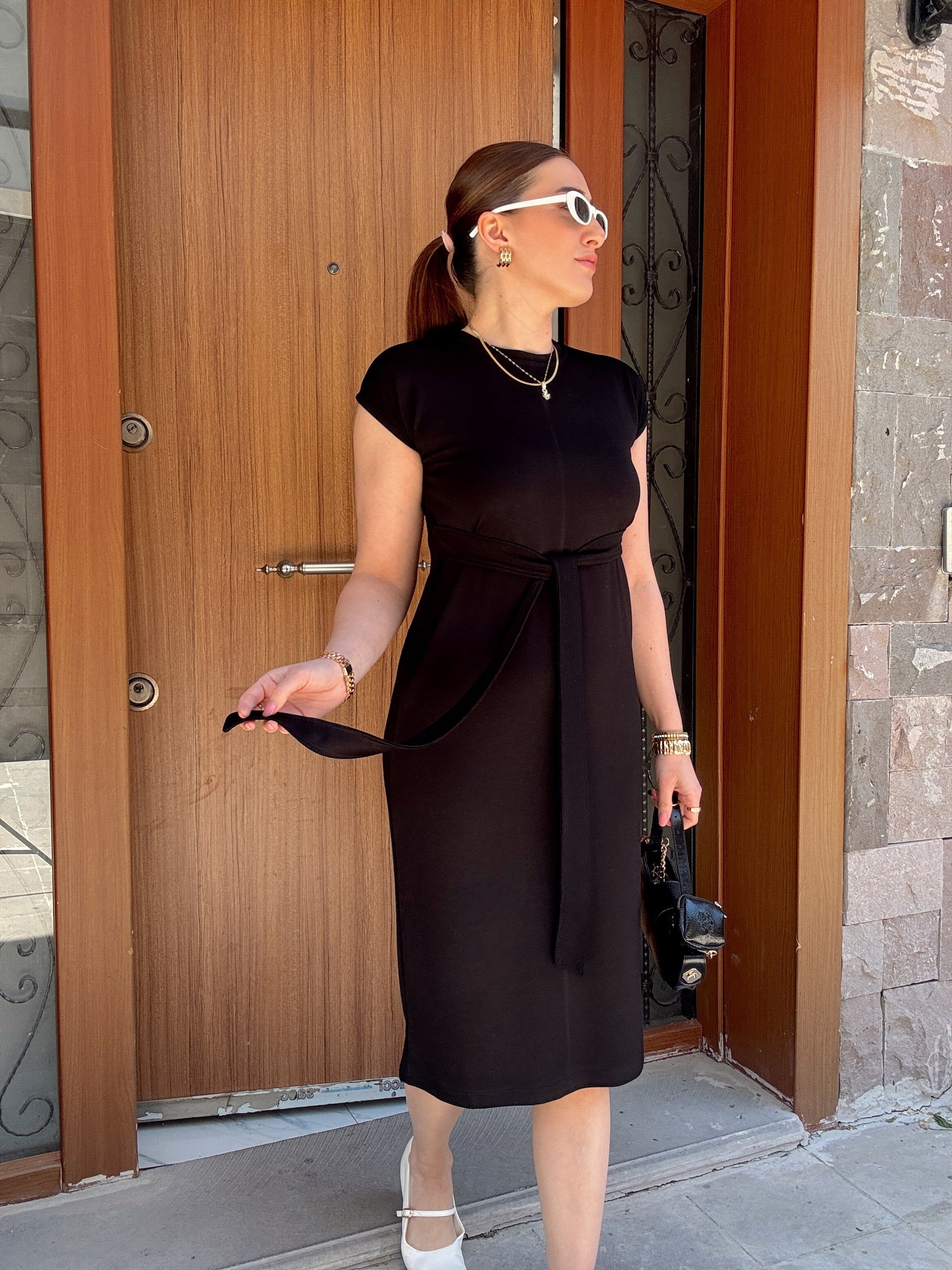 Belden Kemerli Yarım Kol Modal Elbise Siyah