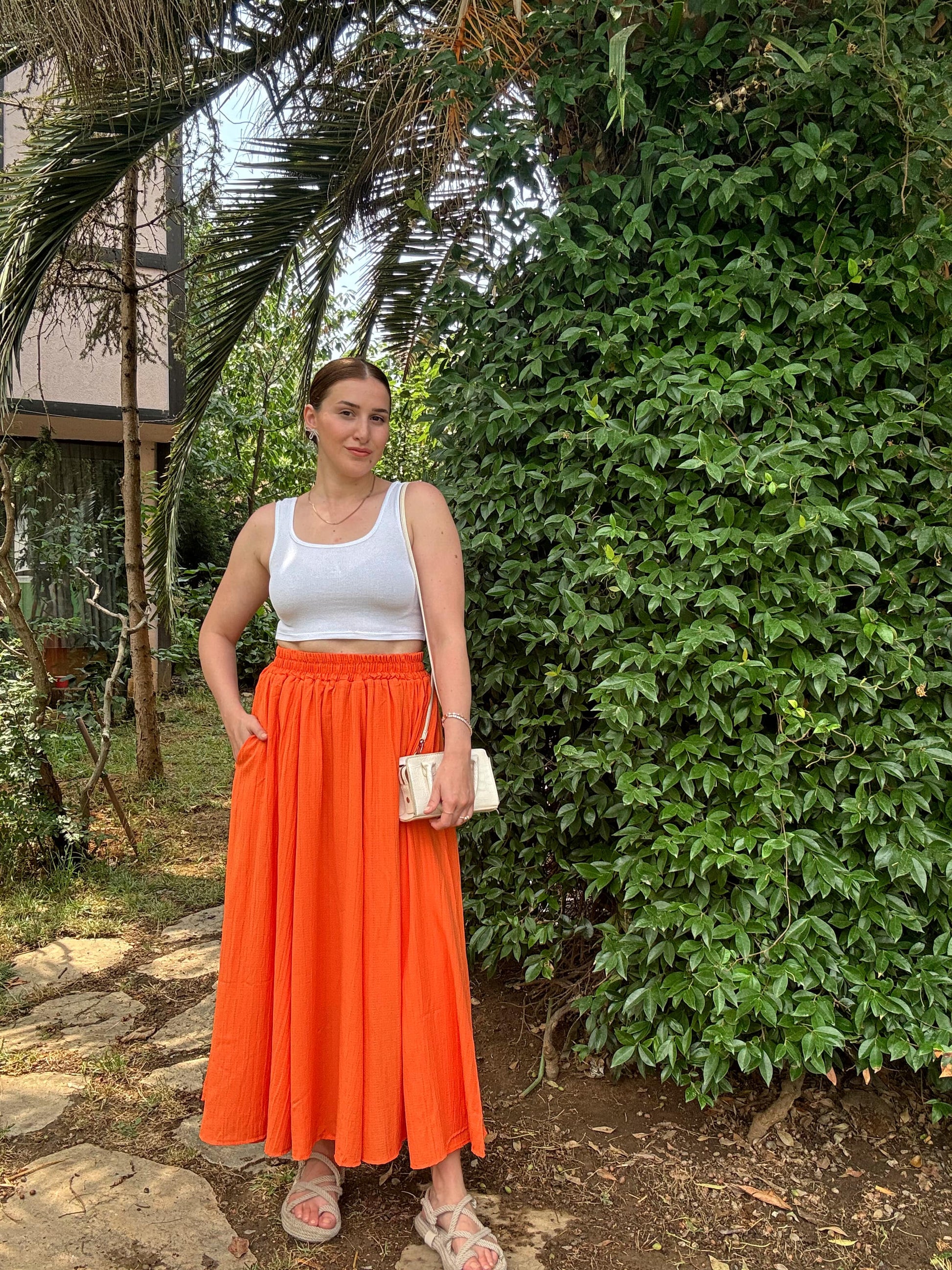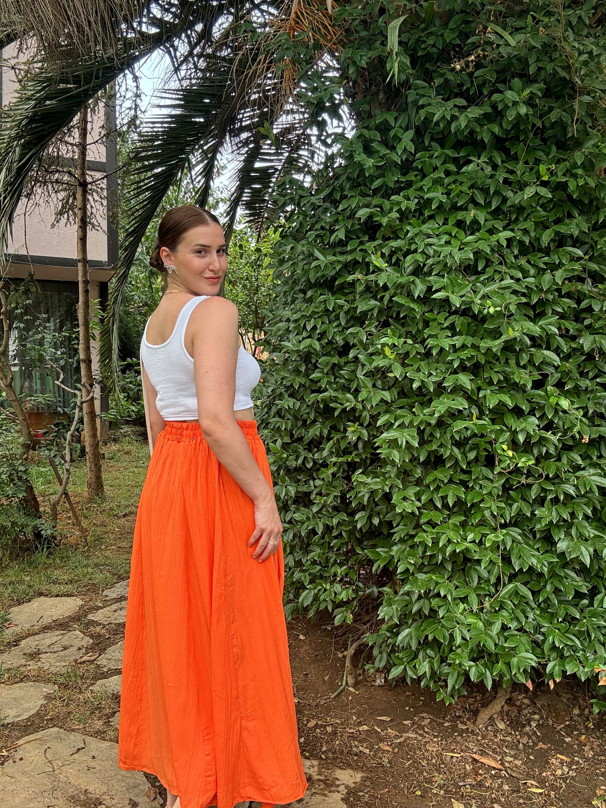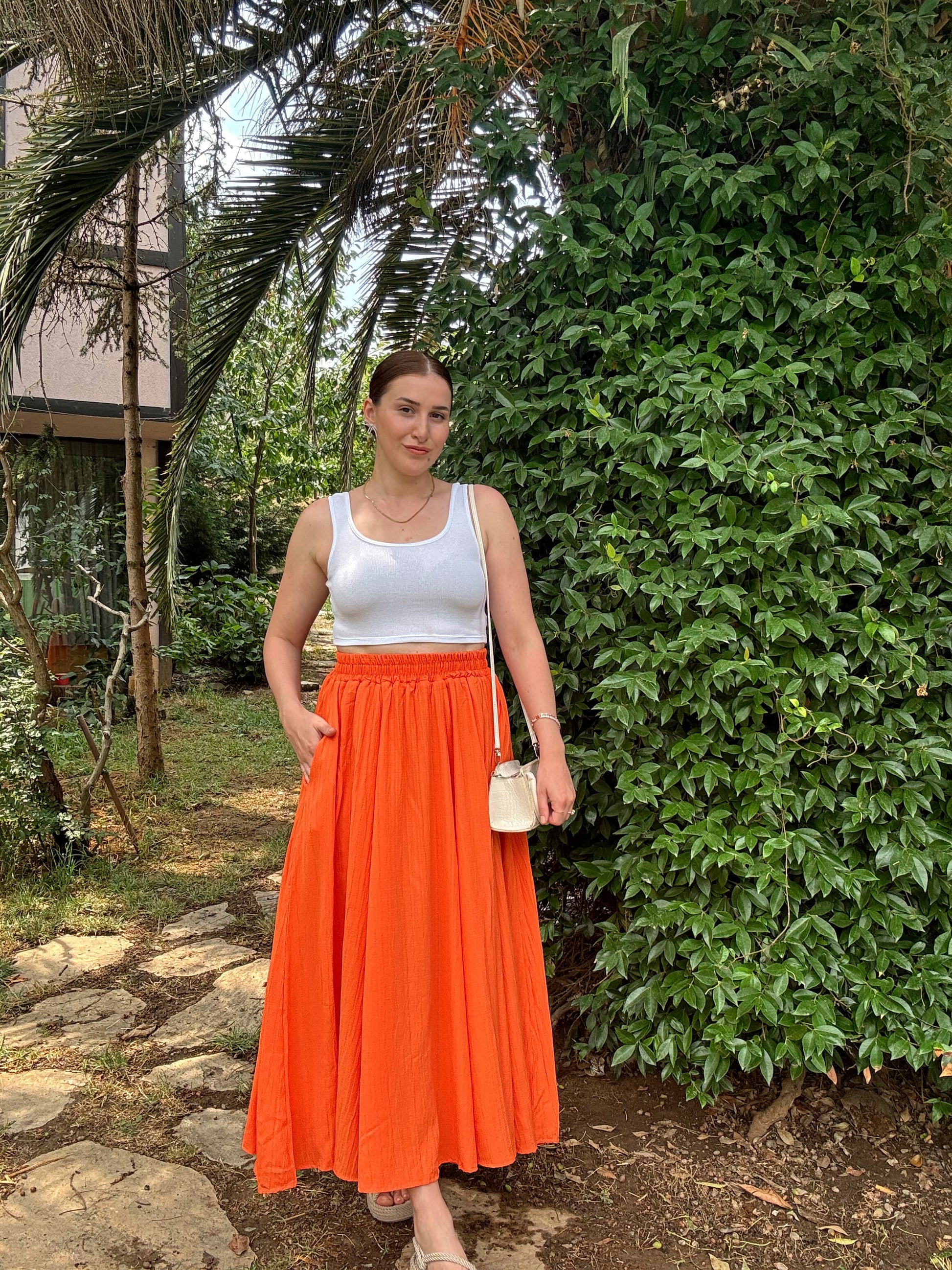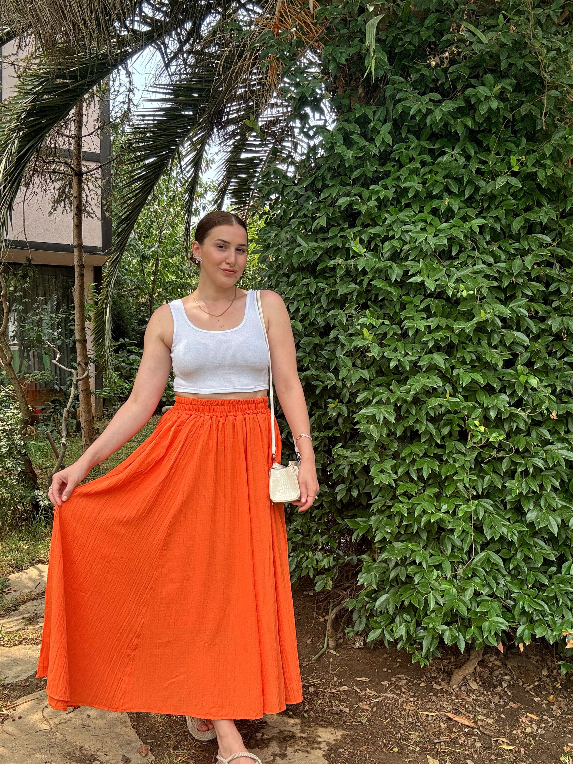 Beli Lastikli Uzun Gofre Etek - TURUNCU
