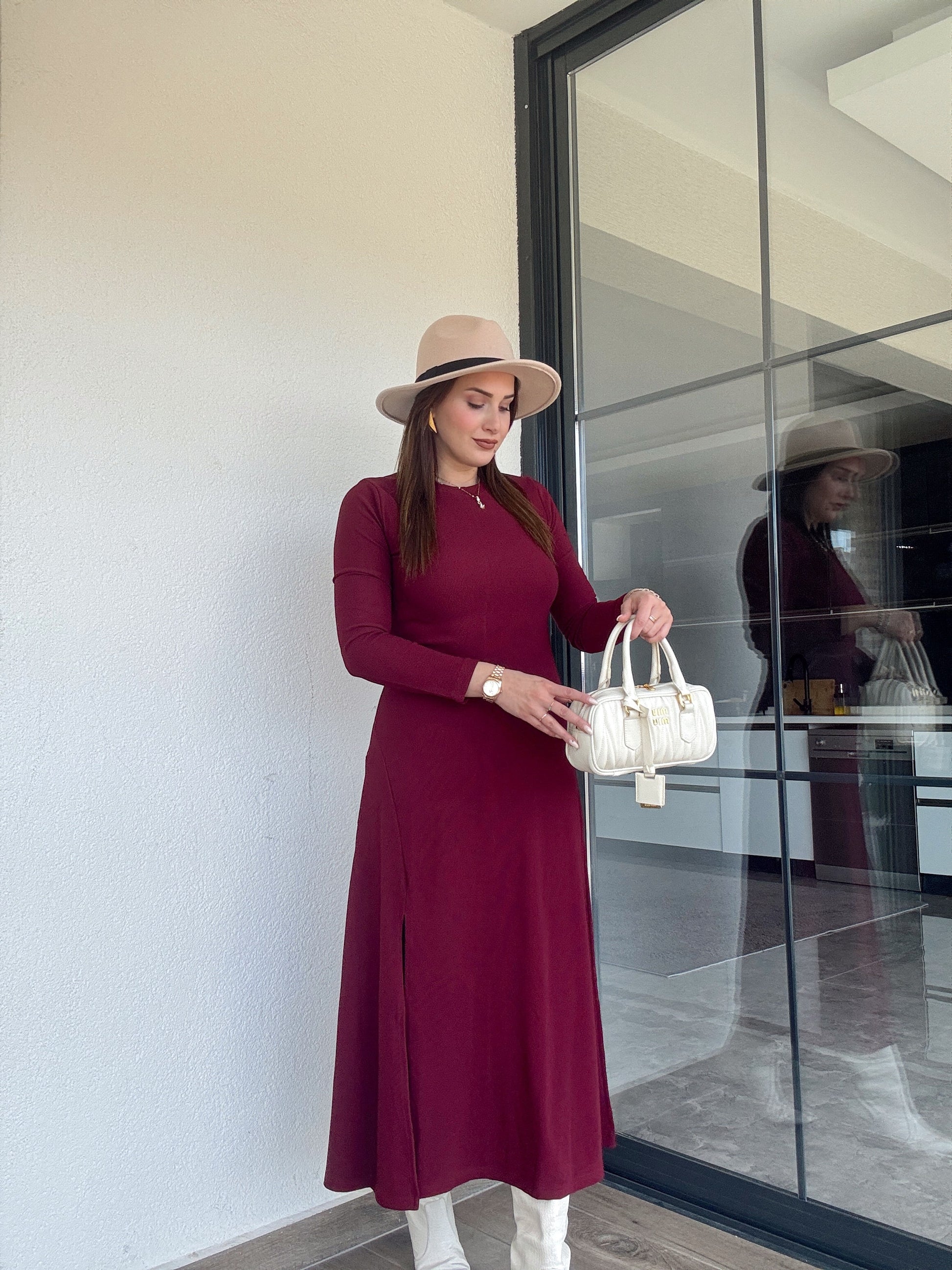 Bisiklet yaka yırtmaçlı fitilli elbise BORDO