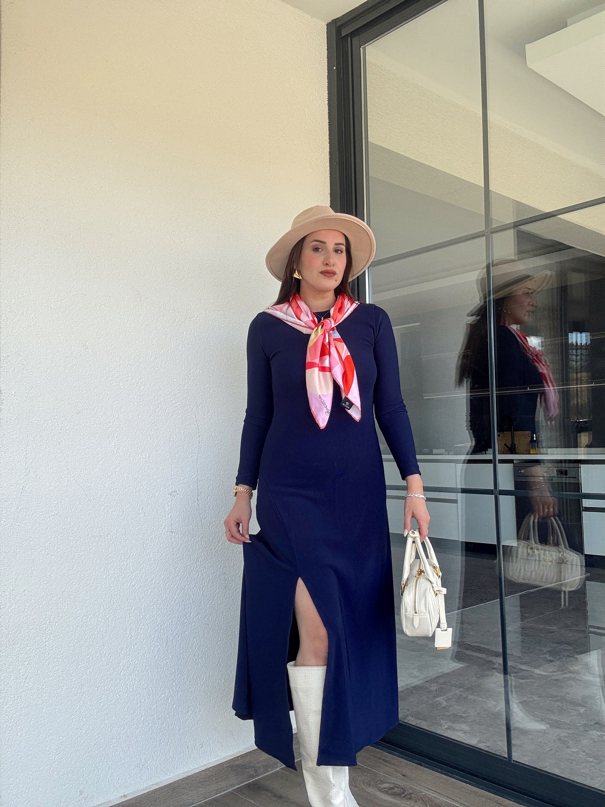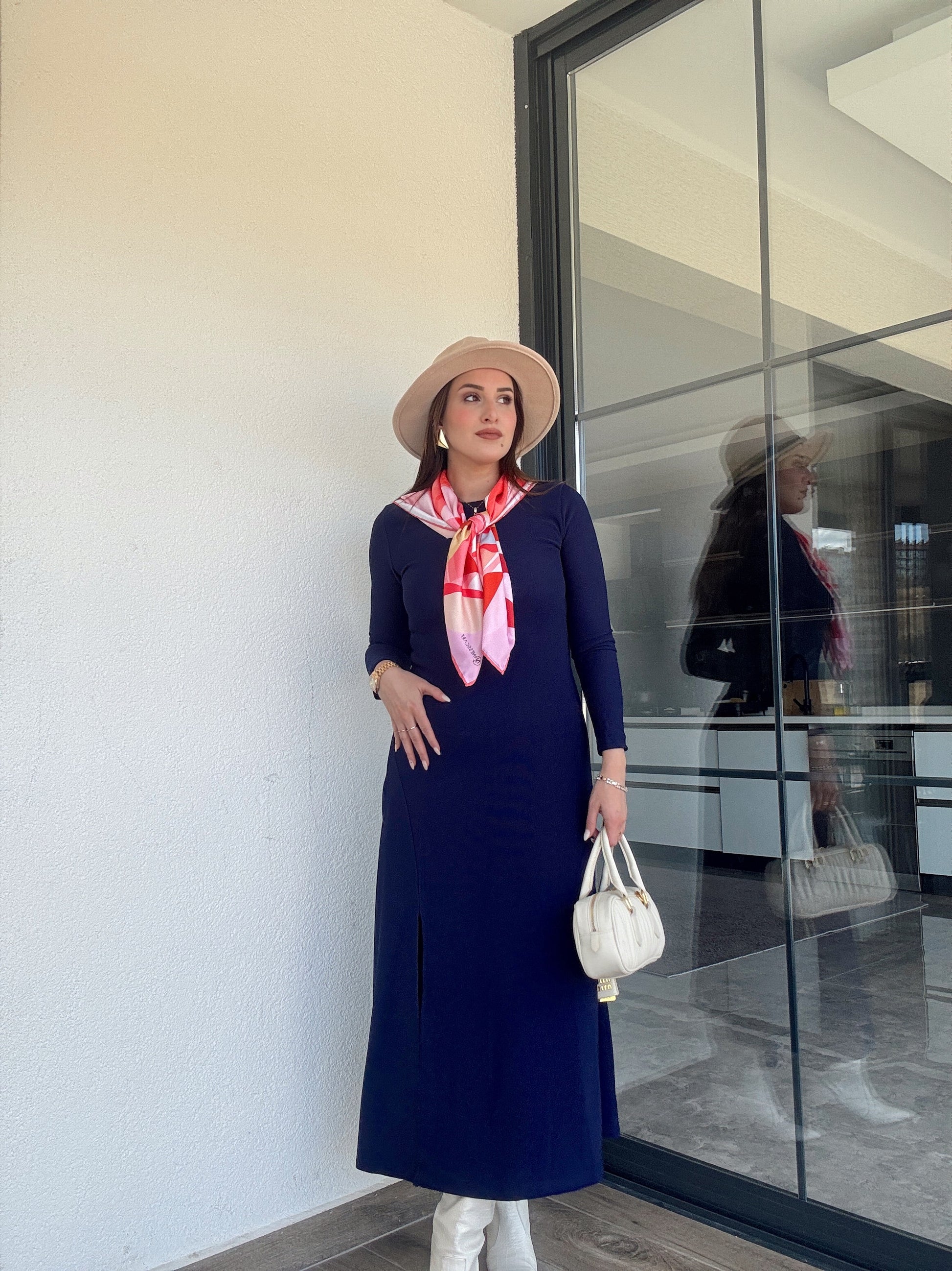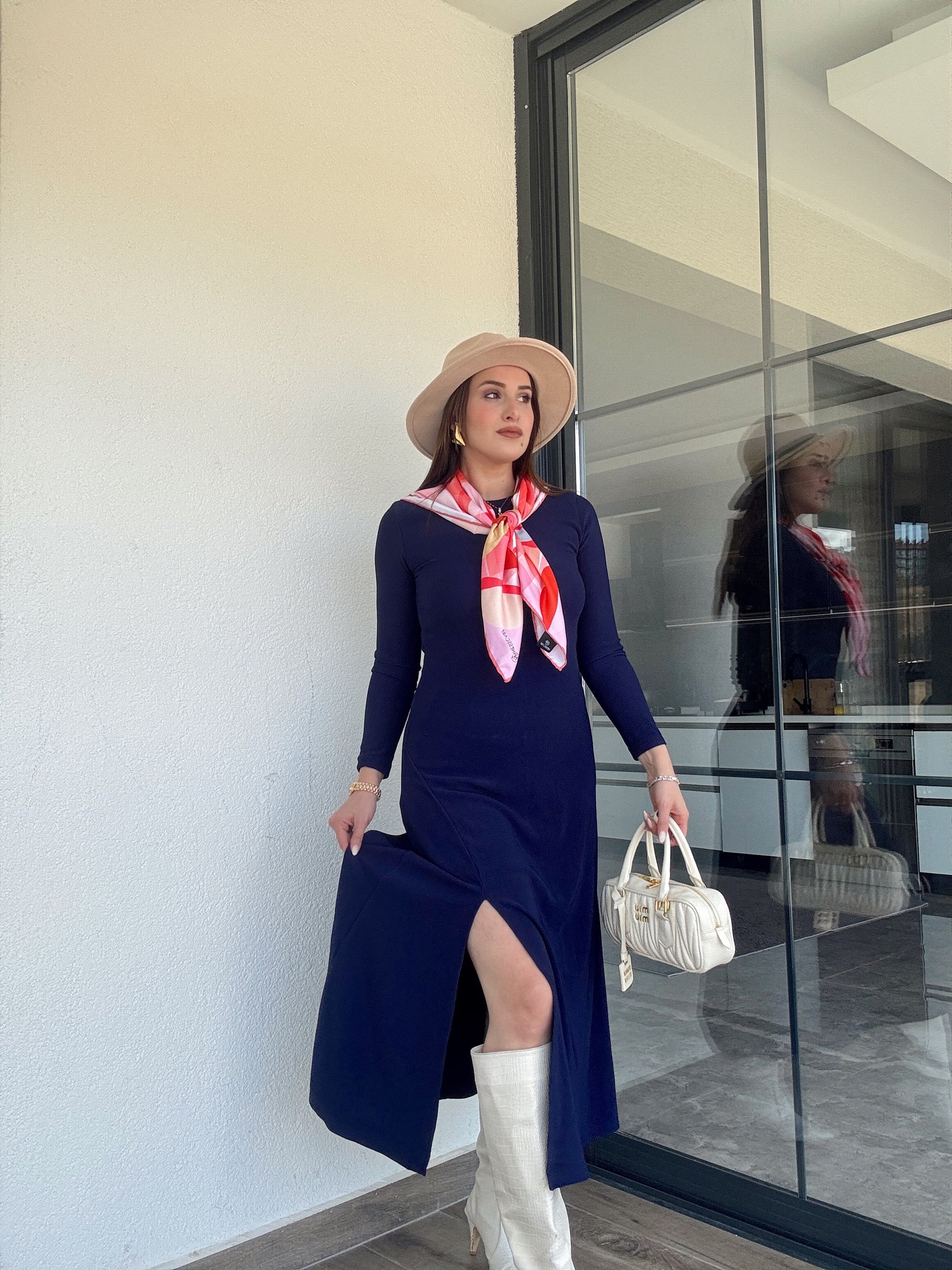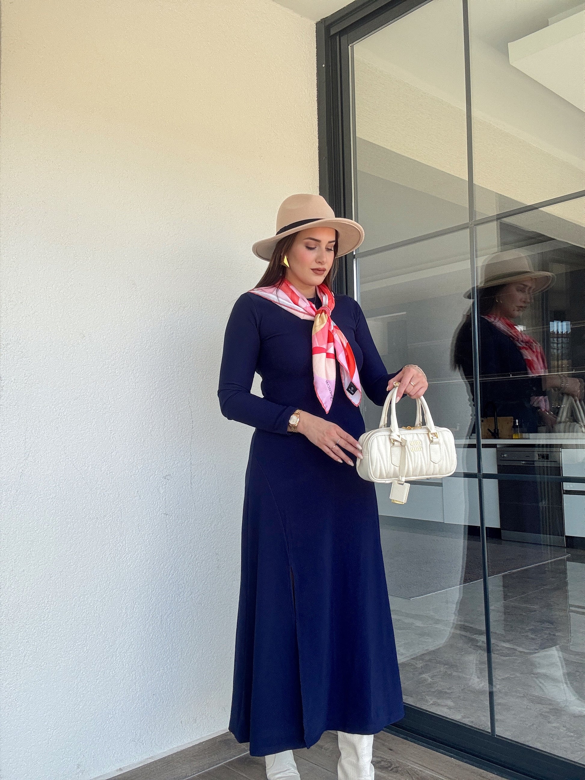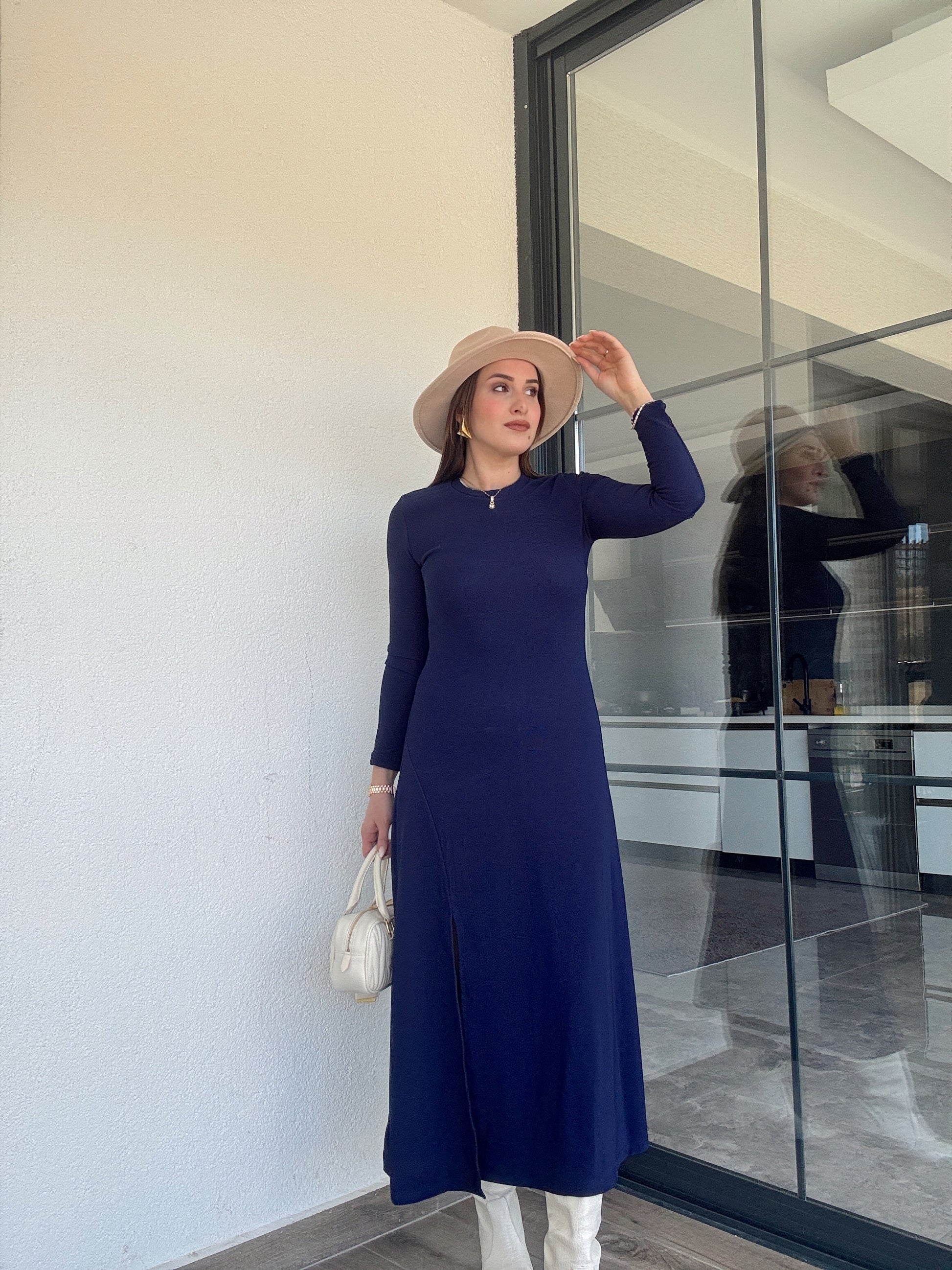 Bisiklet yaka yırtmaçlı fitilli elbise LACİVERT