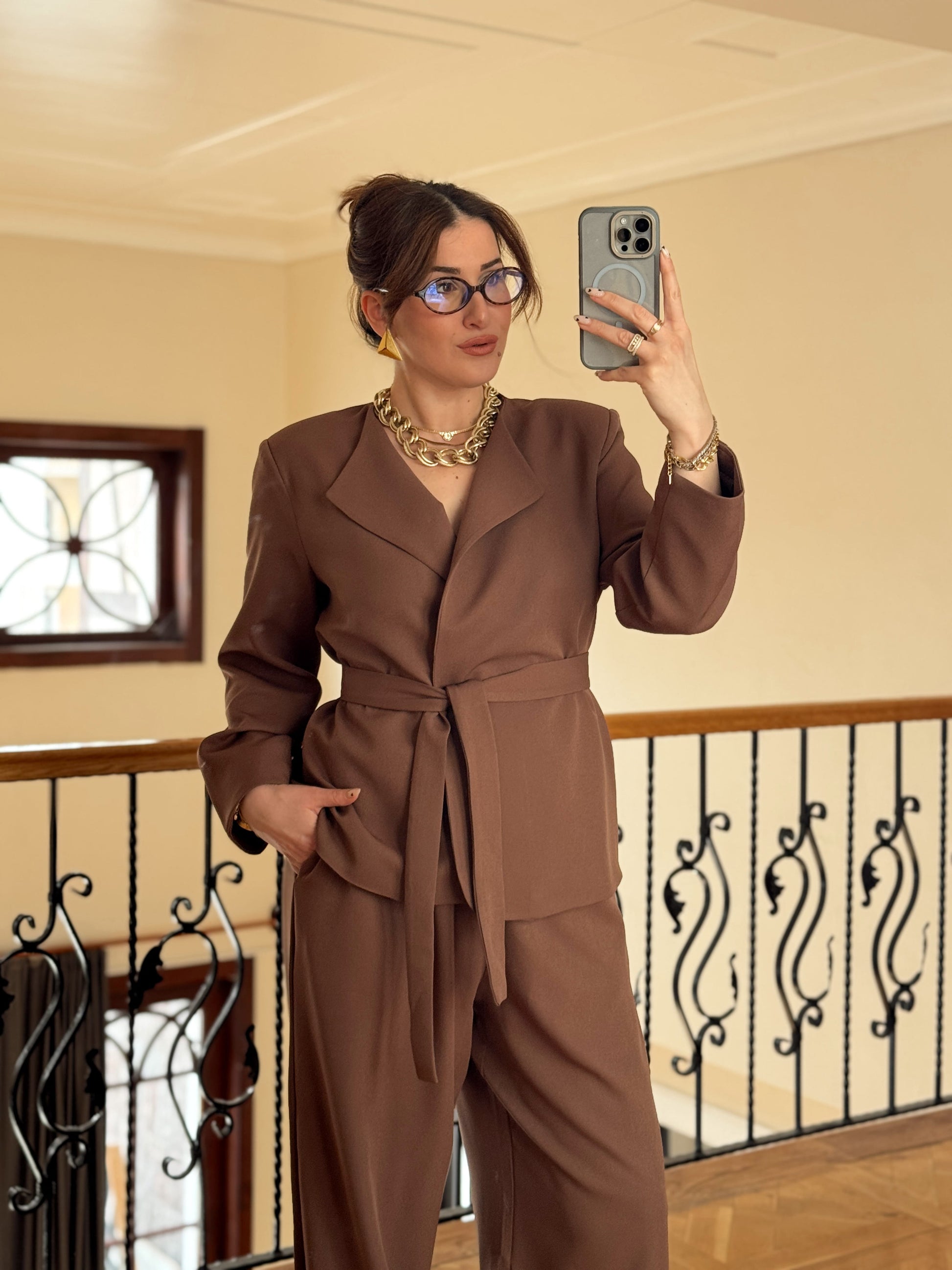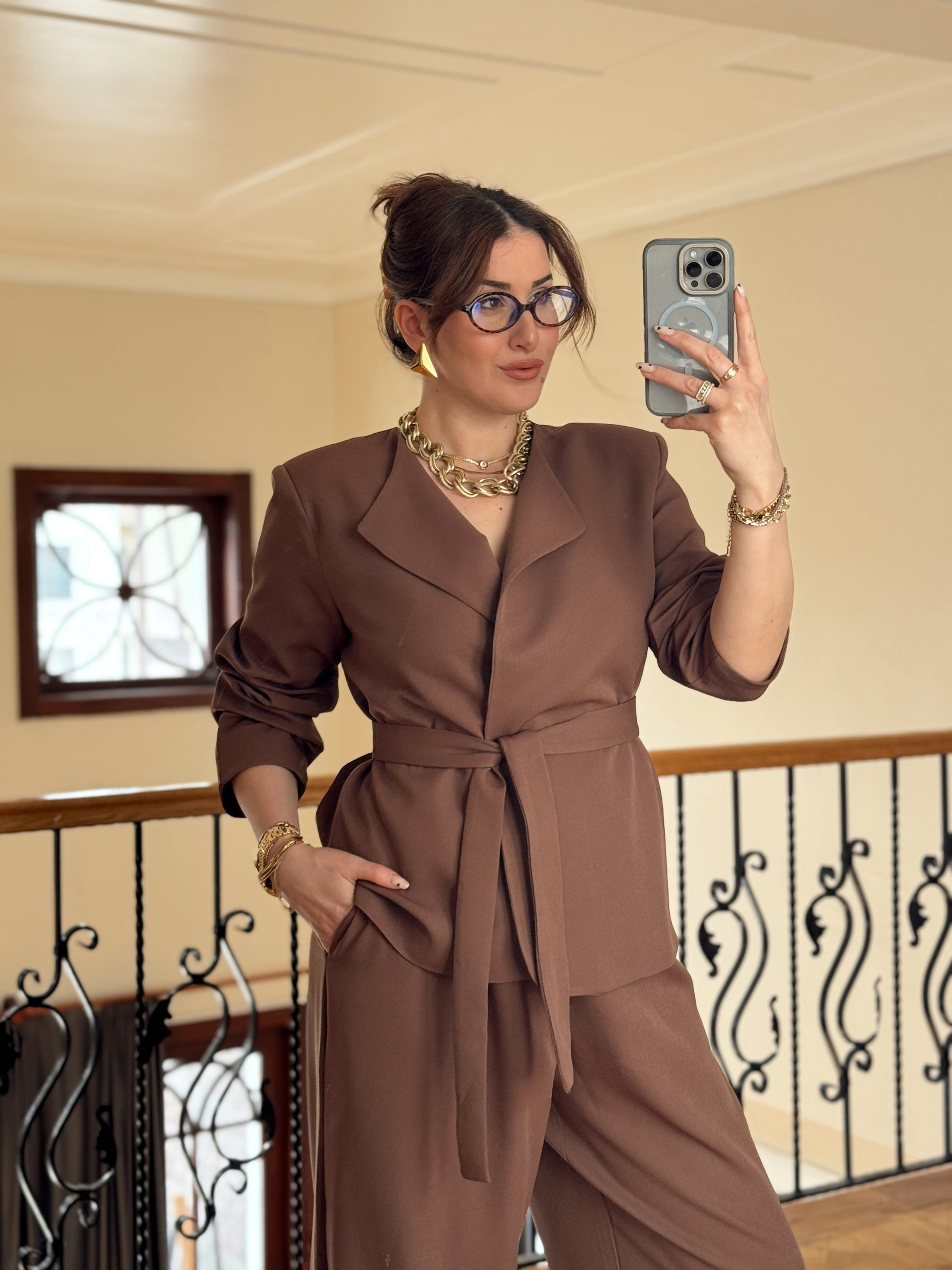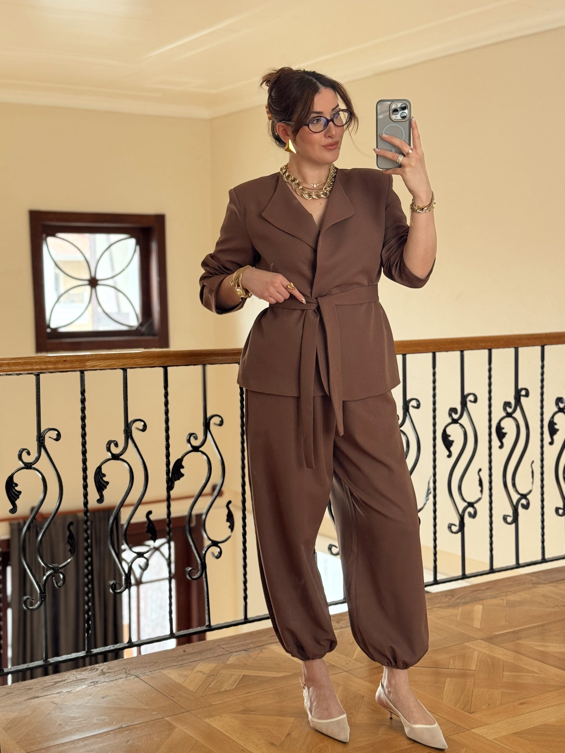 Ceket Kuşaklı Şalvar Takım-KAHVERENGİ