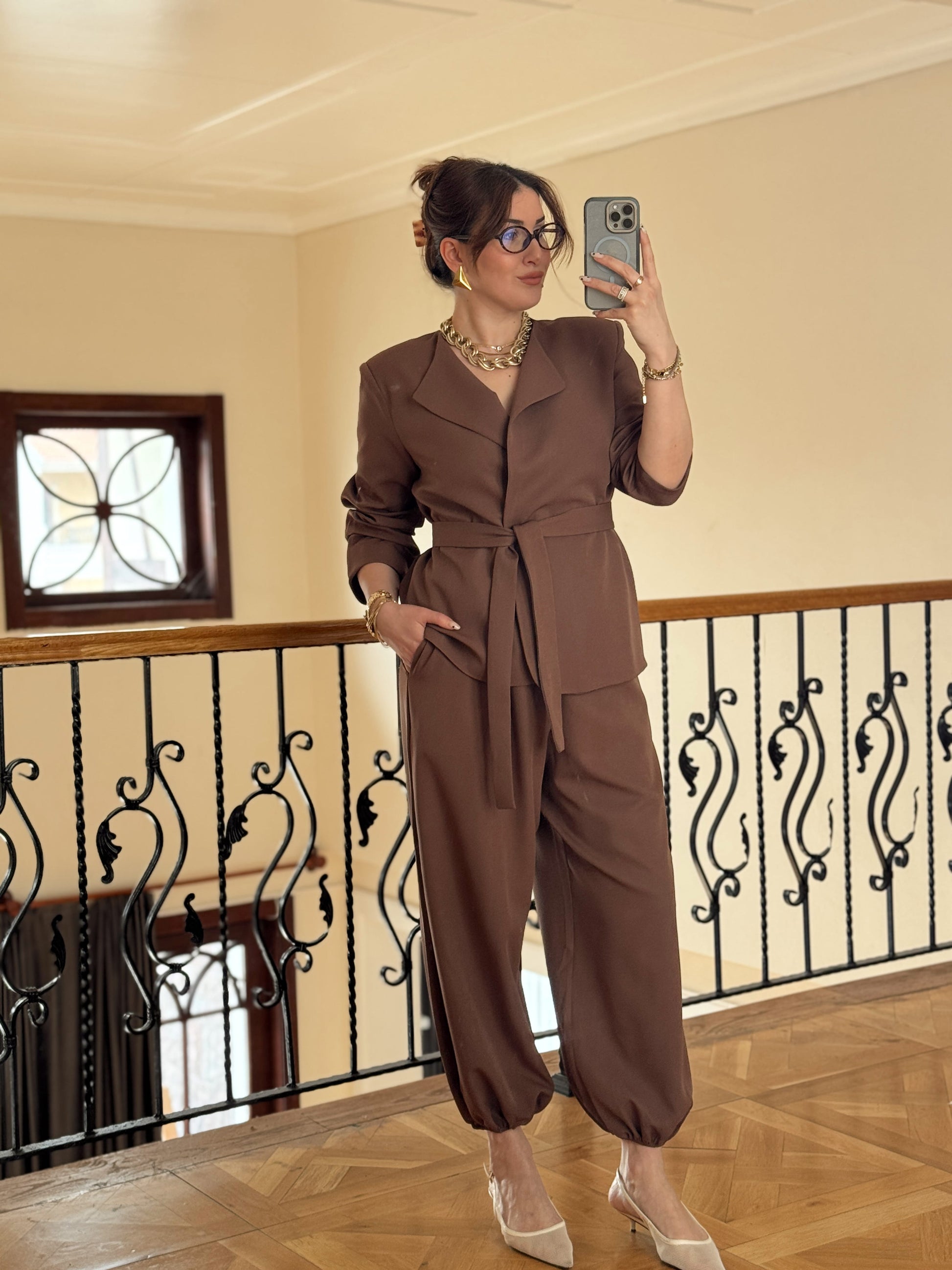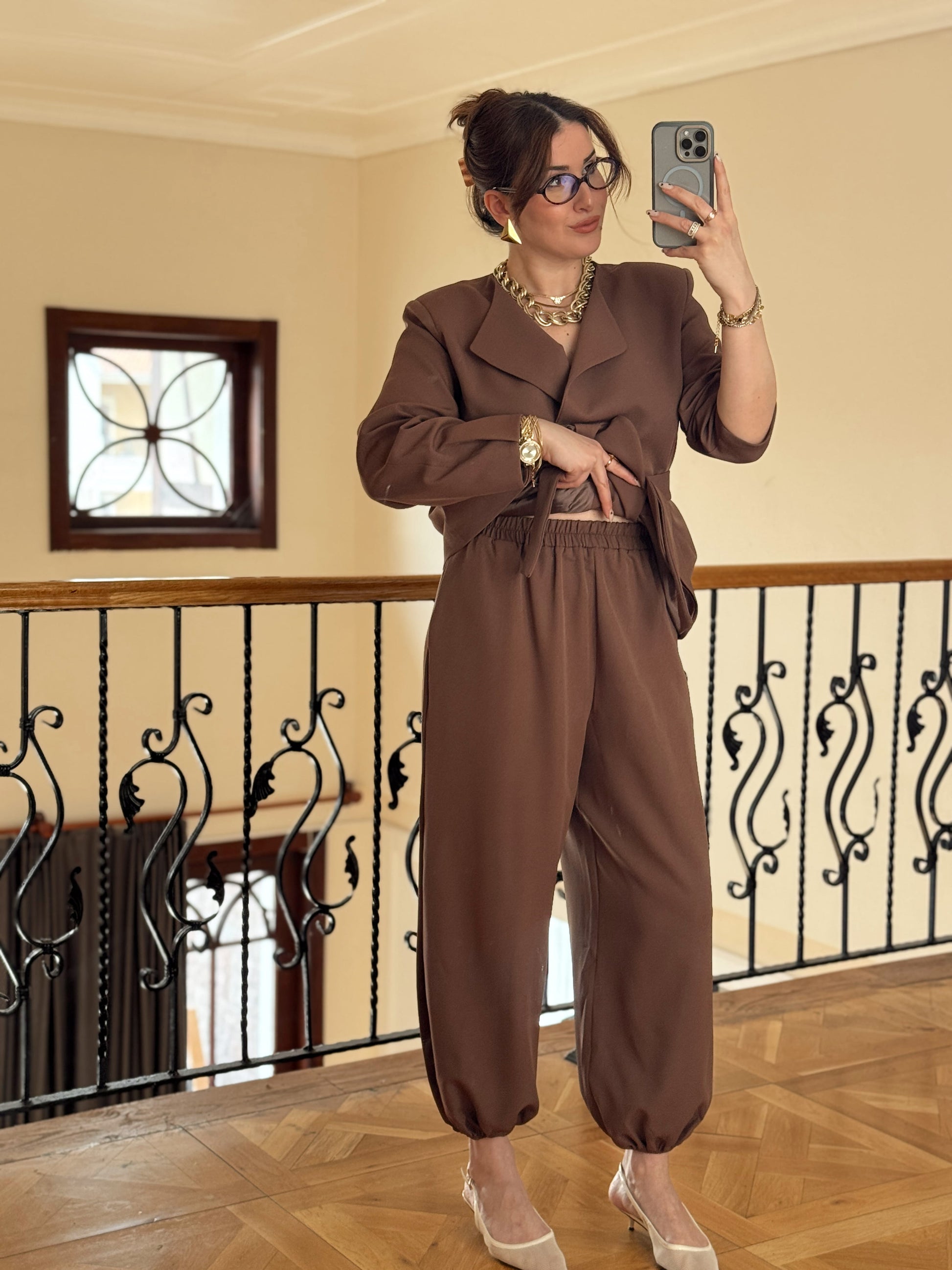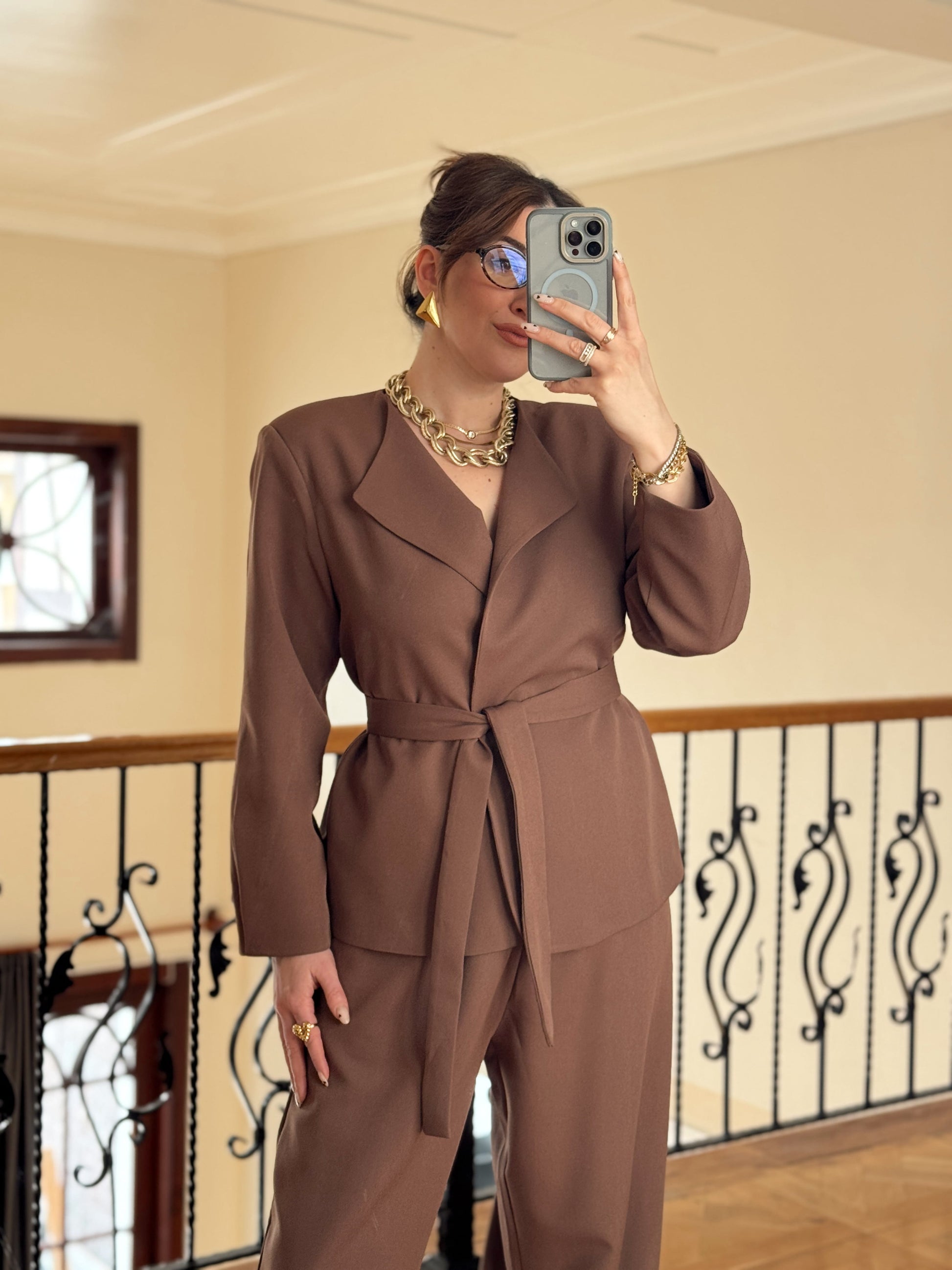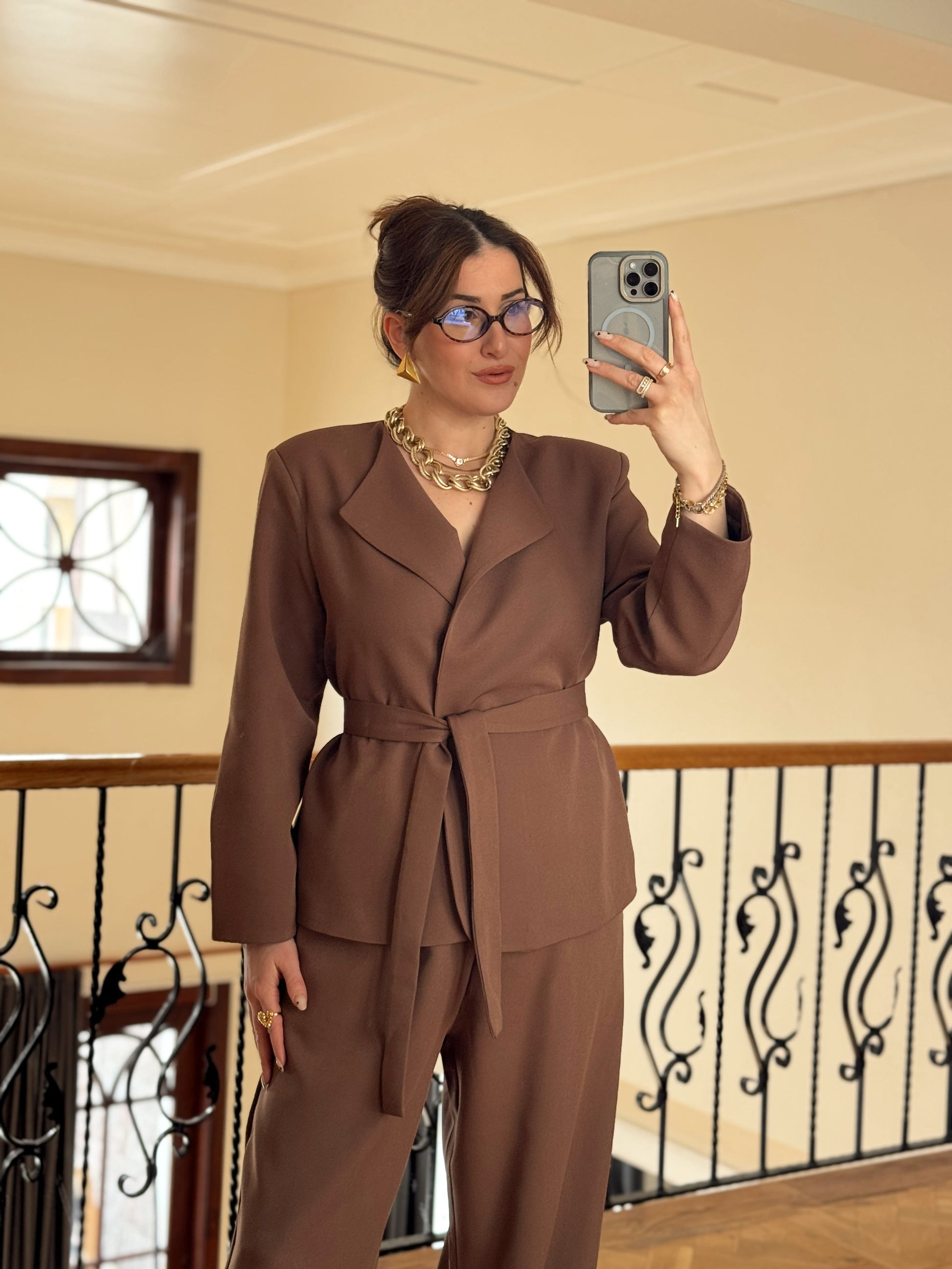 Ceket Kuşaklı Şalvar Takım-KAHVERENGİ