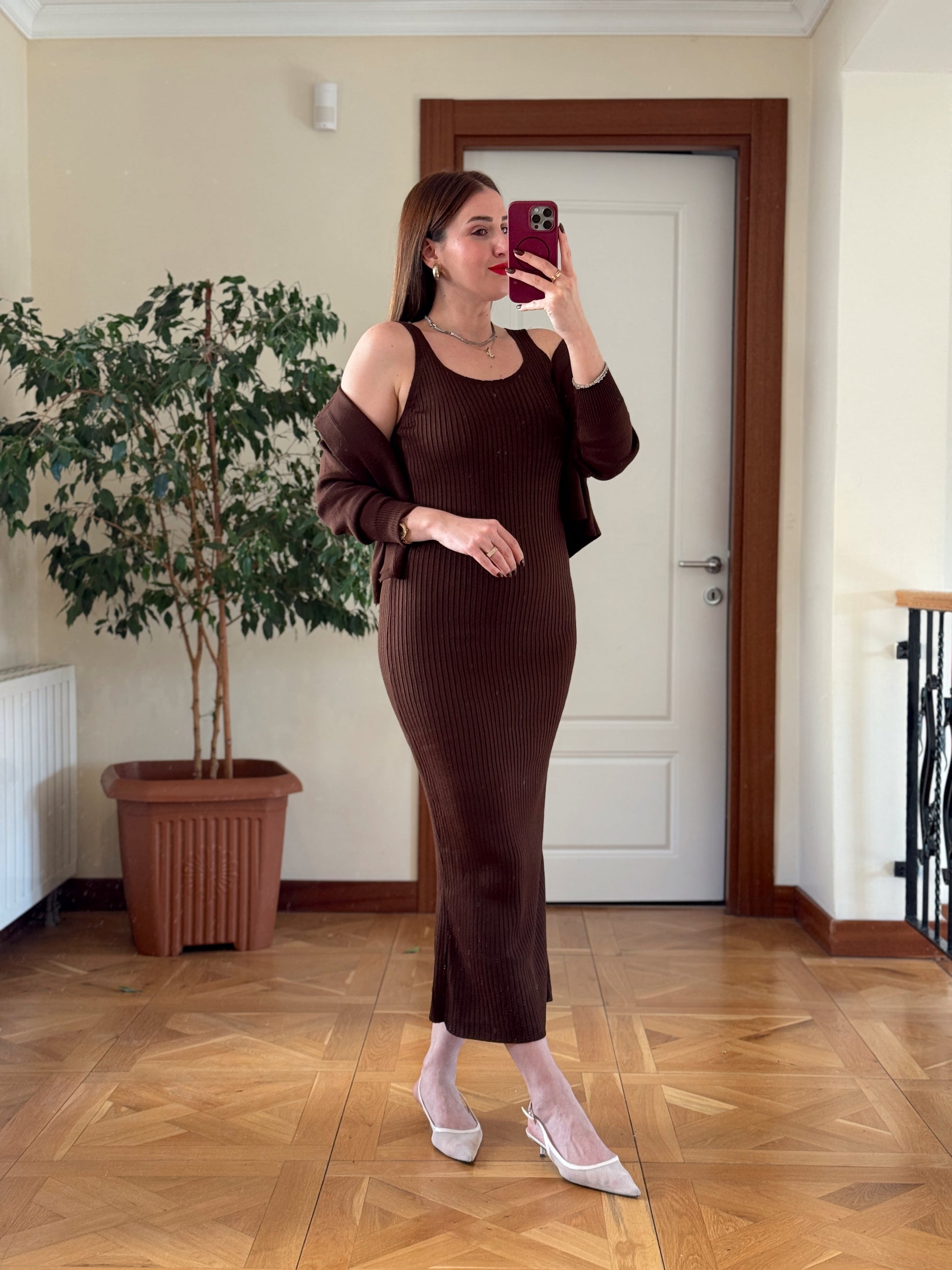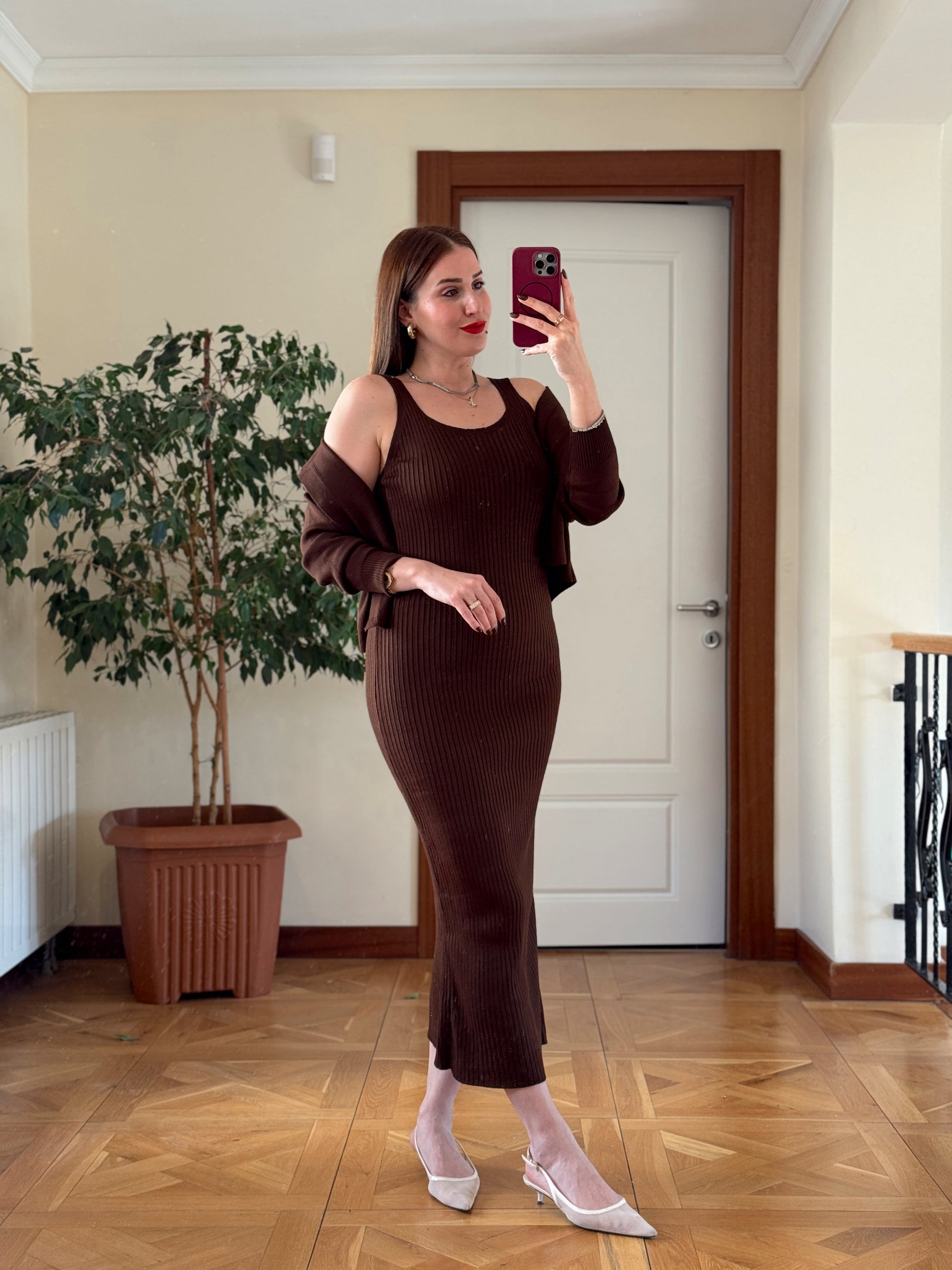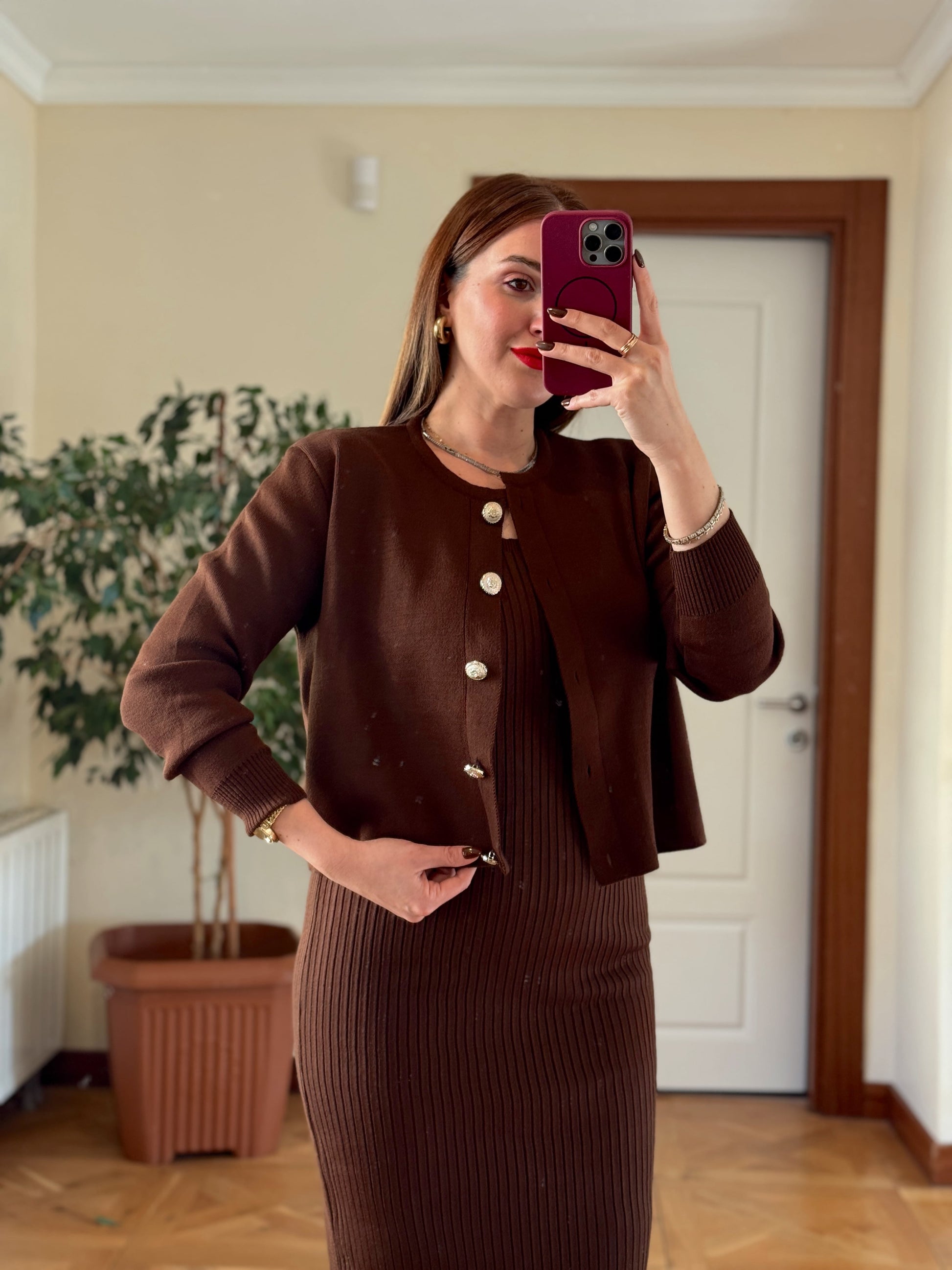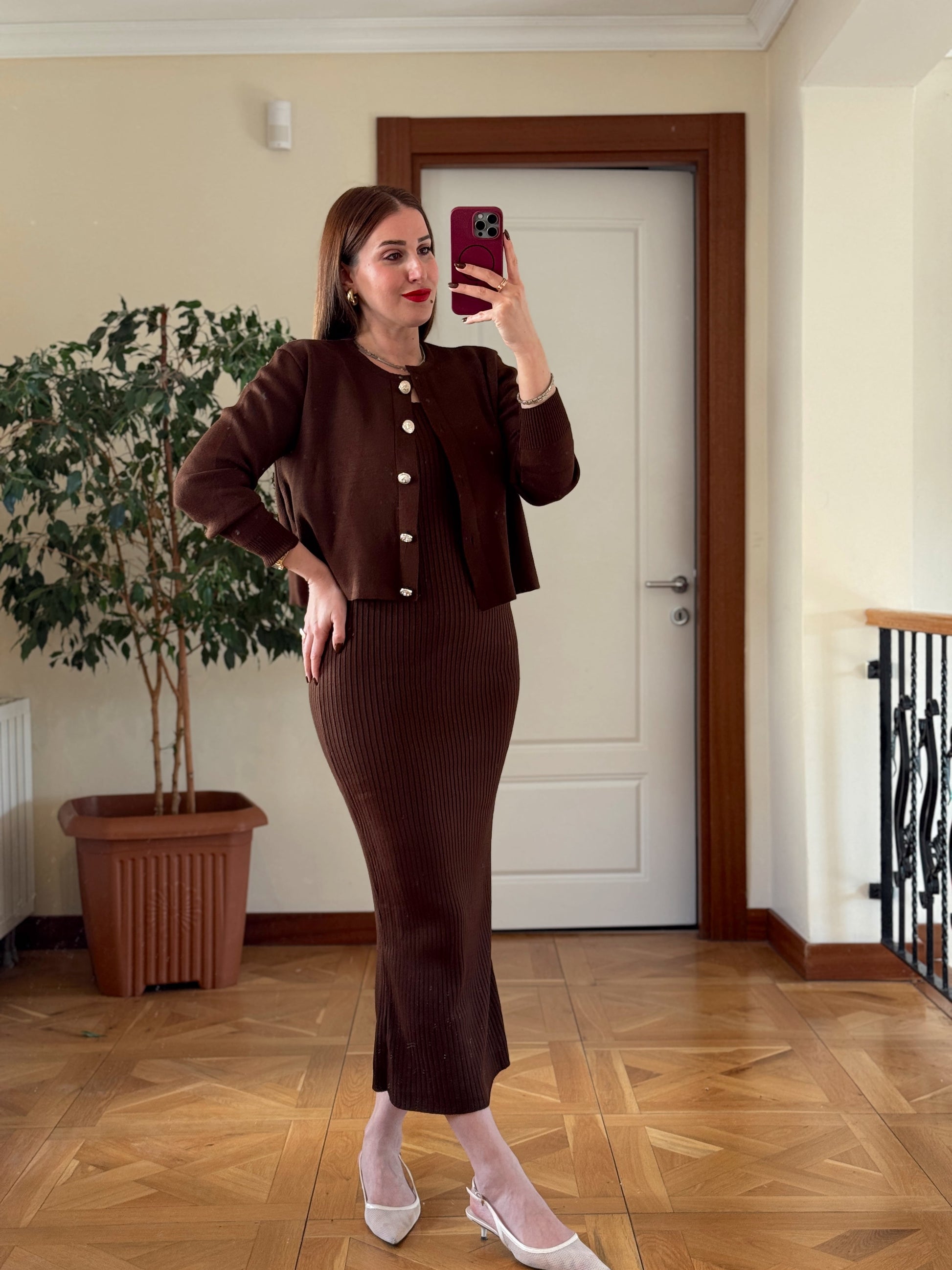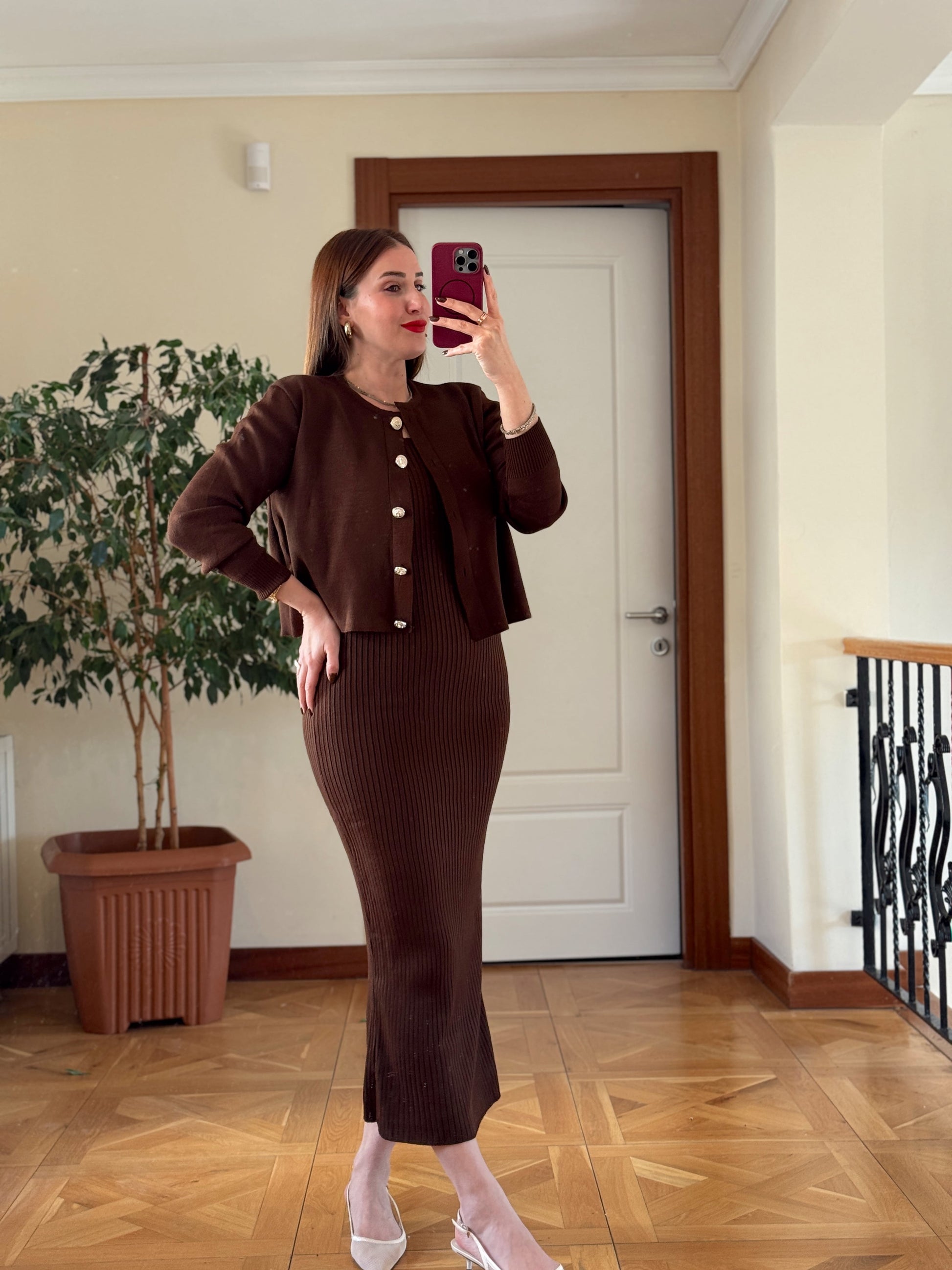 Ceketli Elbiseli Triko Takım - KAHVERENGİ