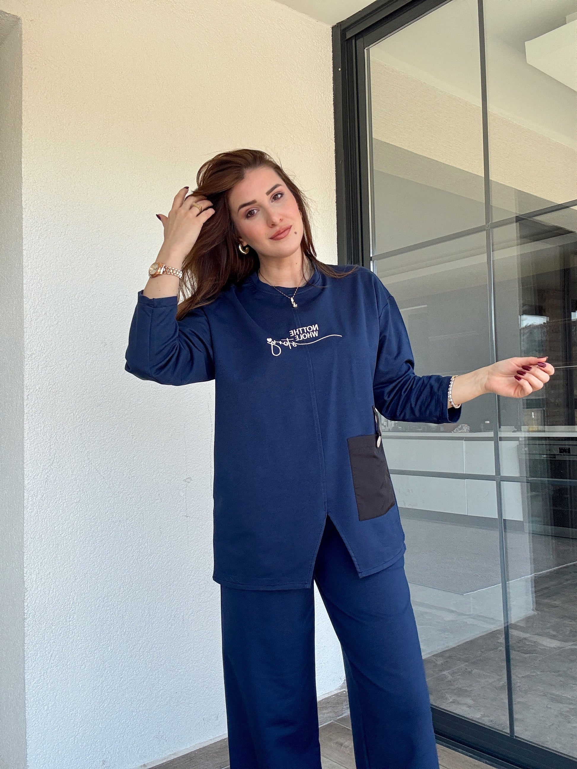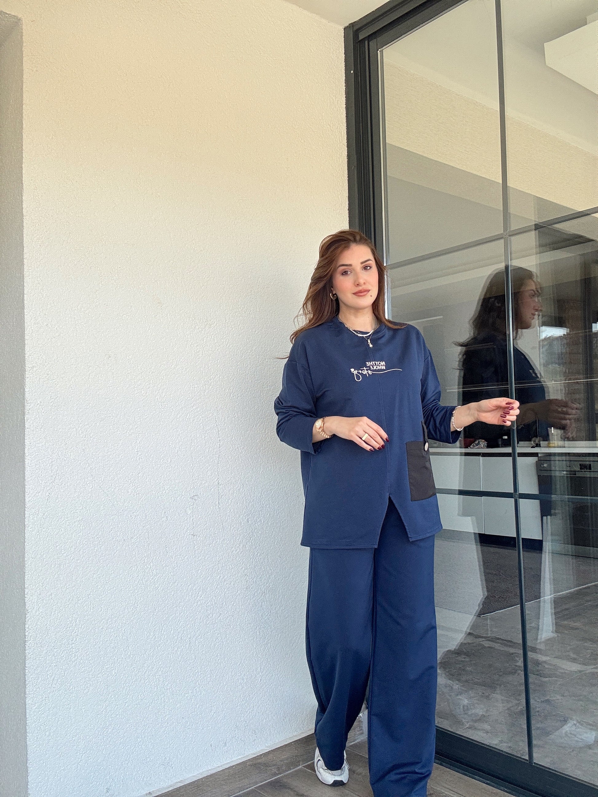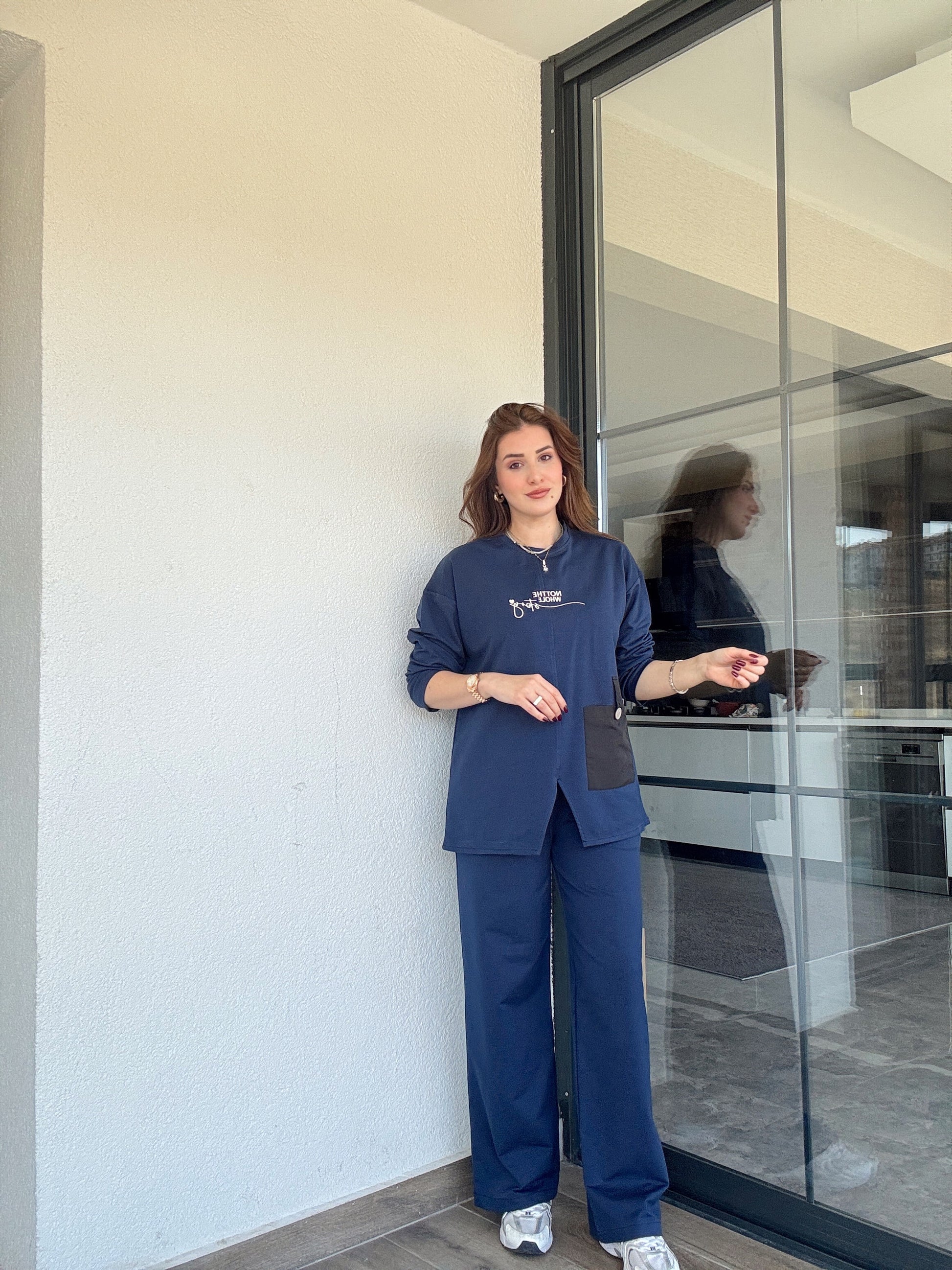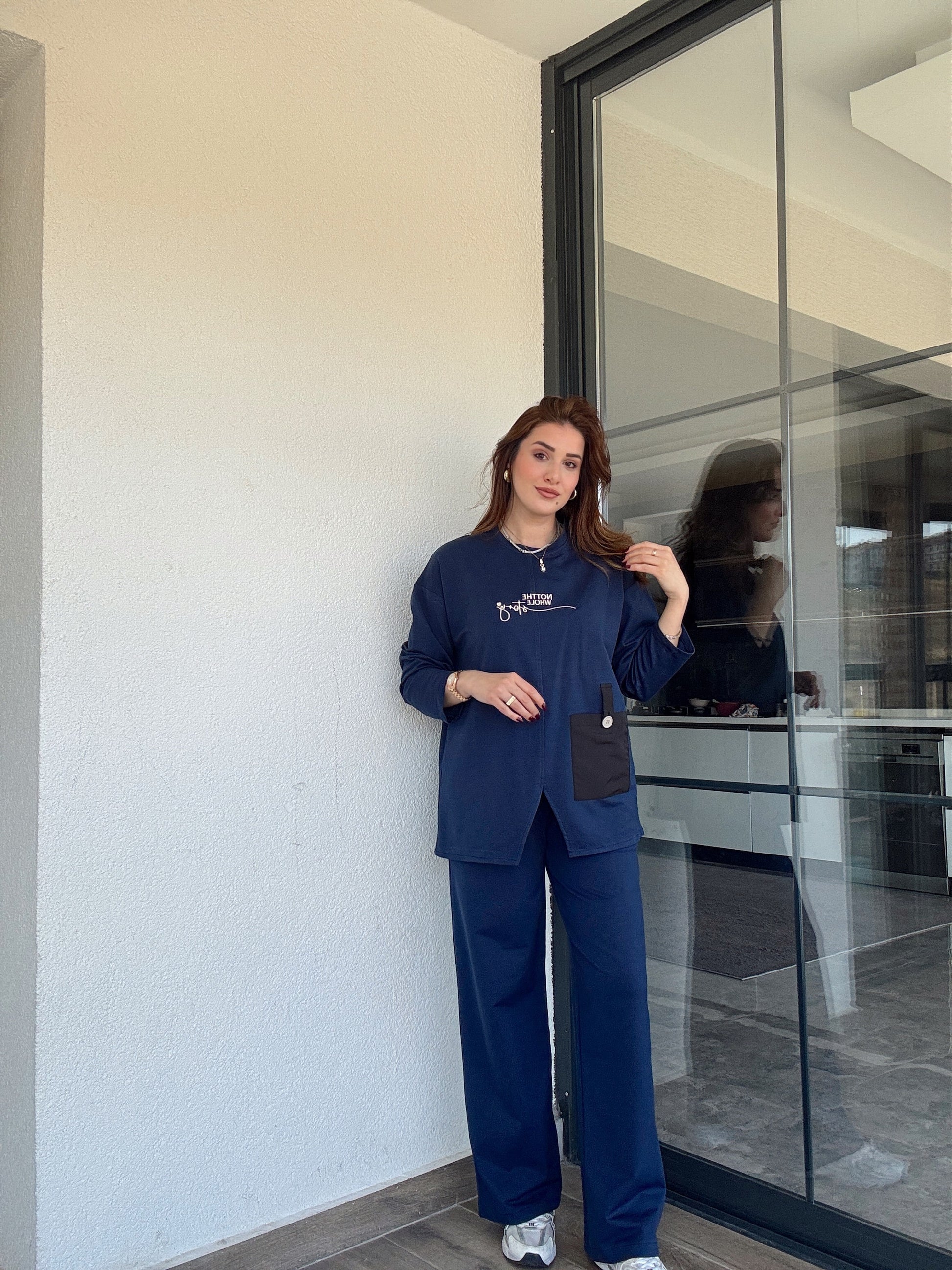 Cep detaylı nakışlı takım-LACİVERT