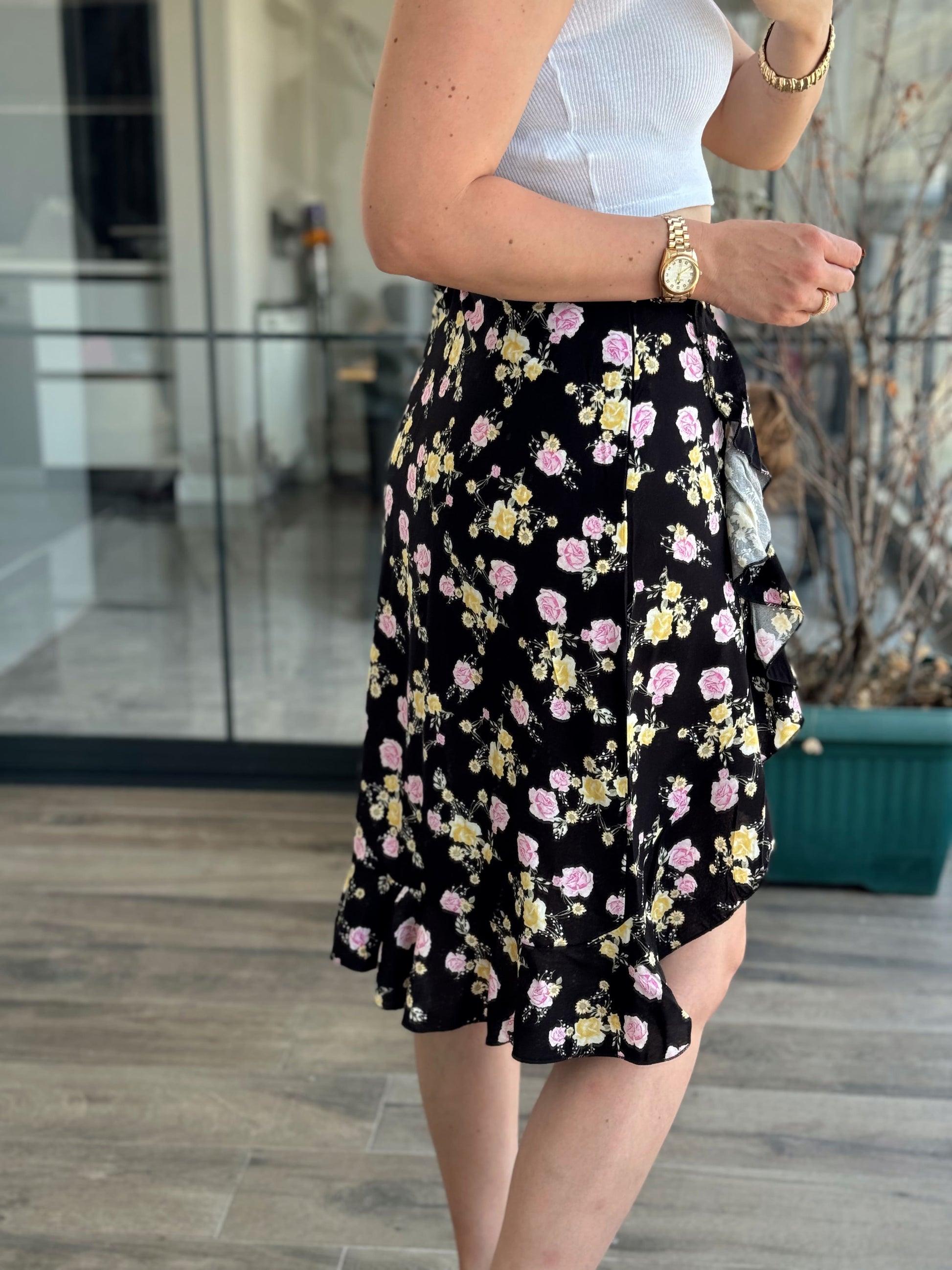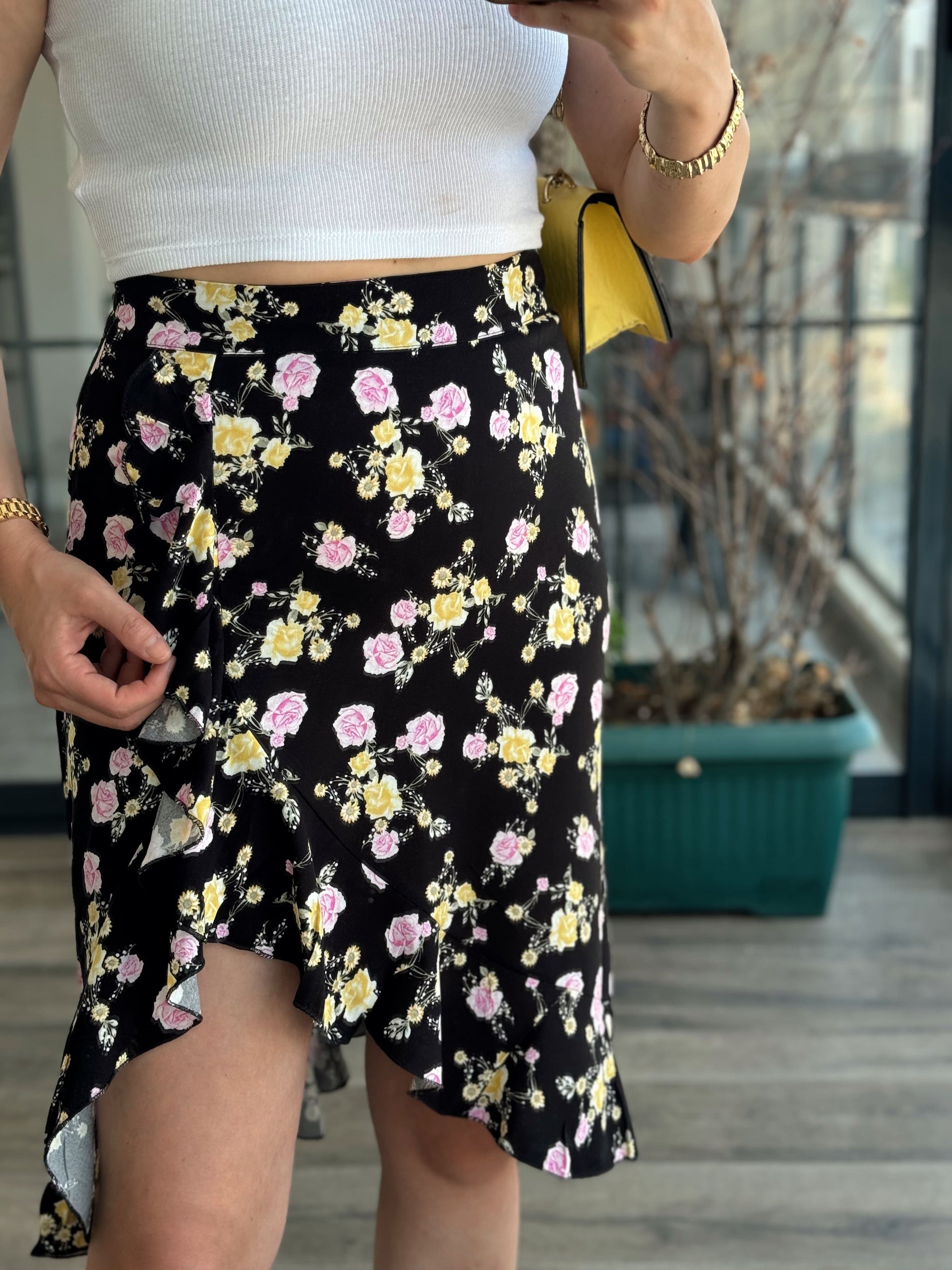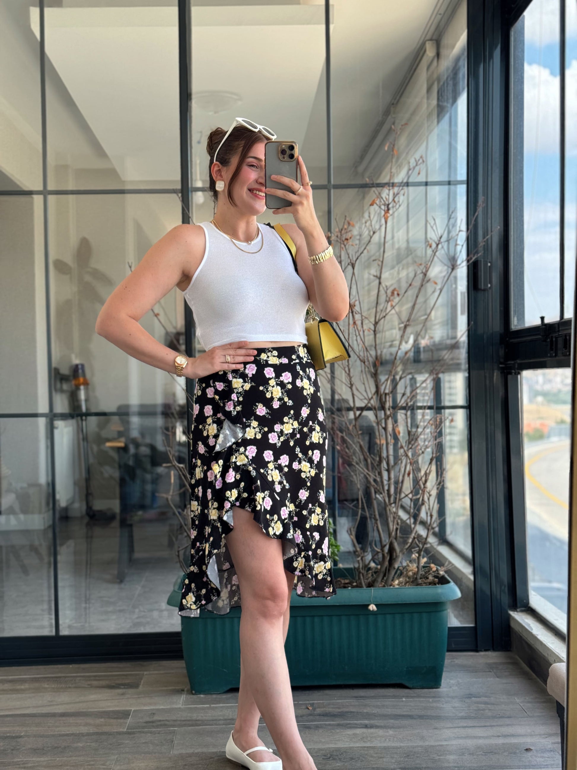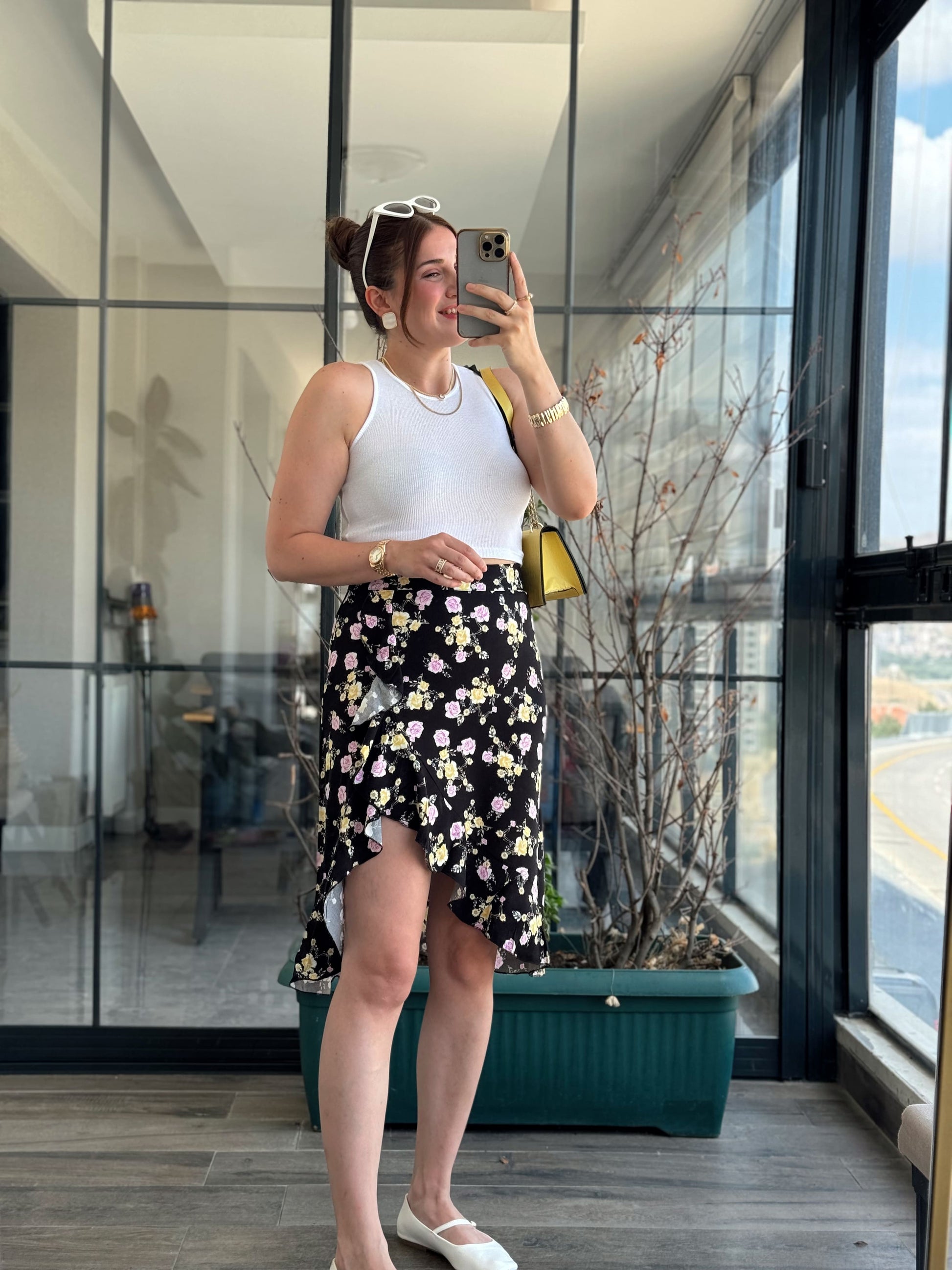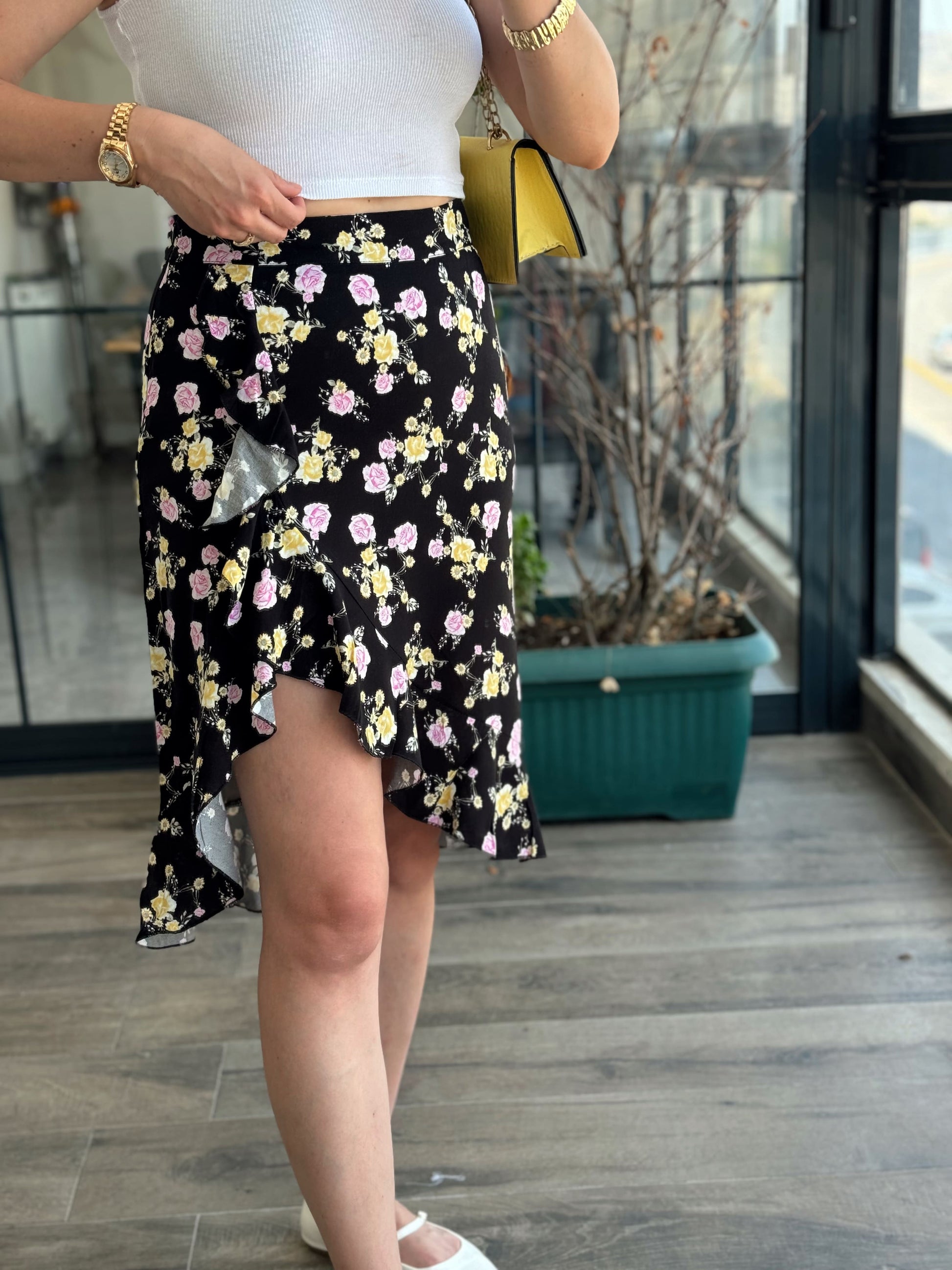 Çiçek Desen Fırfırlı Etek - SİYAH