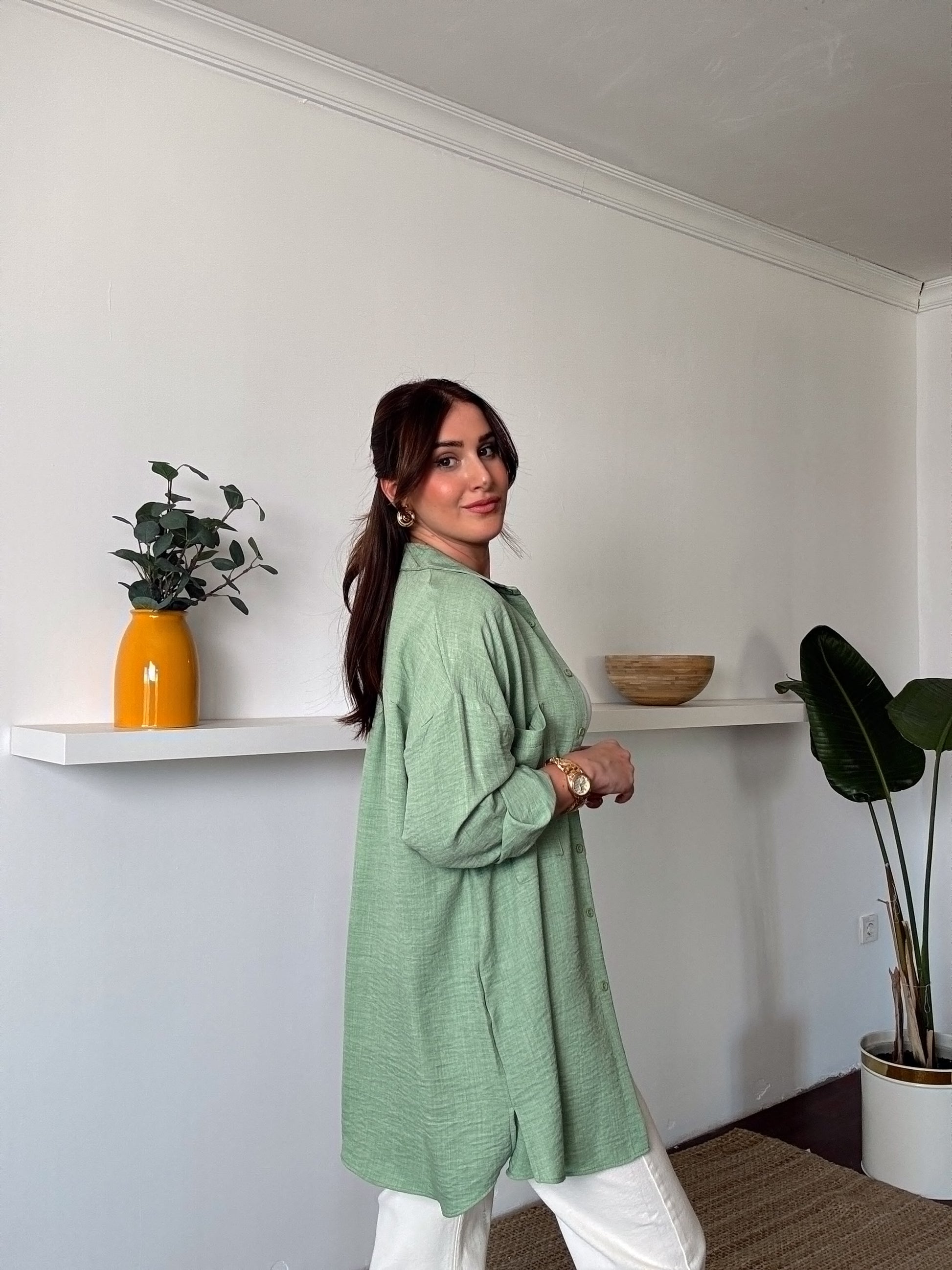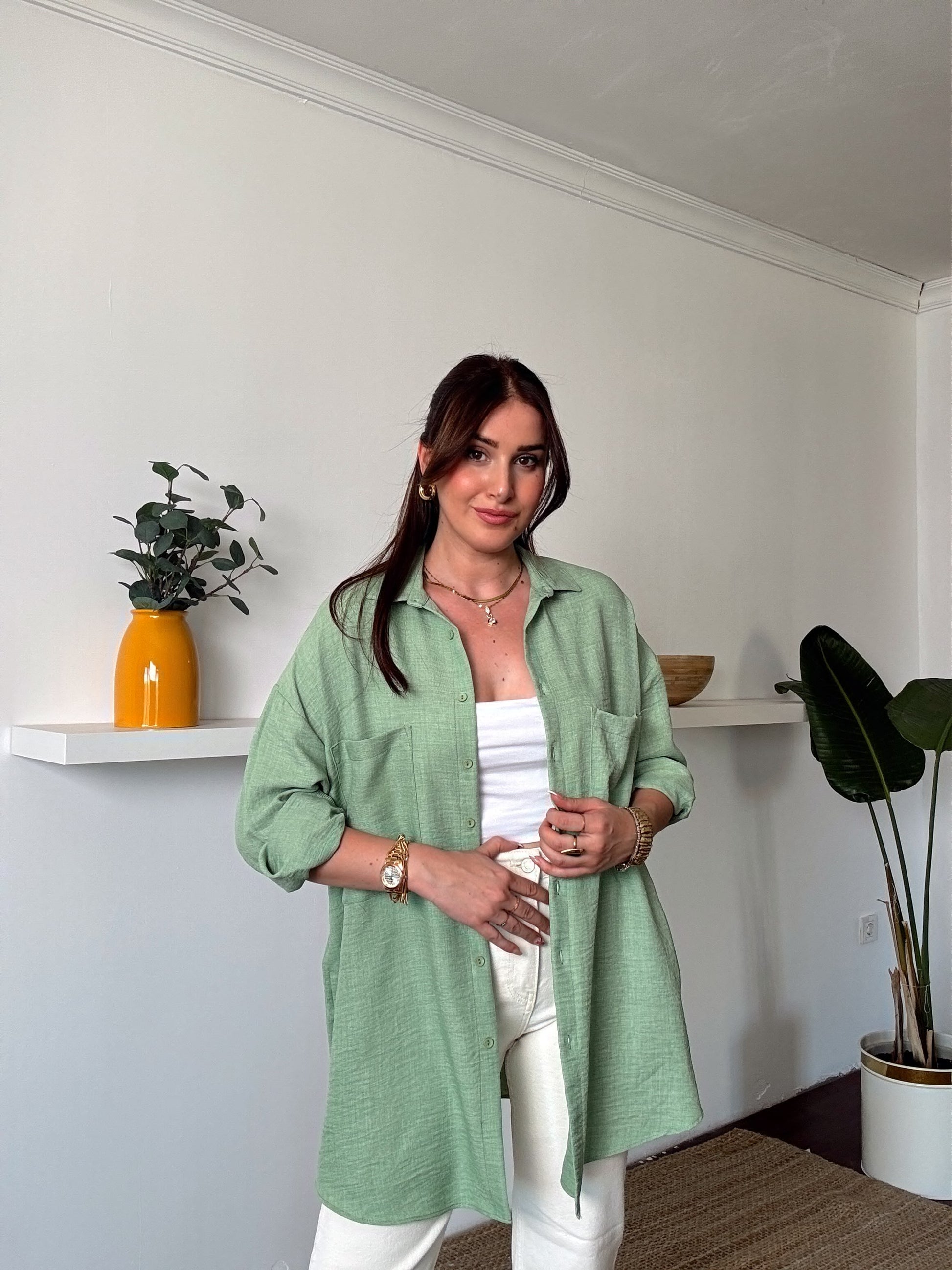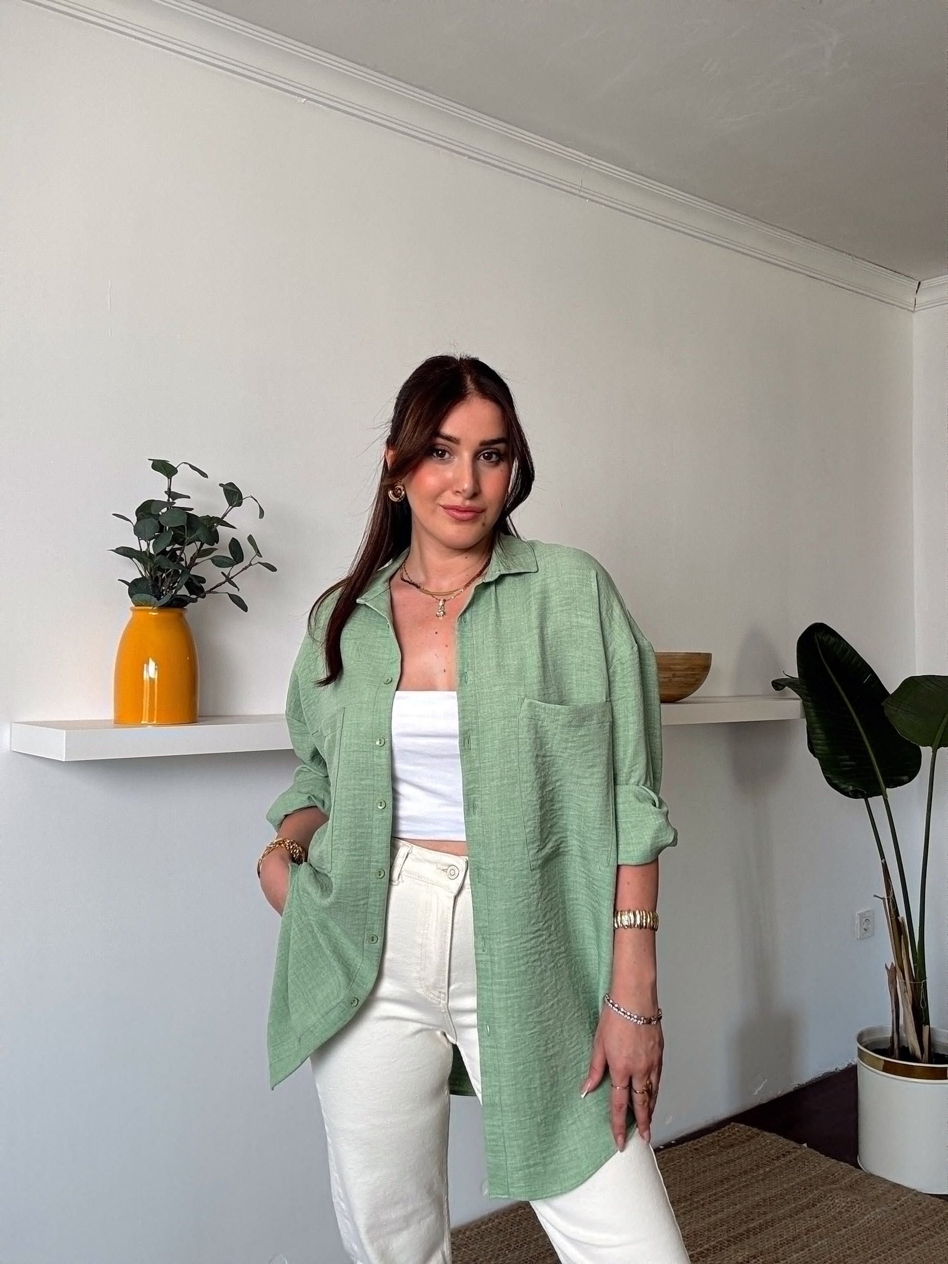 Çift Cep Double Kol Keten Gömlek YEŞİL