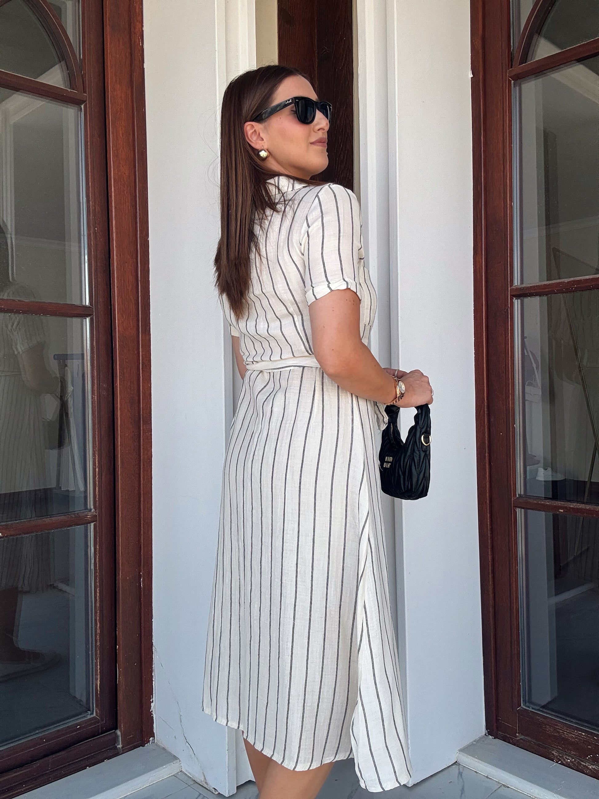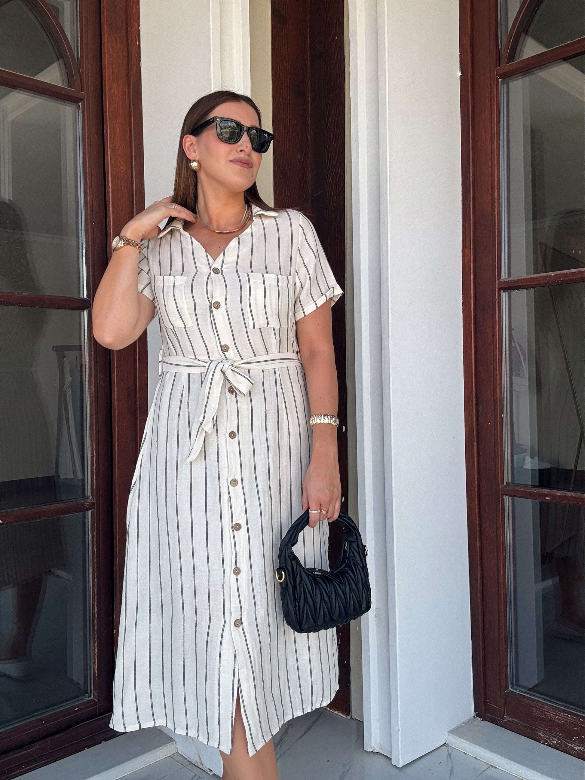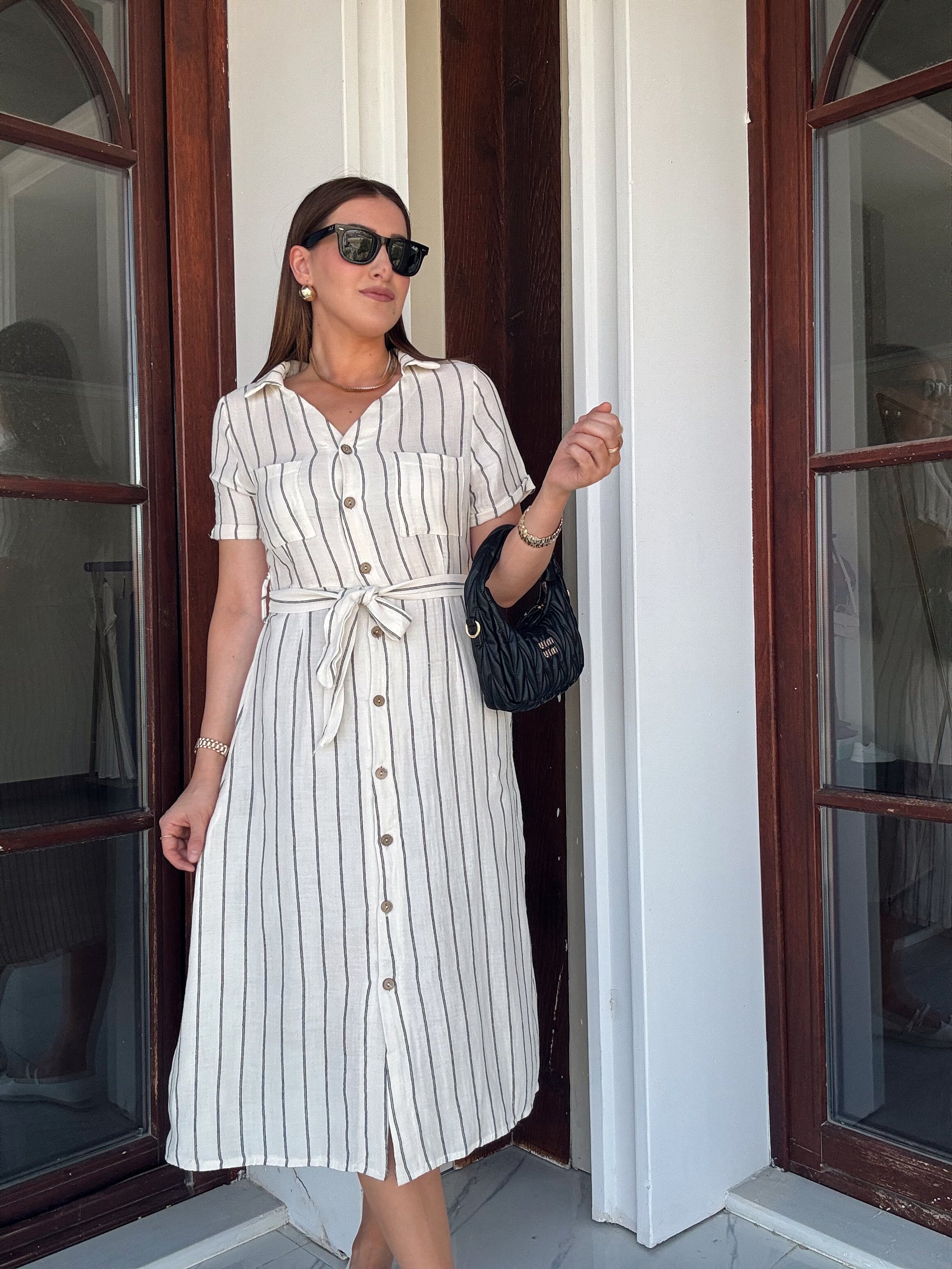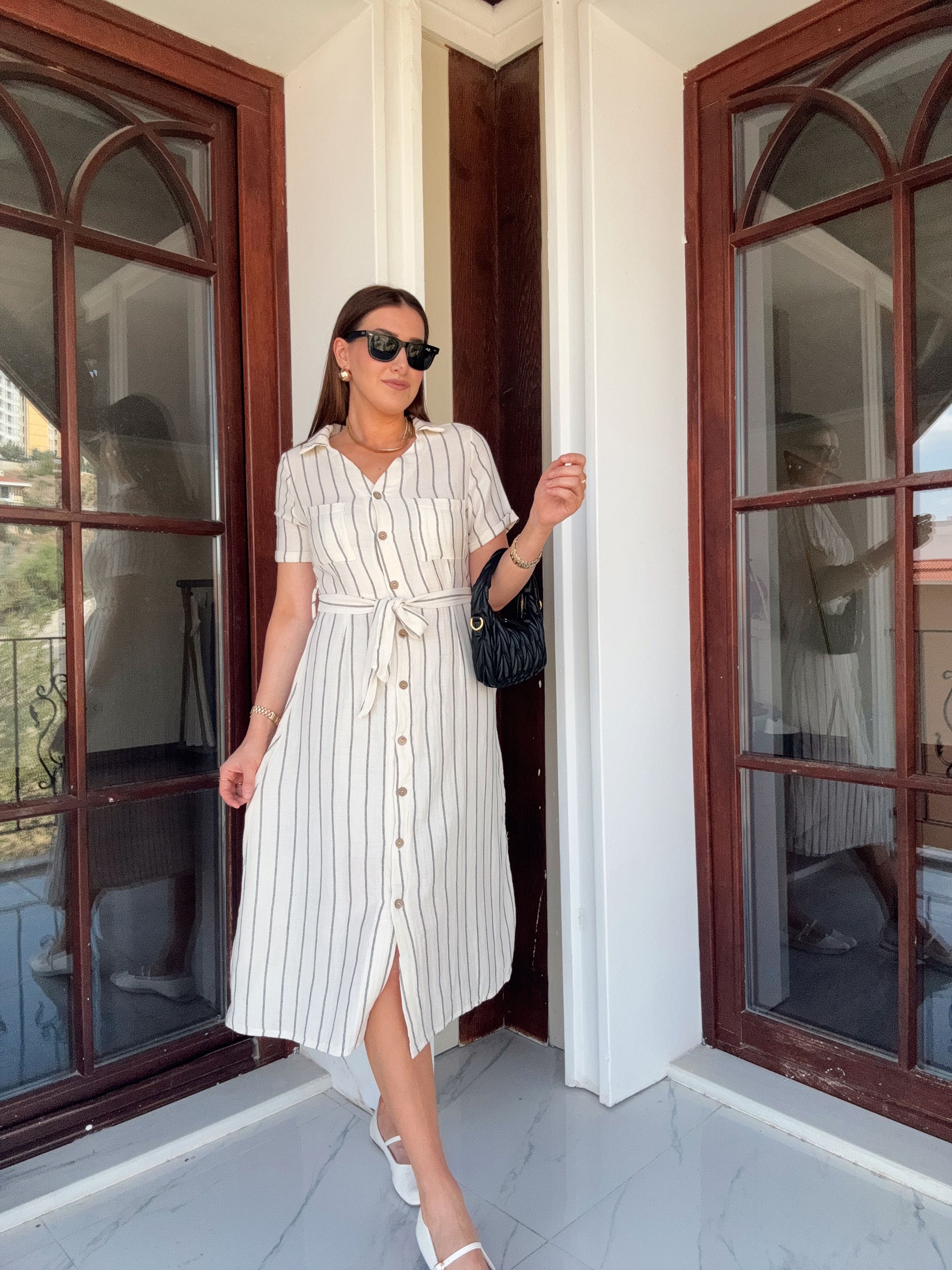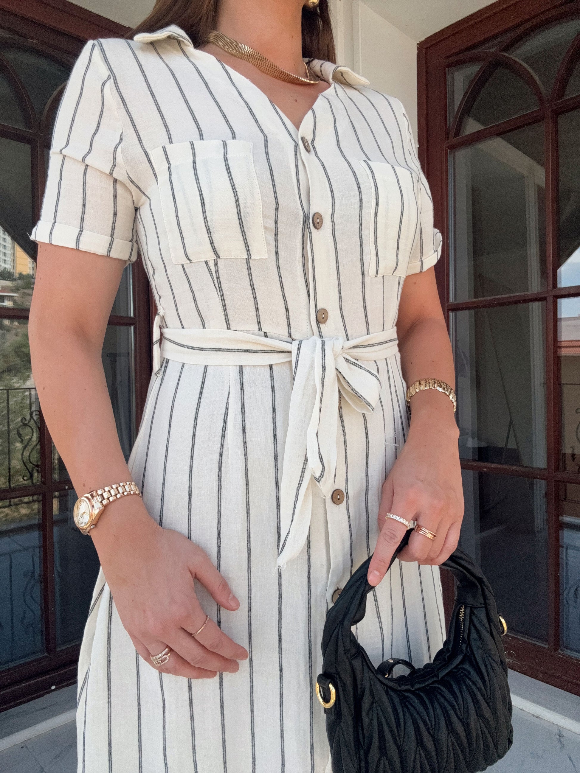 Çizgili Cepli Gömlek Elbise - SİYAH
