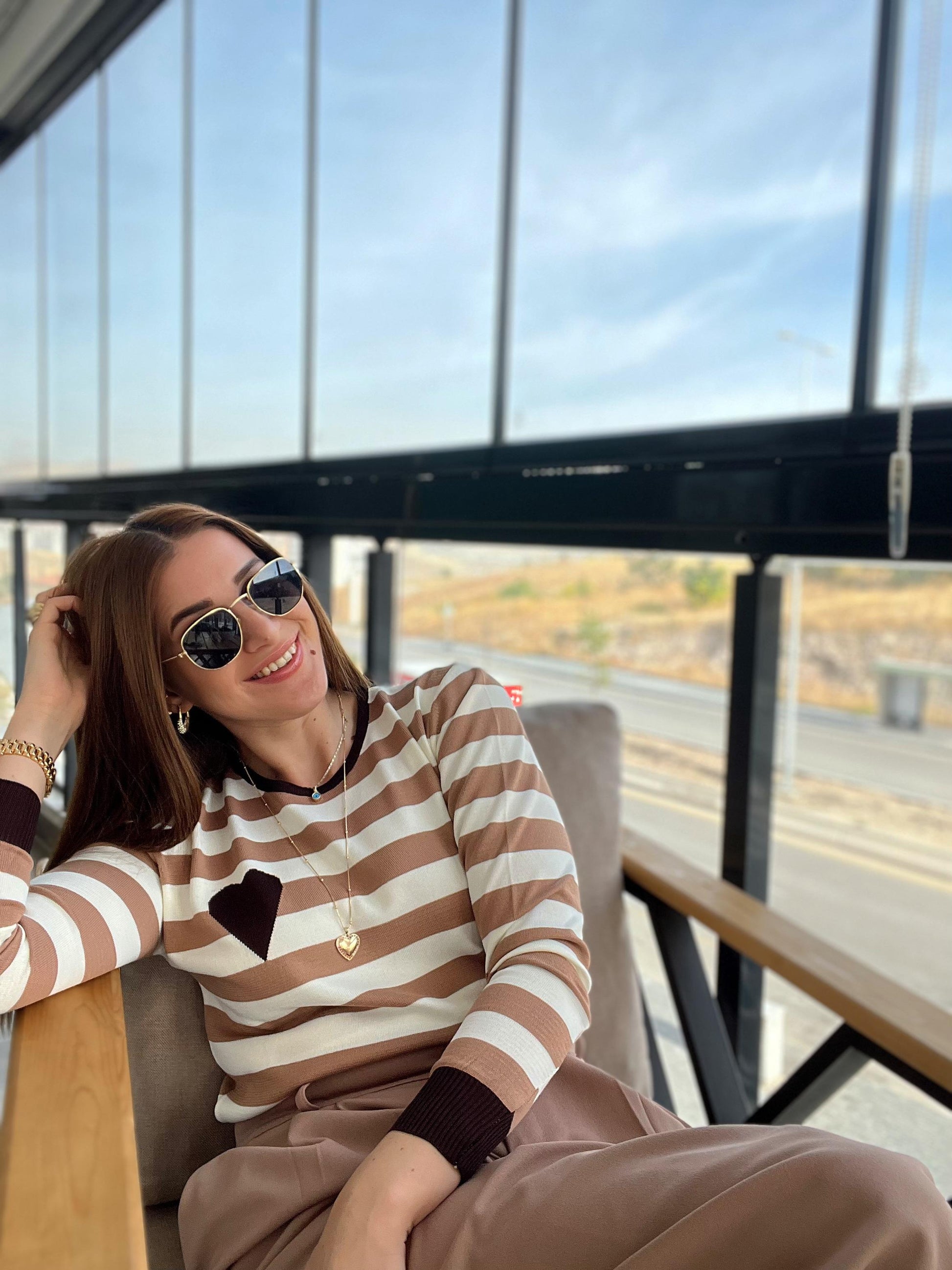 Çizgili Kalpli Triko Kazak KLS1027 KAHVE