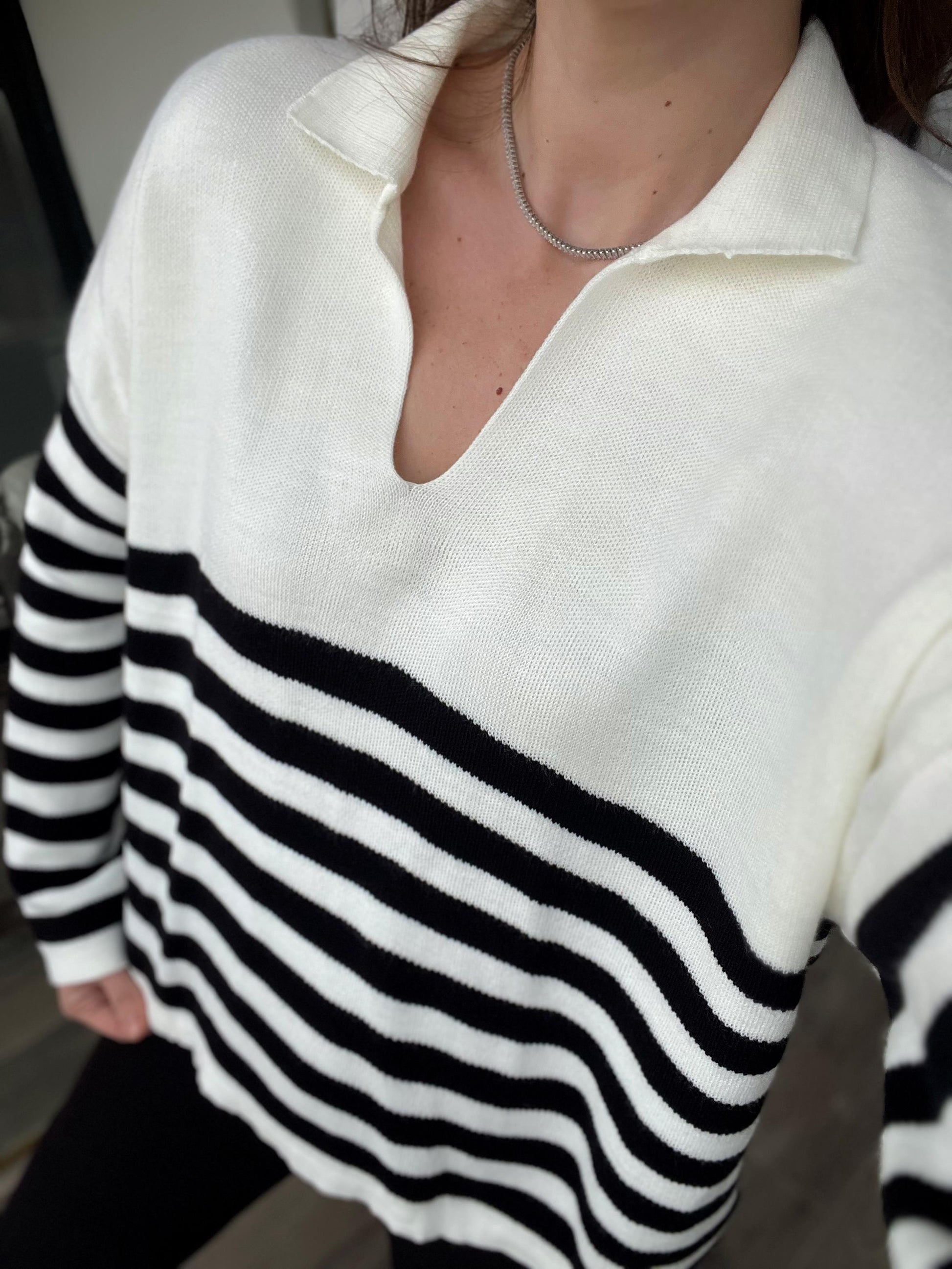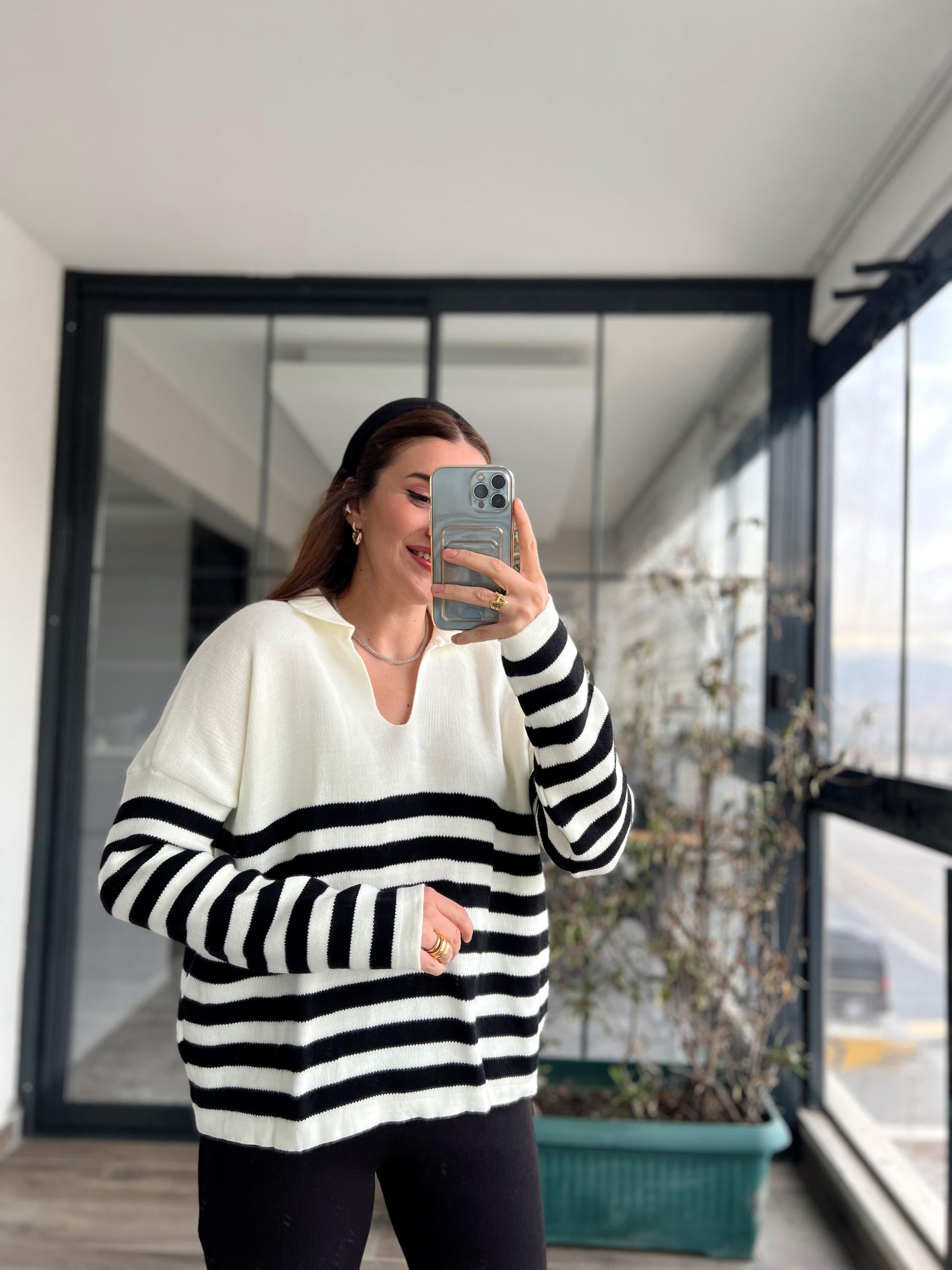 Çizgili Kısa Polo Yaka Triko Kazak KLS4028 EKRU