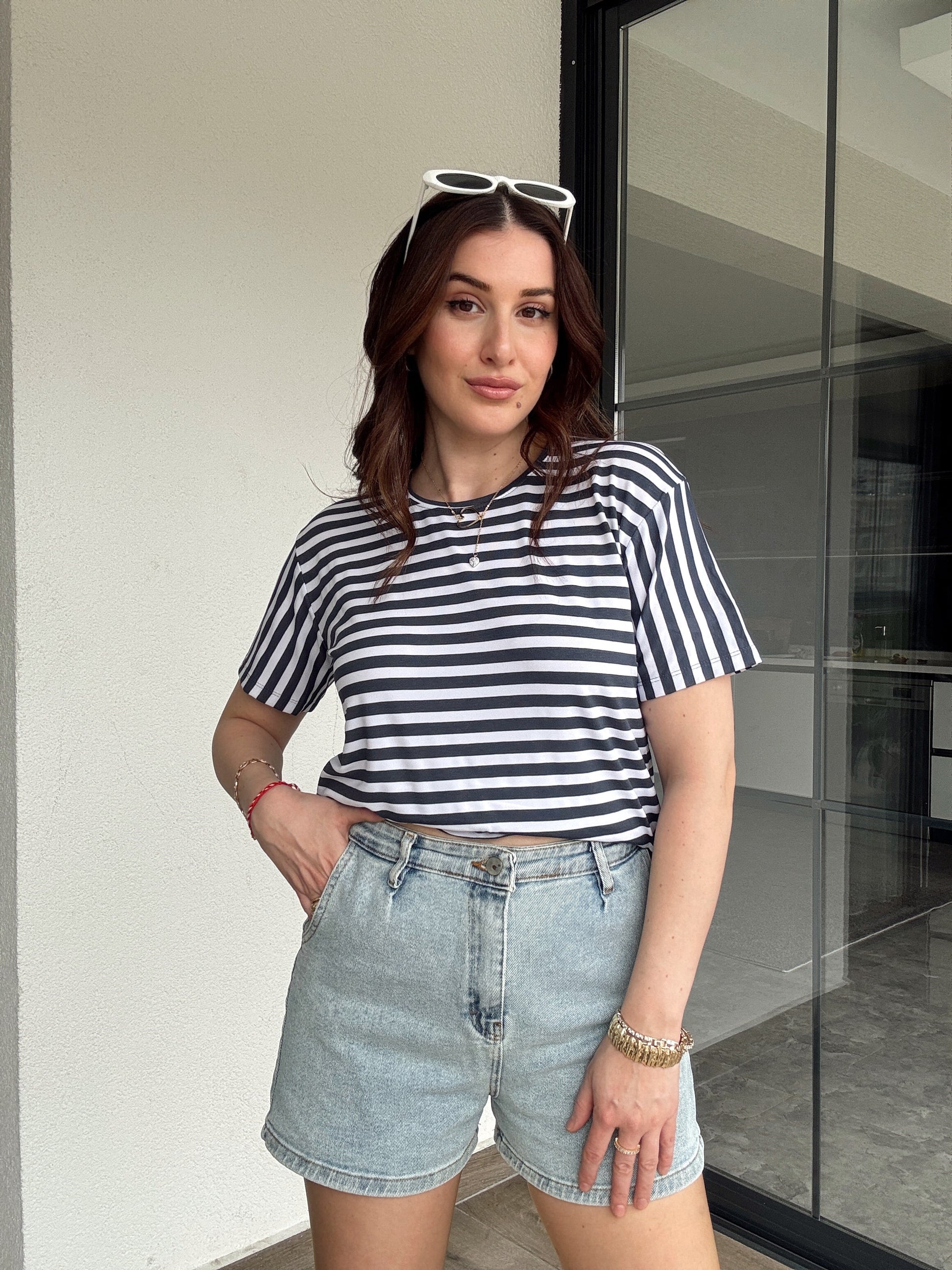 Çizgili Sıfır Yaka Kısa Kol Tişört - FÜME
