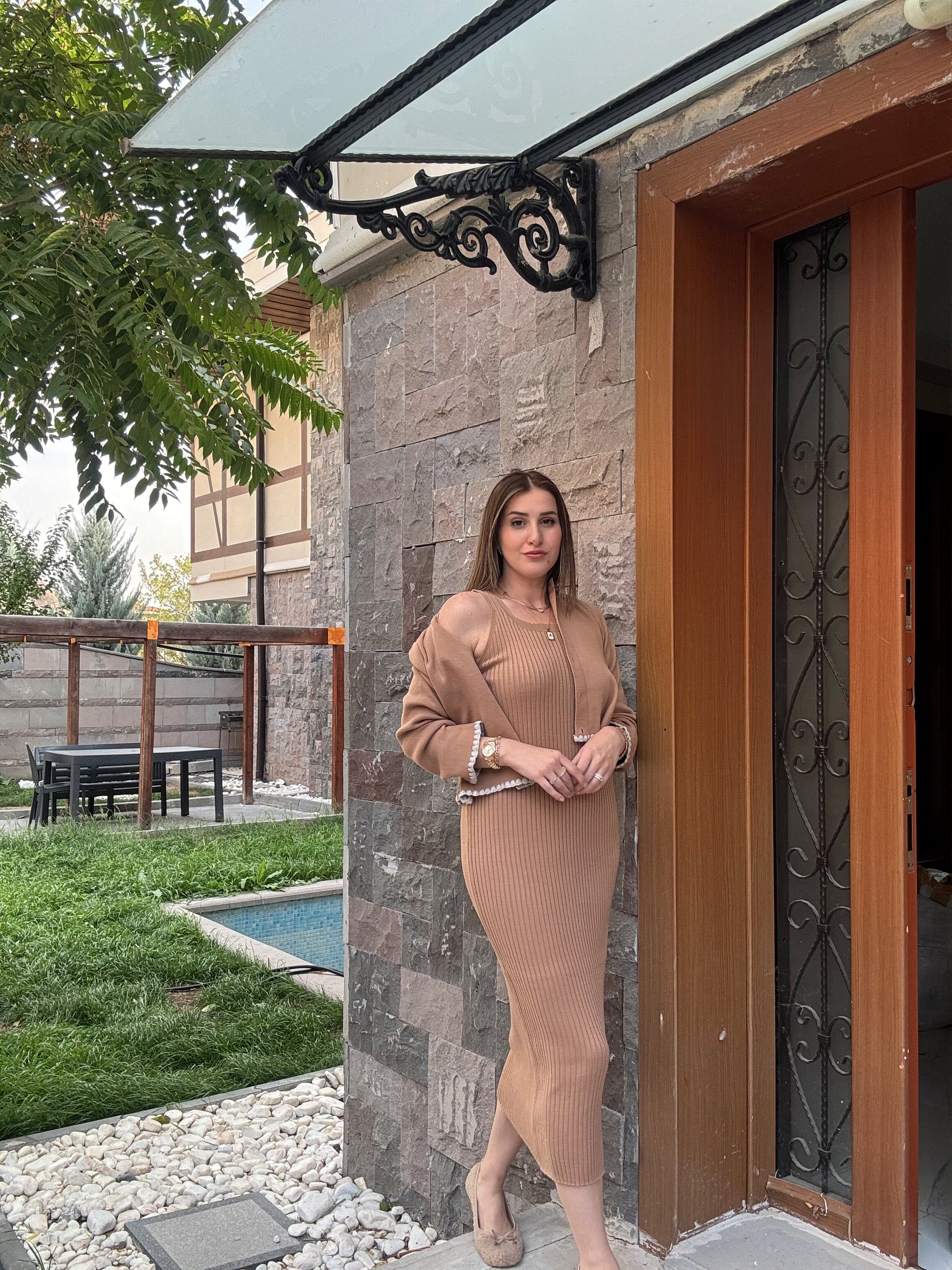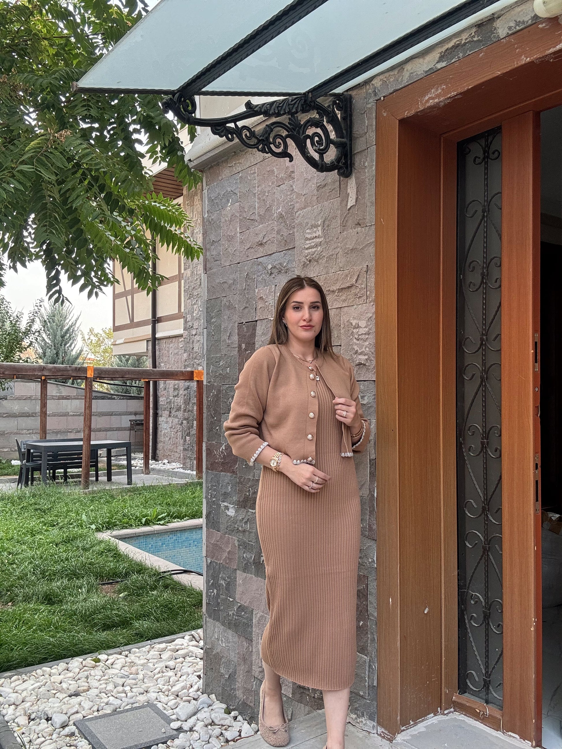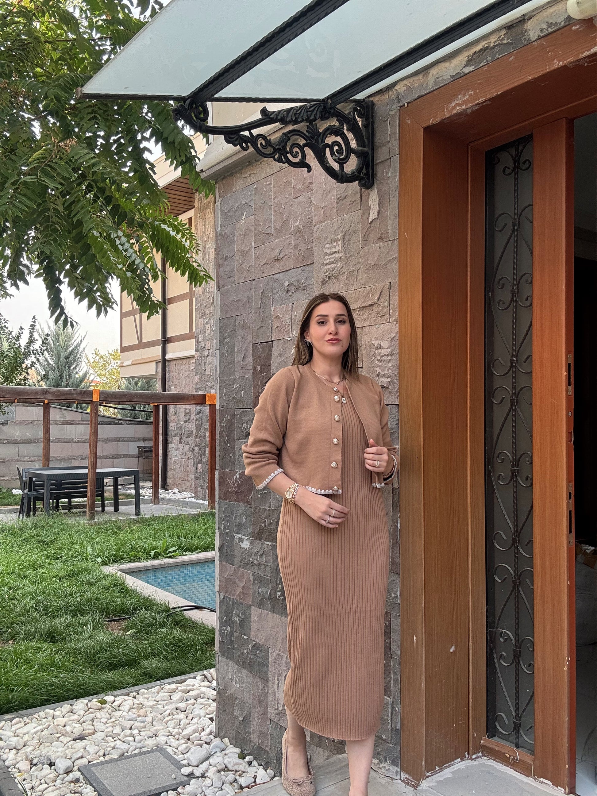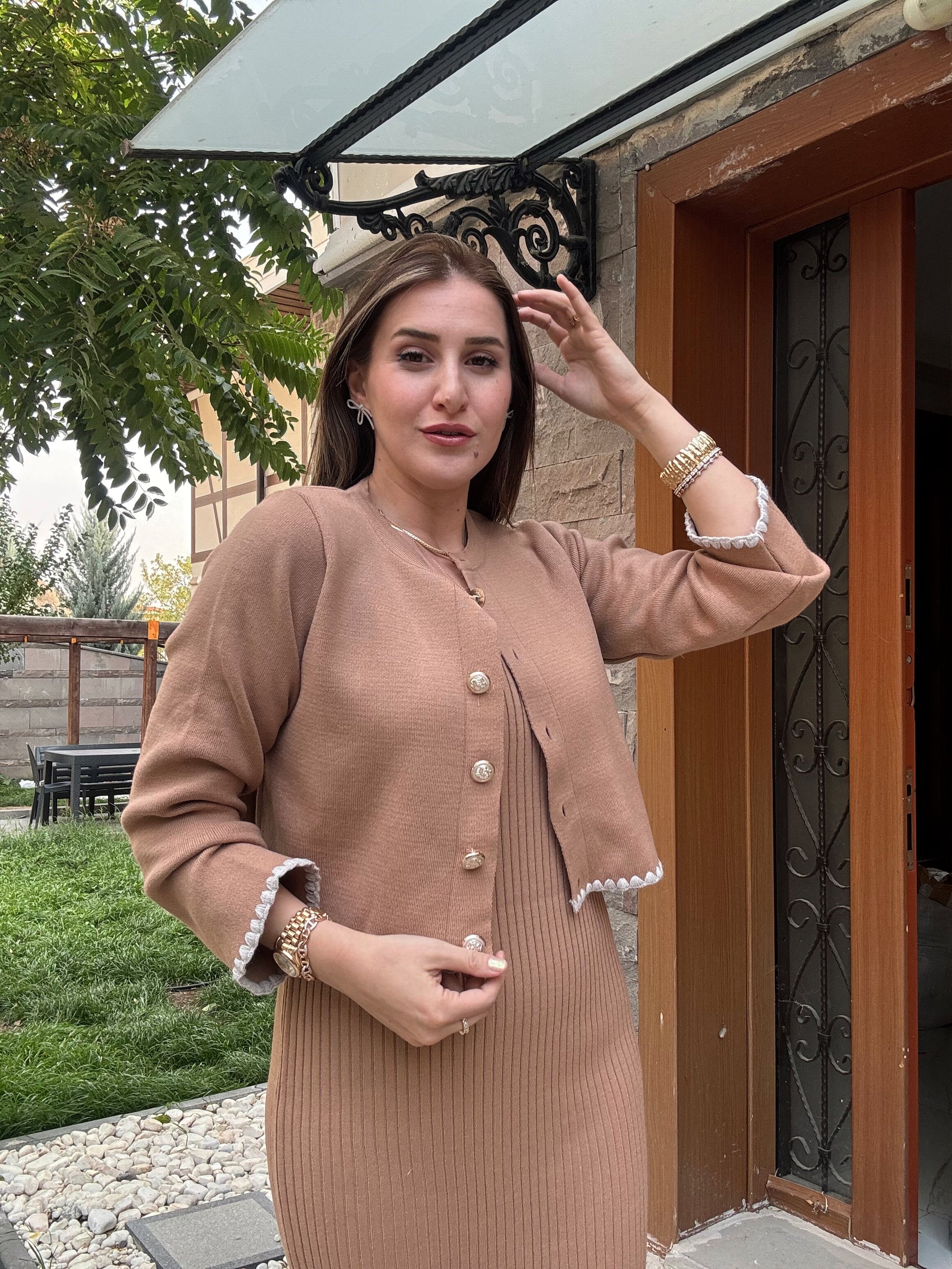 Çoban Dikişli Ceketli Triko Takım - CAMEL
