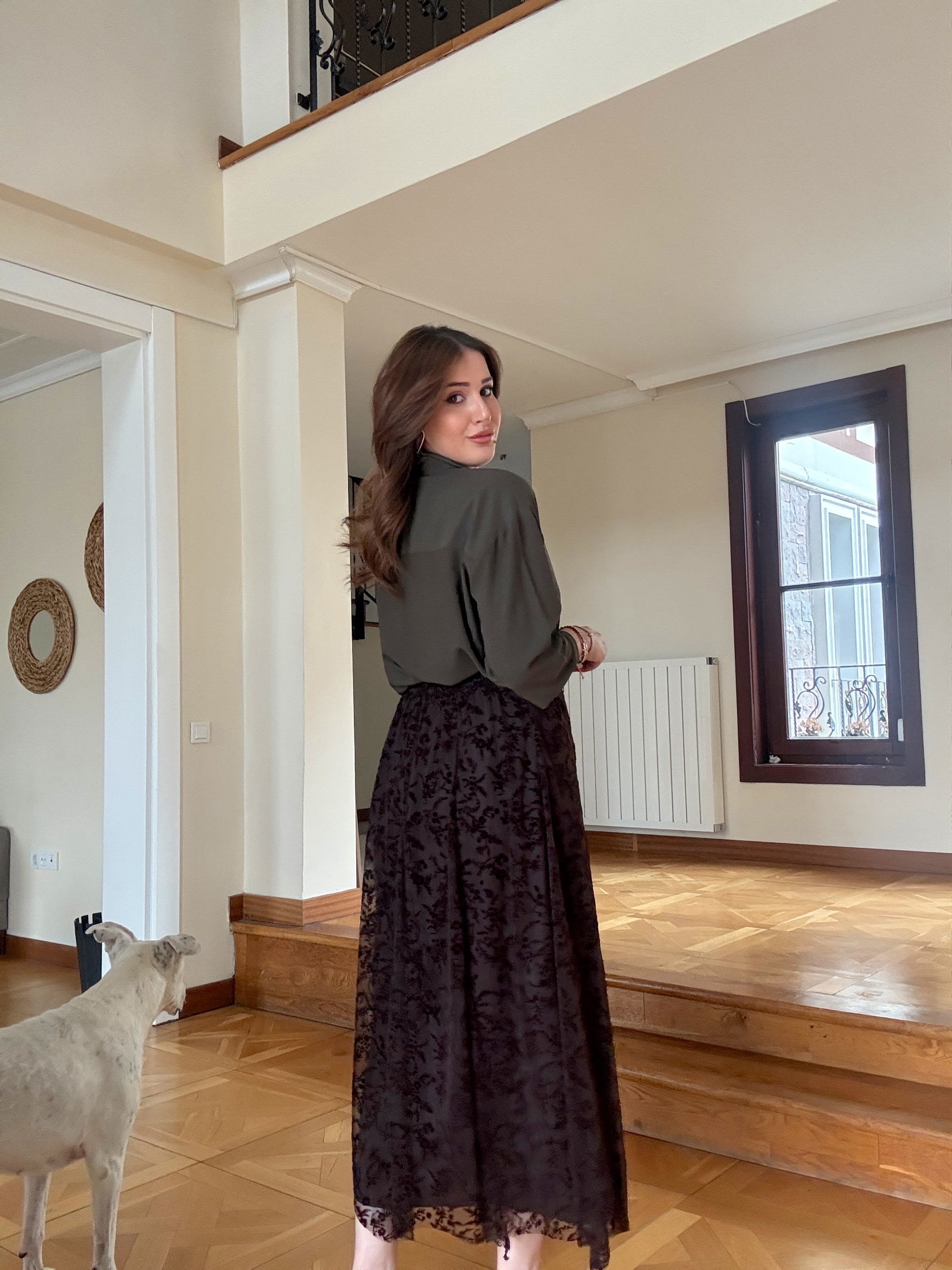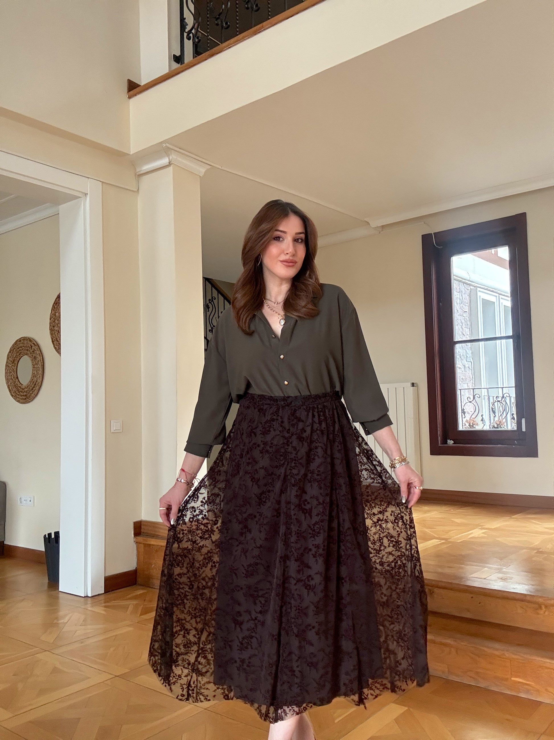 Dal desen astarlı şifon etek Kahve