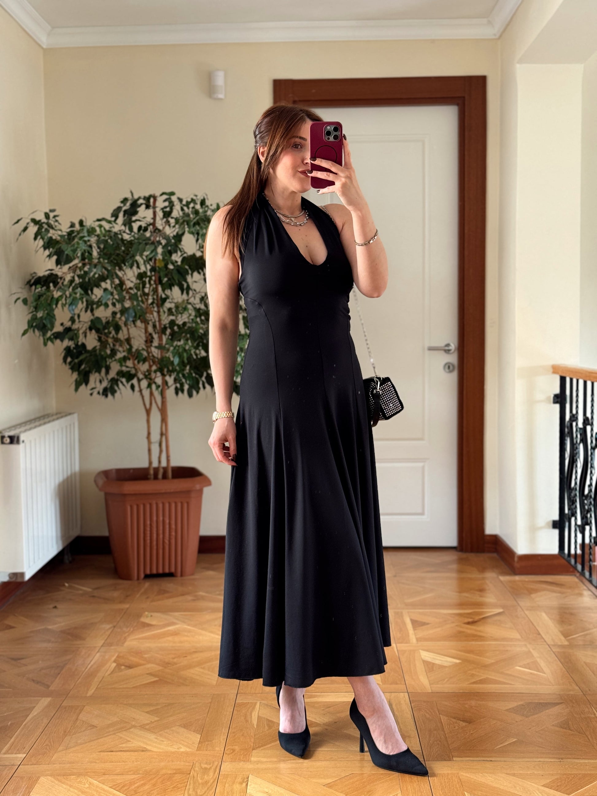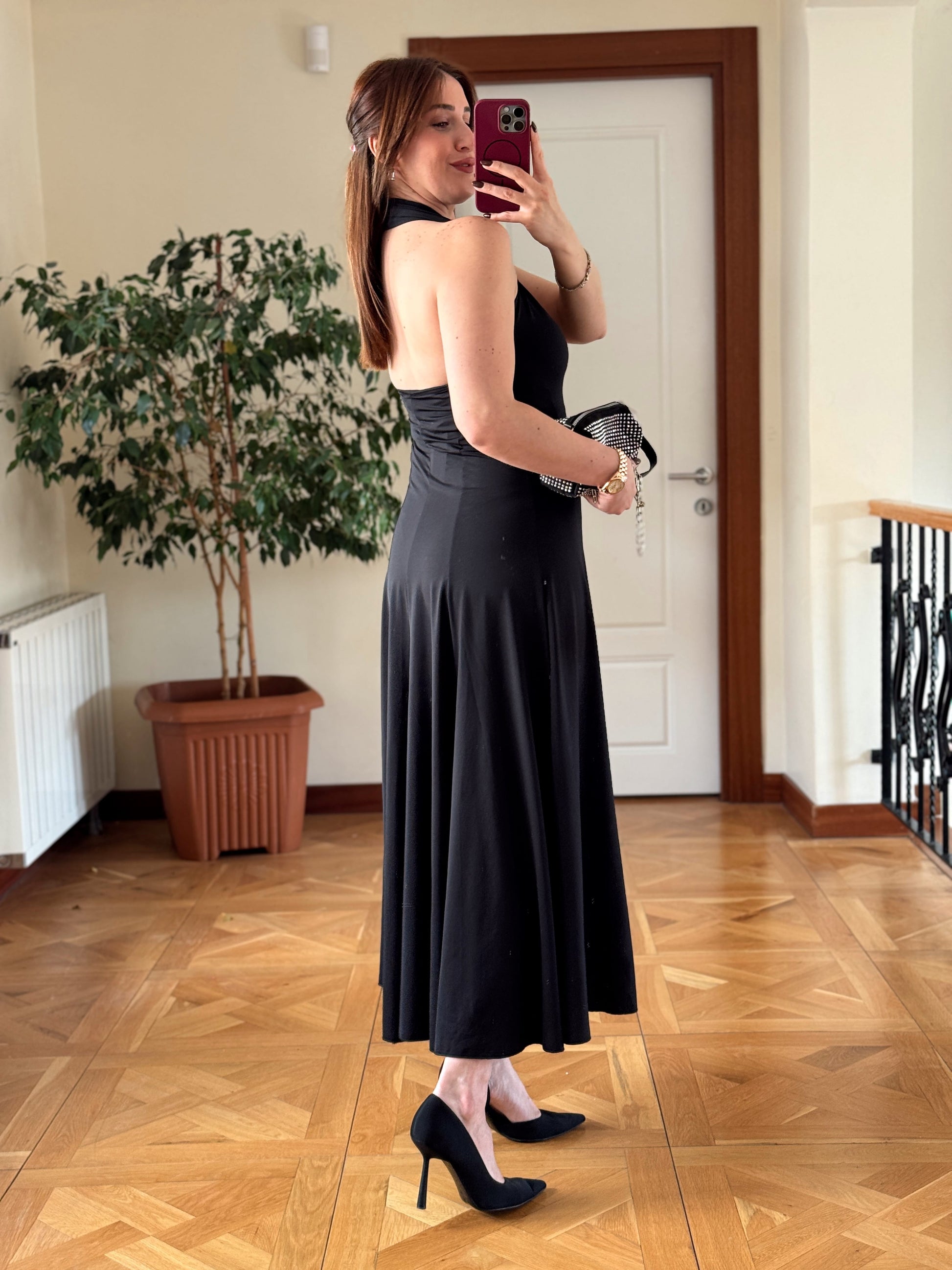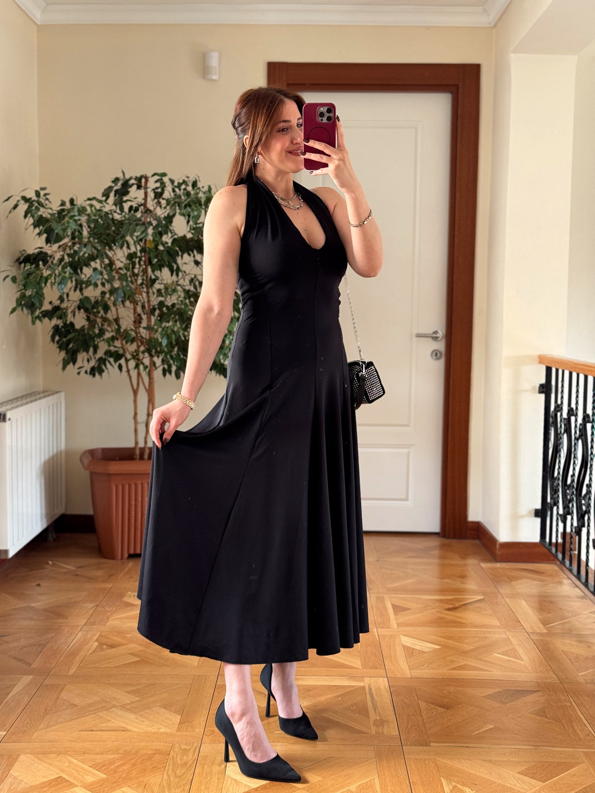 Dalgıç kumaş boyun geçme elbise-SİYAH