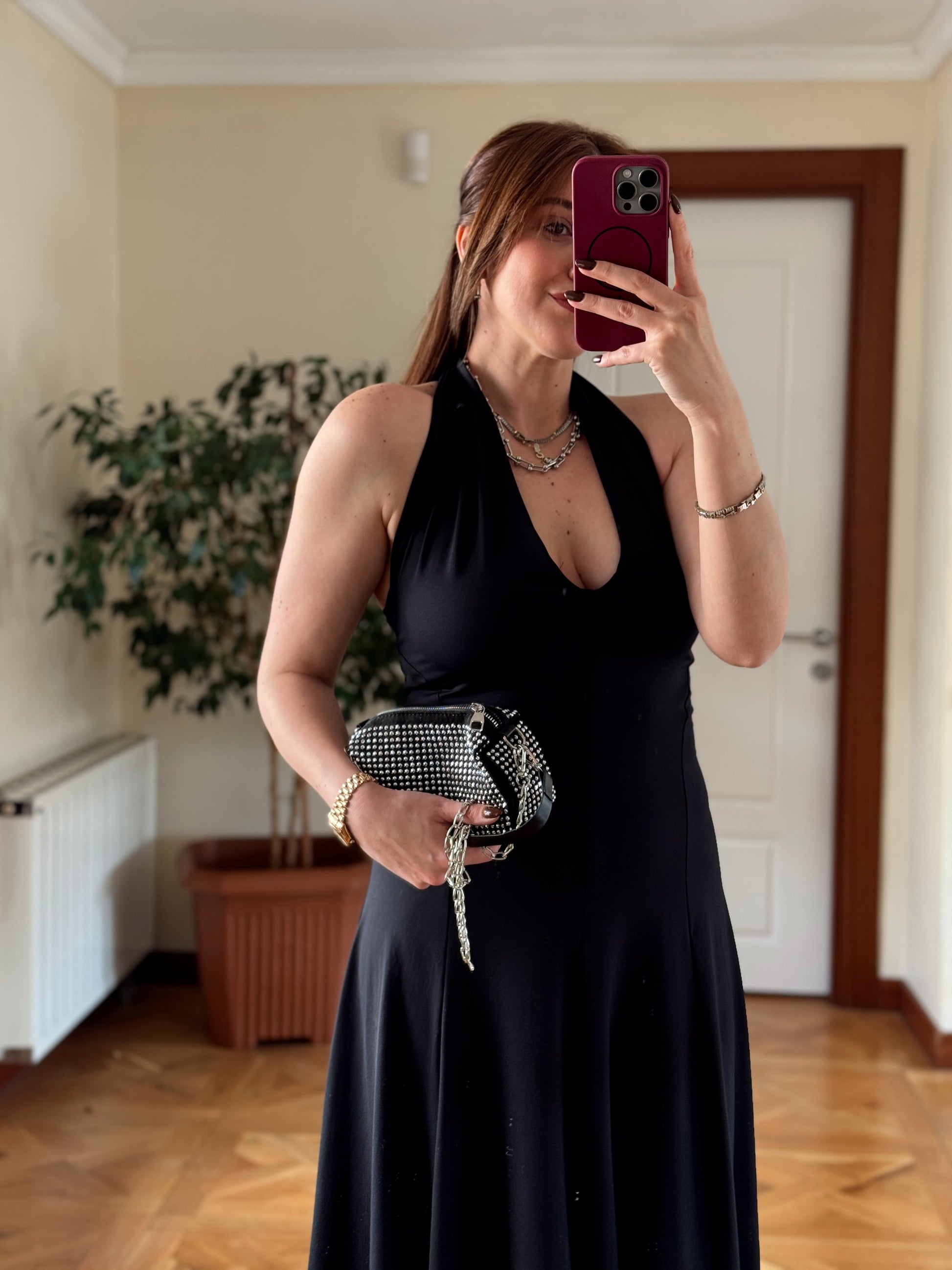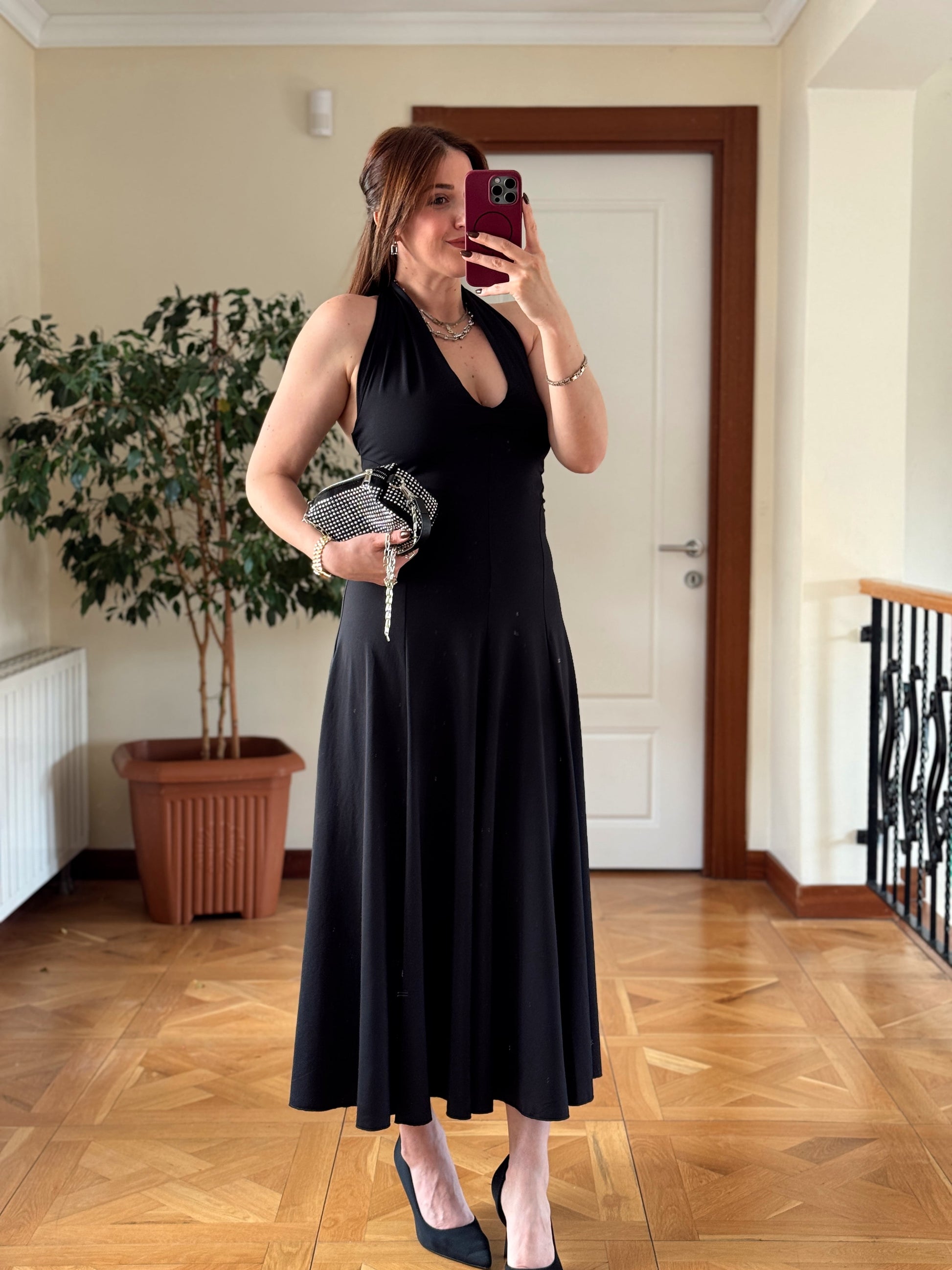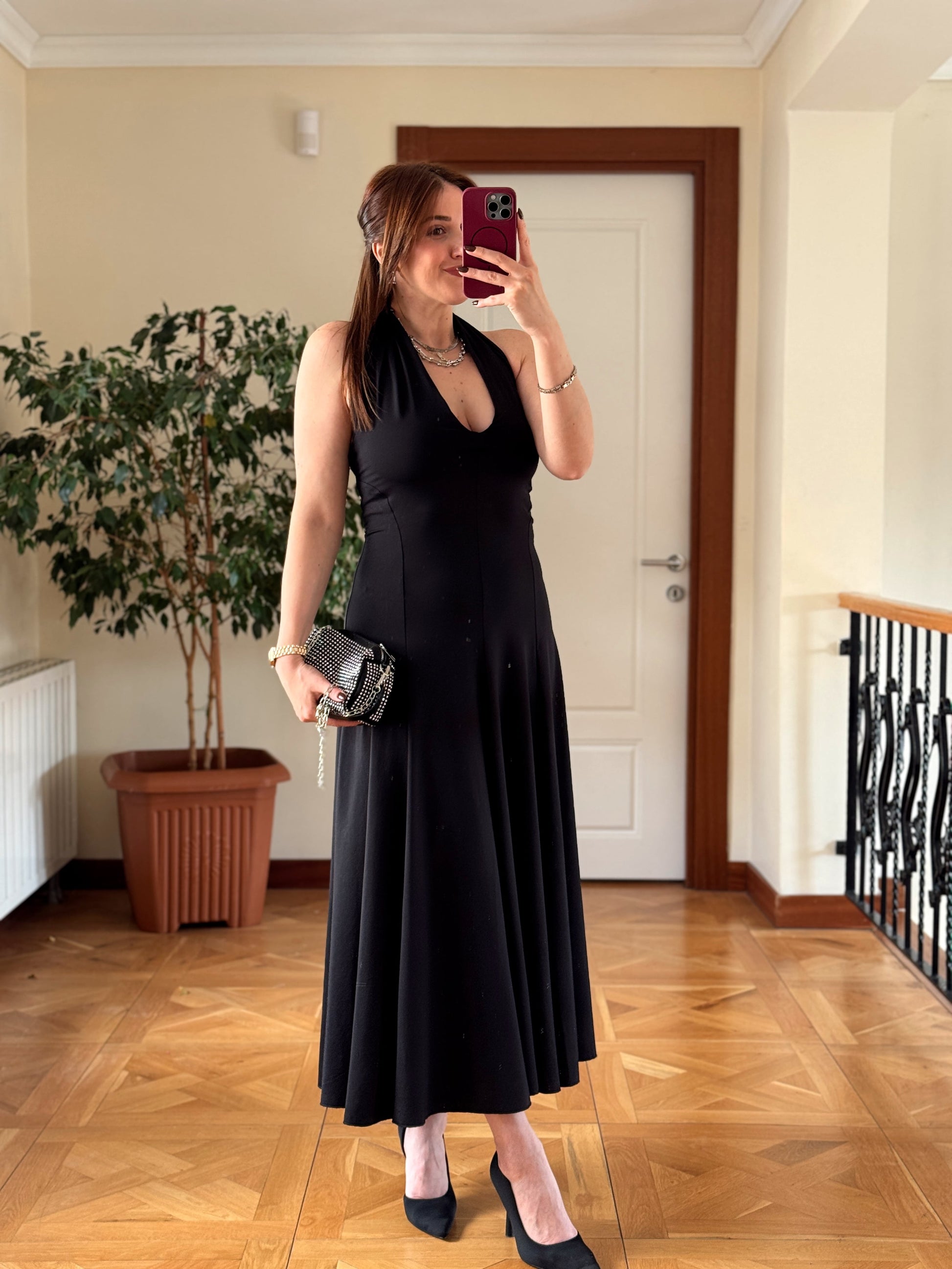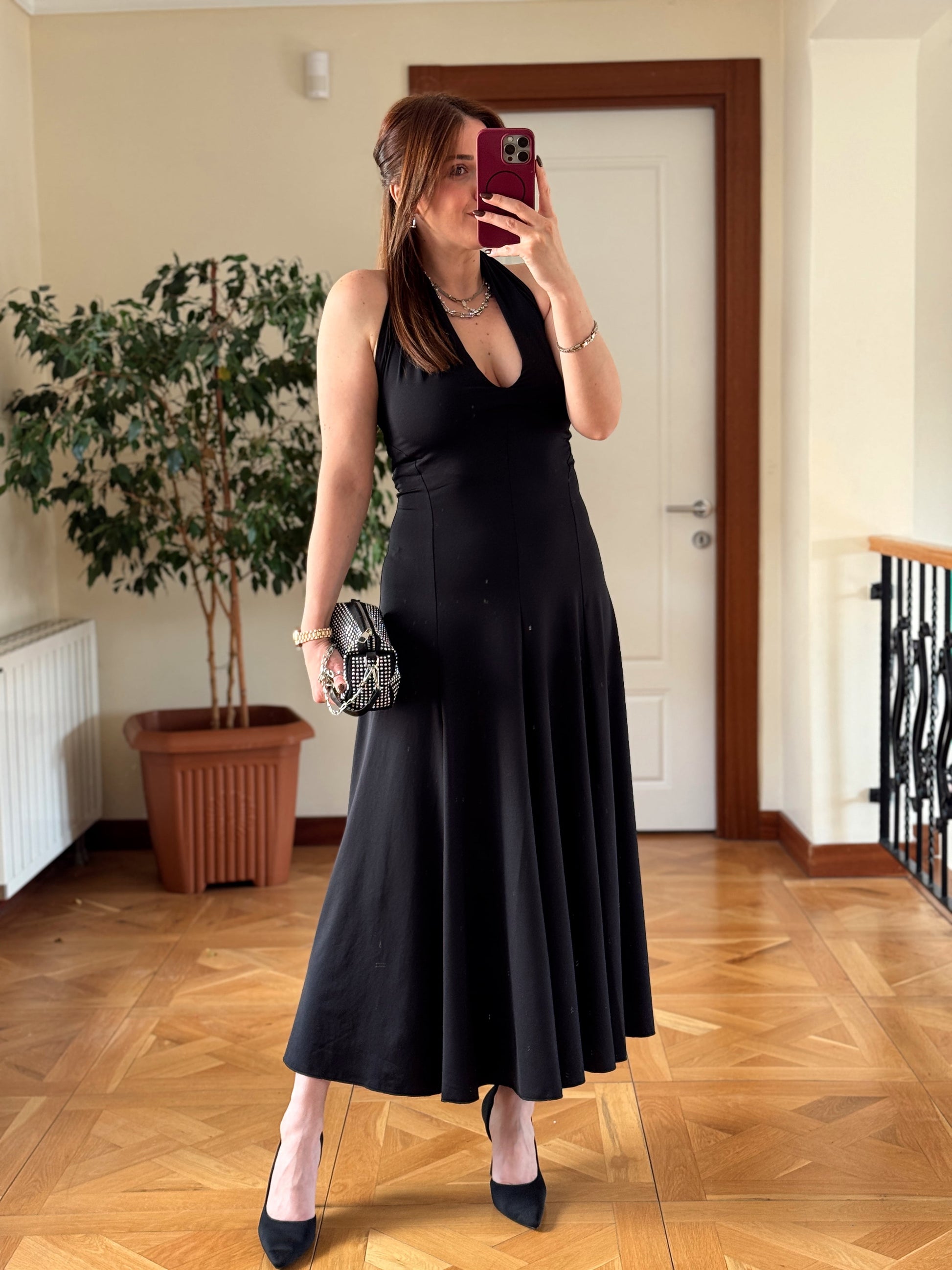 Dalgıç kumaş boyun geçme elbise-SİYAH