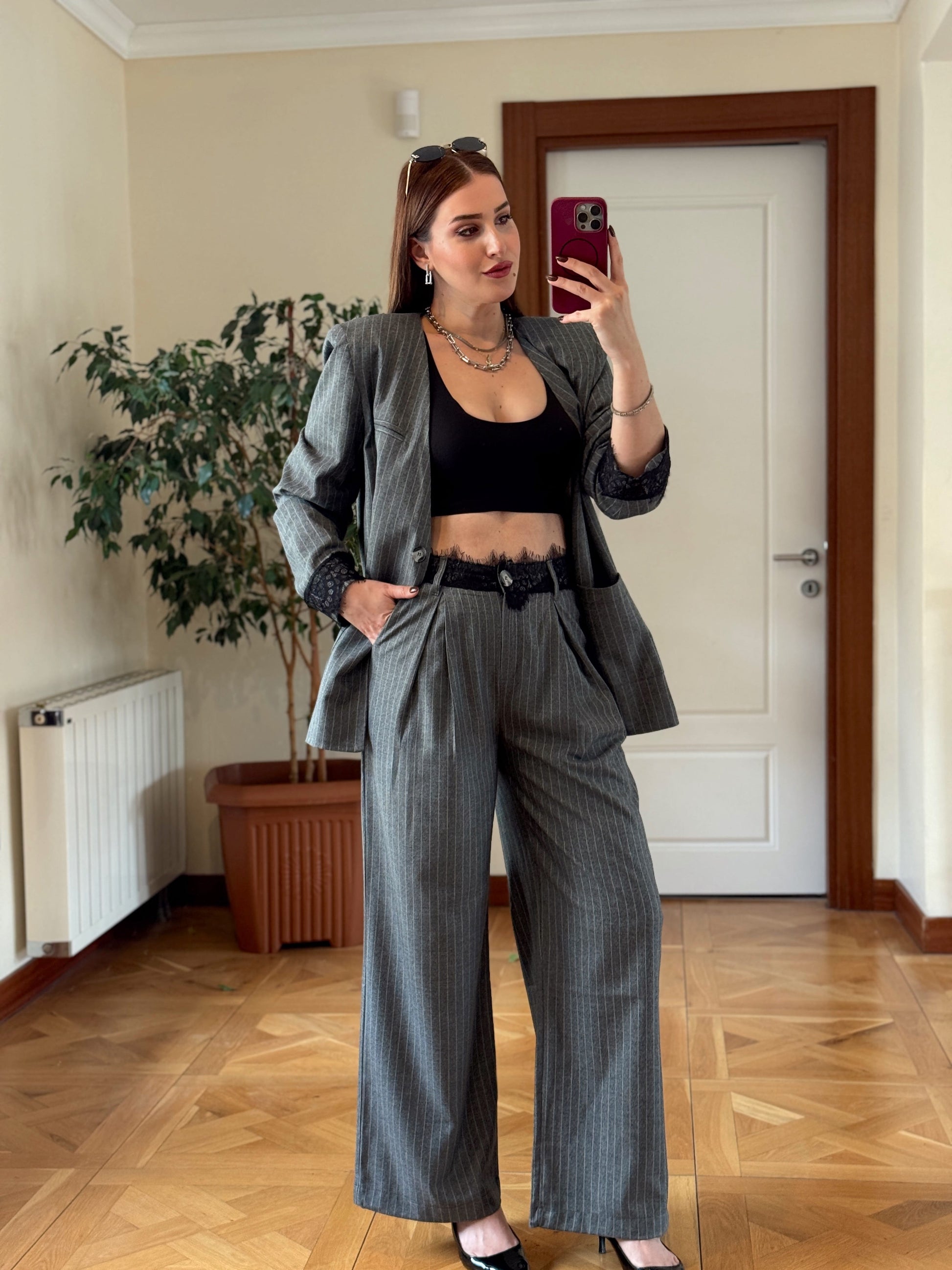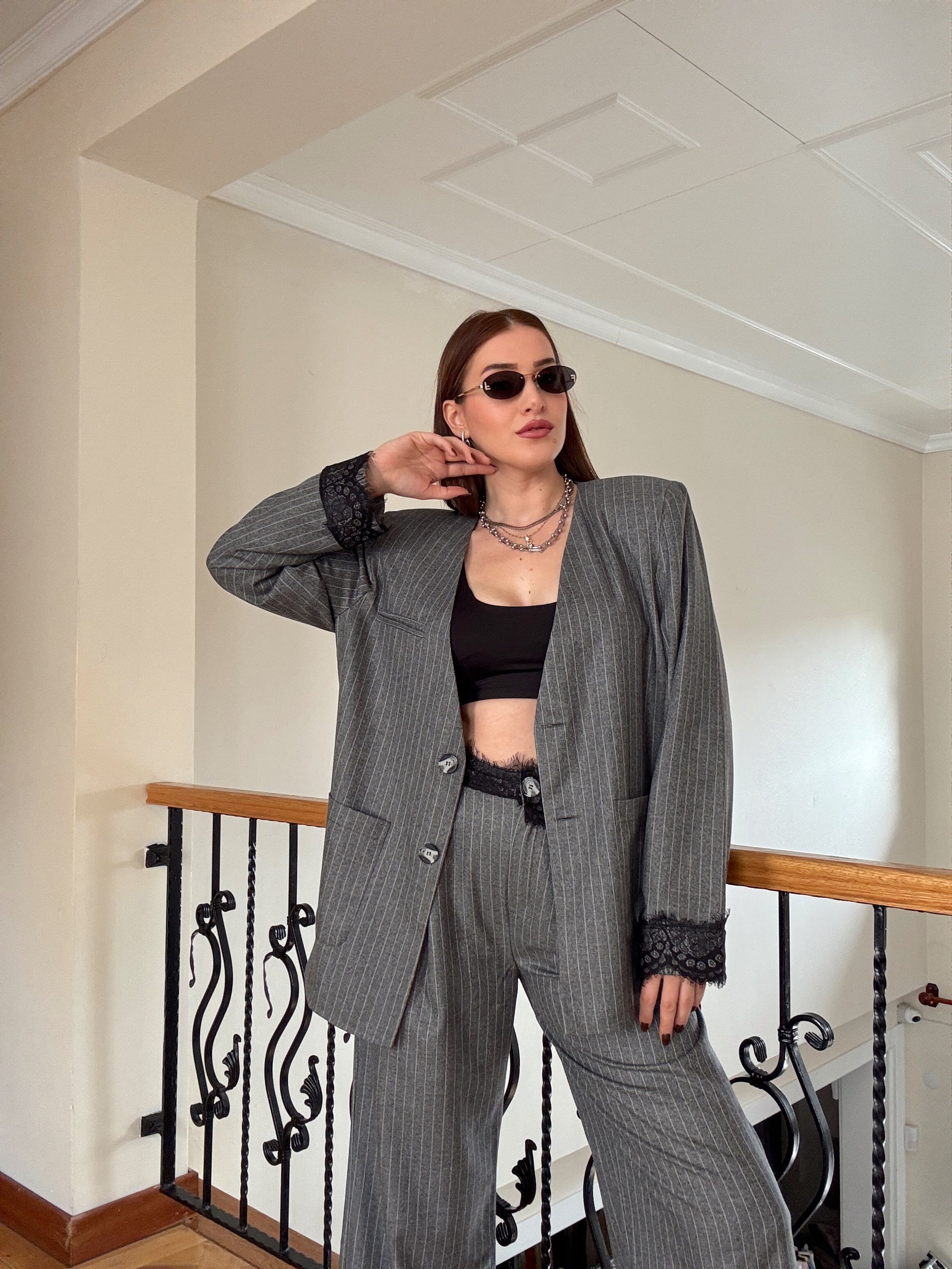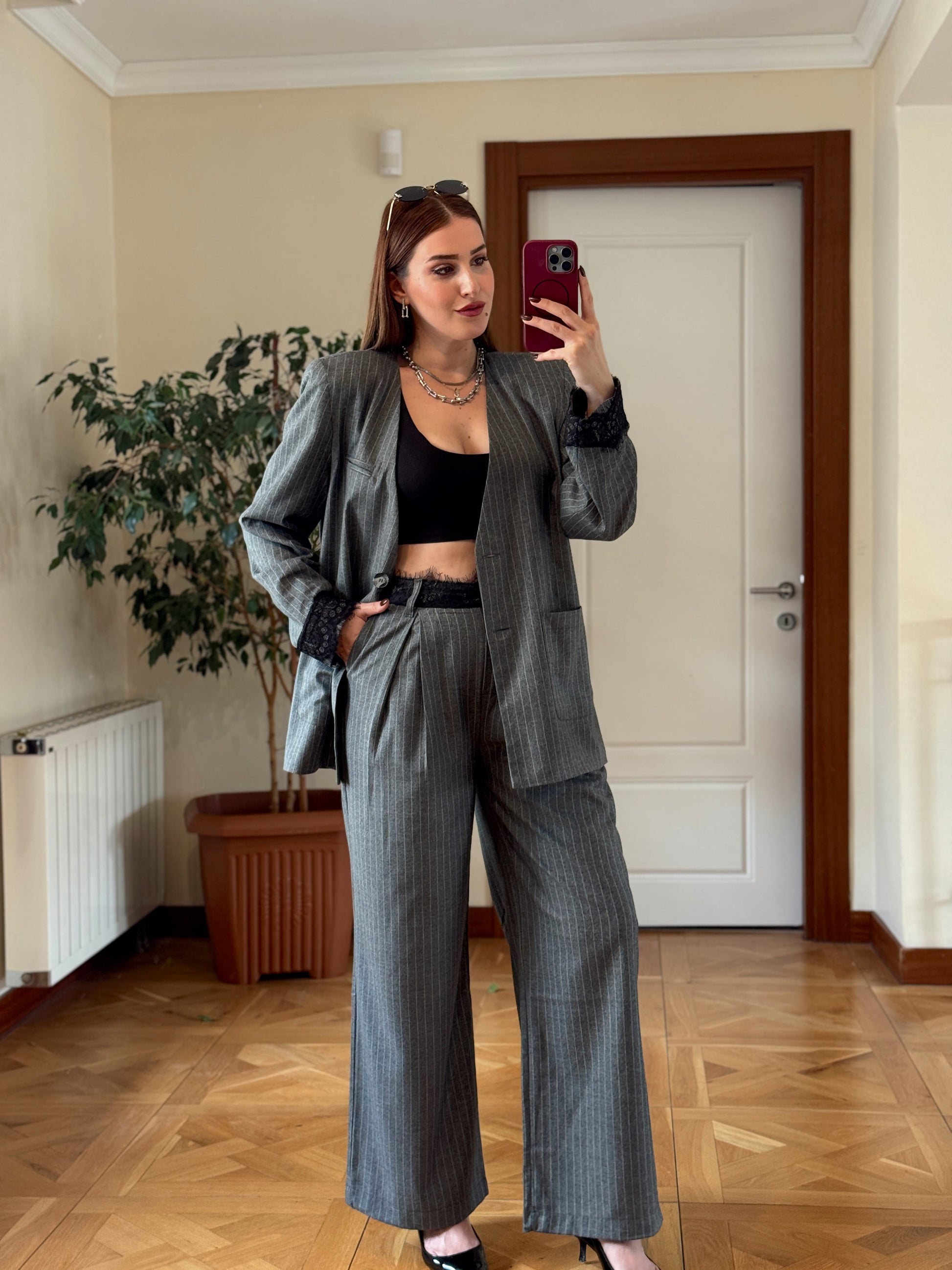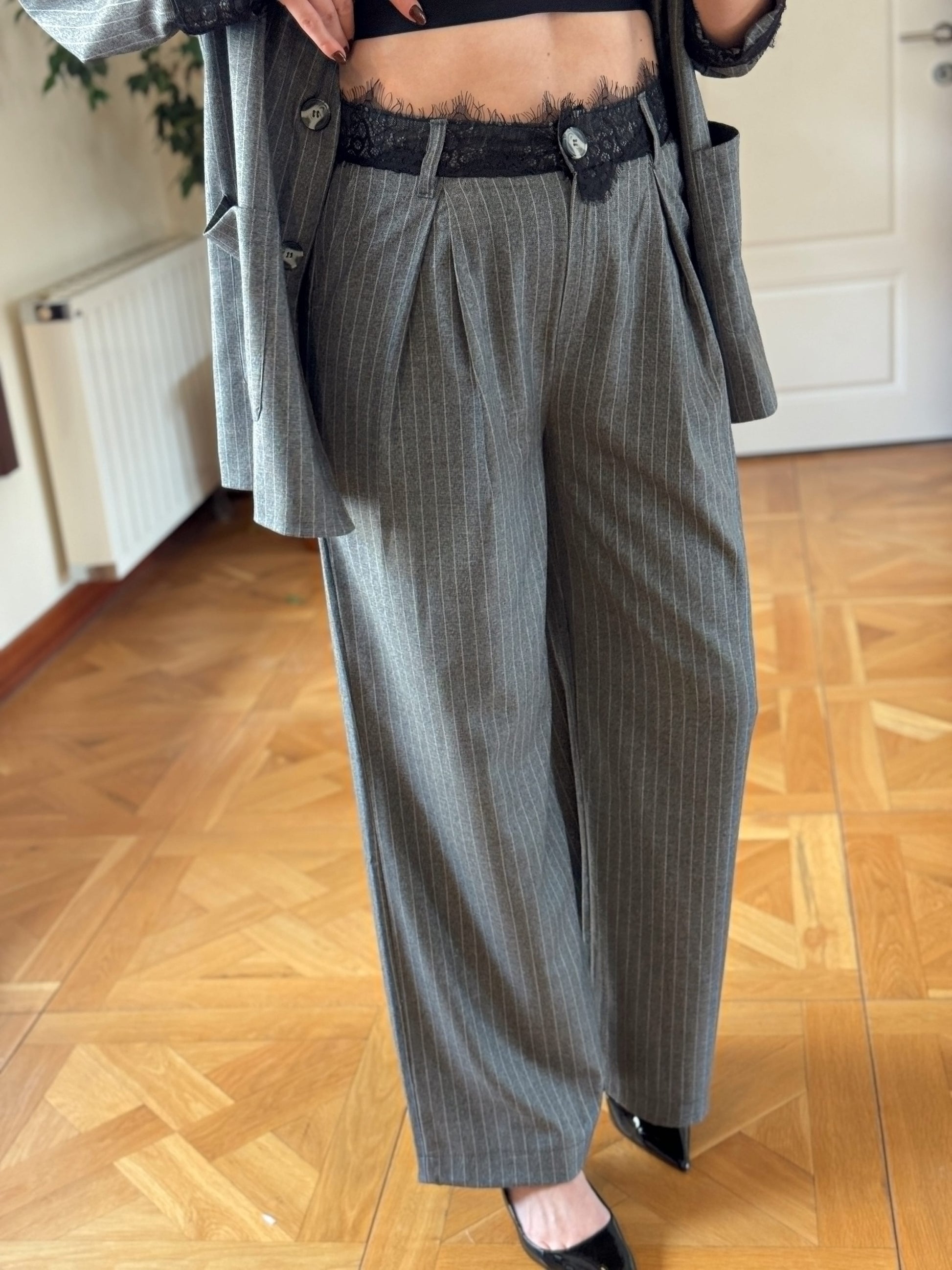 Dantel detaylı çizgili premium takım GRİ