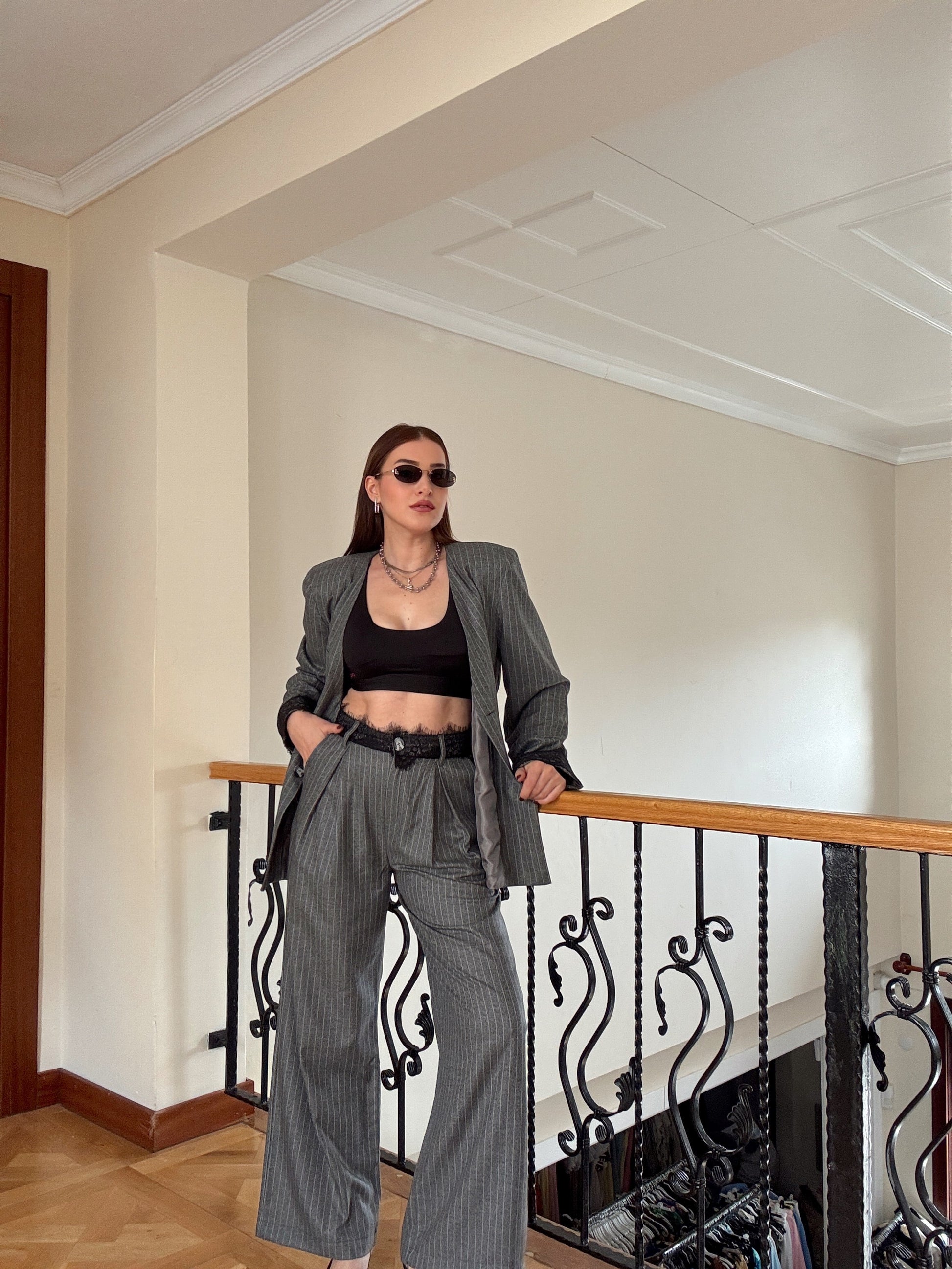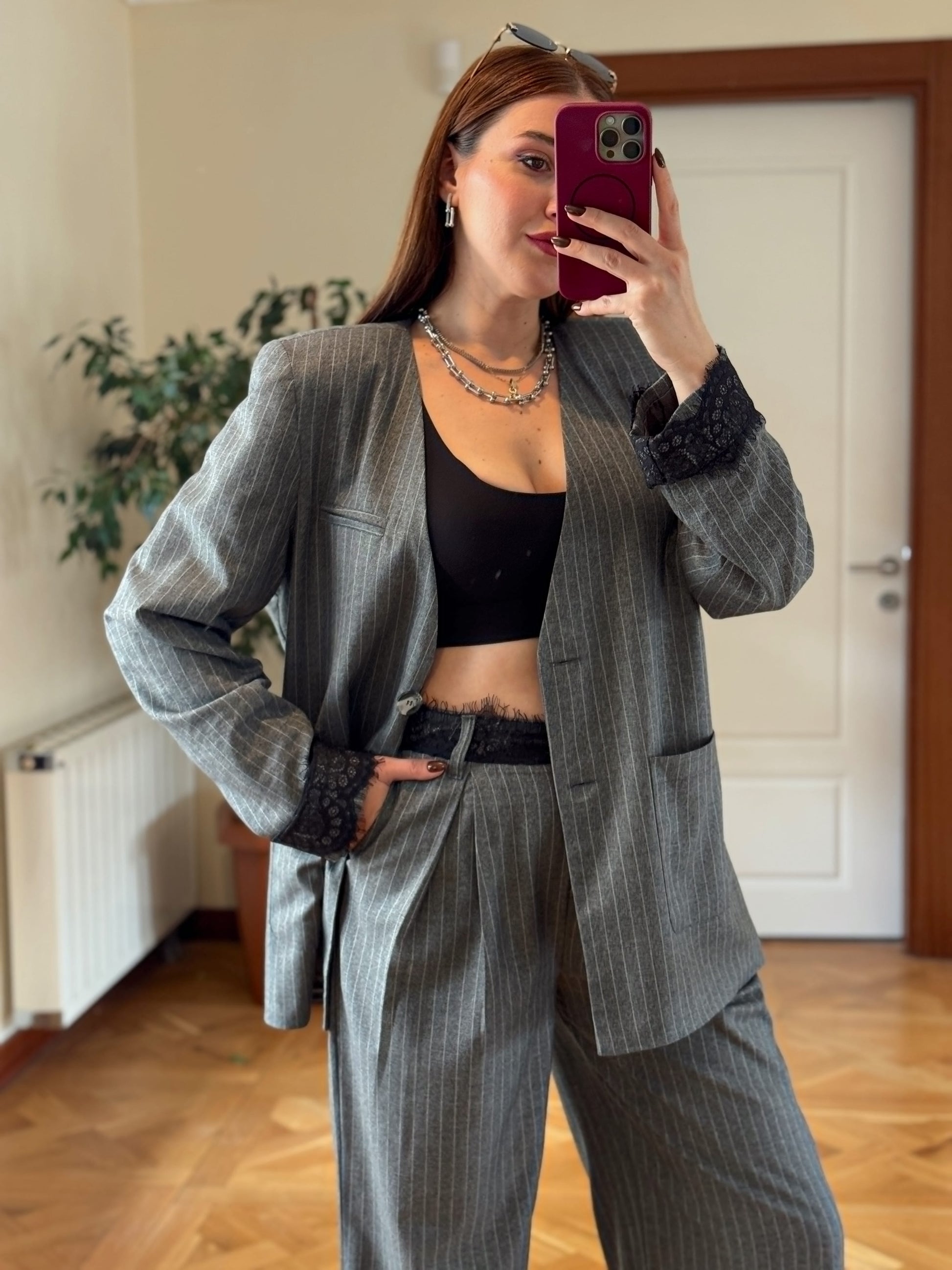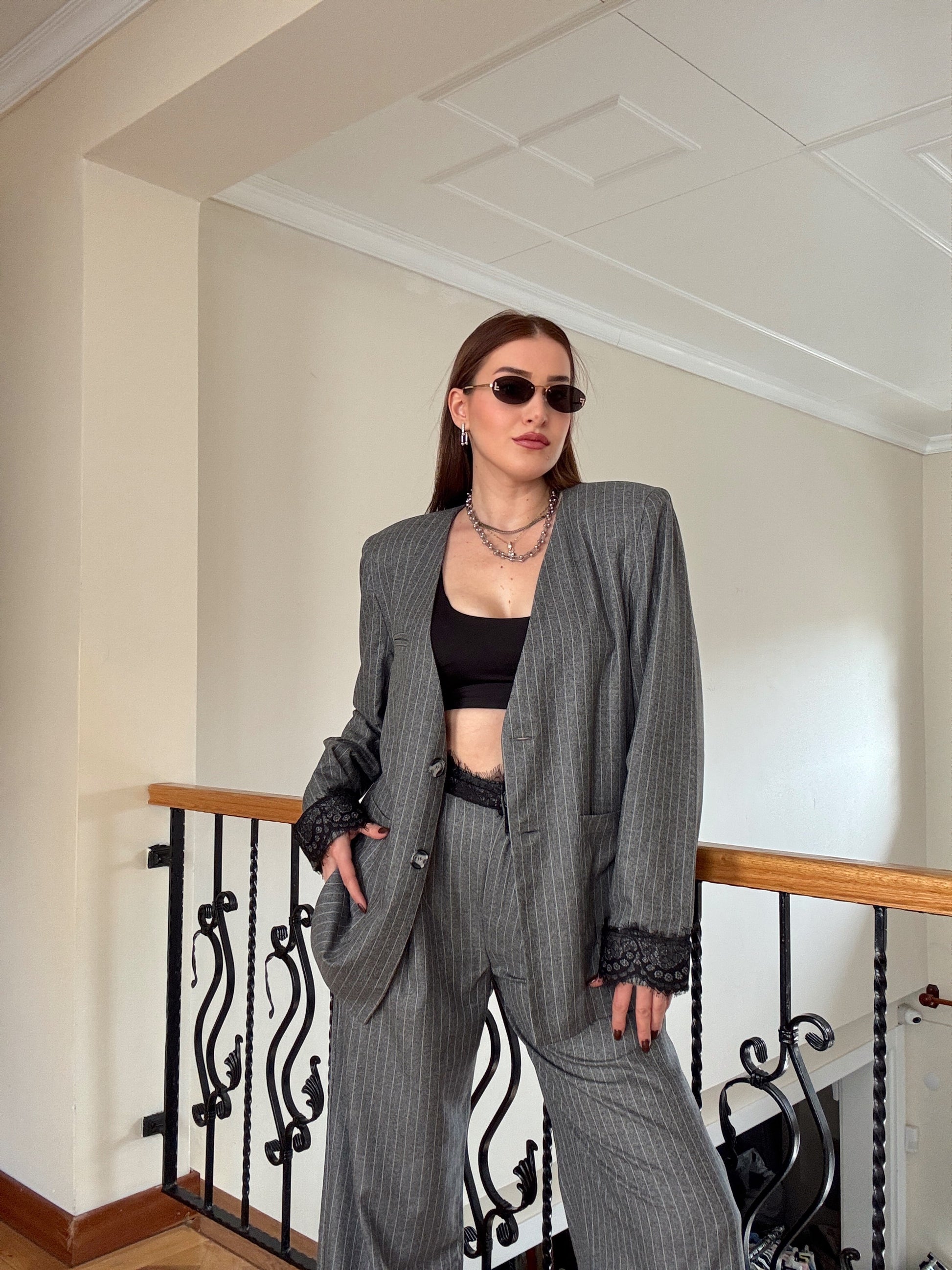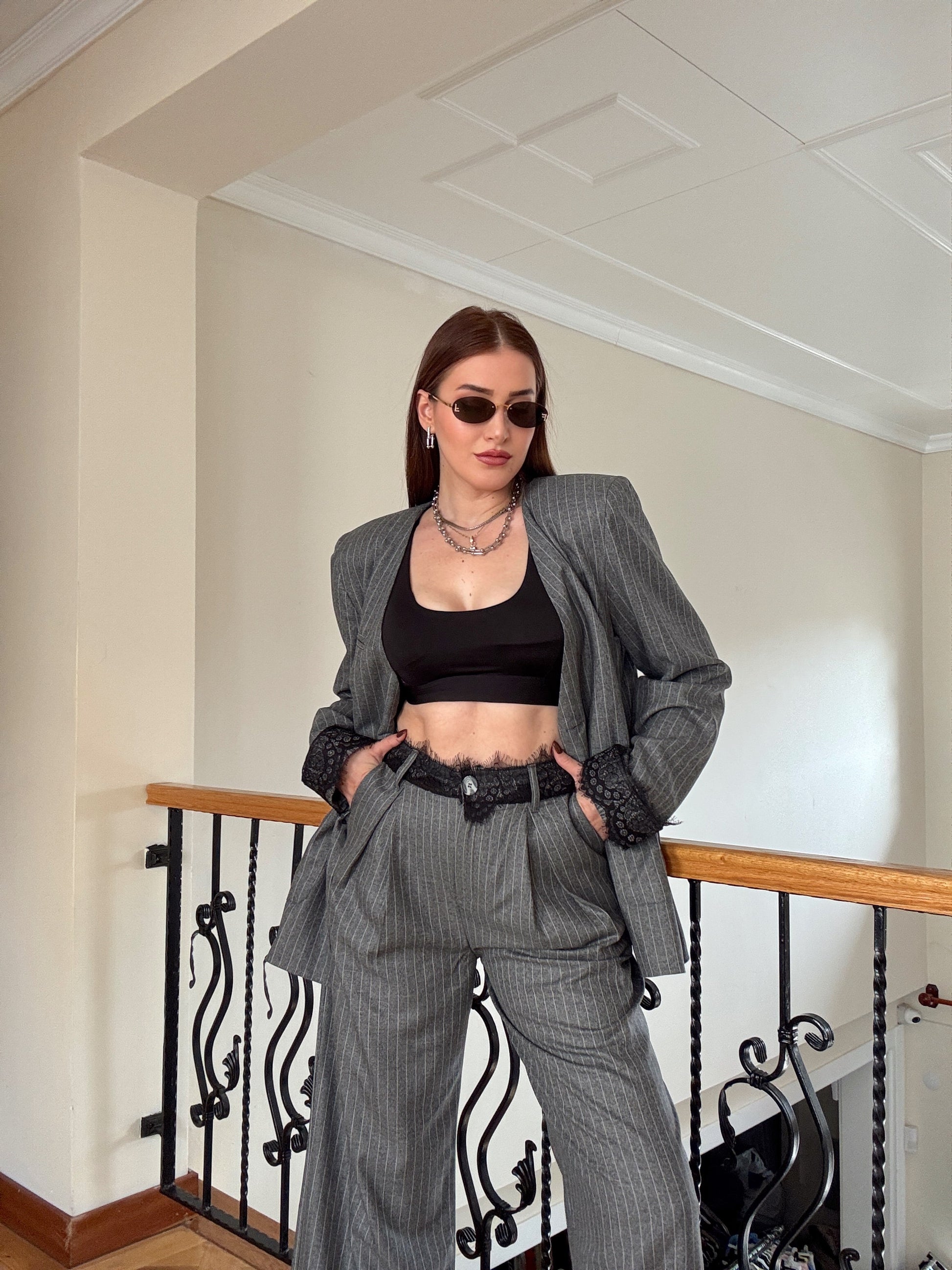 Dantel detaylı çizgili premium takım GRİ