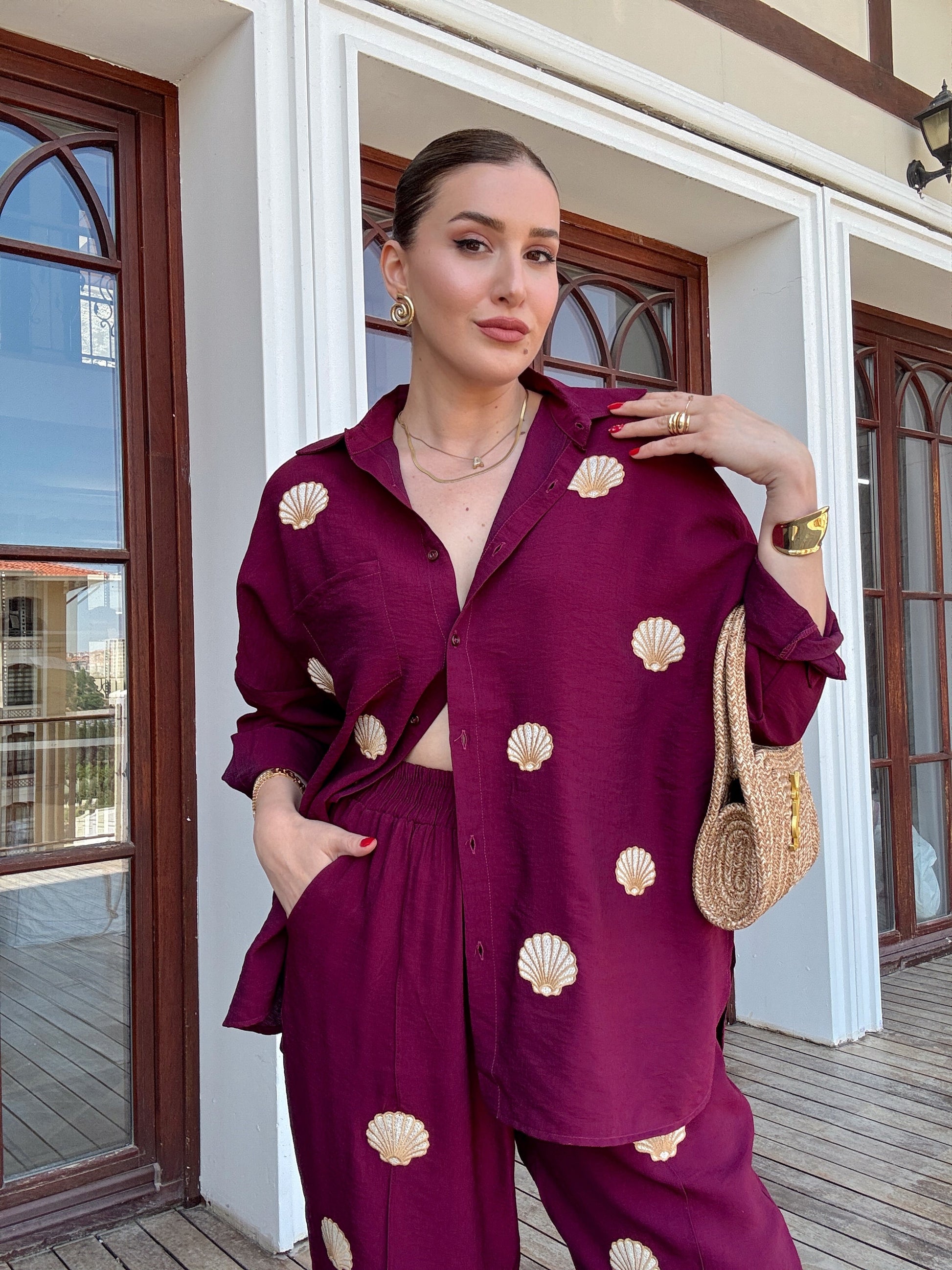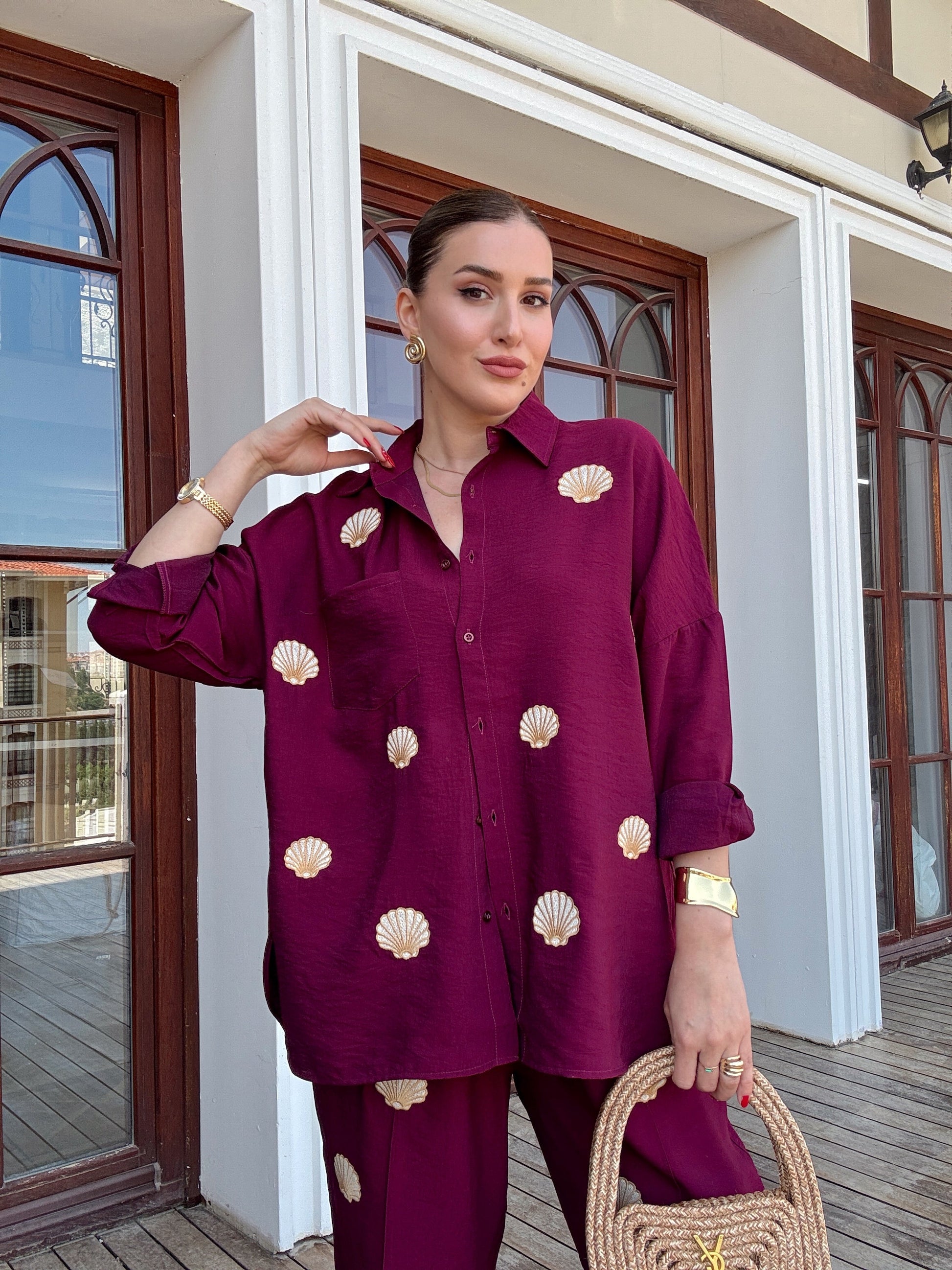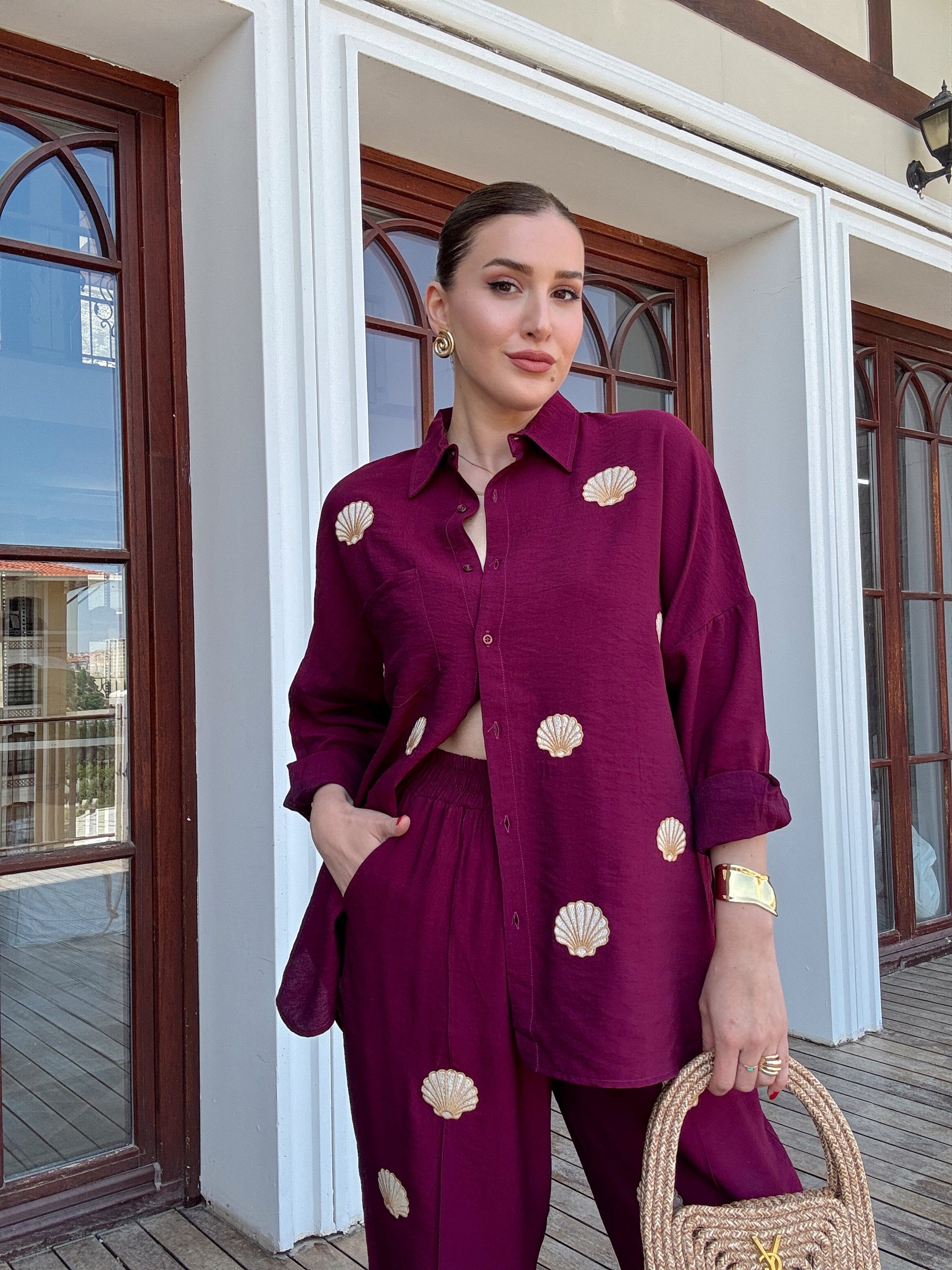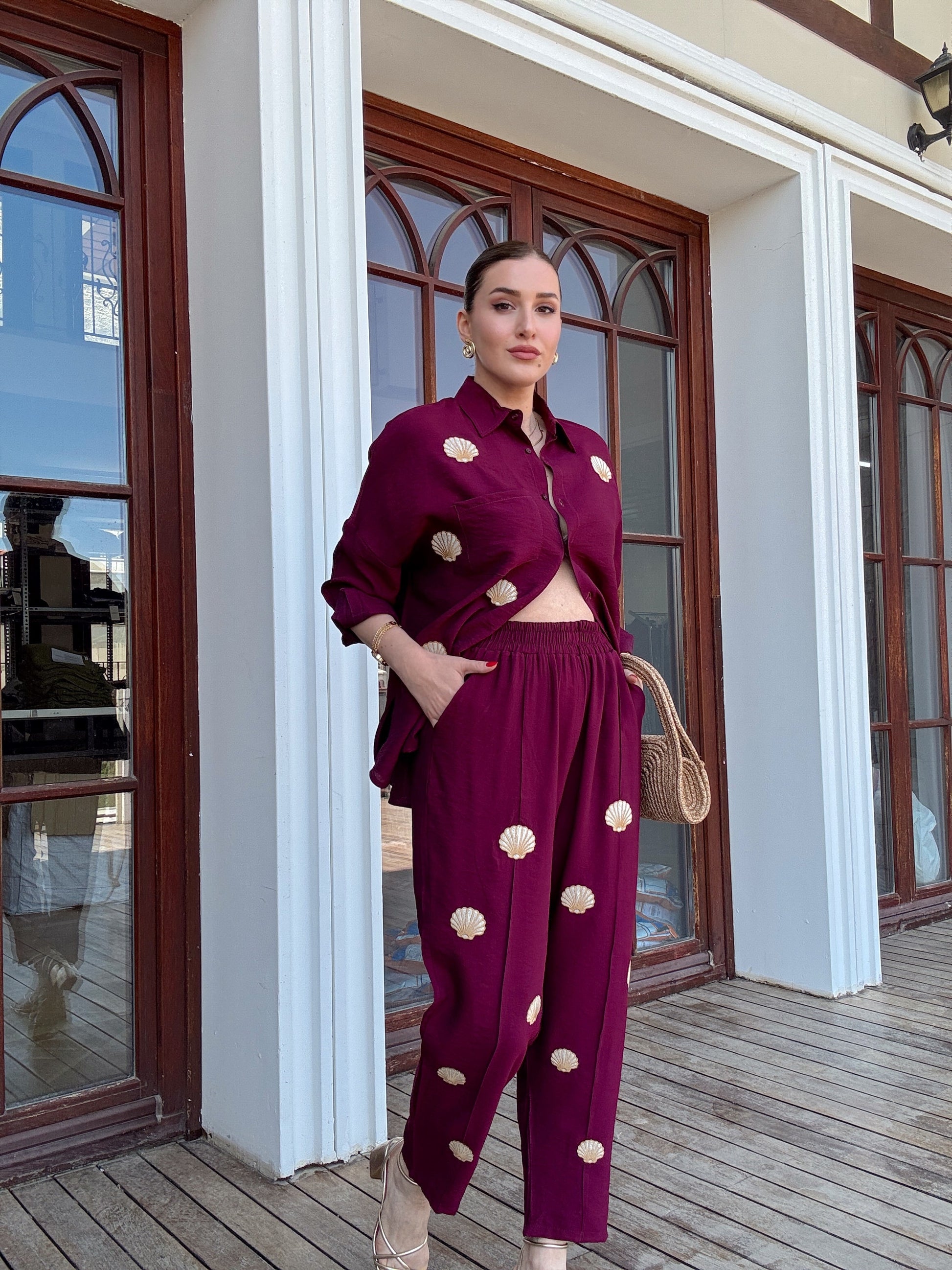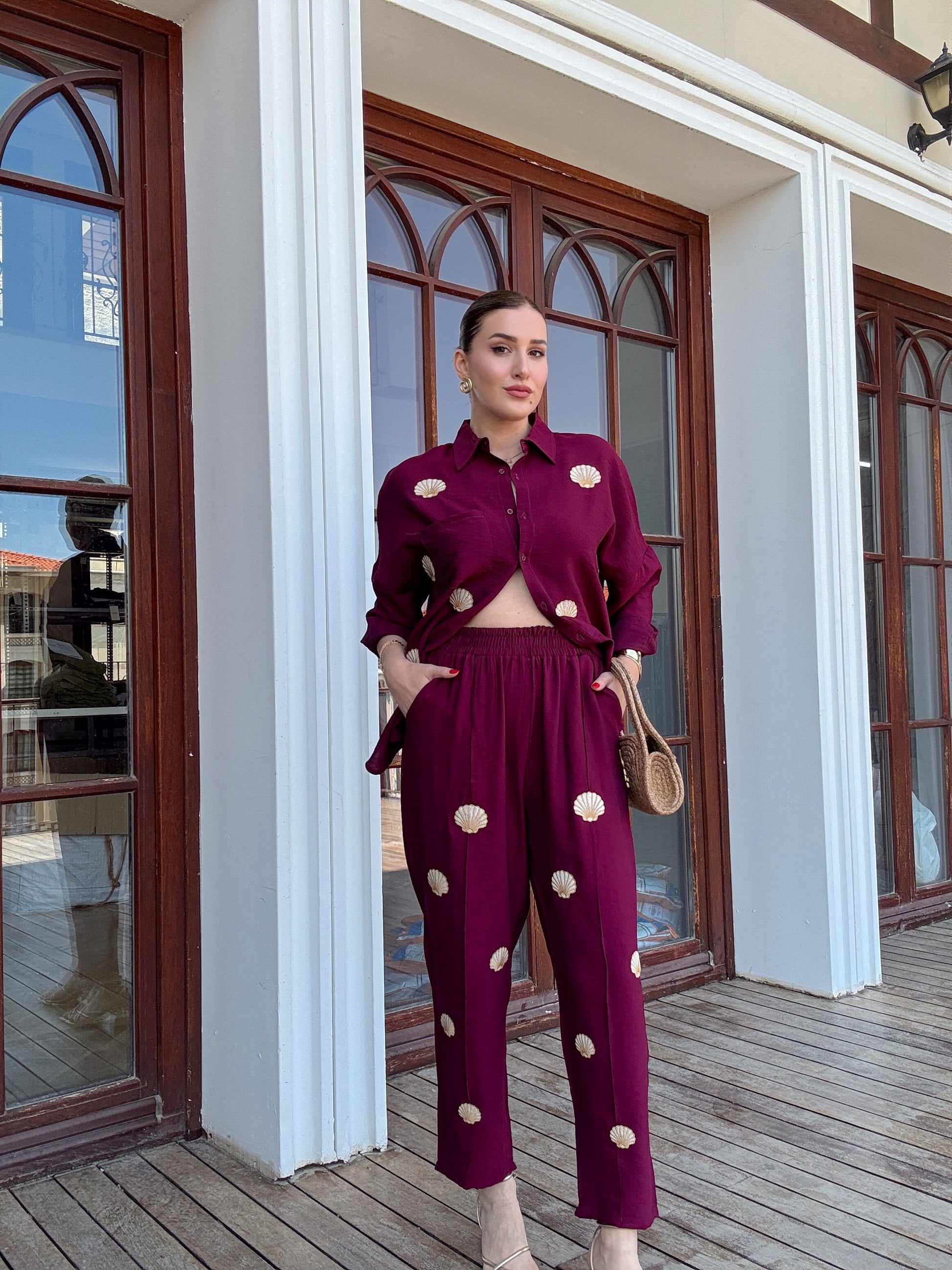 Deniz kabuğu nakış işlemeli keten takım BORDO