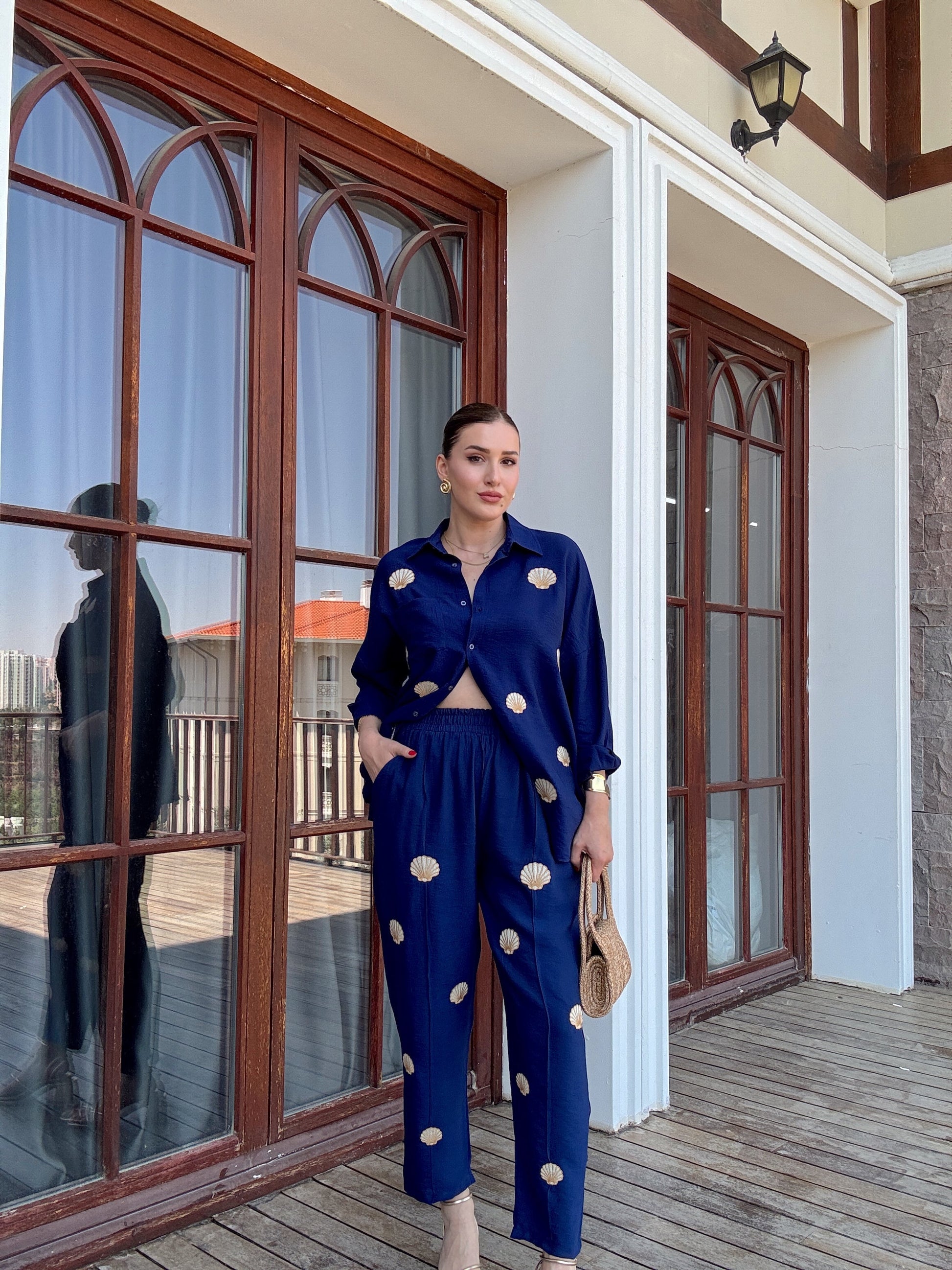Deniz kabuğu nakış işlemeli keten takım LACİVERT
