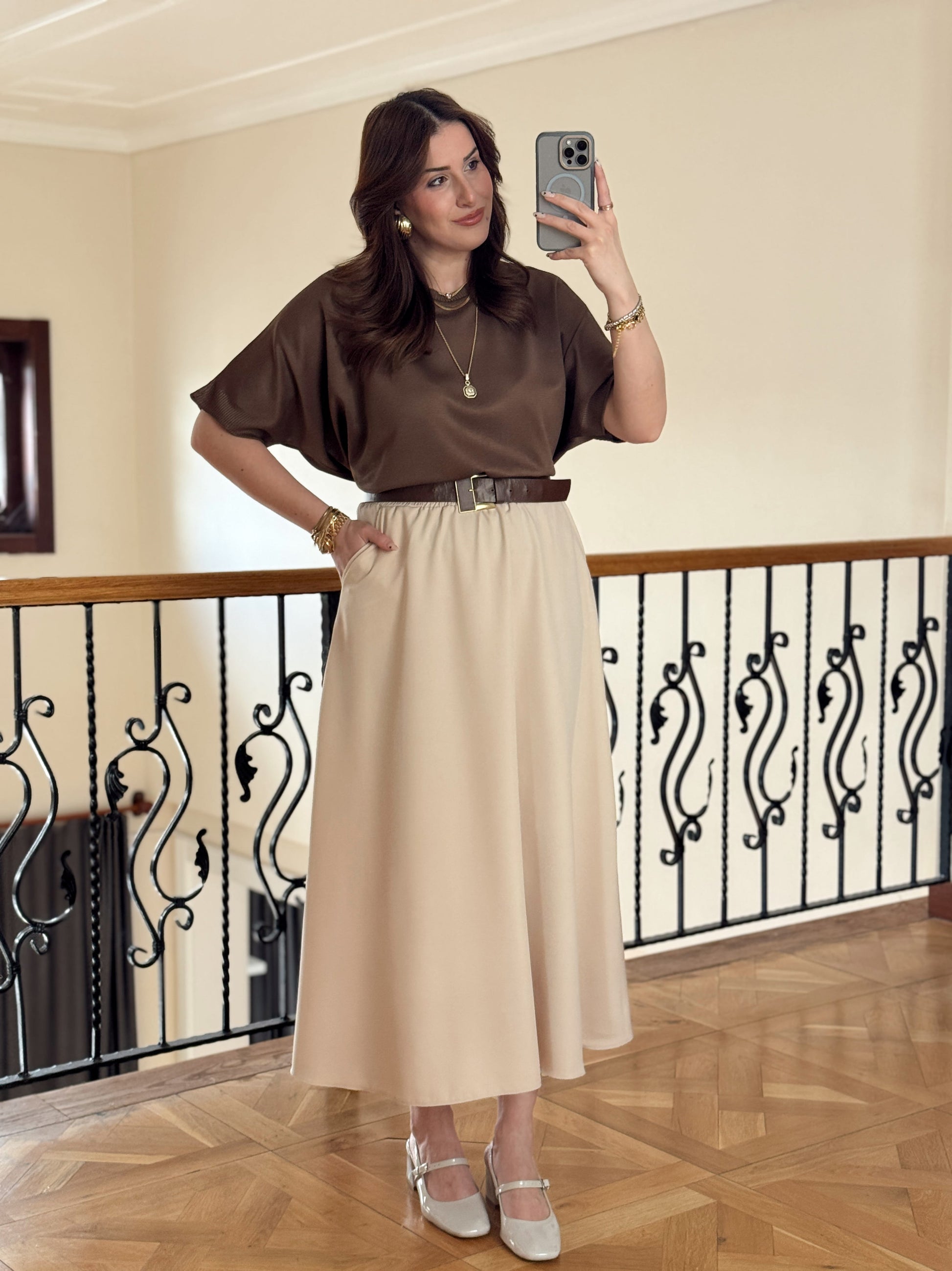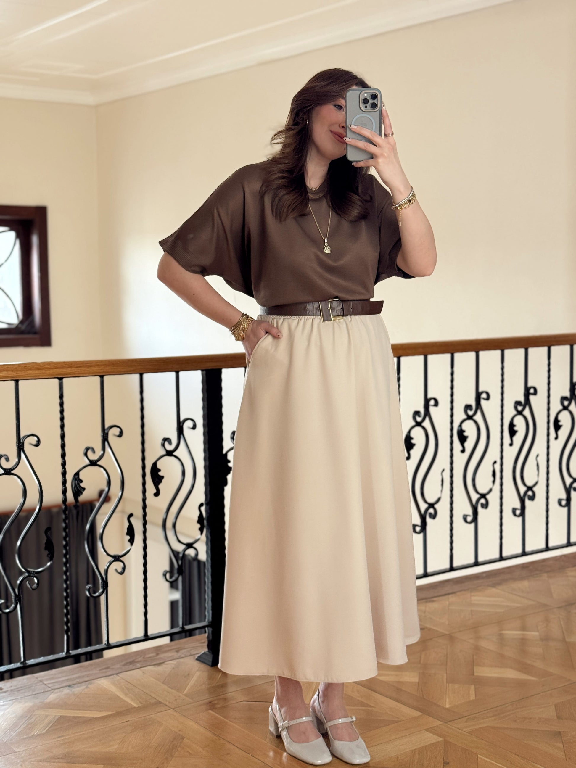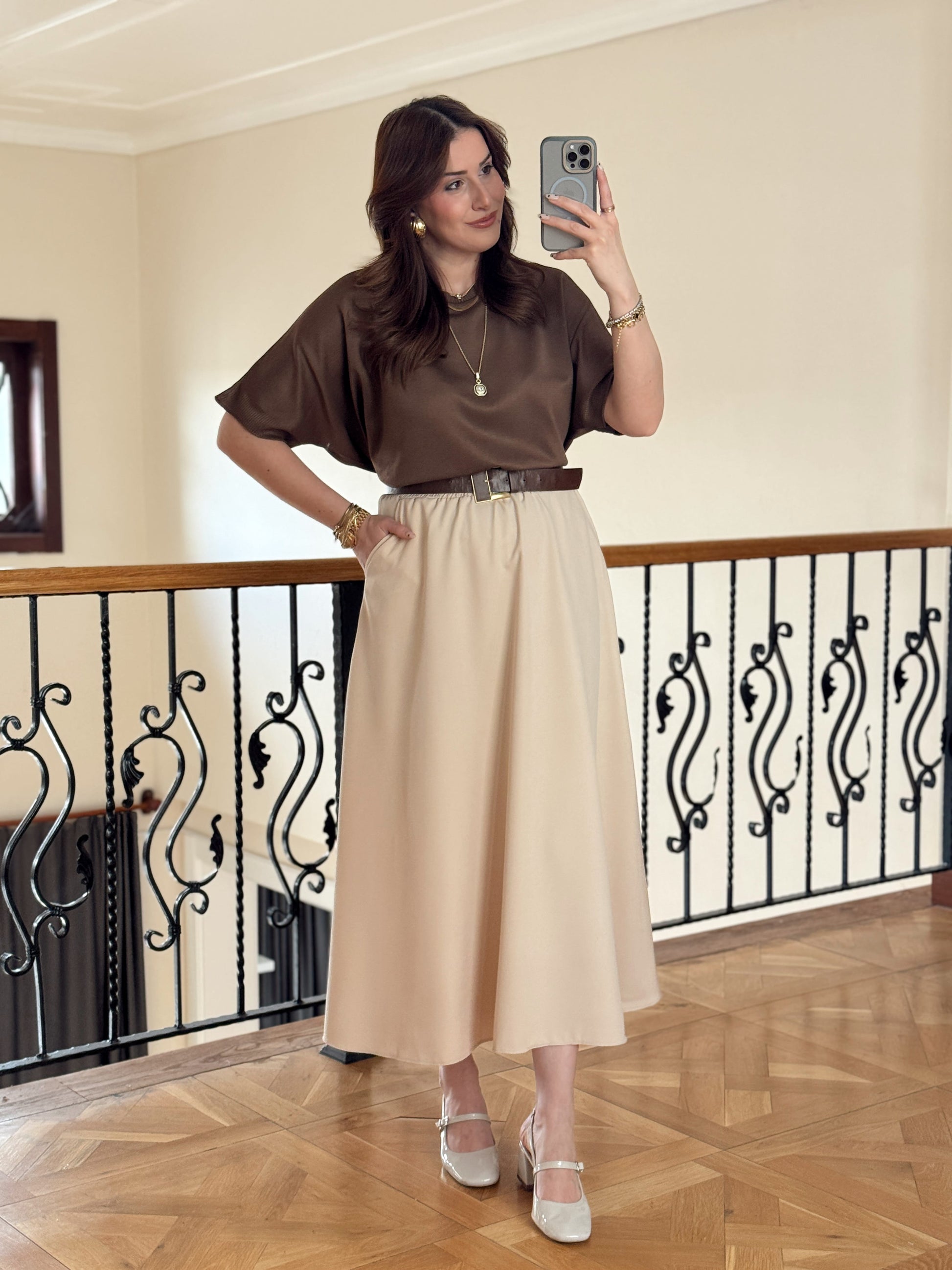 Double Yanı Cepli Etek-TAŞ