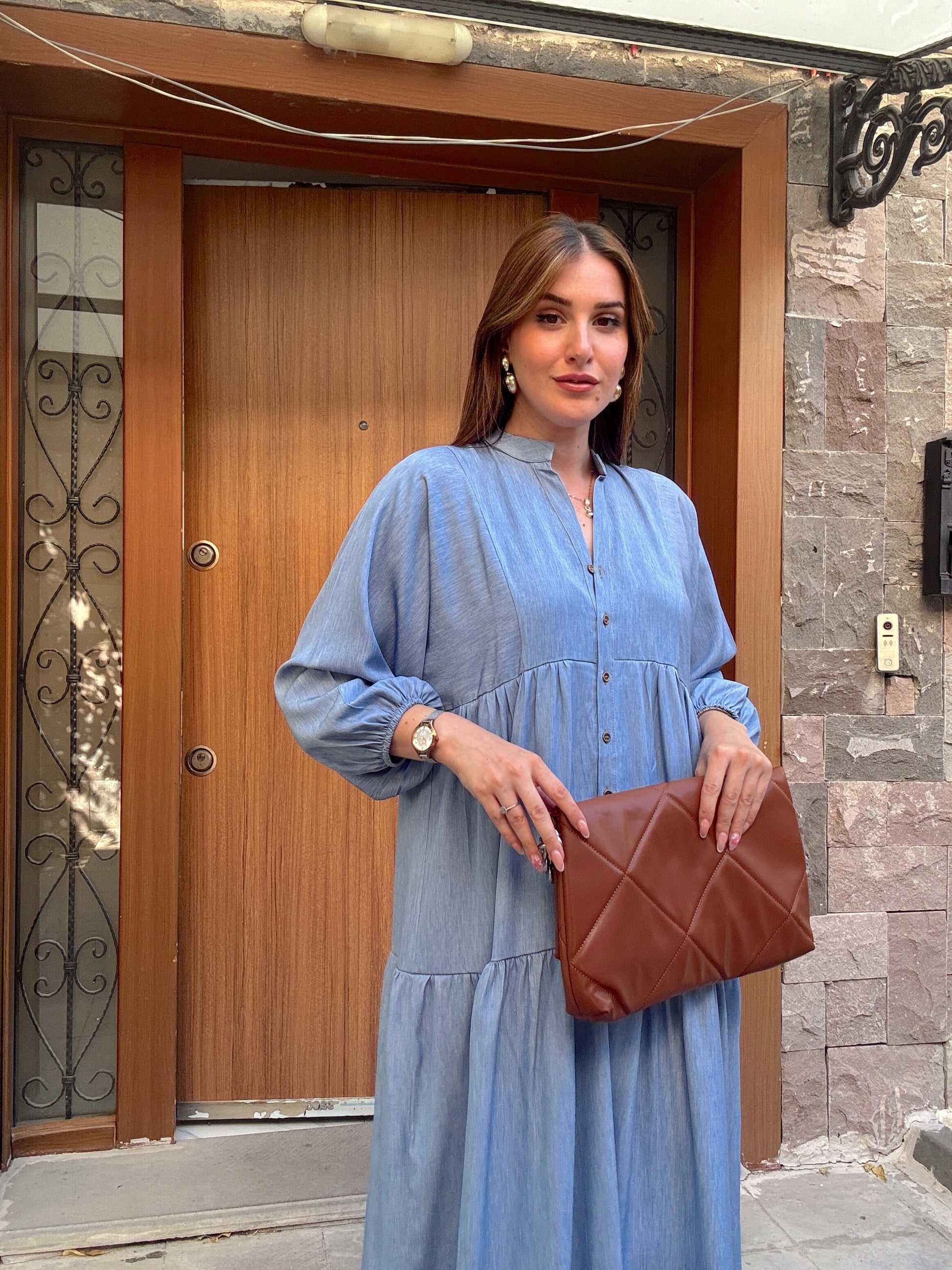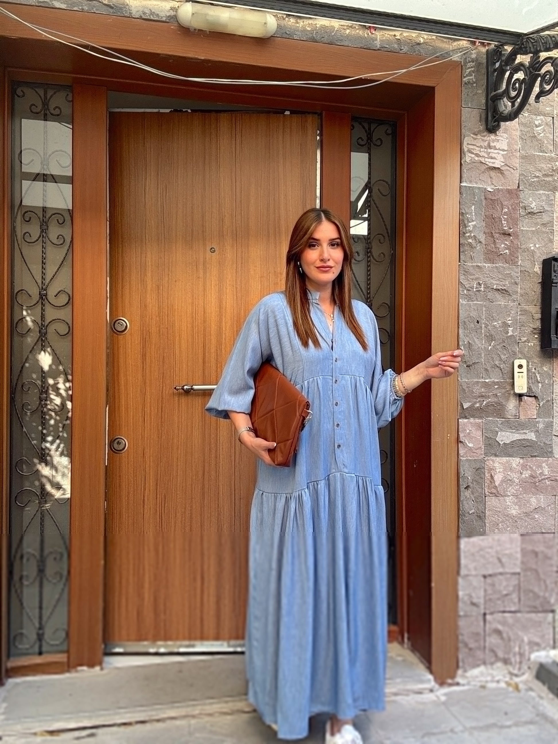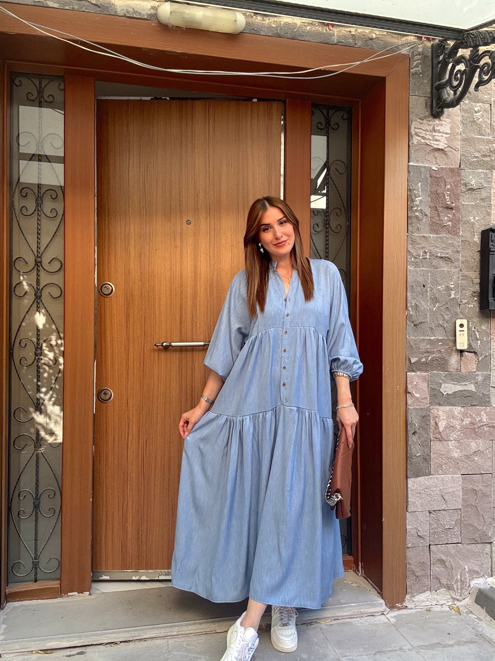 Düğme Detaylı Hakim Yaka Elbise Mavi