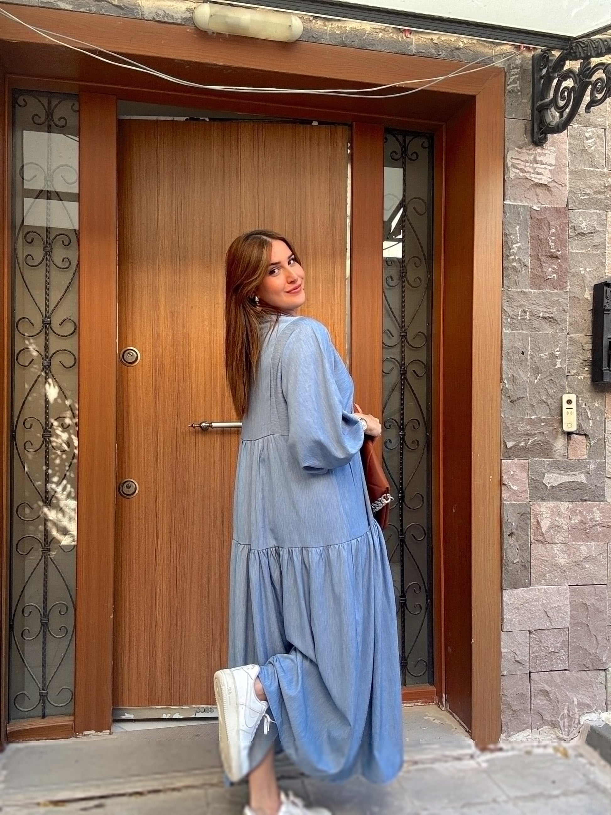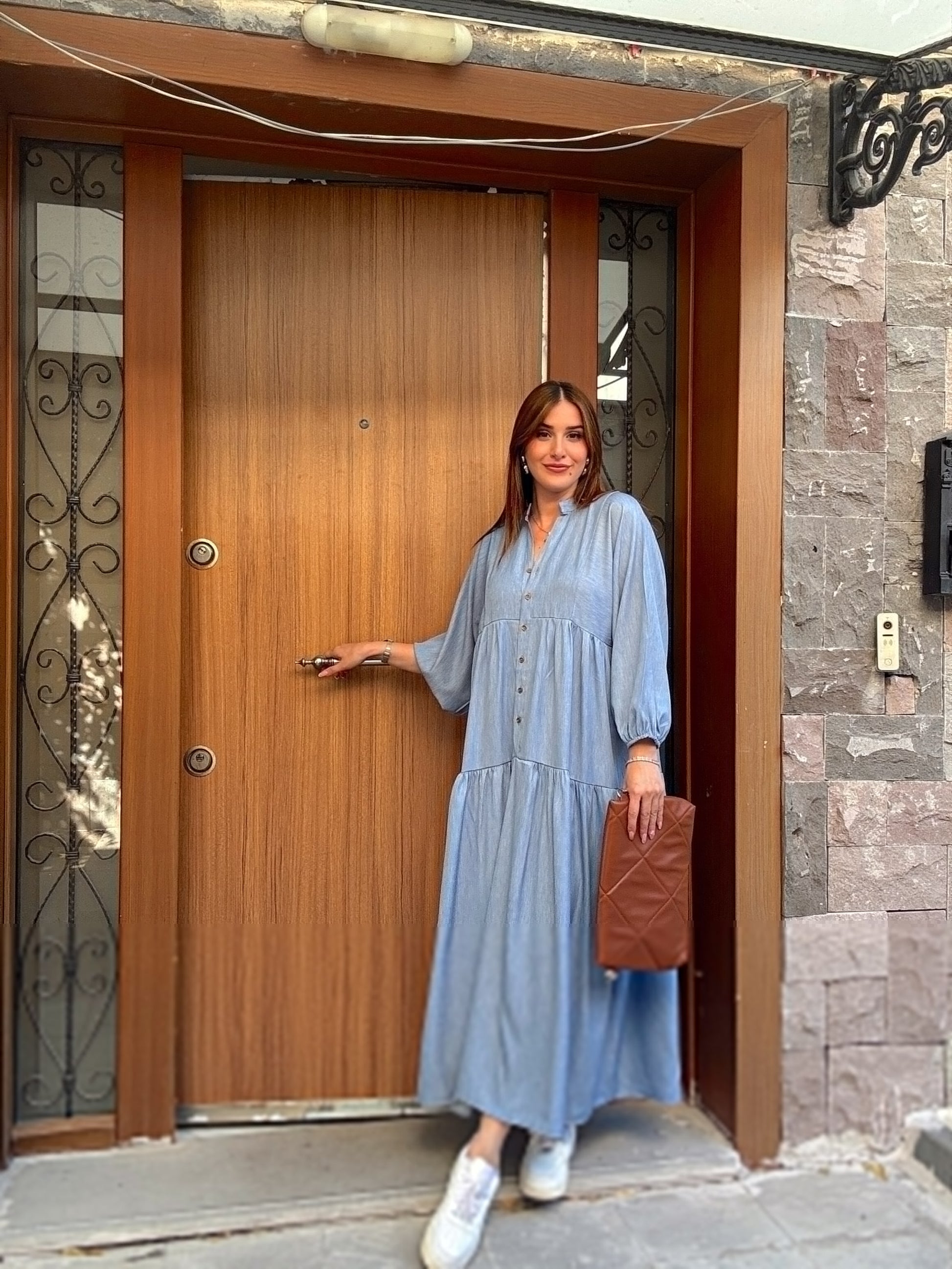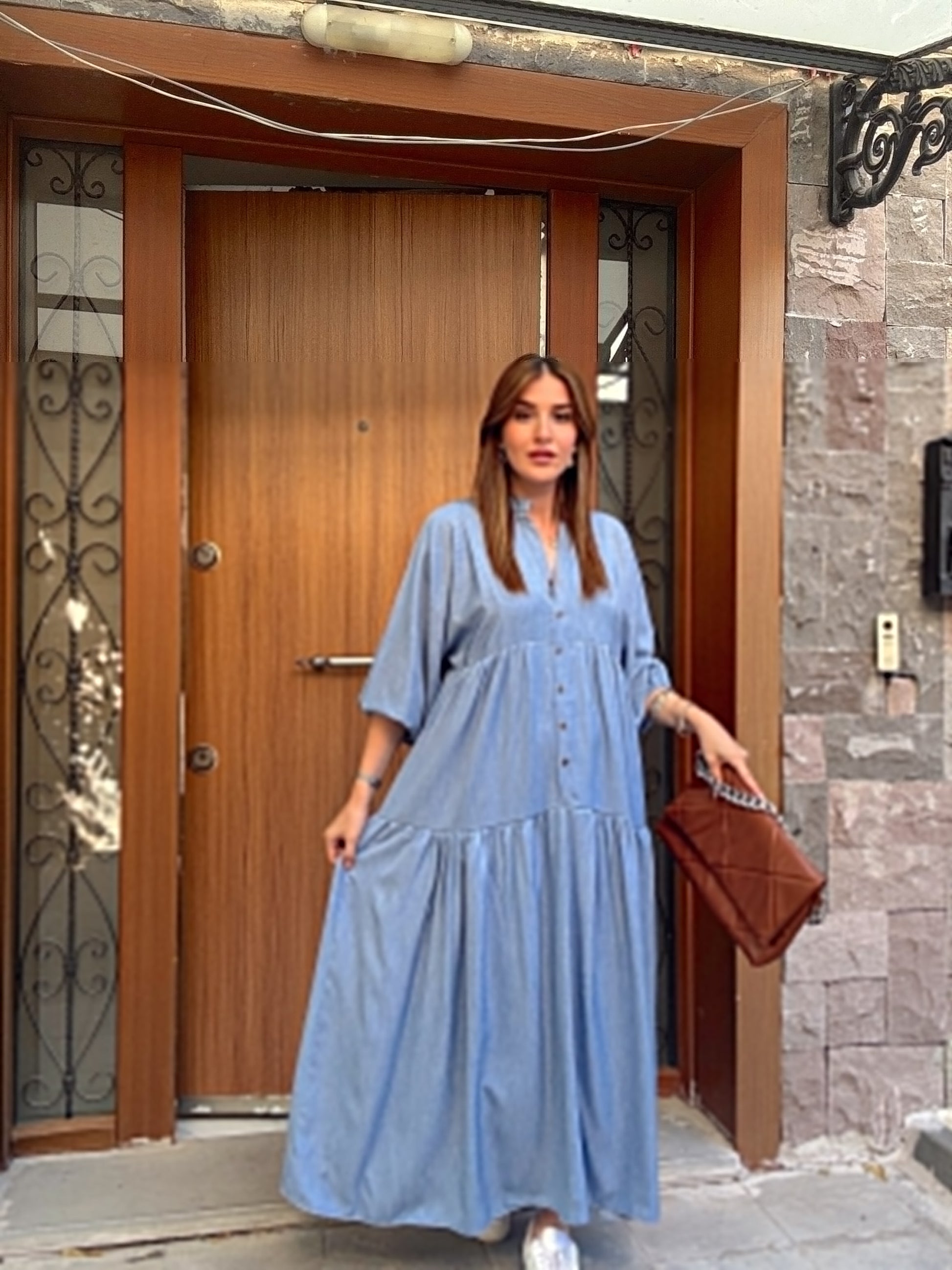 Düğme Detaylı Hakim Yaka Elbise Mavi