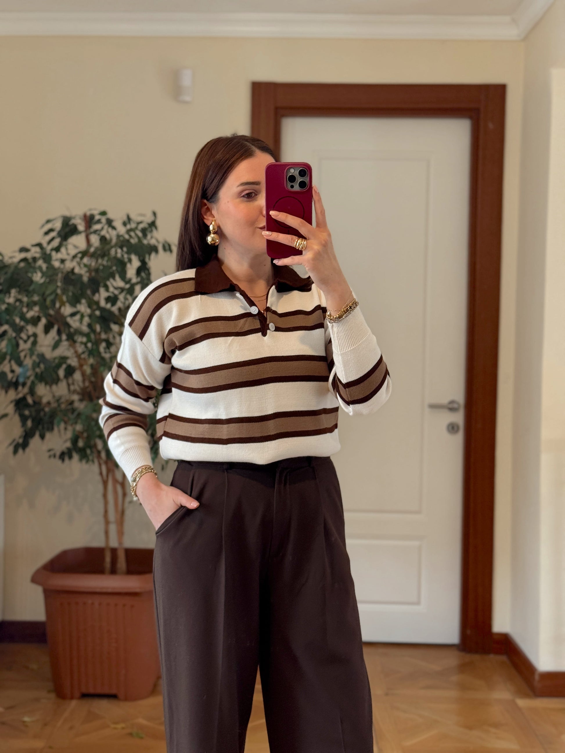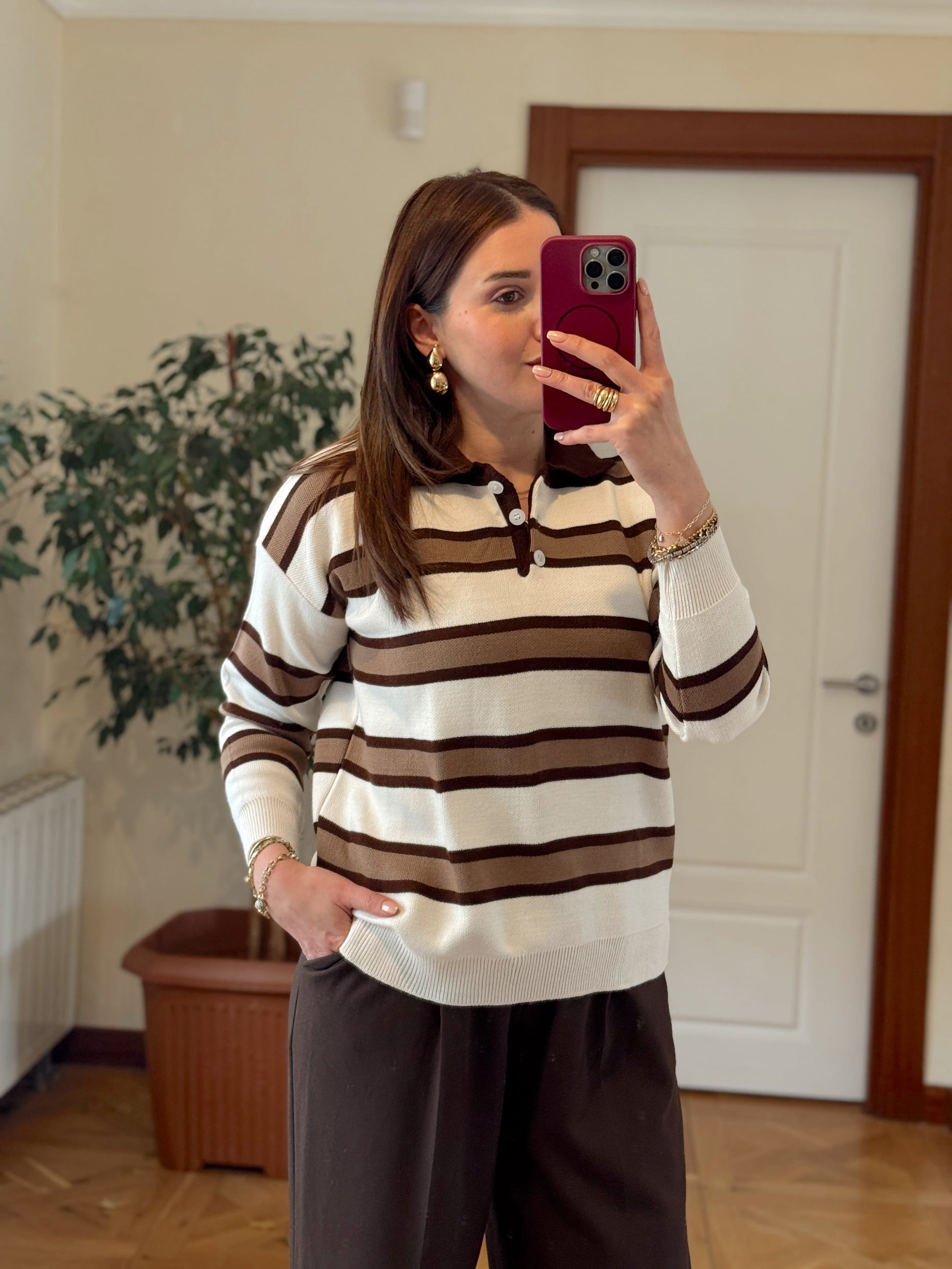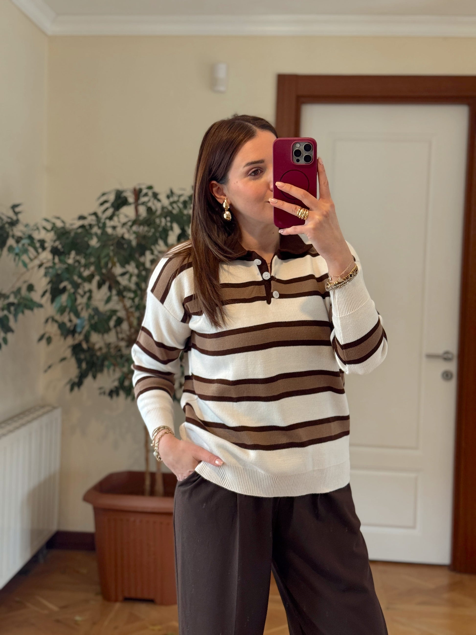 Düğmeli polo yaka triko kazak VİZON-BEJ