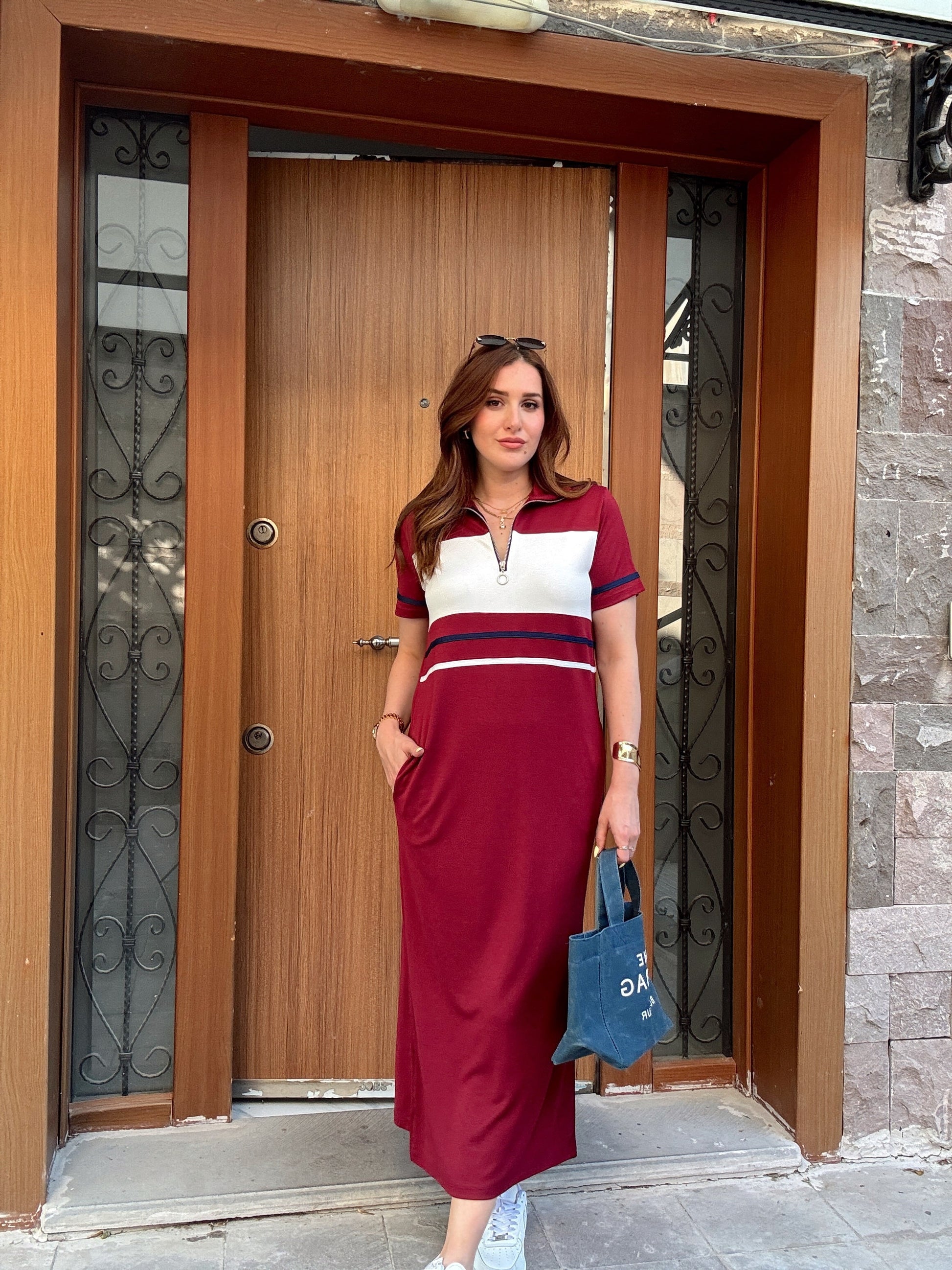 Fermuarlı Önü Biyeli Yırtmaçlı Elbise Bordo
