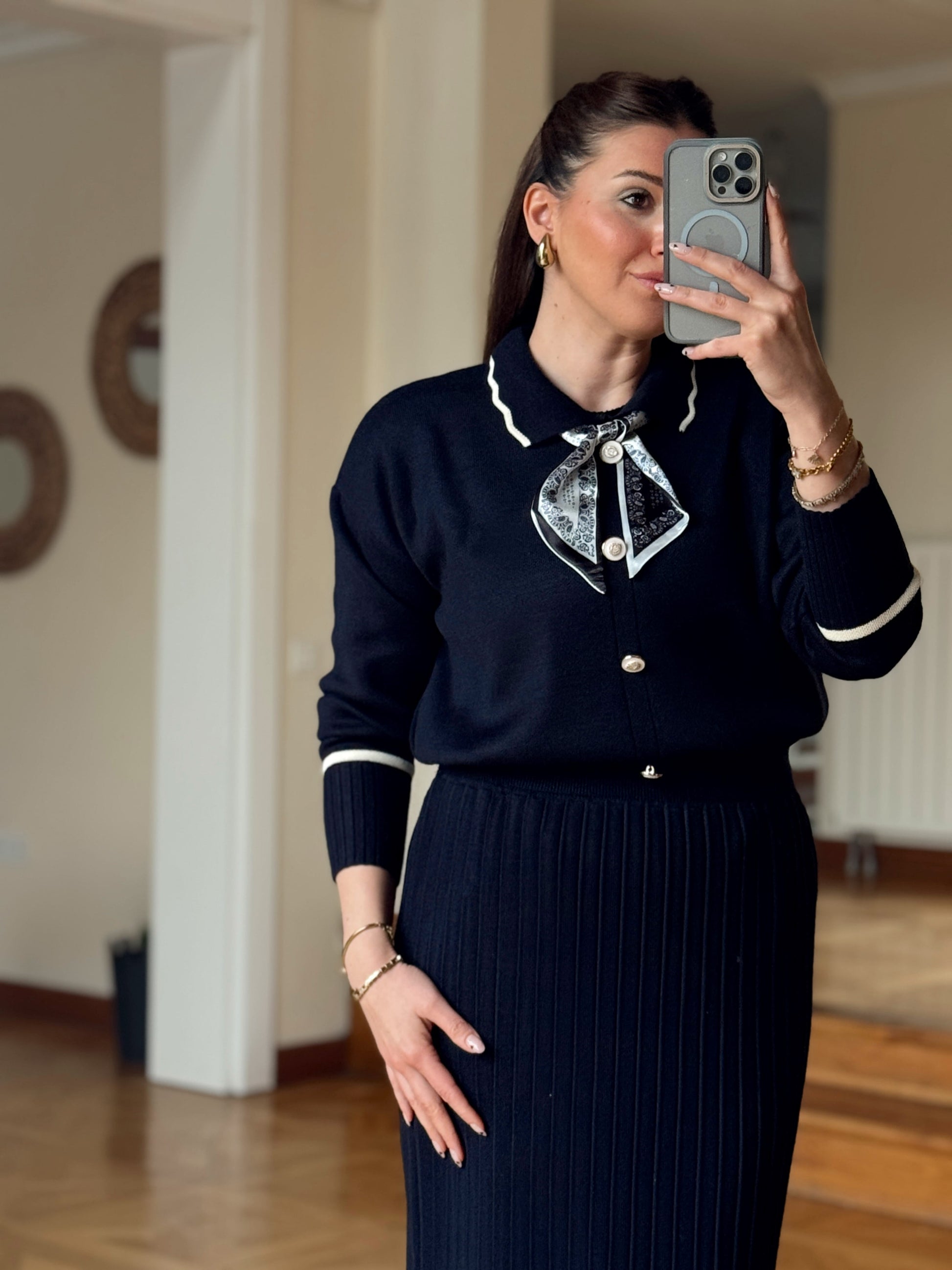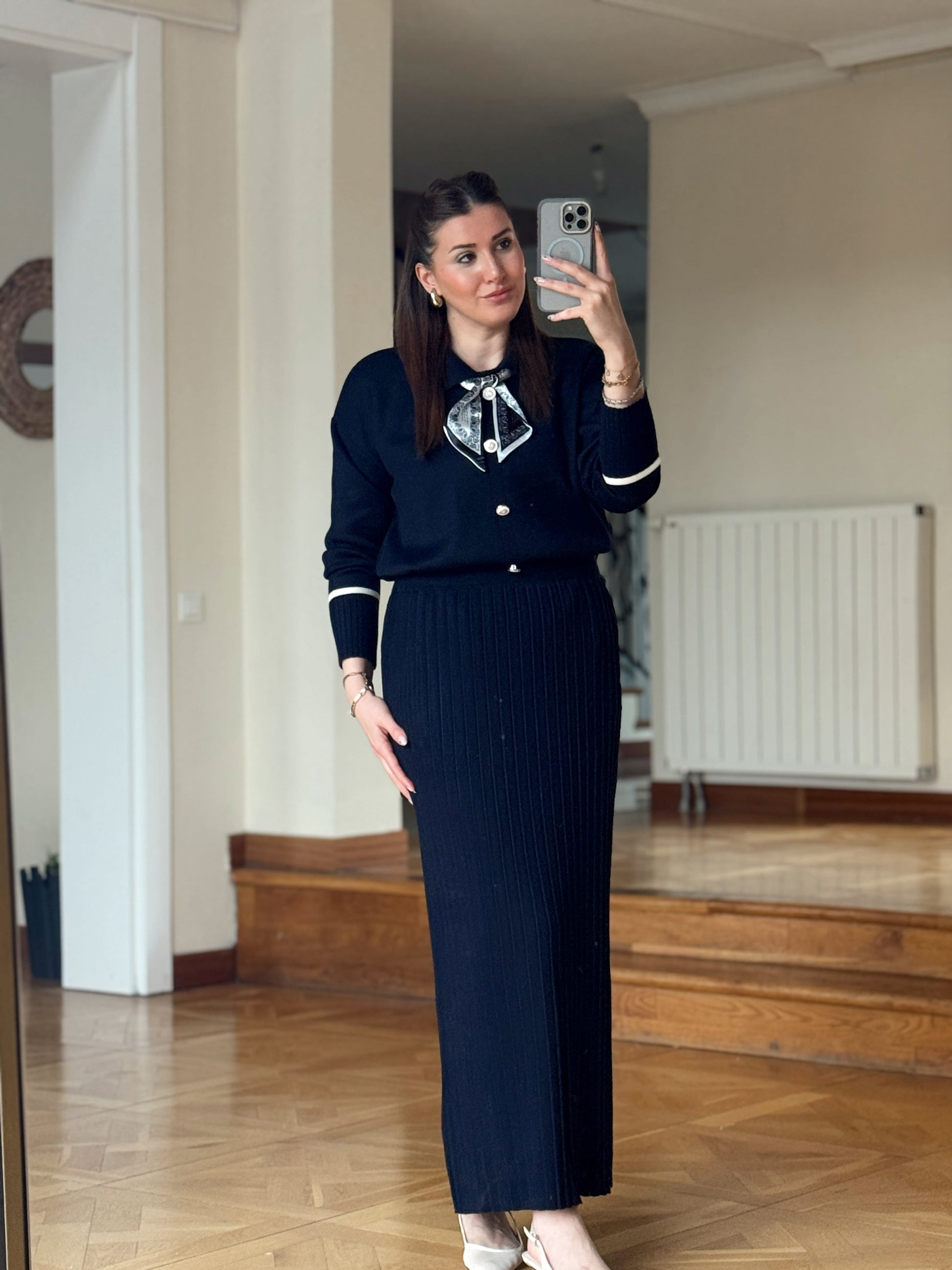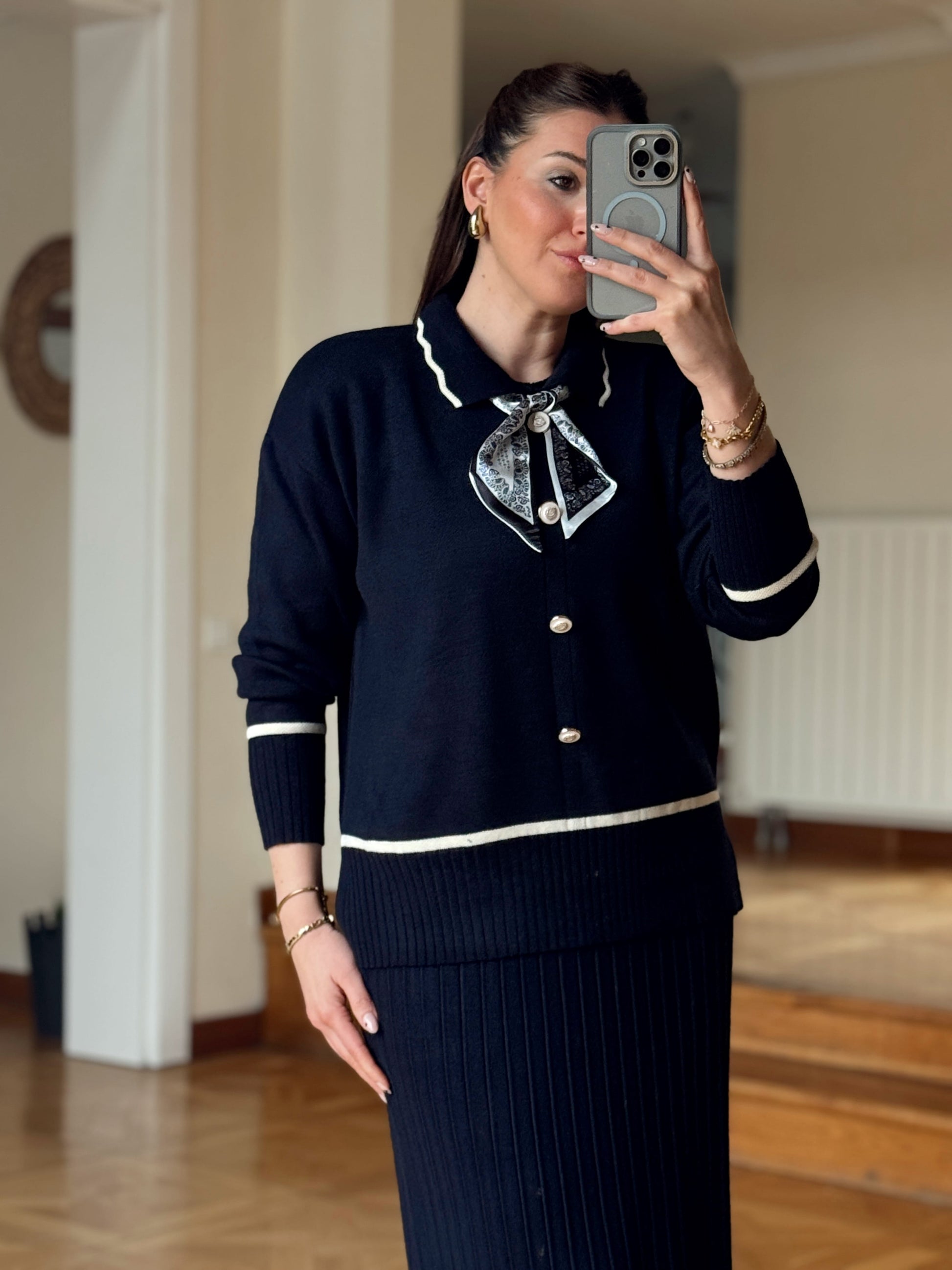 Fular detay aksesuarlı triko takım Lacivert