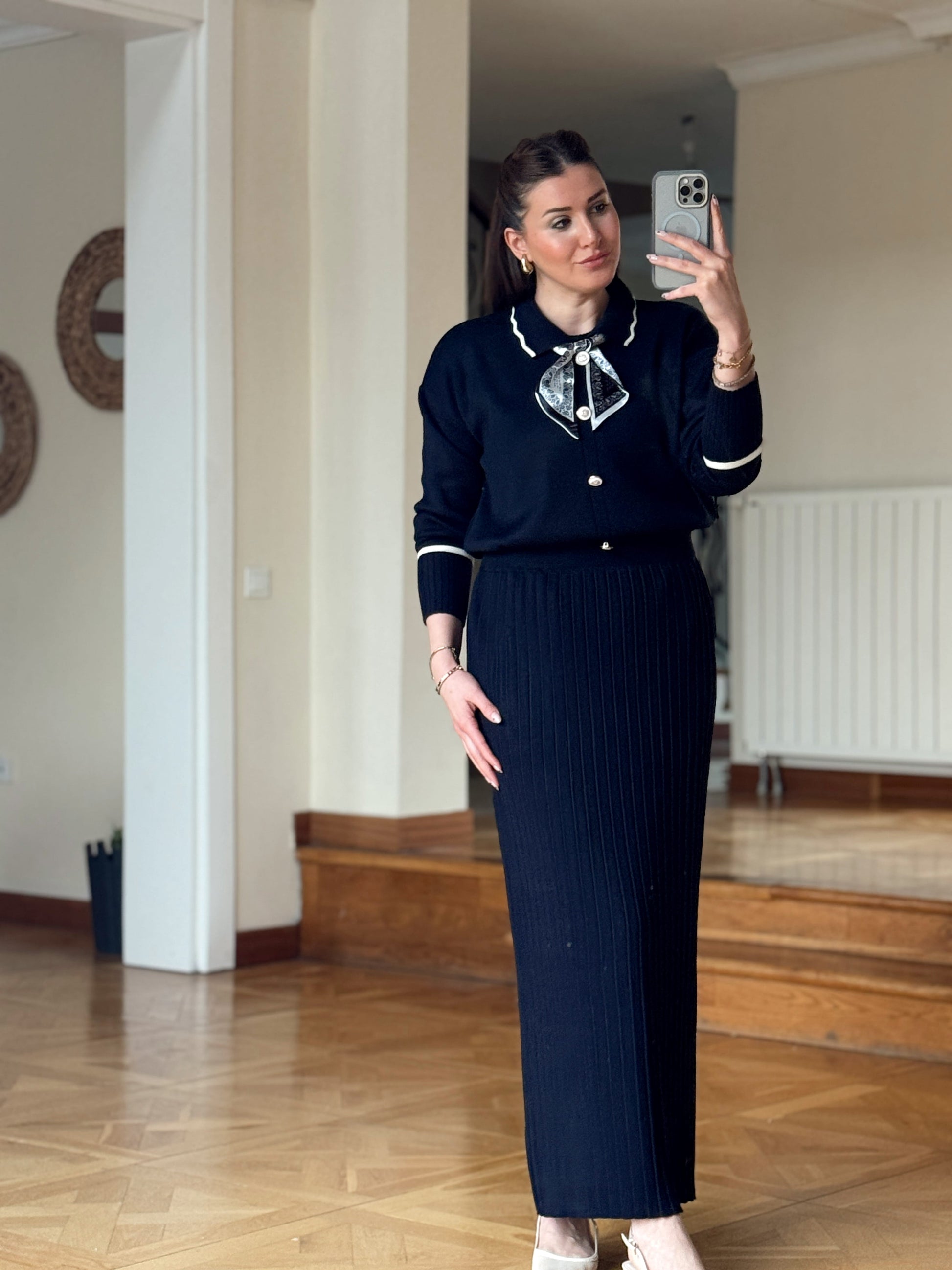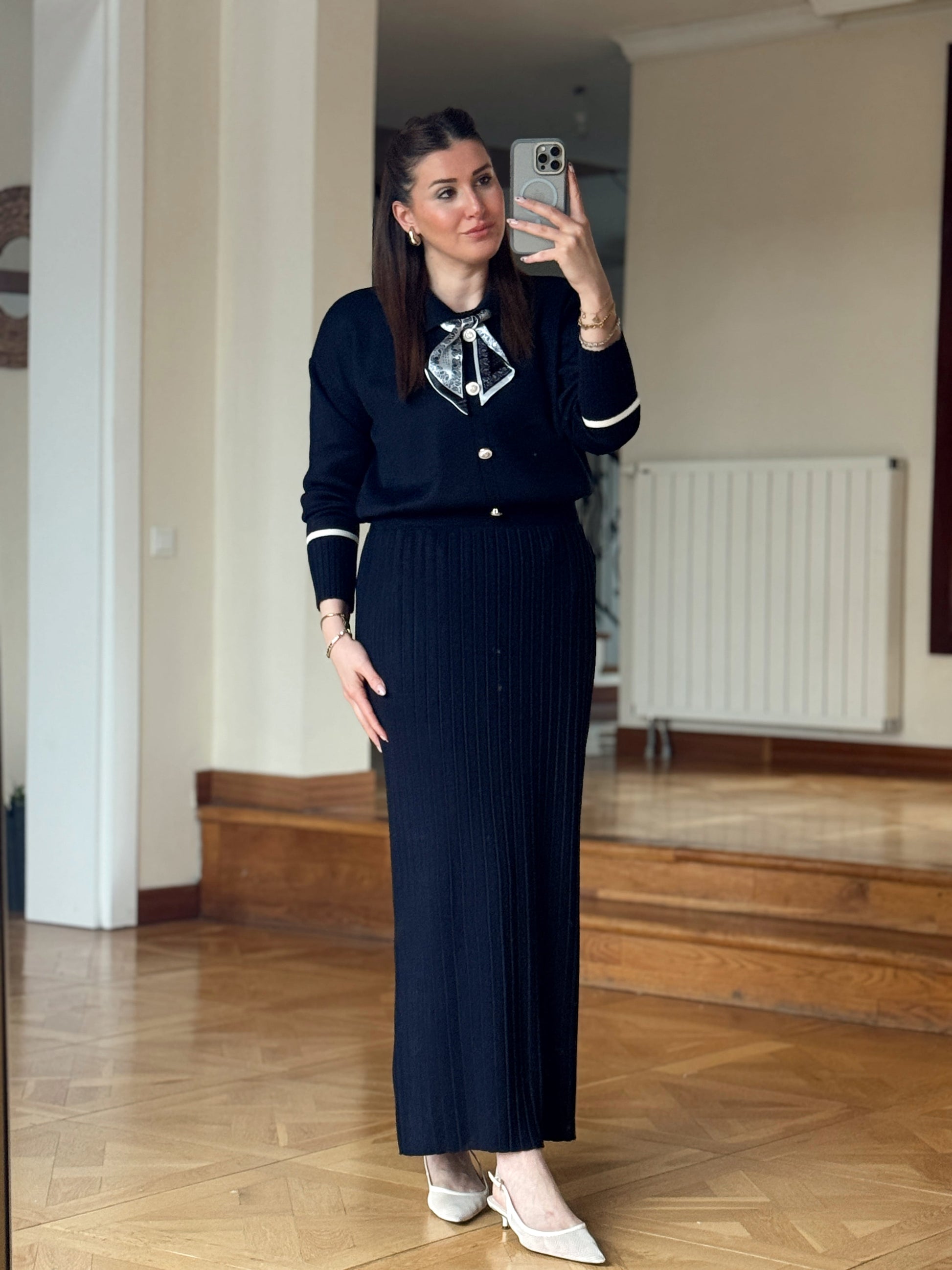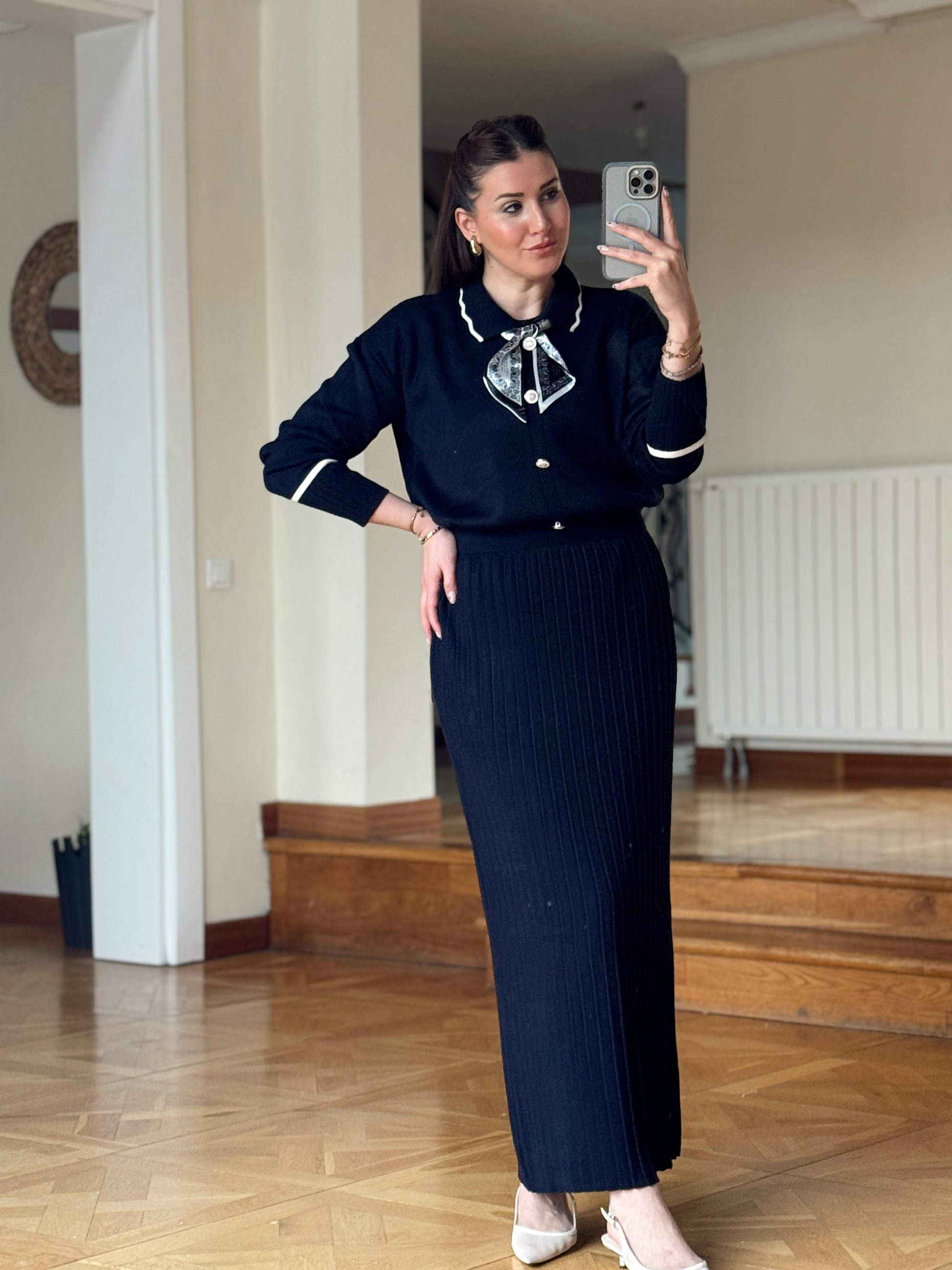 Fular detay aksesuarlı triko takım Lacivert