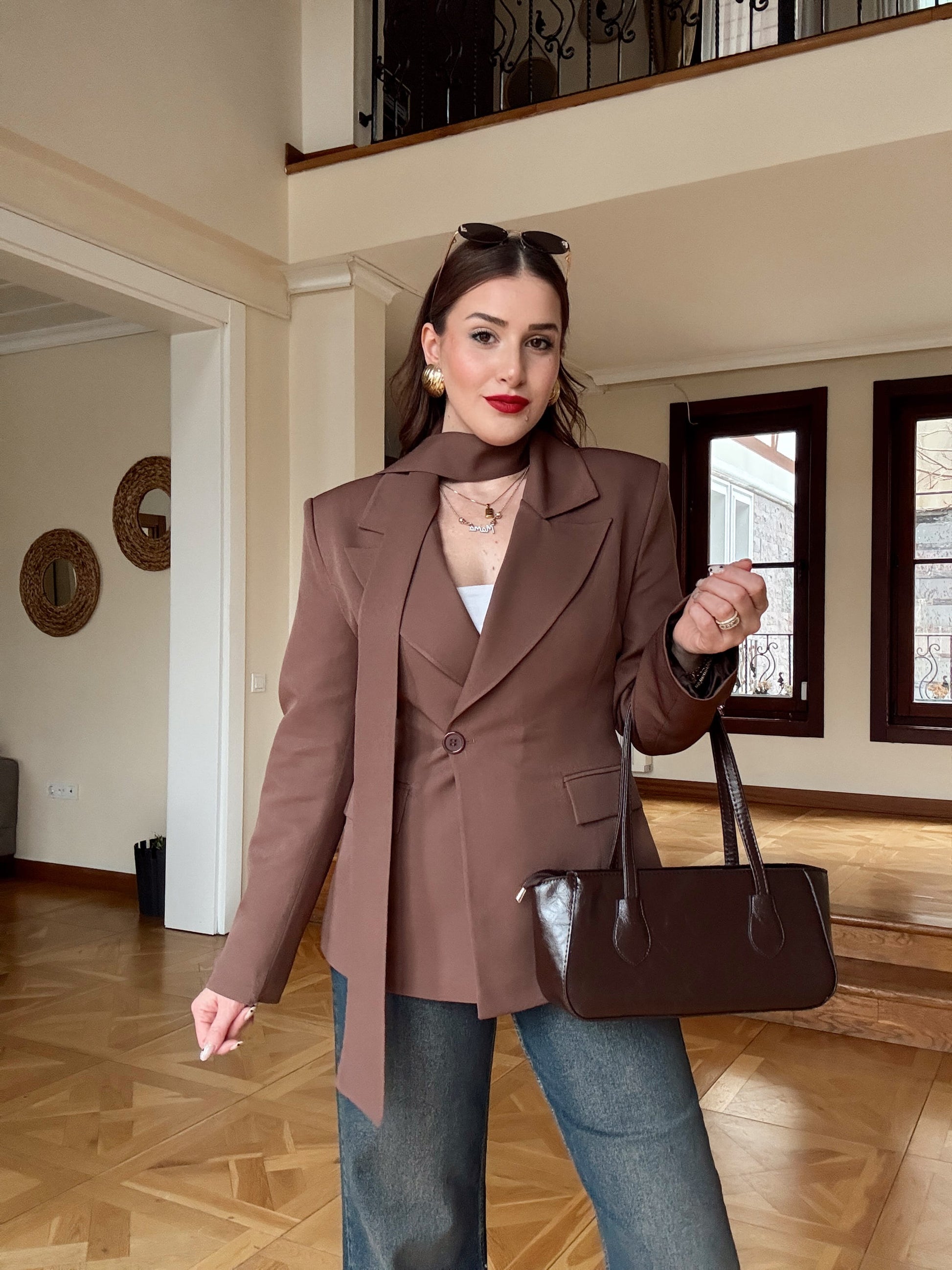 Fular Detaylı Ceket-KAHVERENGİ