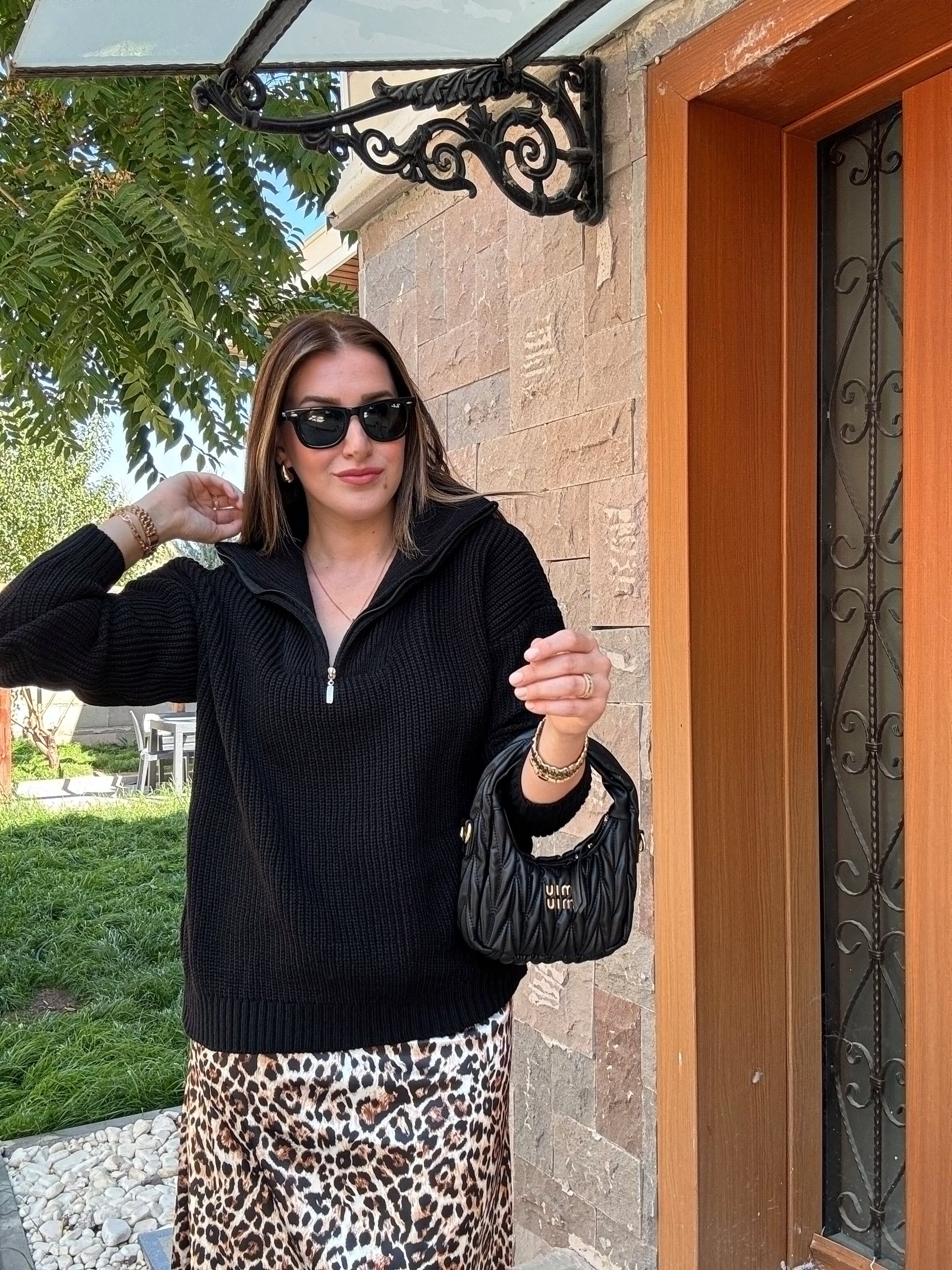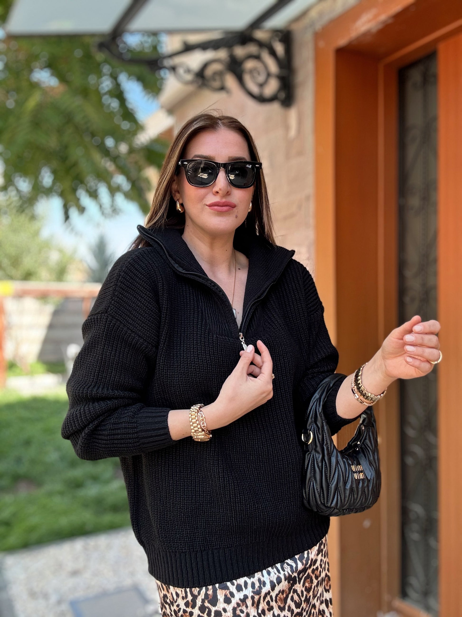 Geniş Fermuar Yaka Selanik Kazak SİYAH