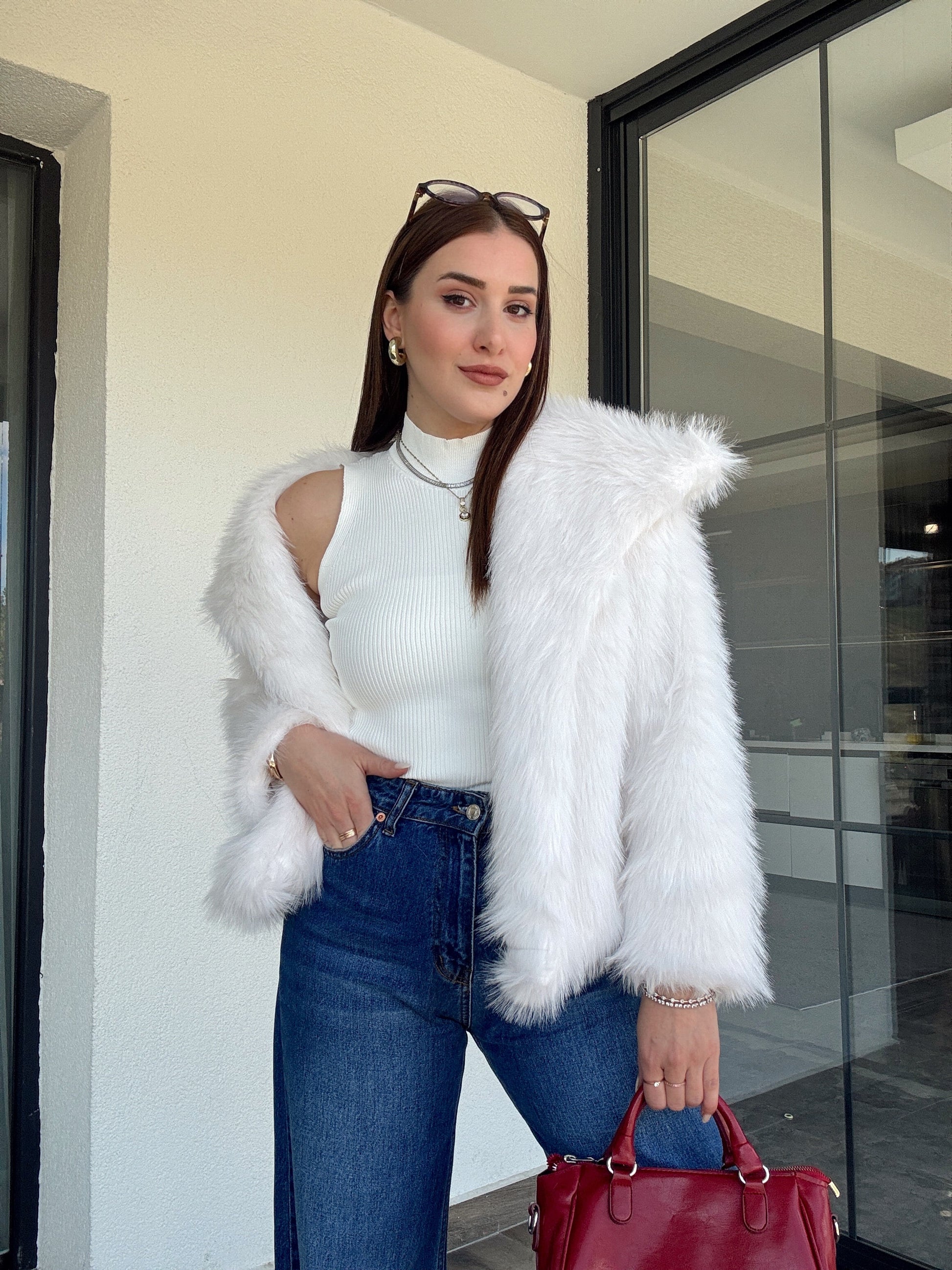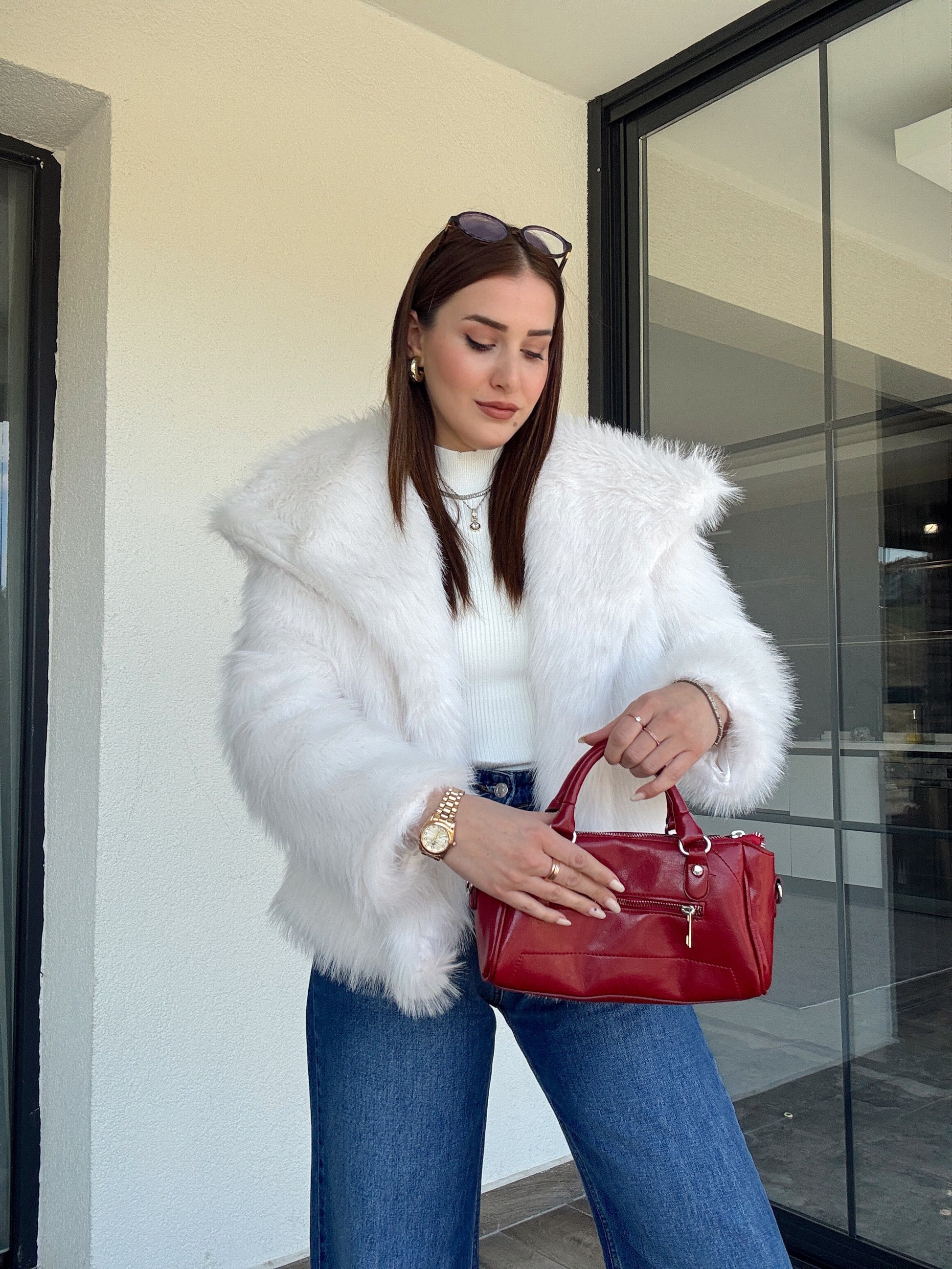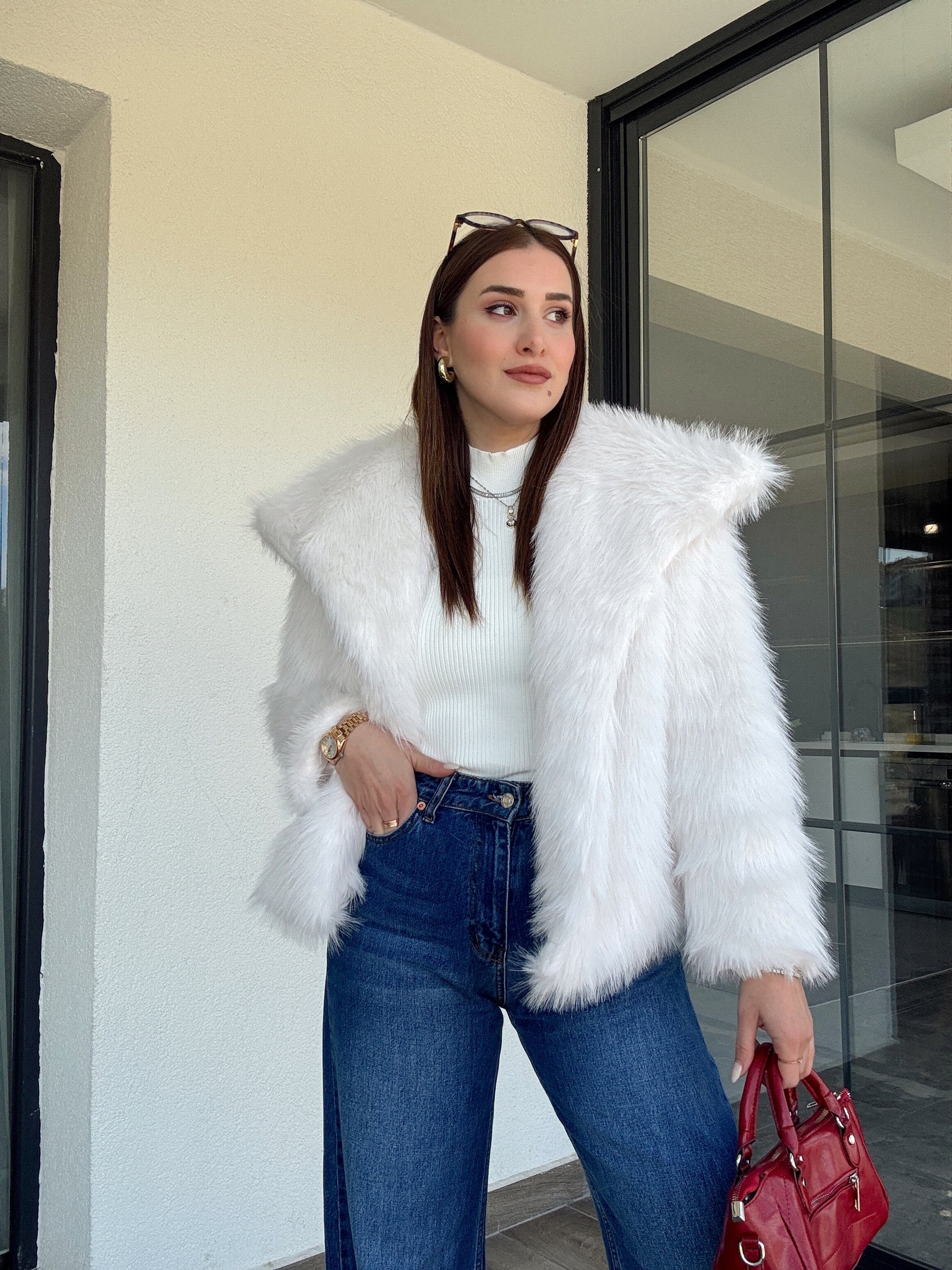 Geniş yaka astarlı kürklü mont-BEYAZ