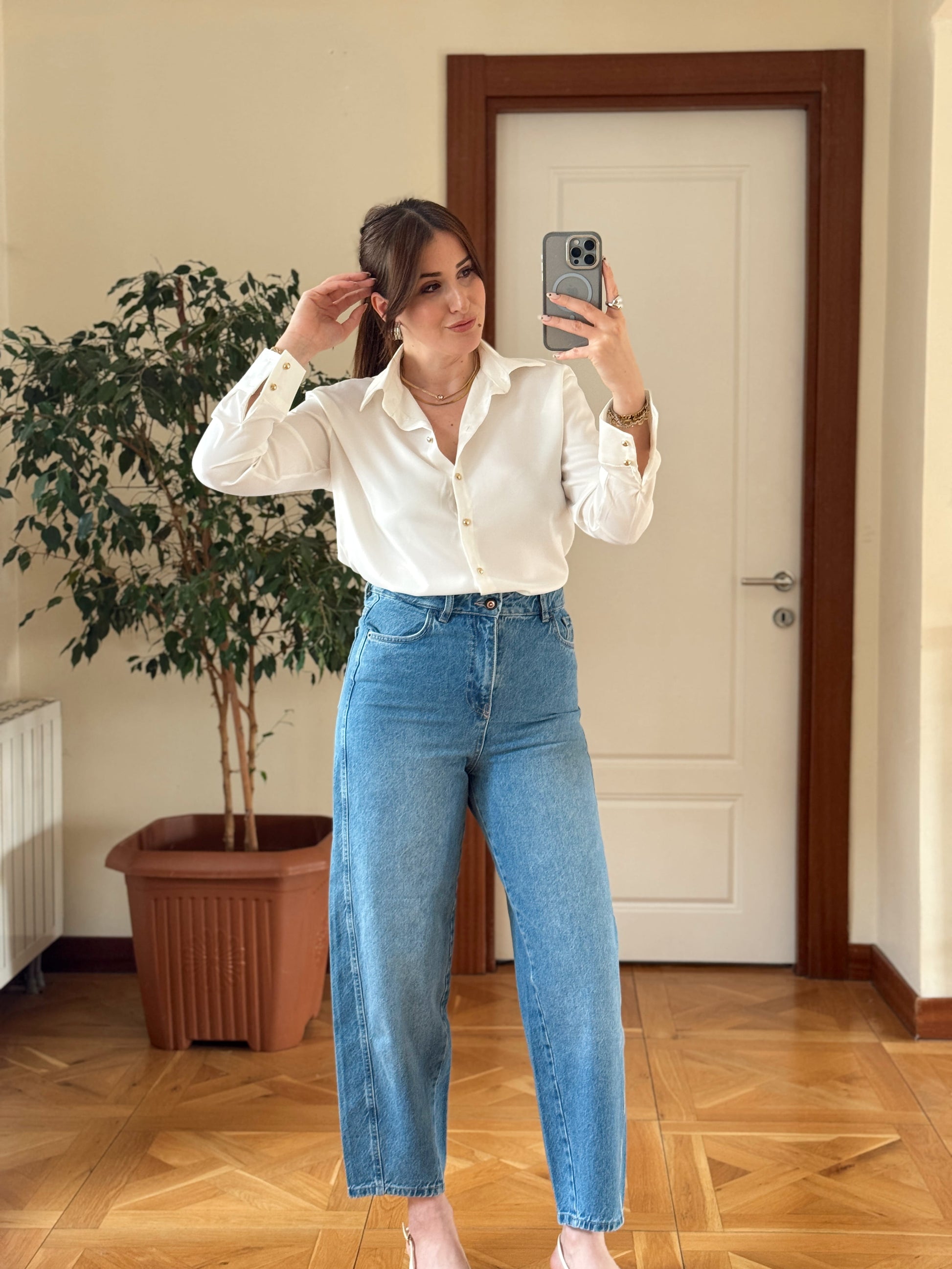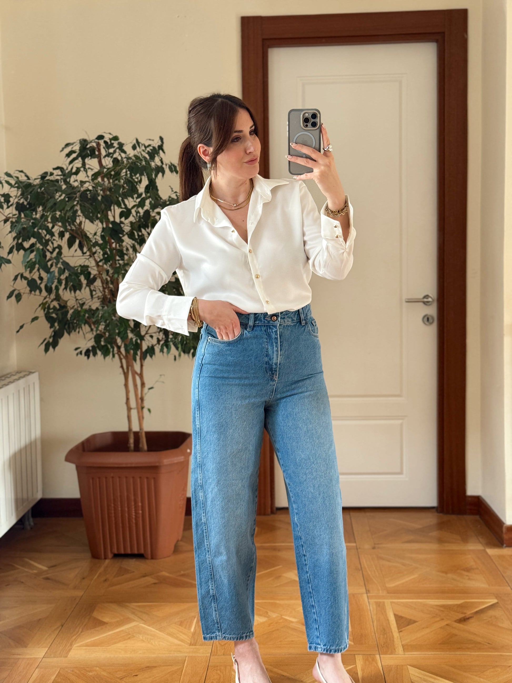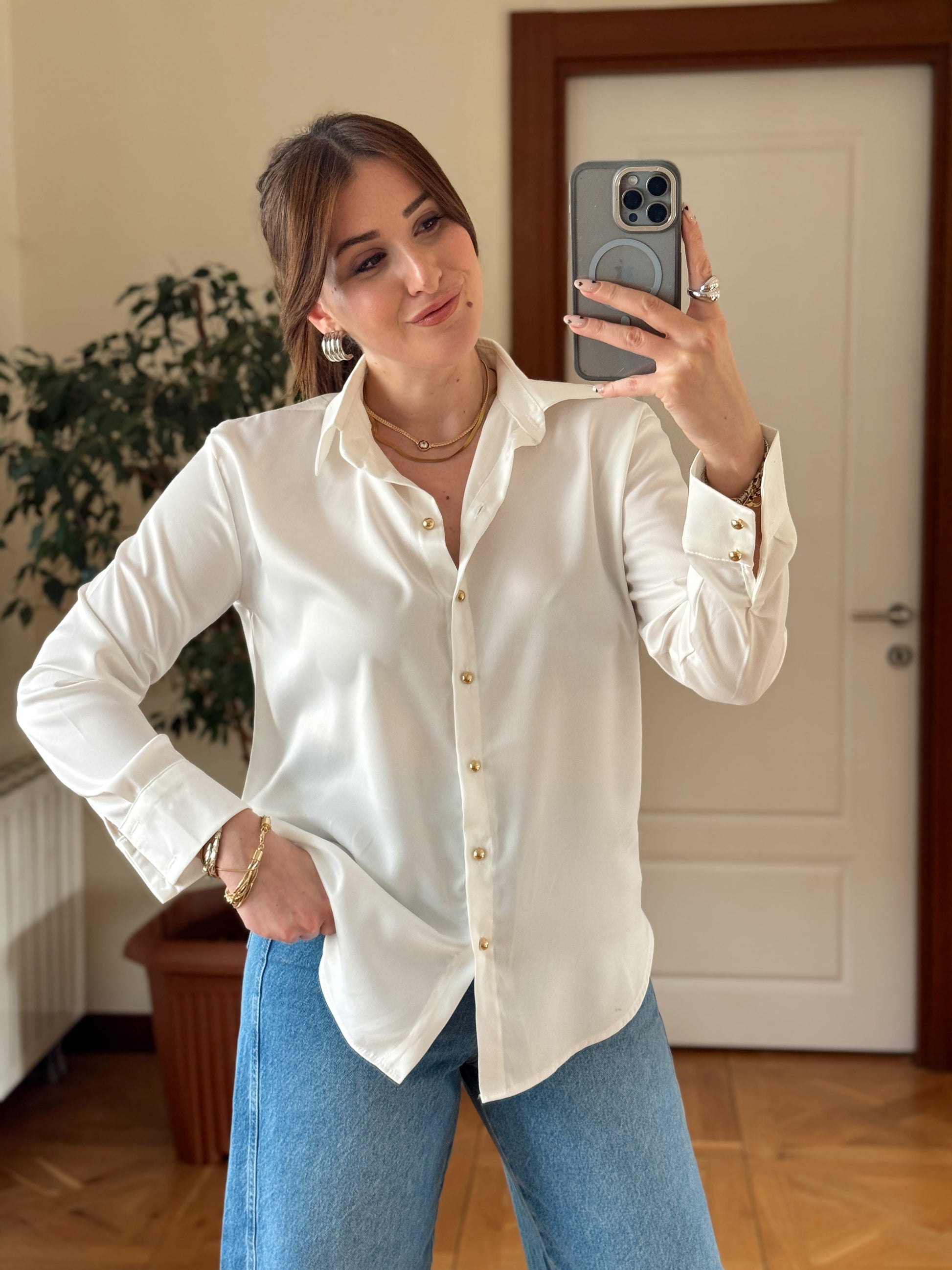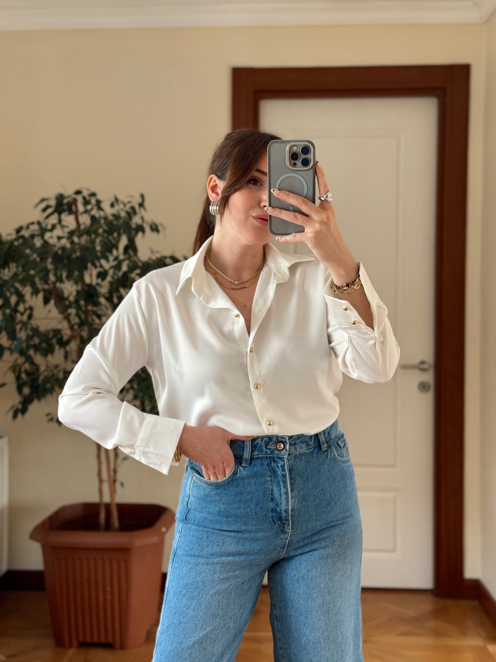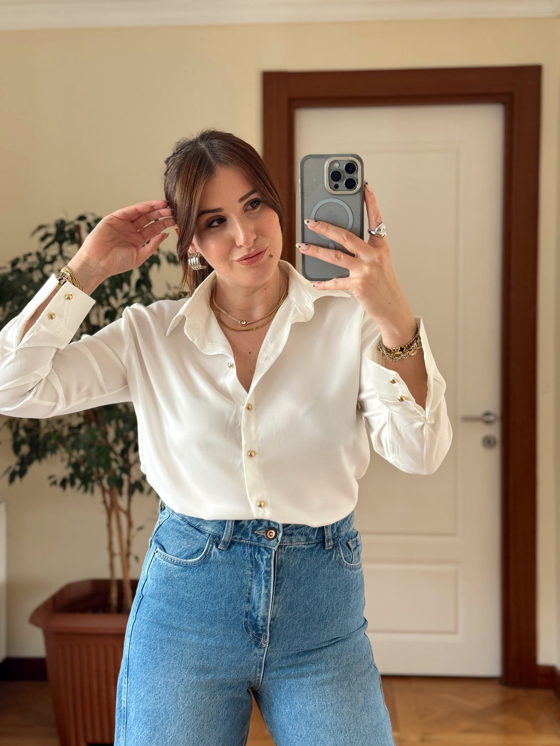 Gold düğme Detaylı Saten Gömlek-BEYAZ