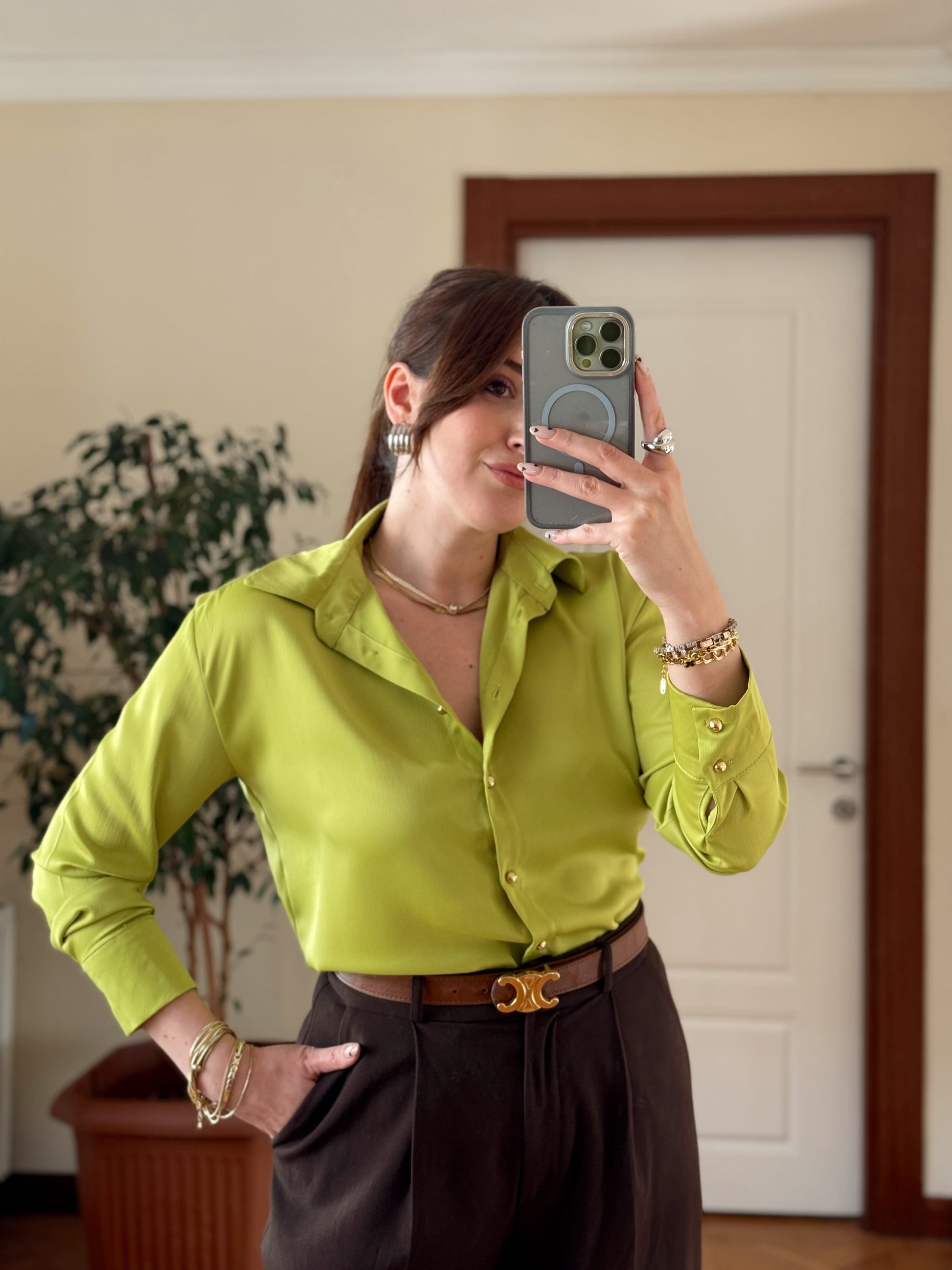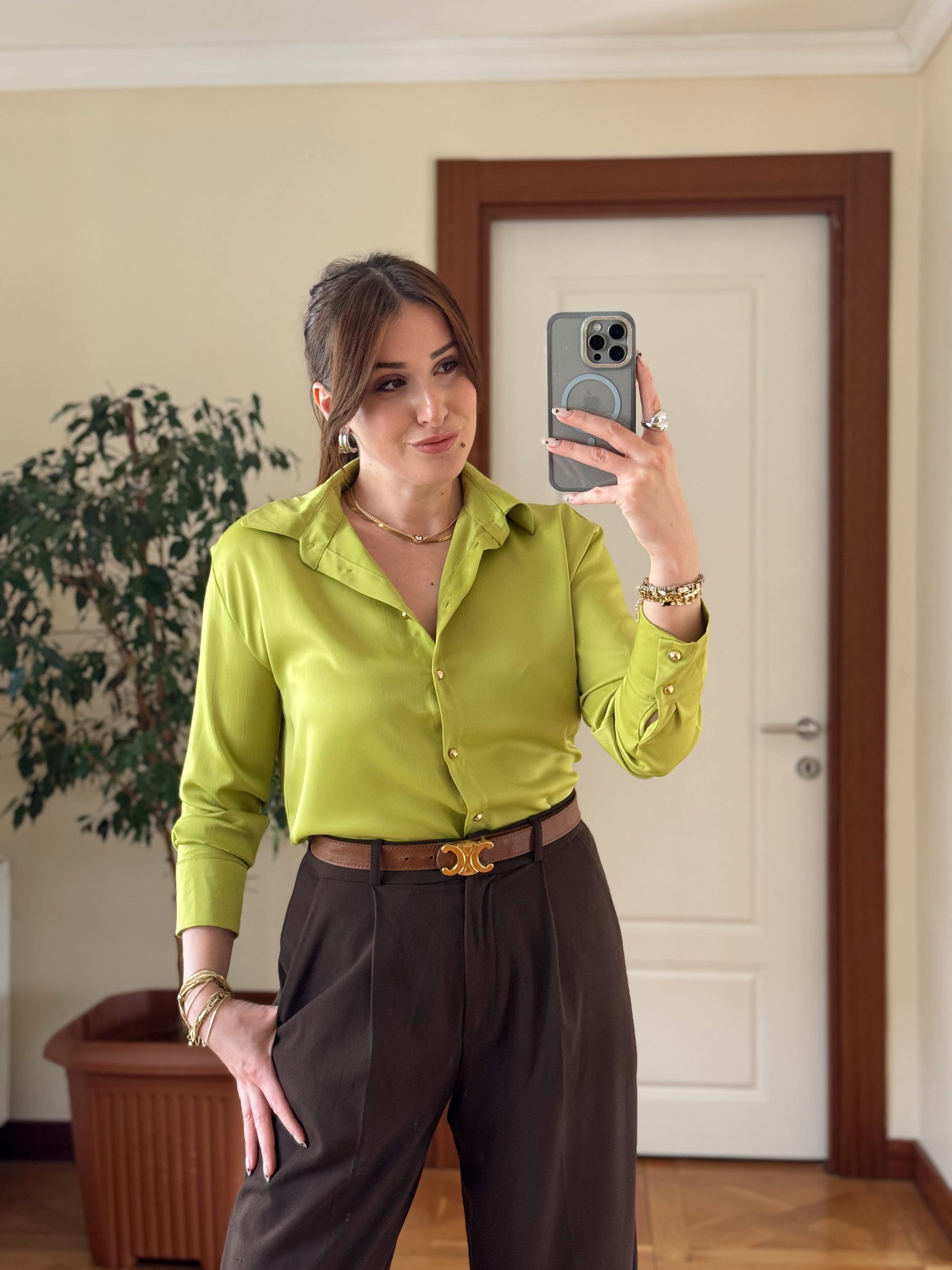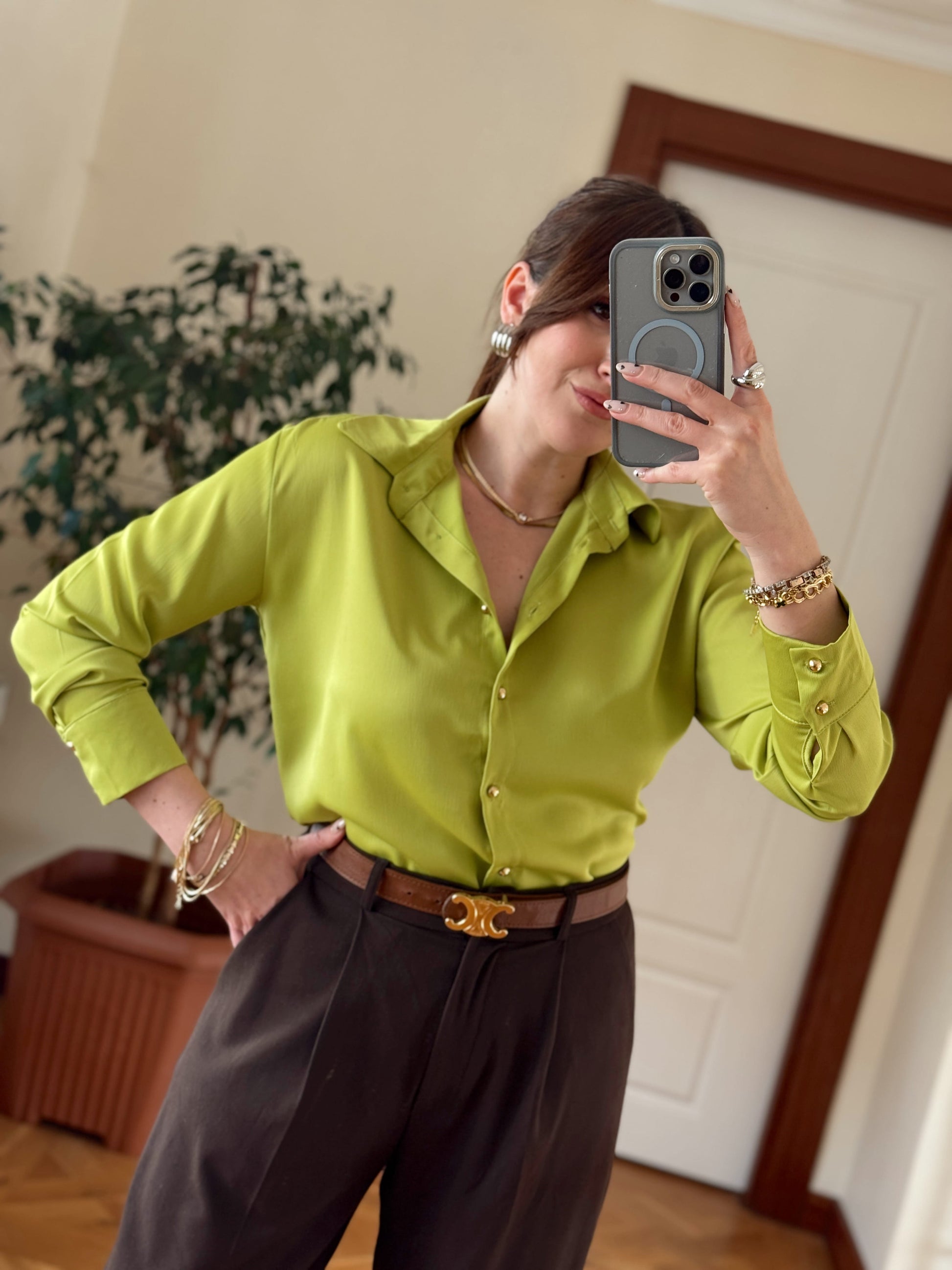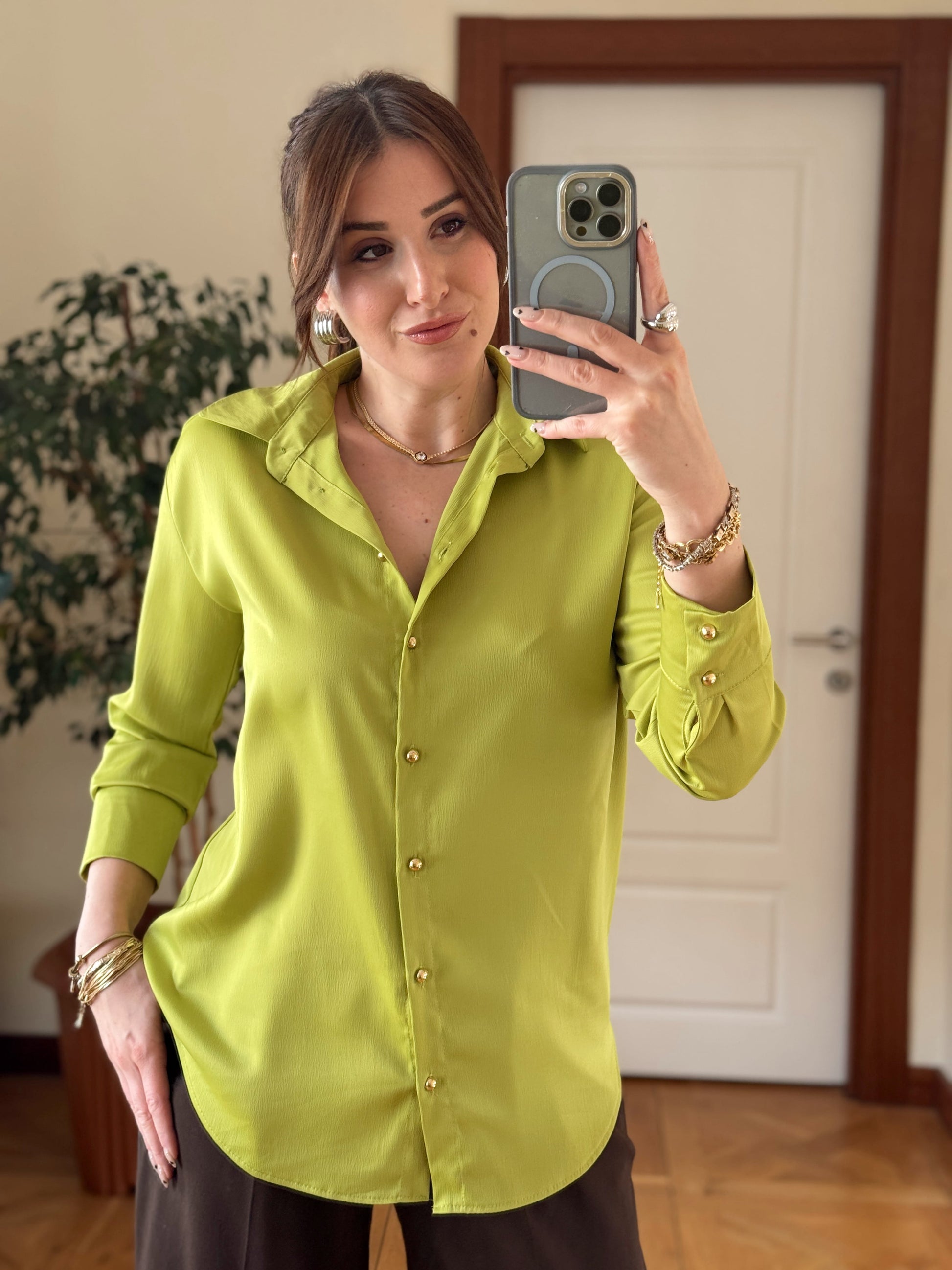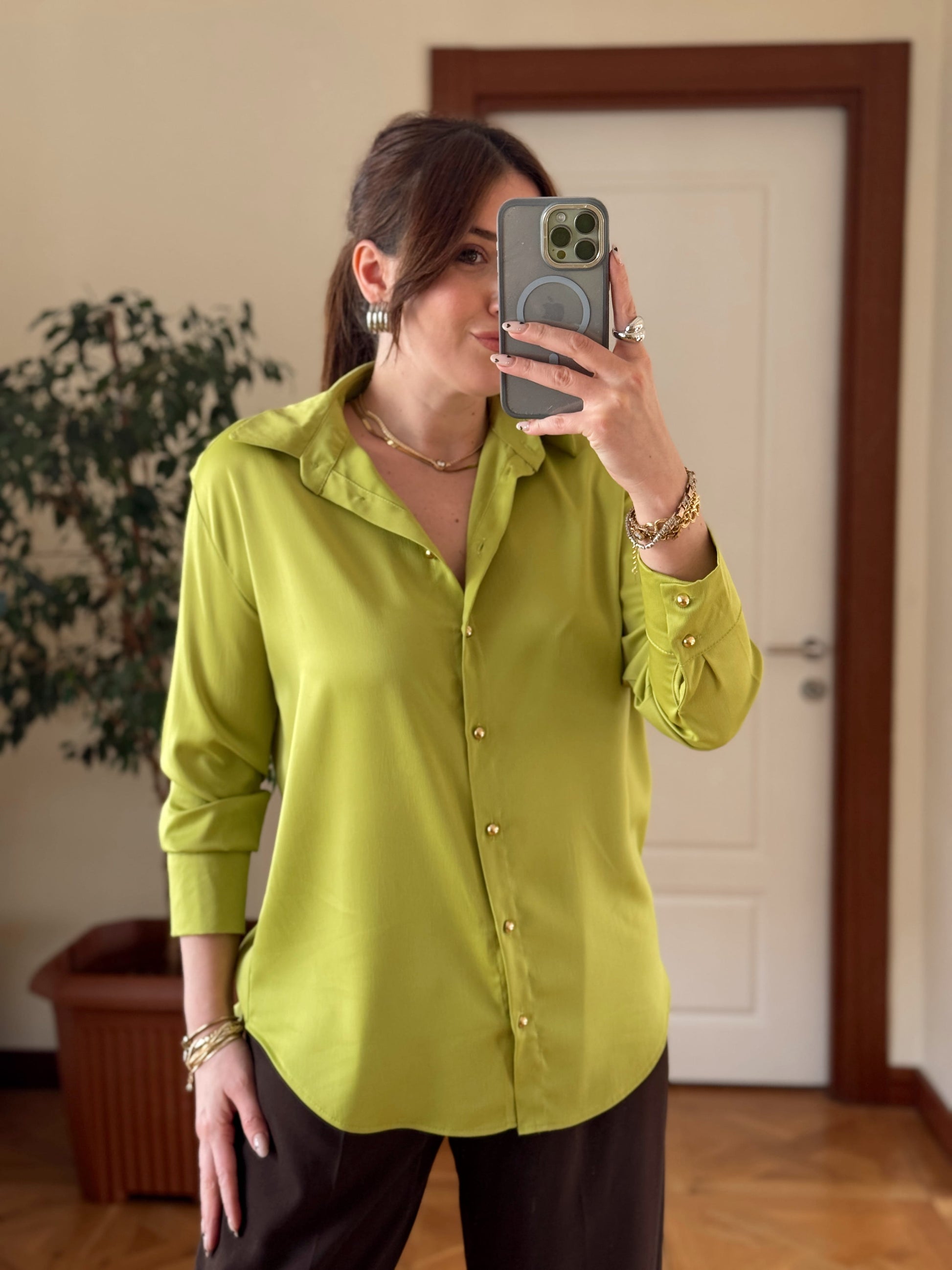Gold düğme Detaylı Saten Gömlek-YAĞ YEŞİLİ