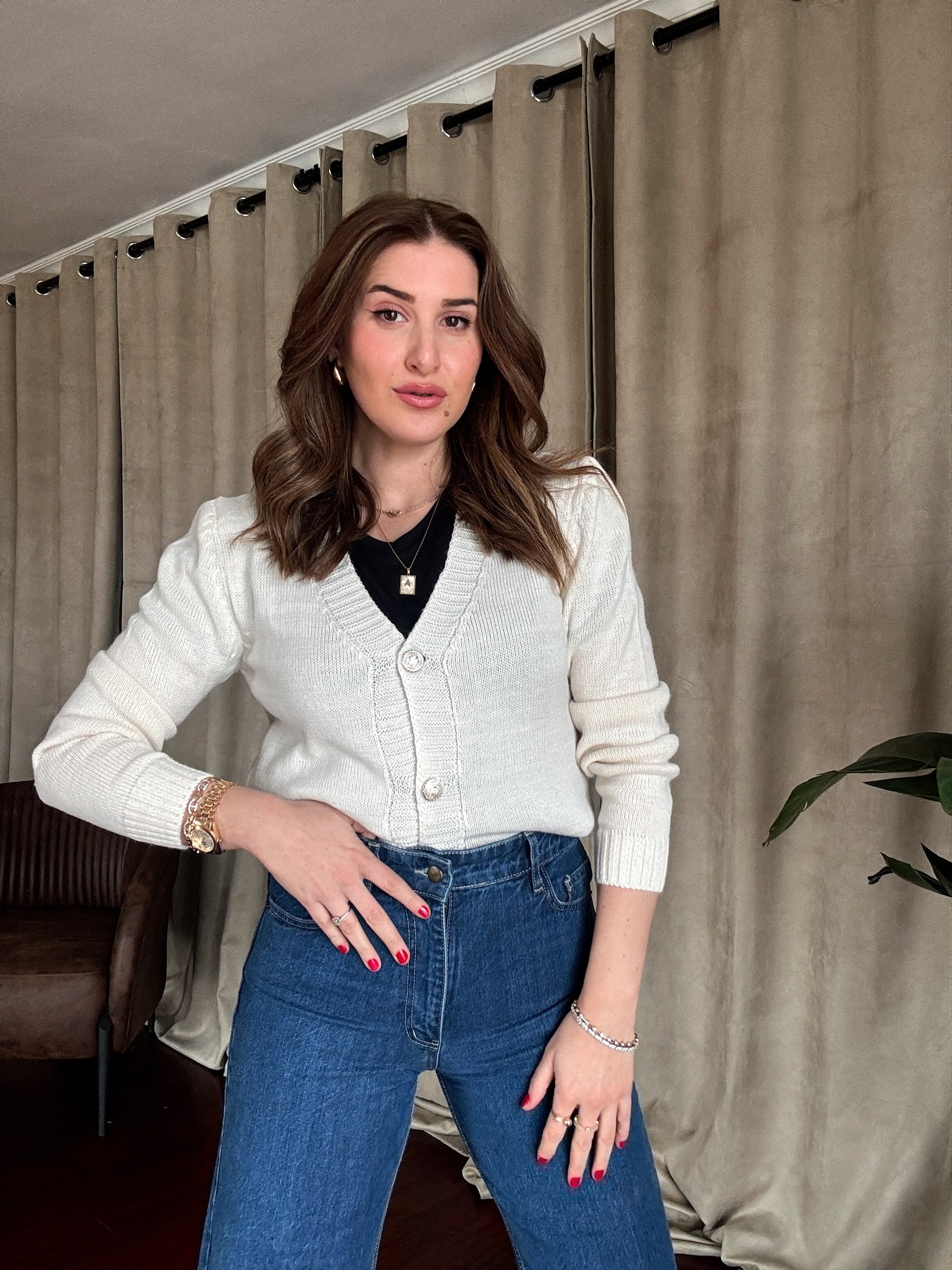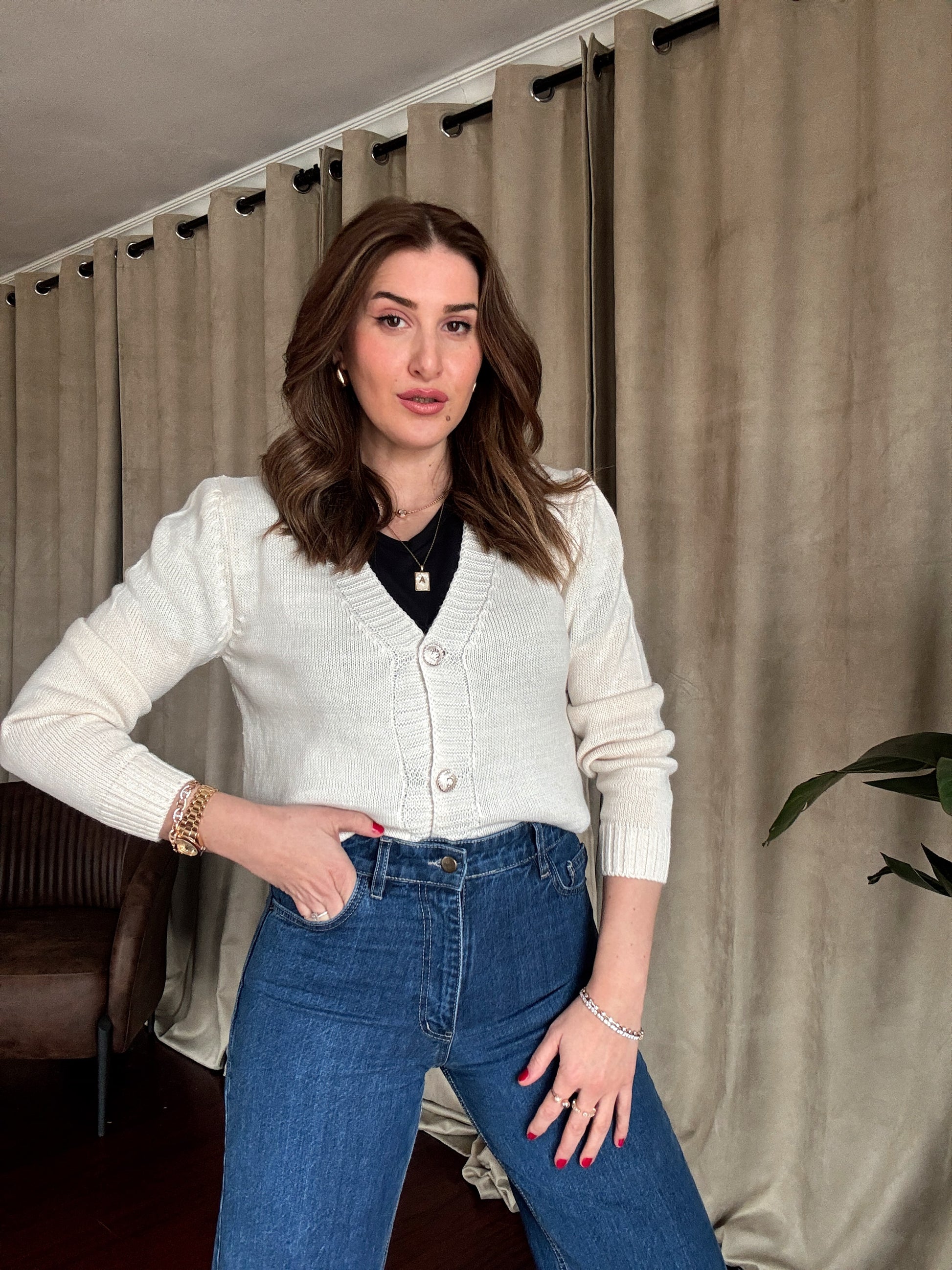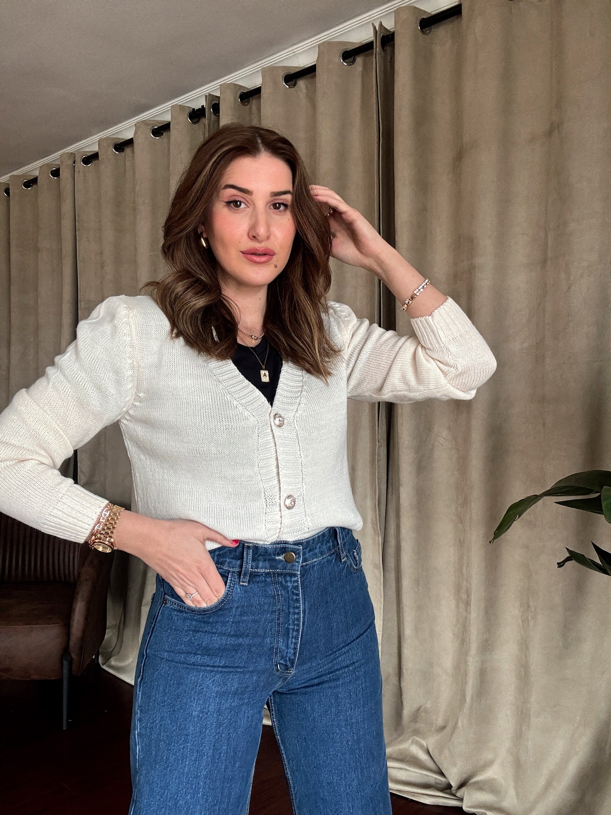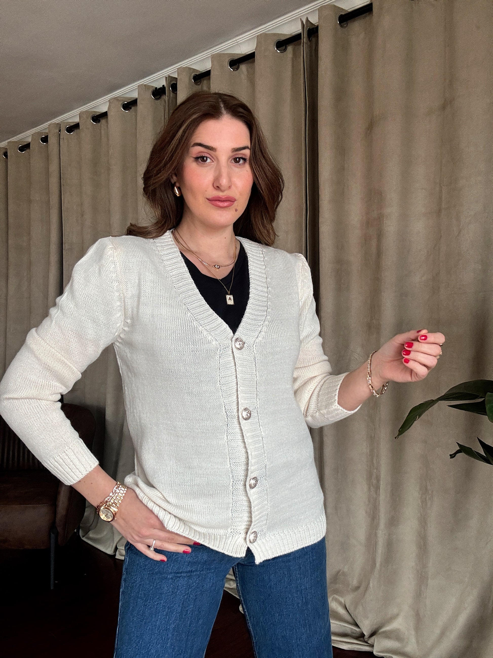 Gümüş Düğme Detaylı Triko Hırka-LATTE