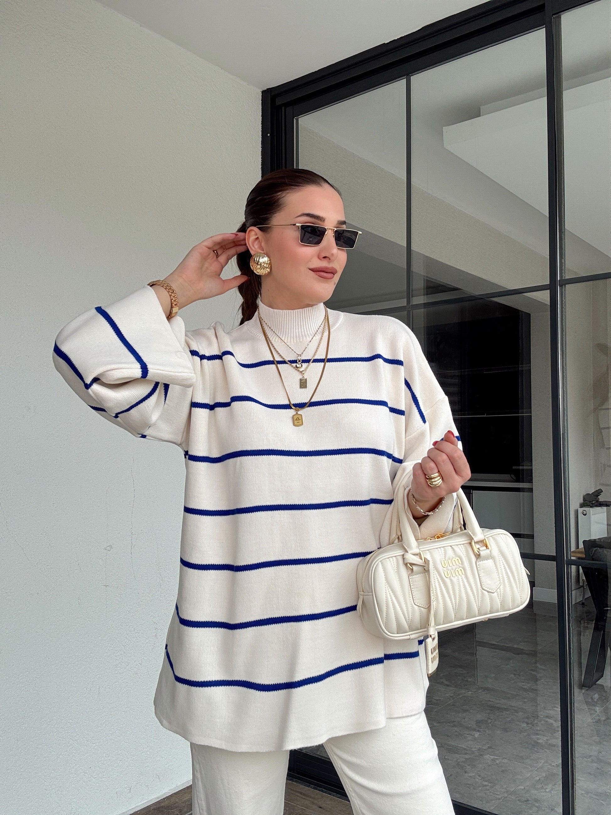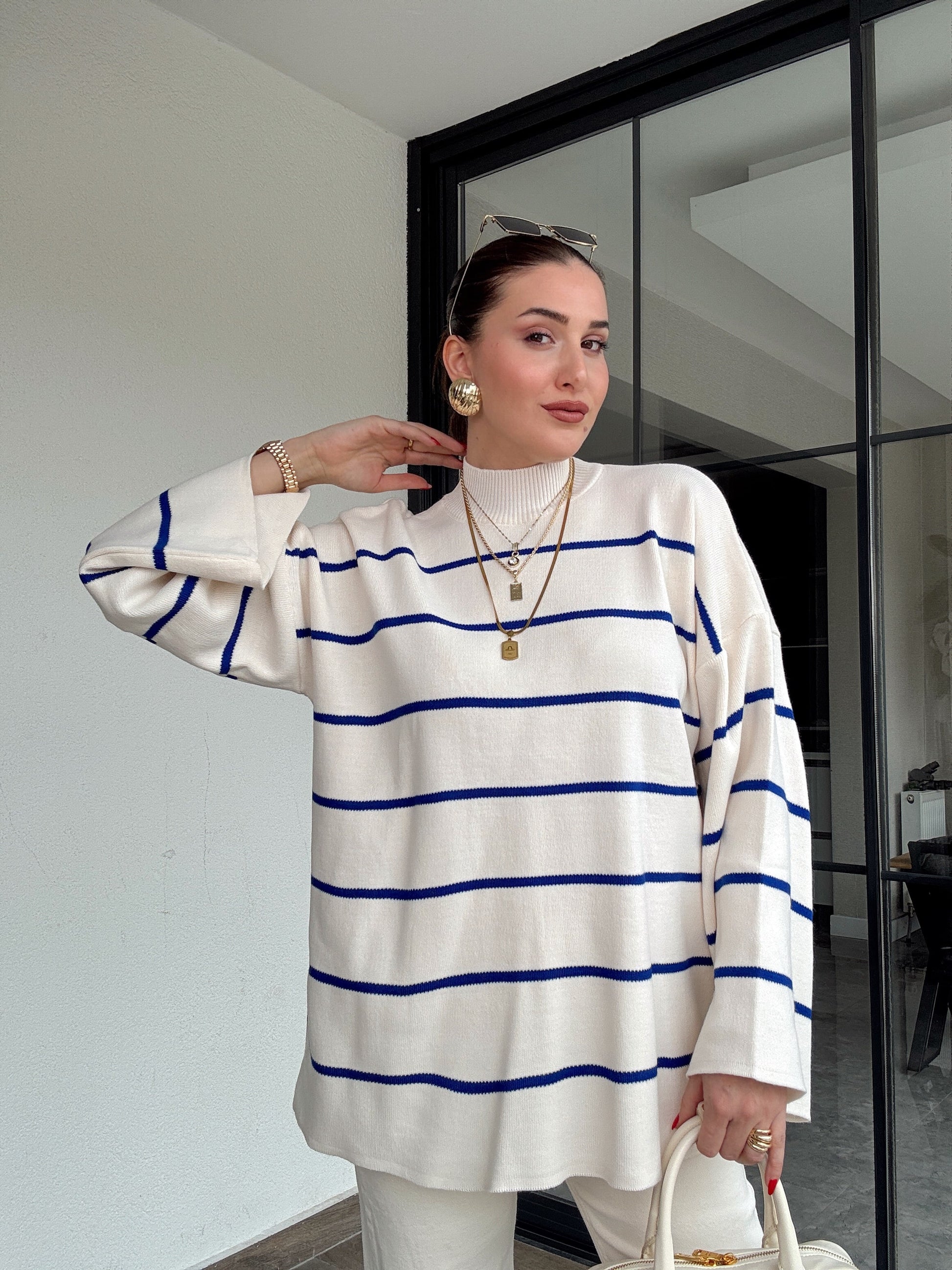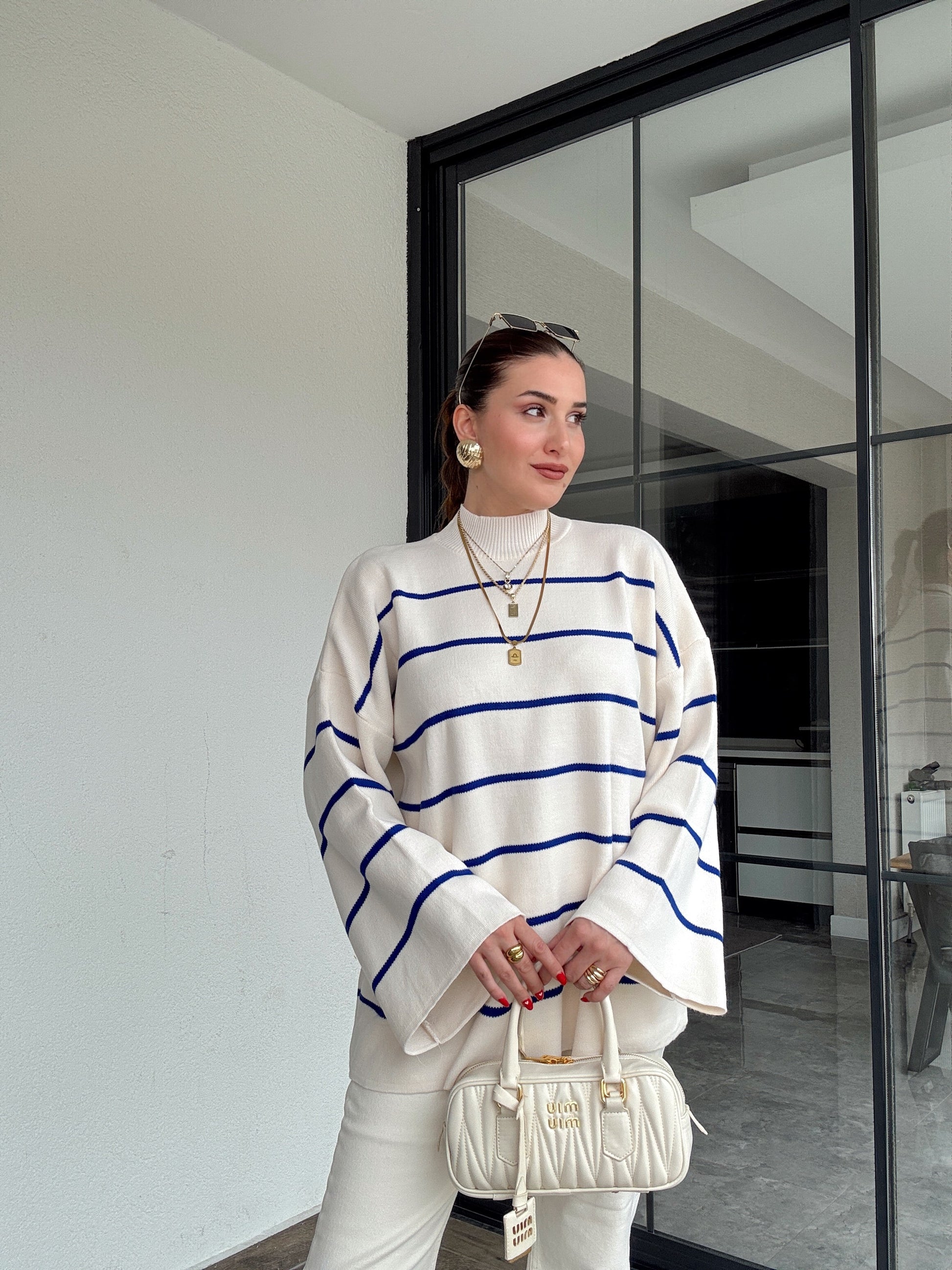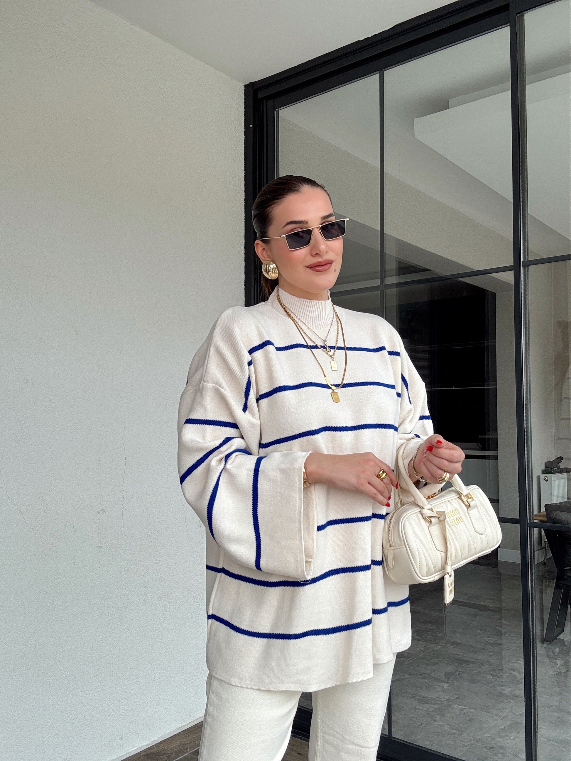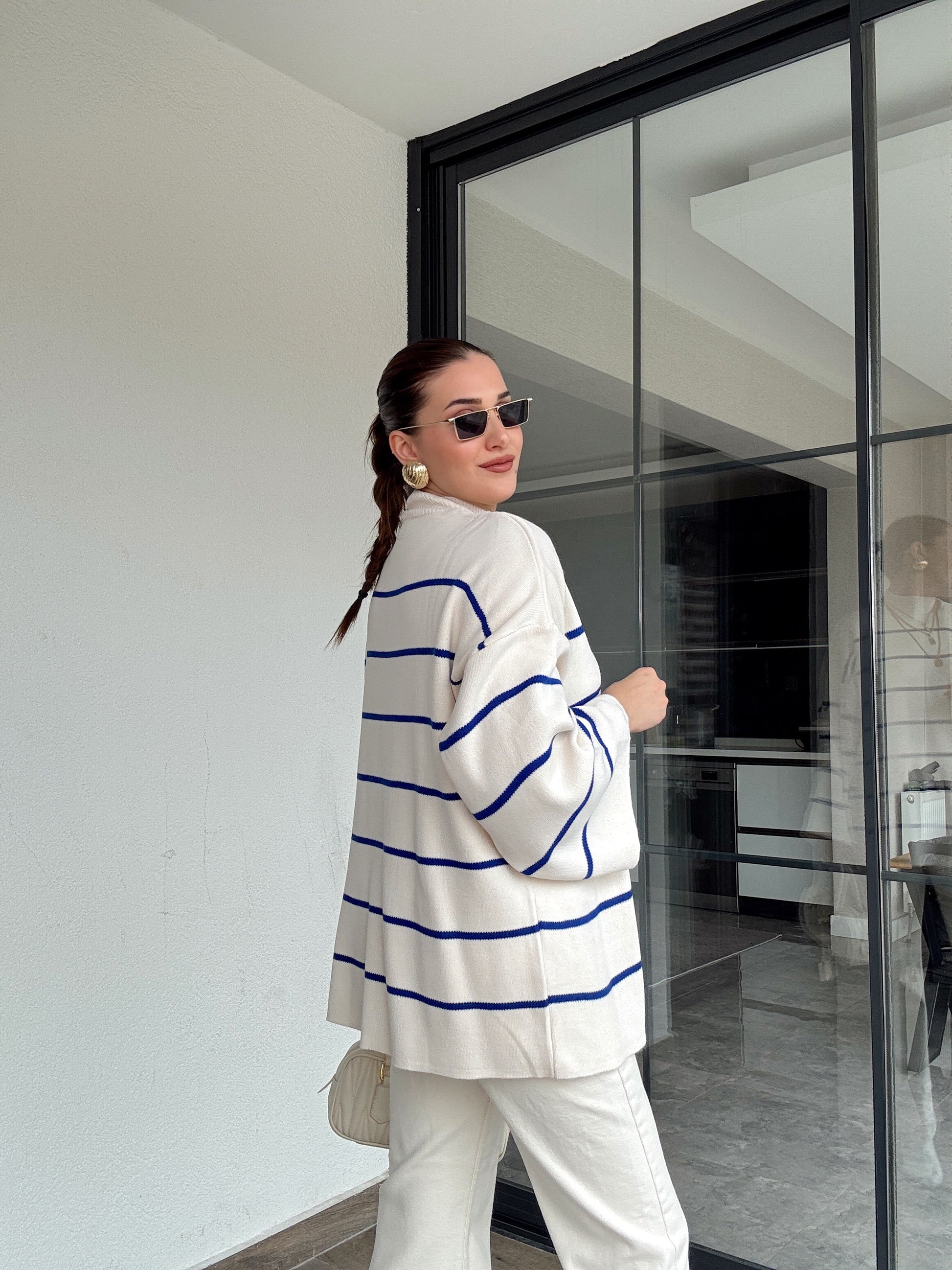 İspanyol Kol Çizgili Kazak - SAKS MAVİ