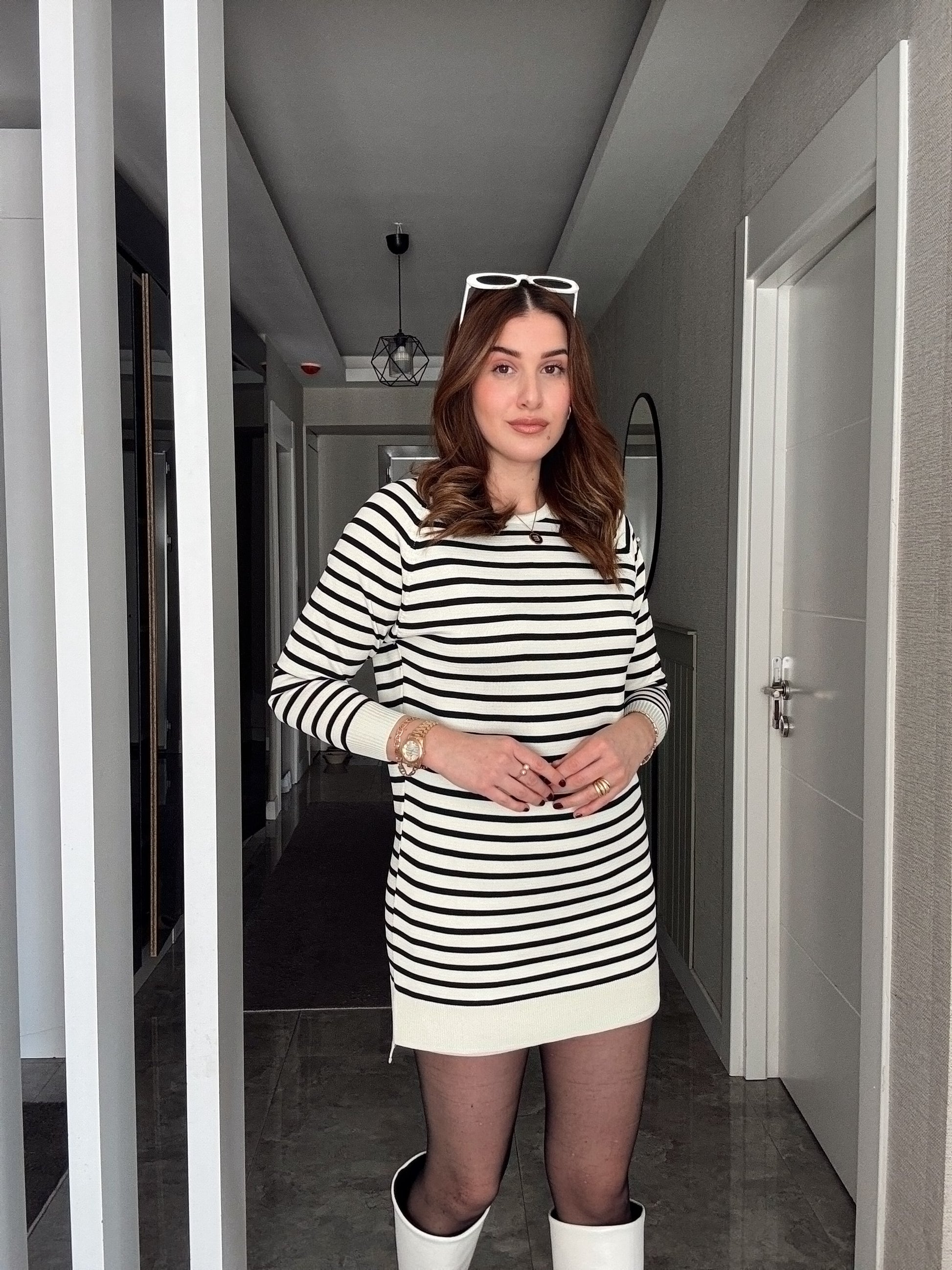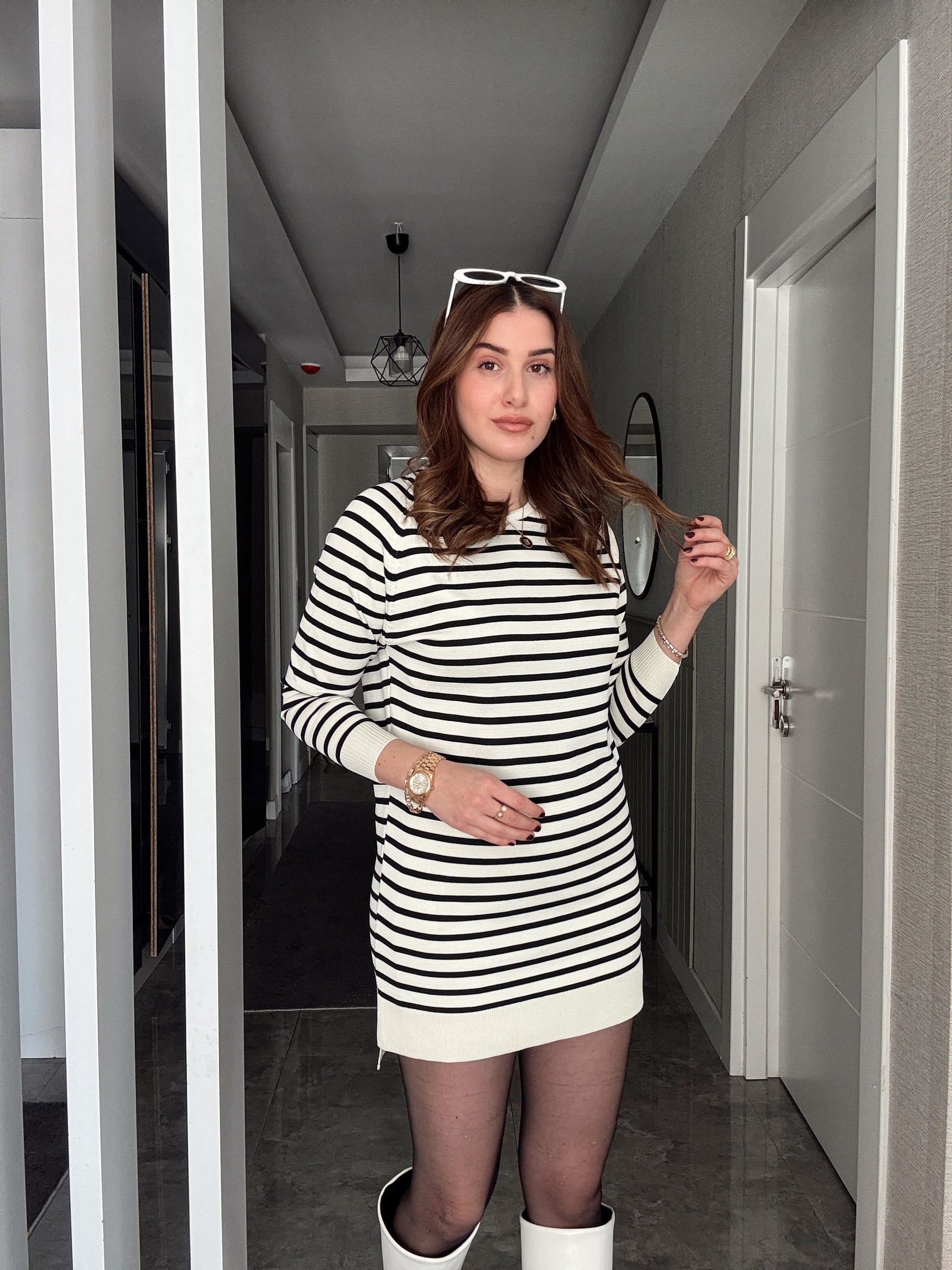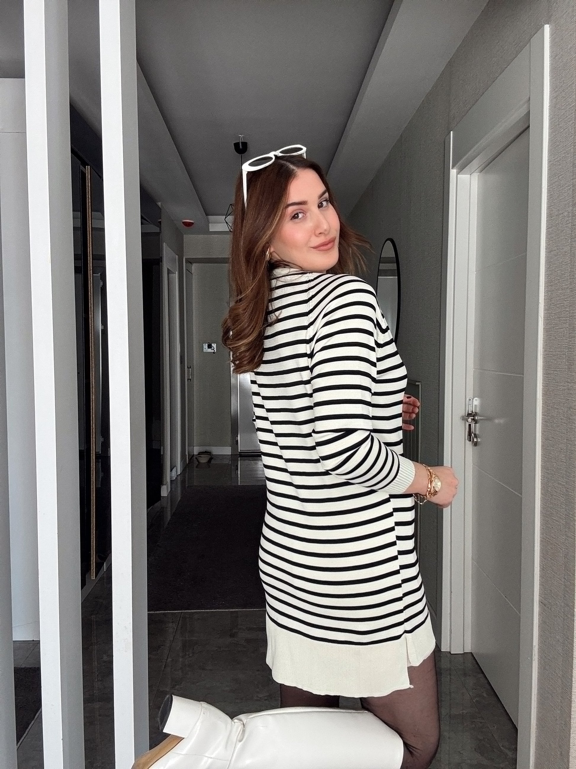 İTALYAN KOL ÇİZGİLİ POLİELİT KAZAK - LATTE