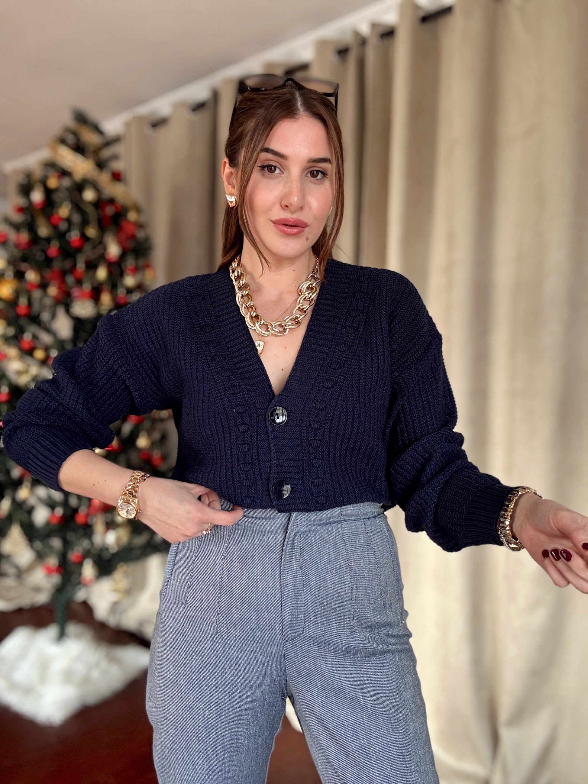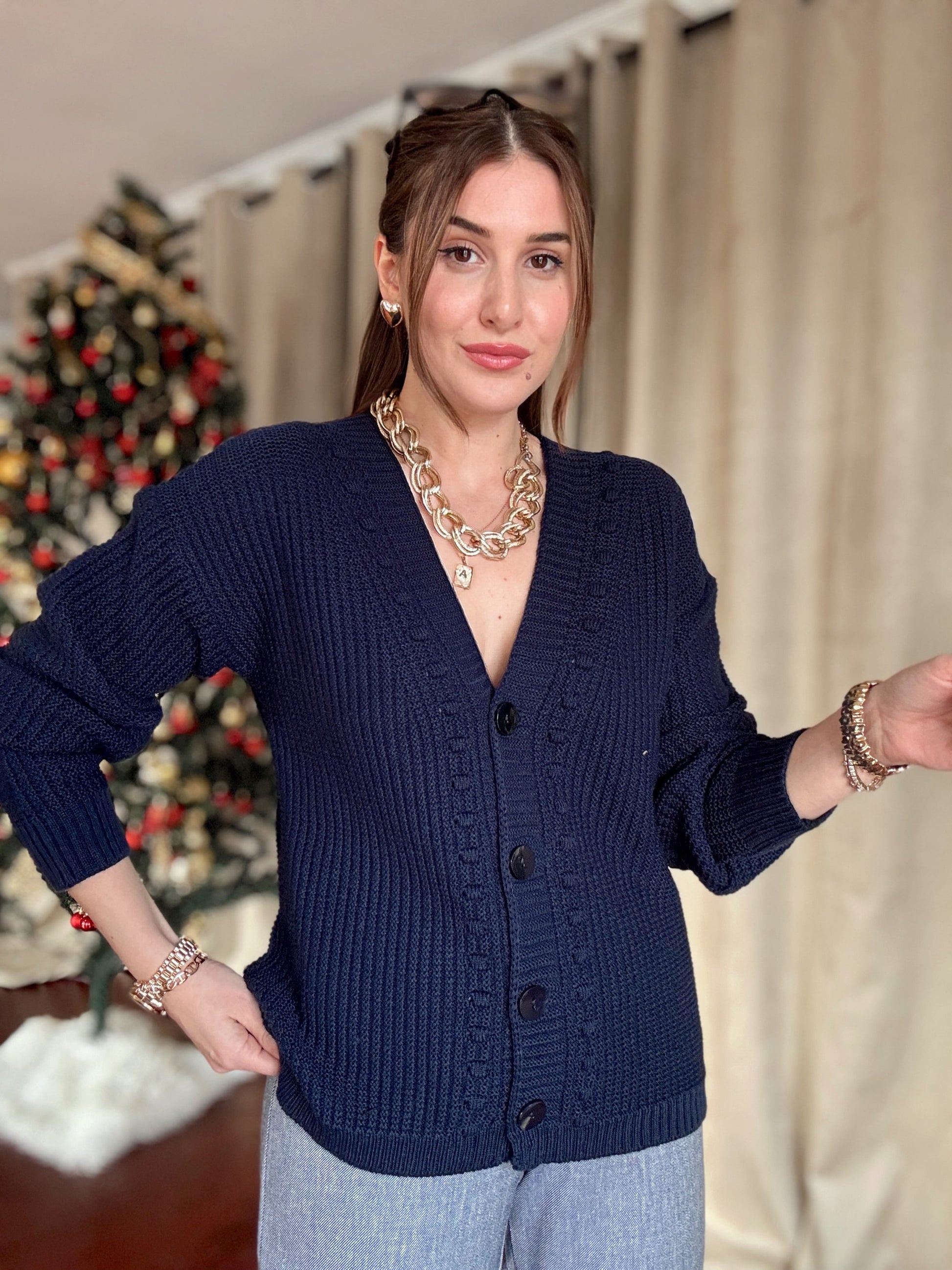 Kabartma İşleme Düğmeli Hırka - LACİVERT