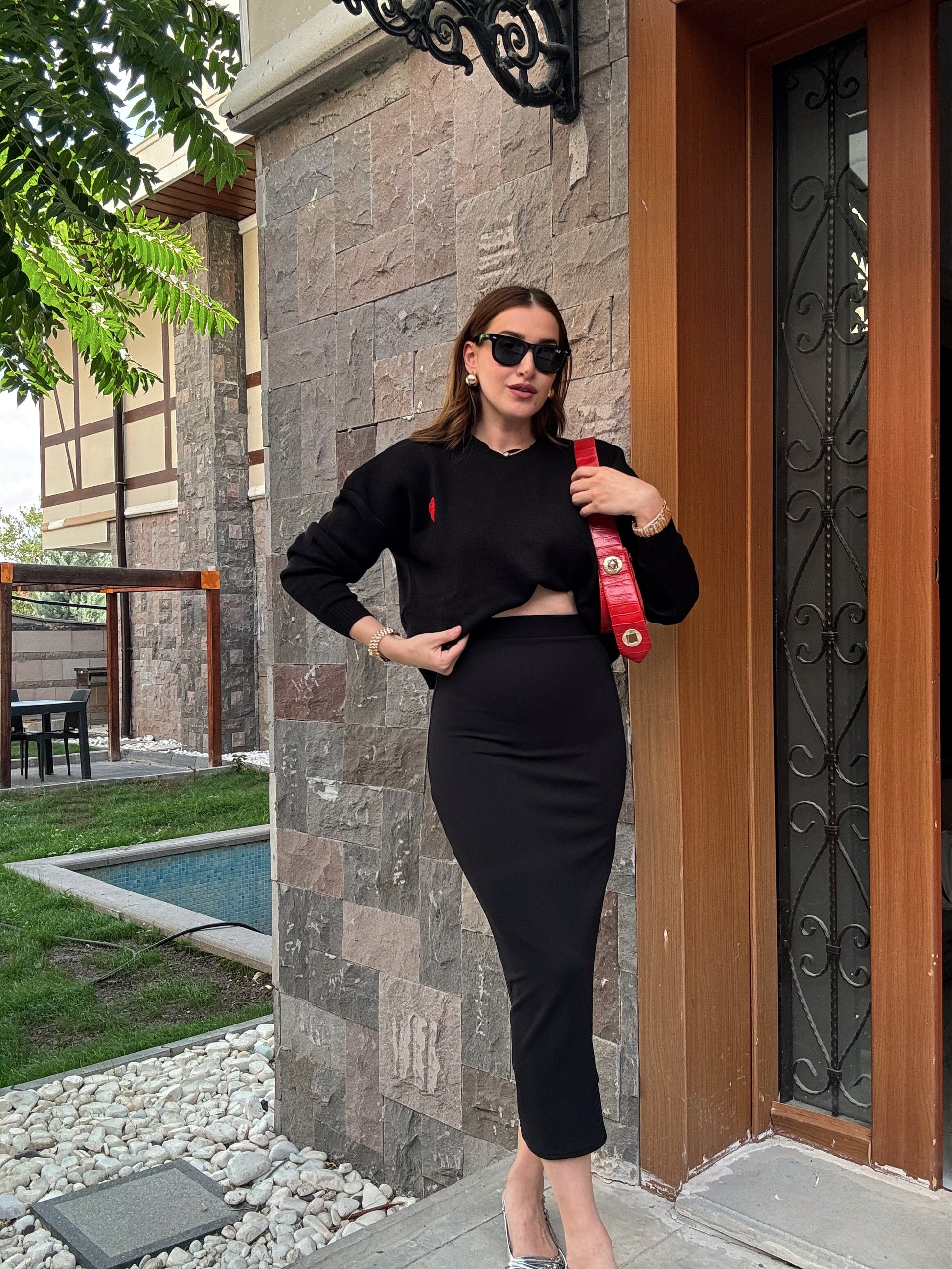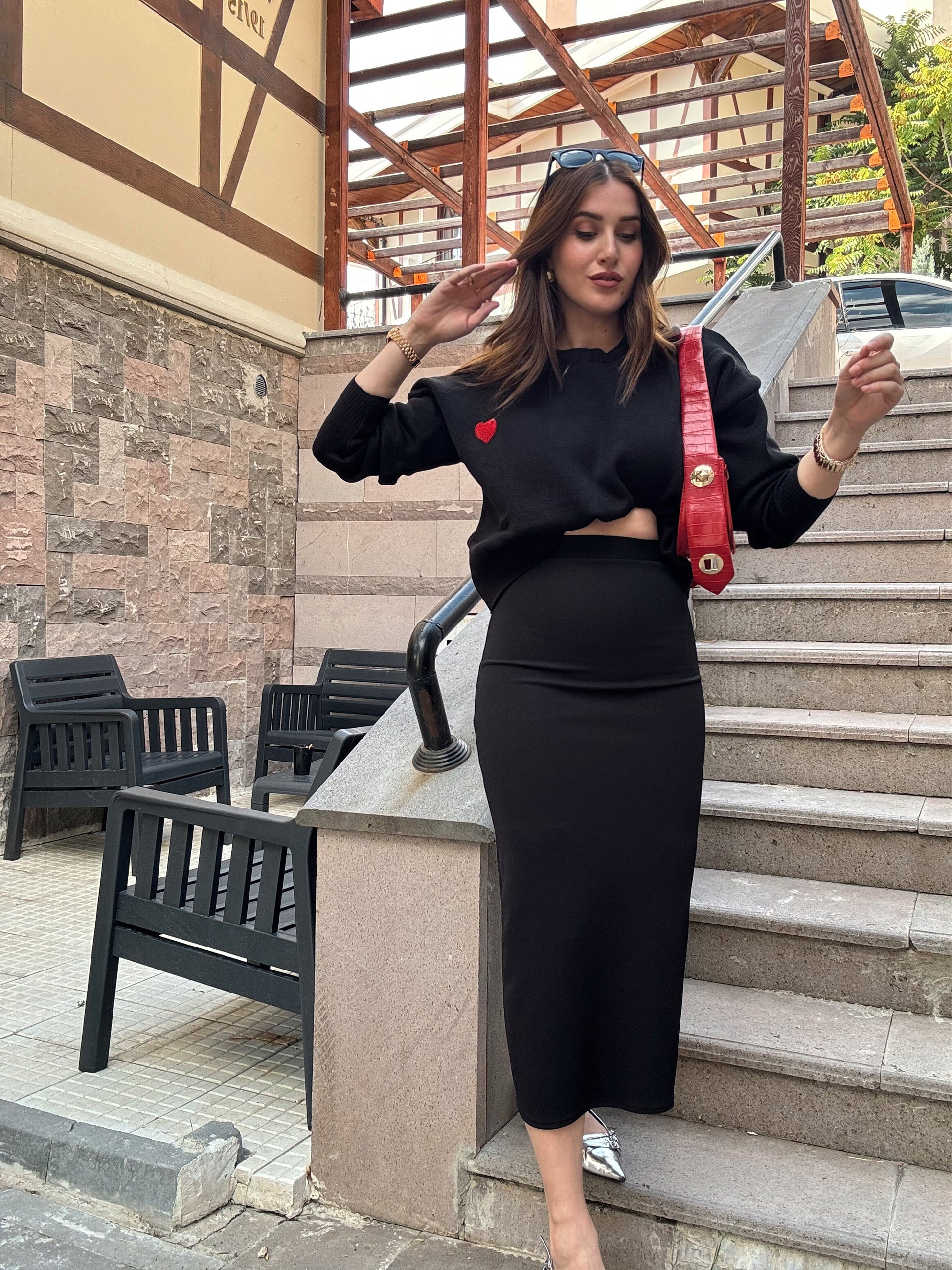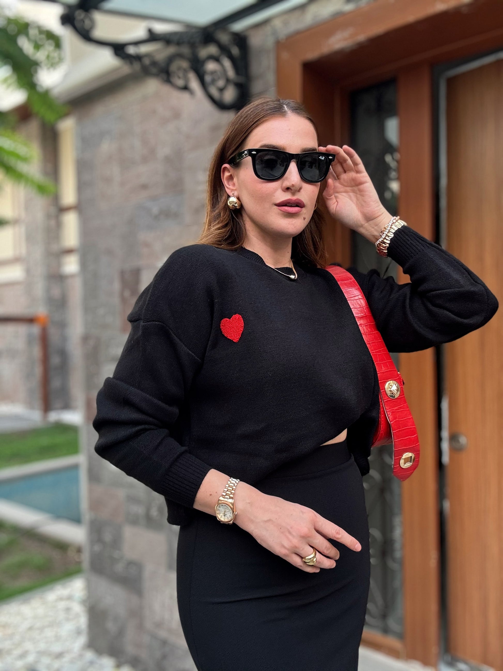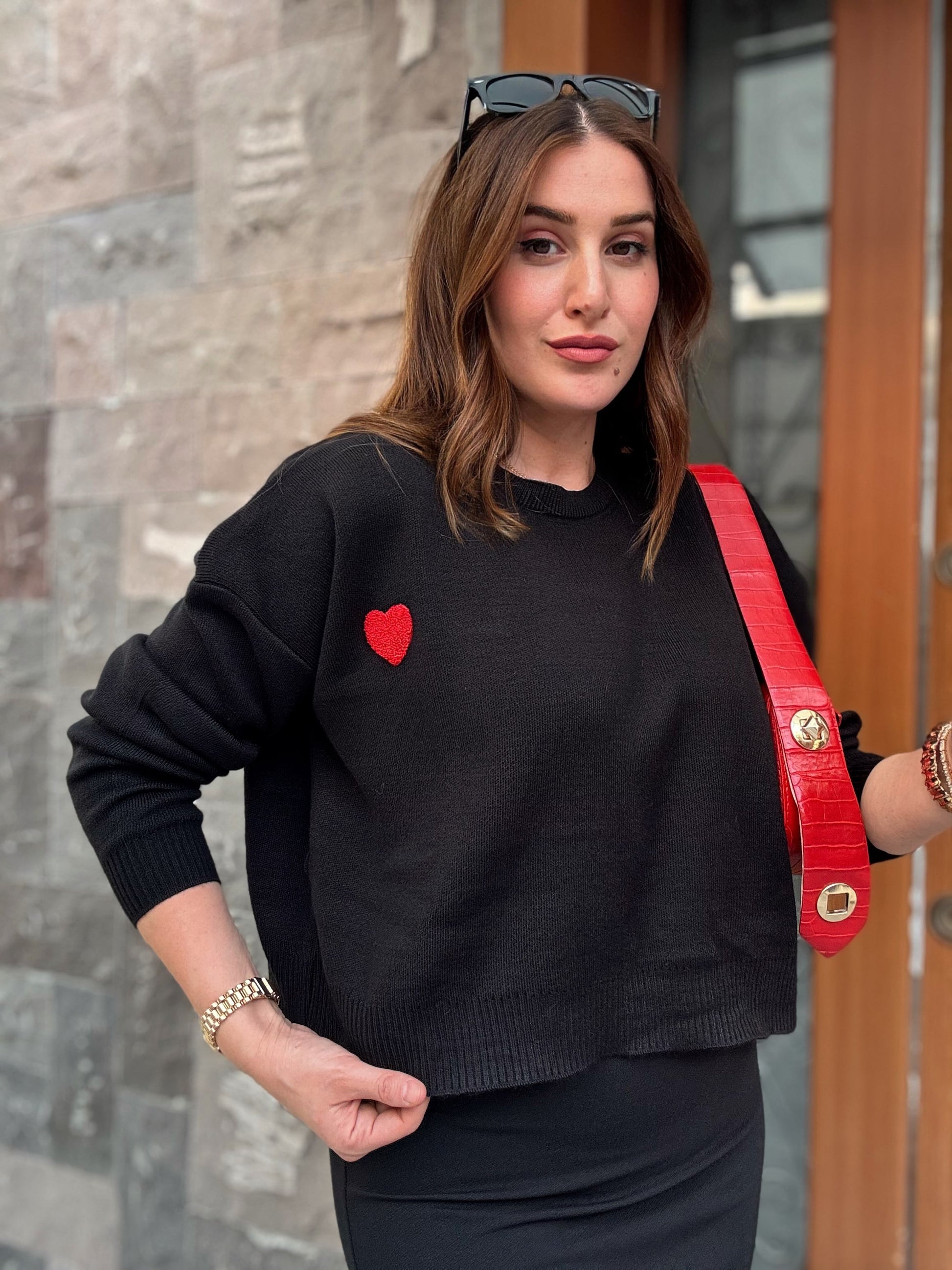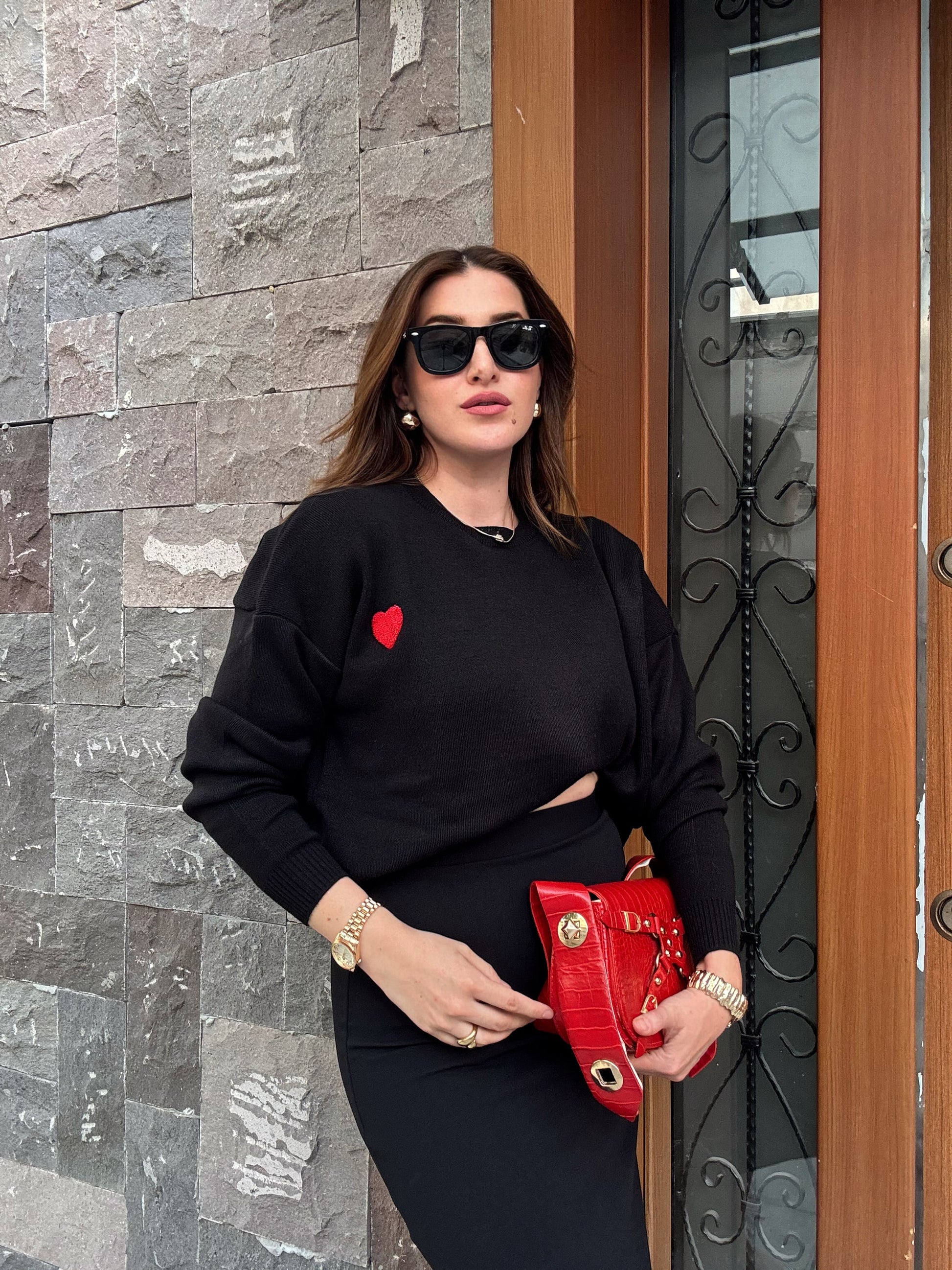 Kalp Aplikeli Crop Kazak - SİYAH