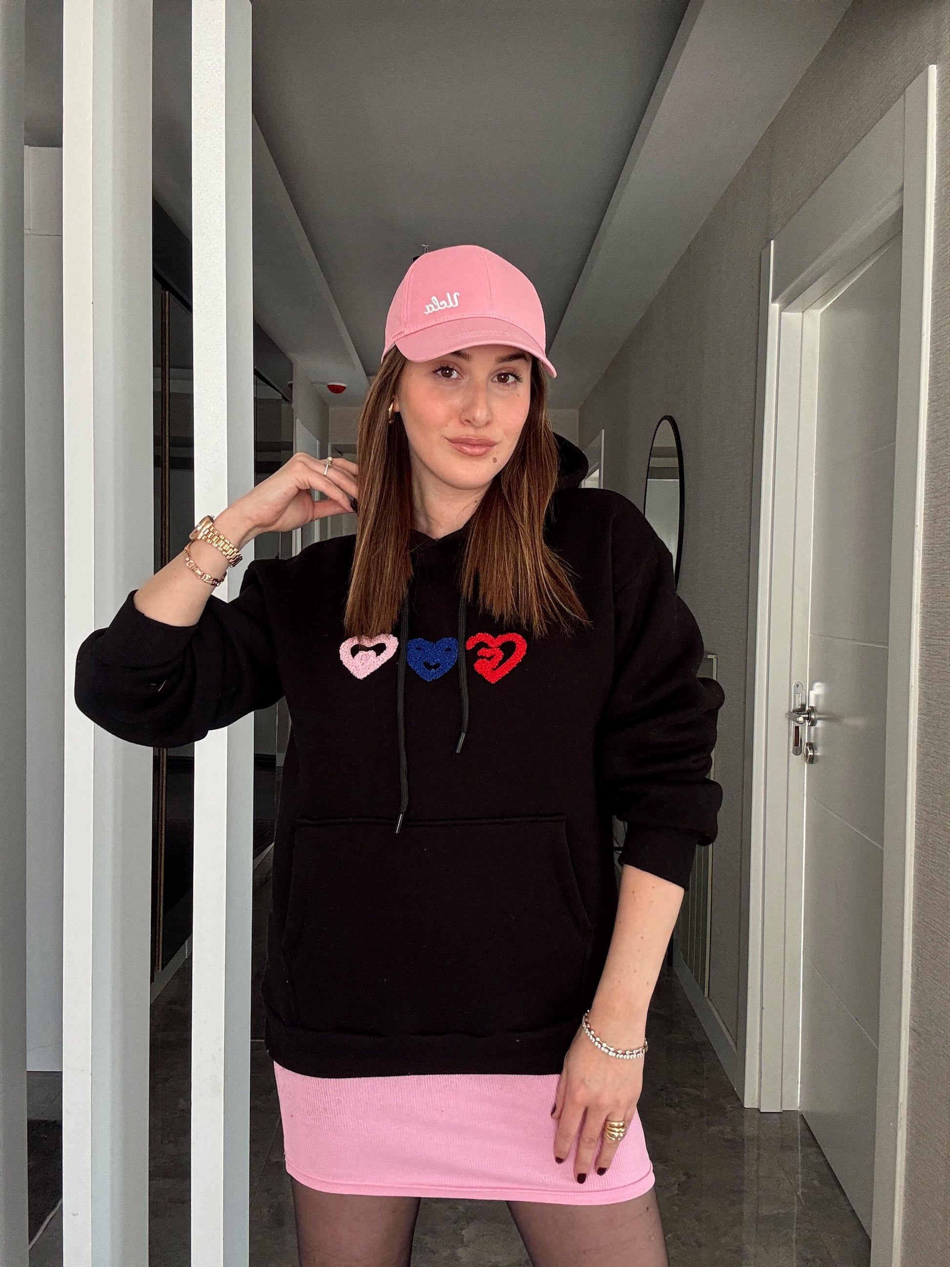 Kalp İşleme Kapüşonlu 3 İplik Sweatshirt - SİYAH