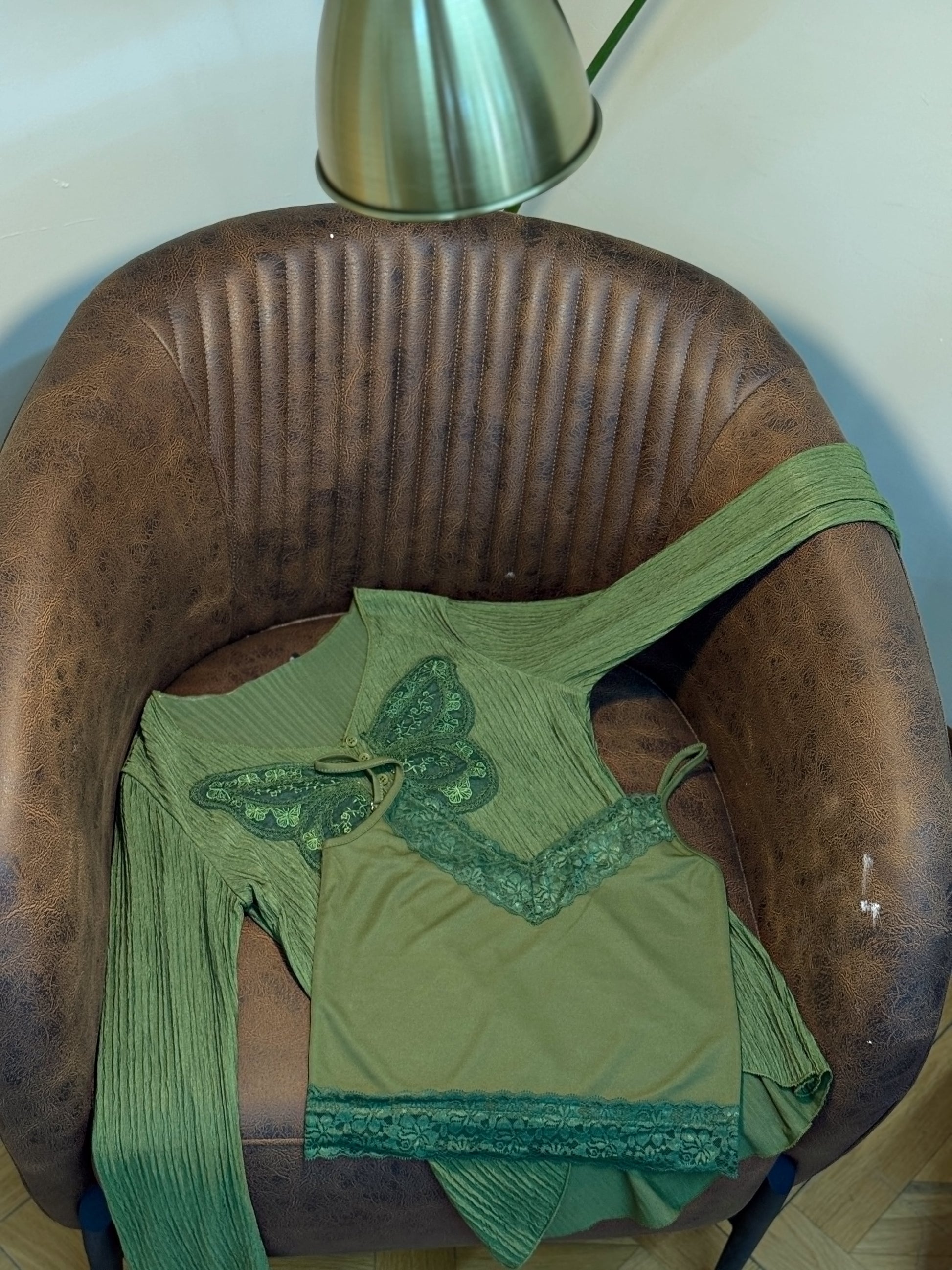 Kelebek dantel detaylı üçlü takım-YEŞİL
