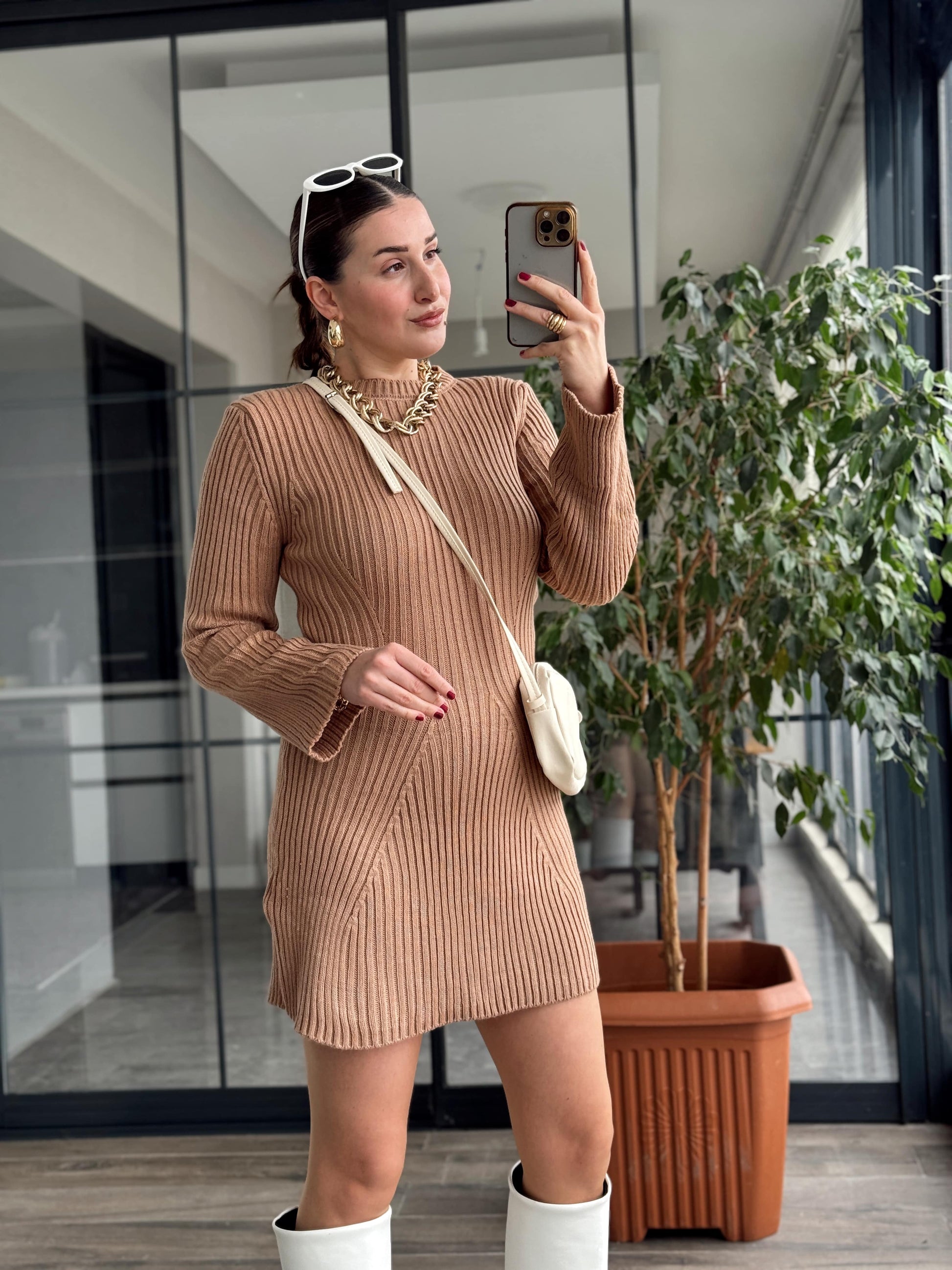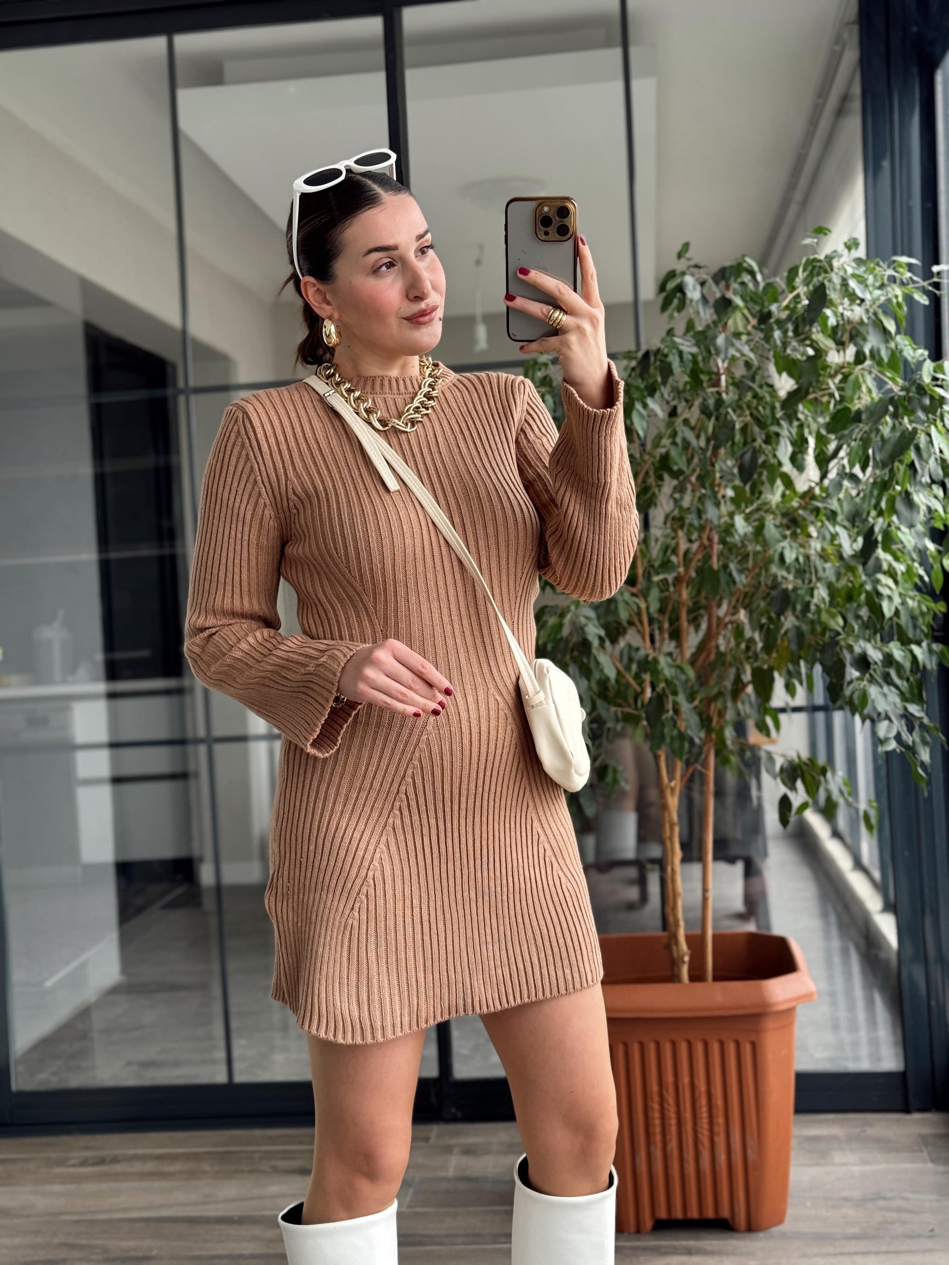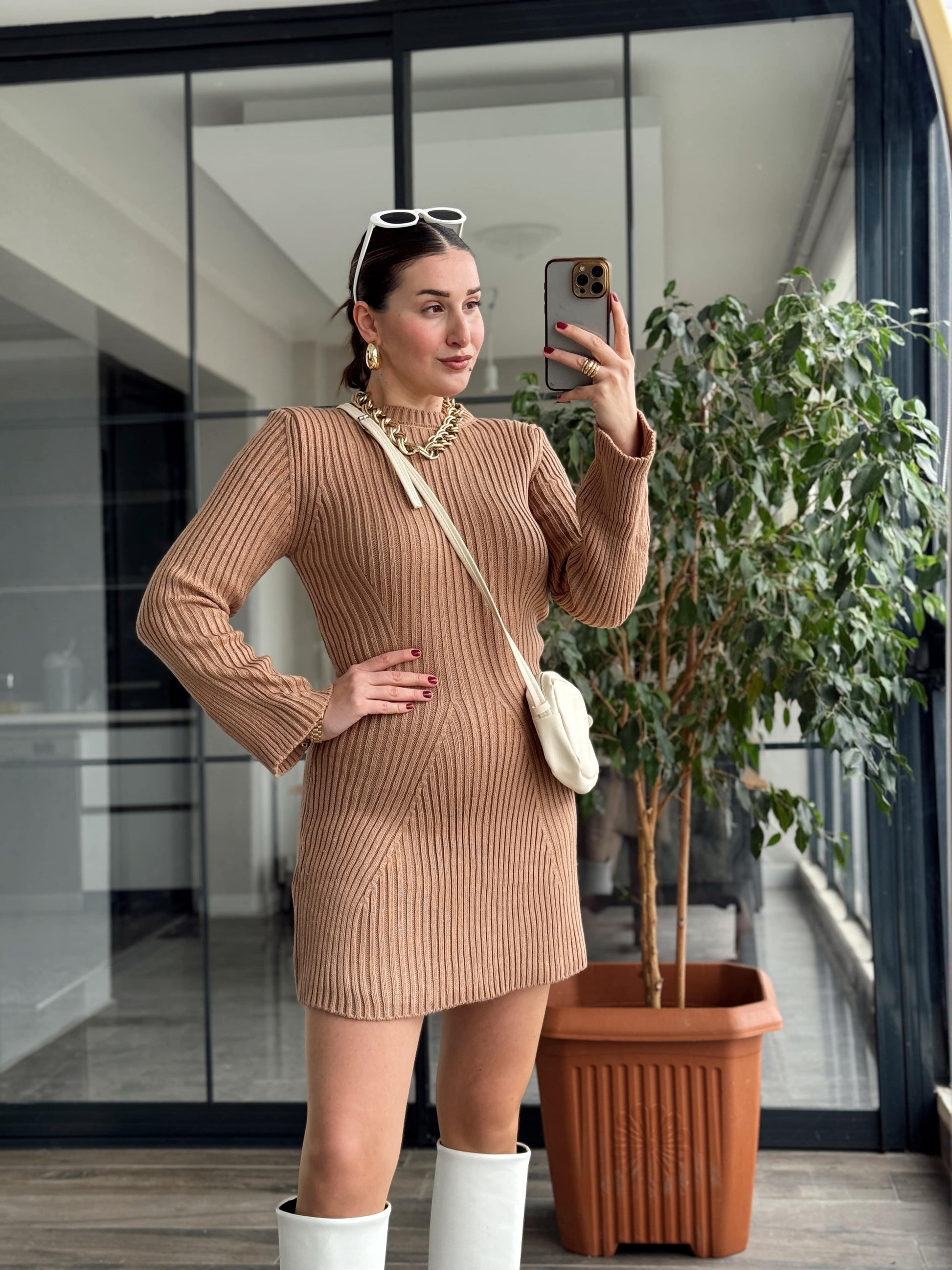 Kloş Fitilli Triko Elbise - CAMEL