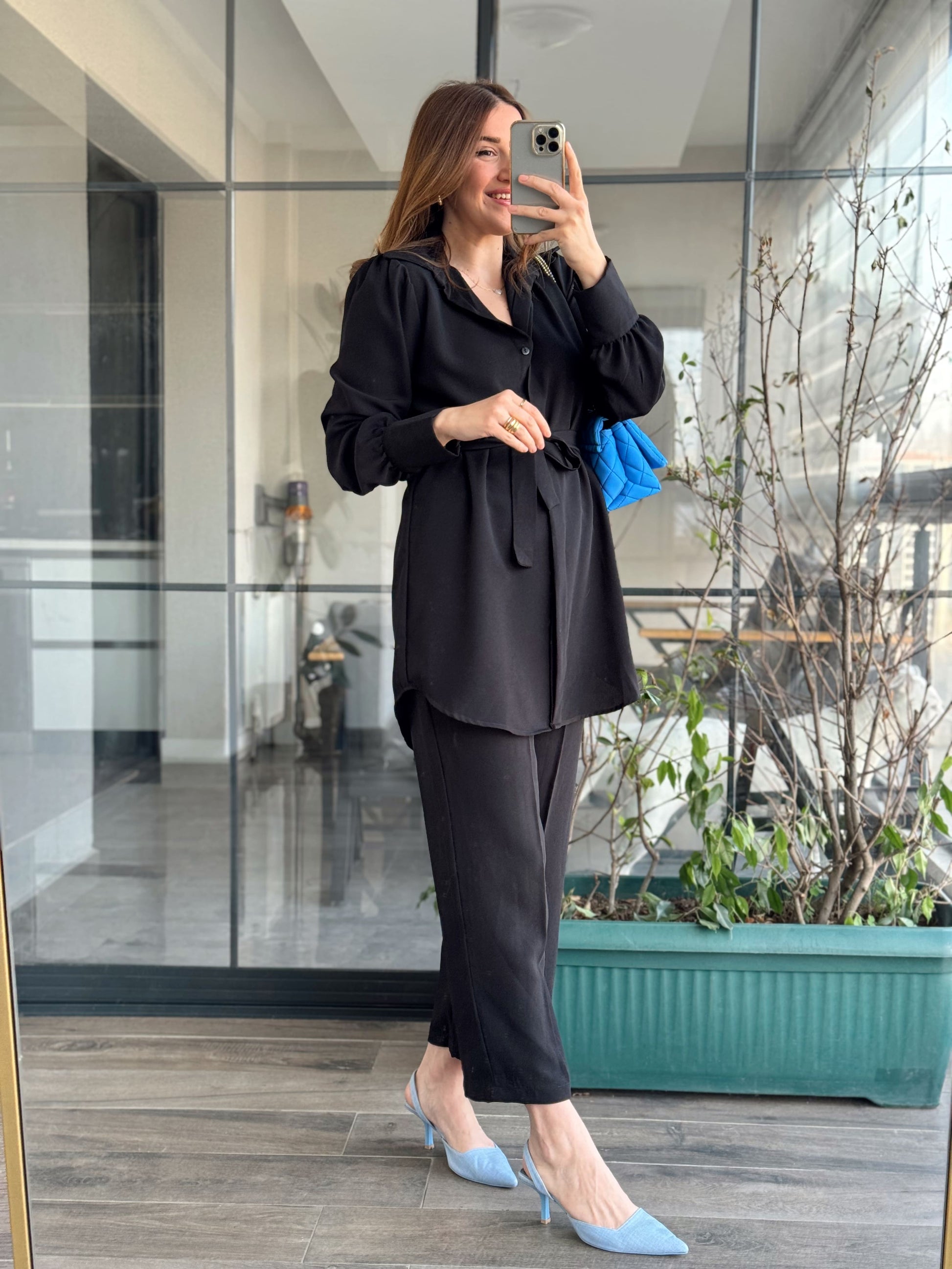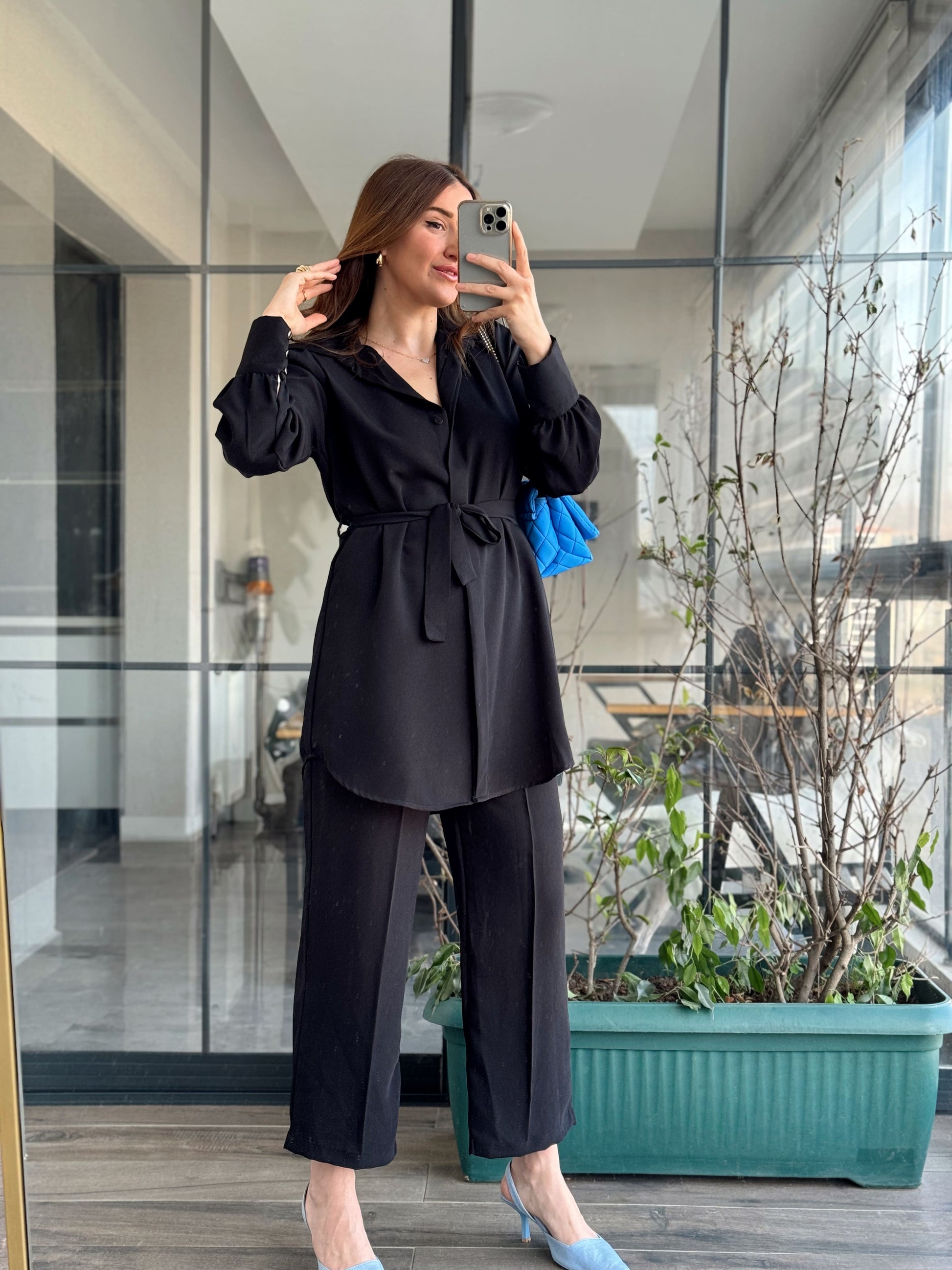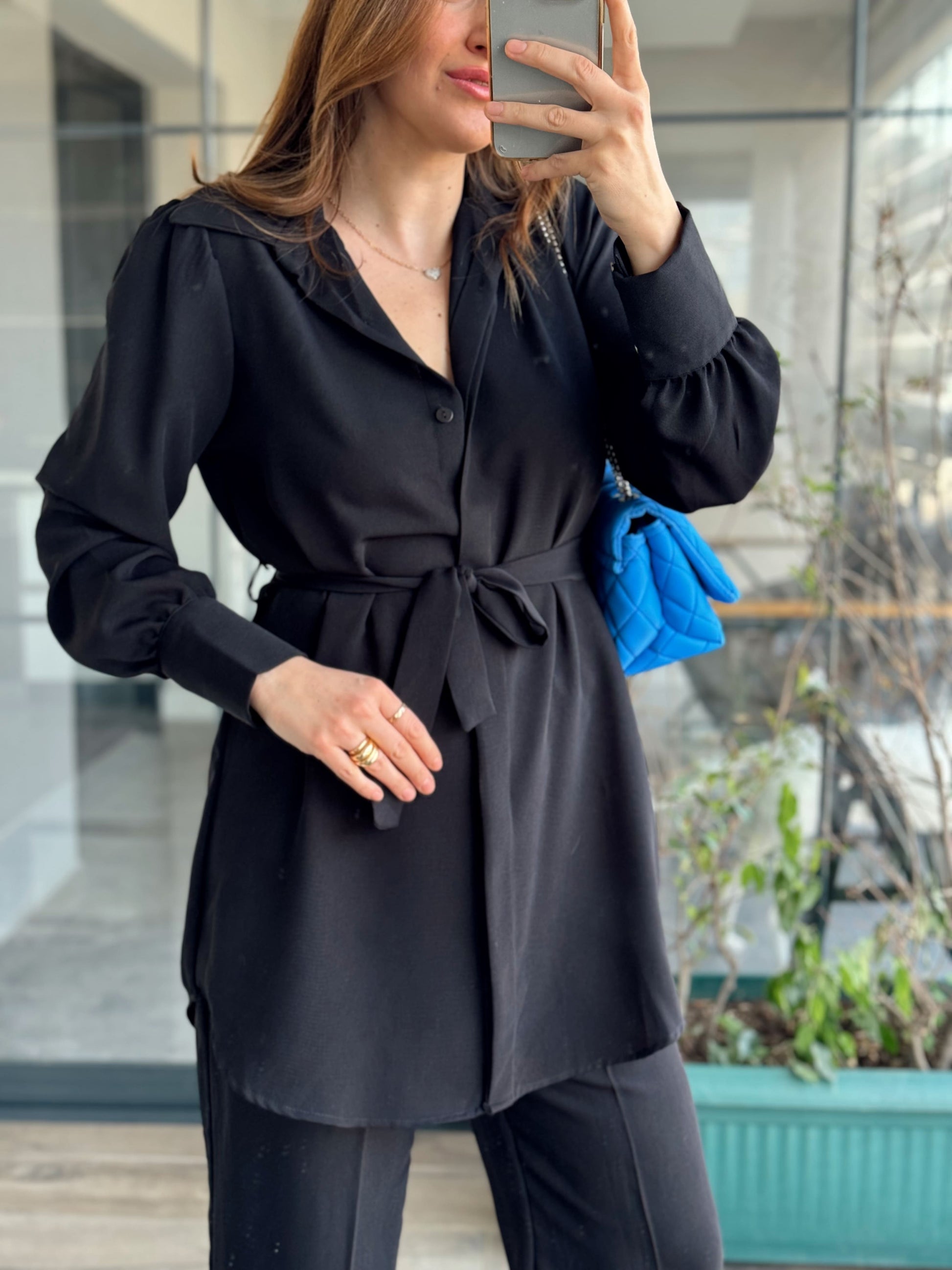 Kol Düğme Detay Kuşaklı 2 Parça Takım - SİYAH