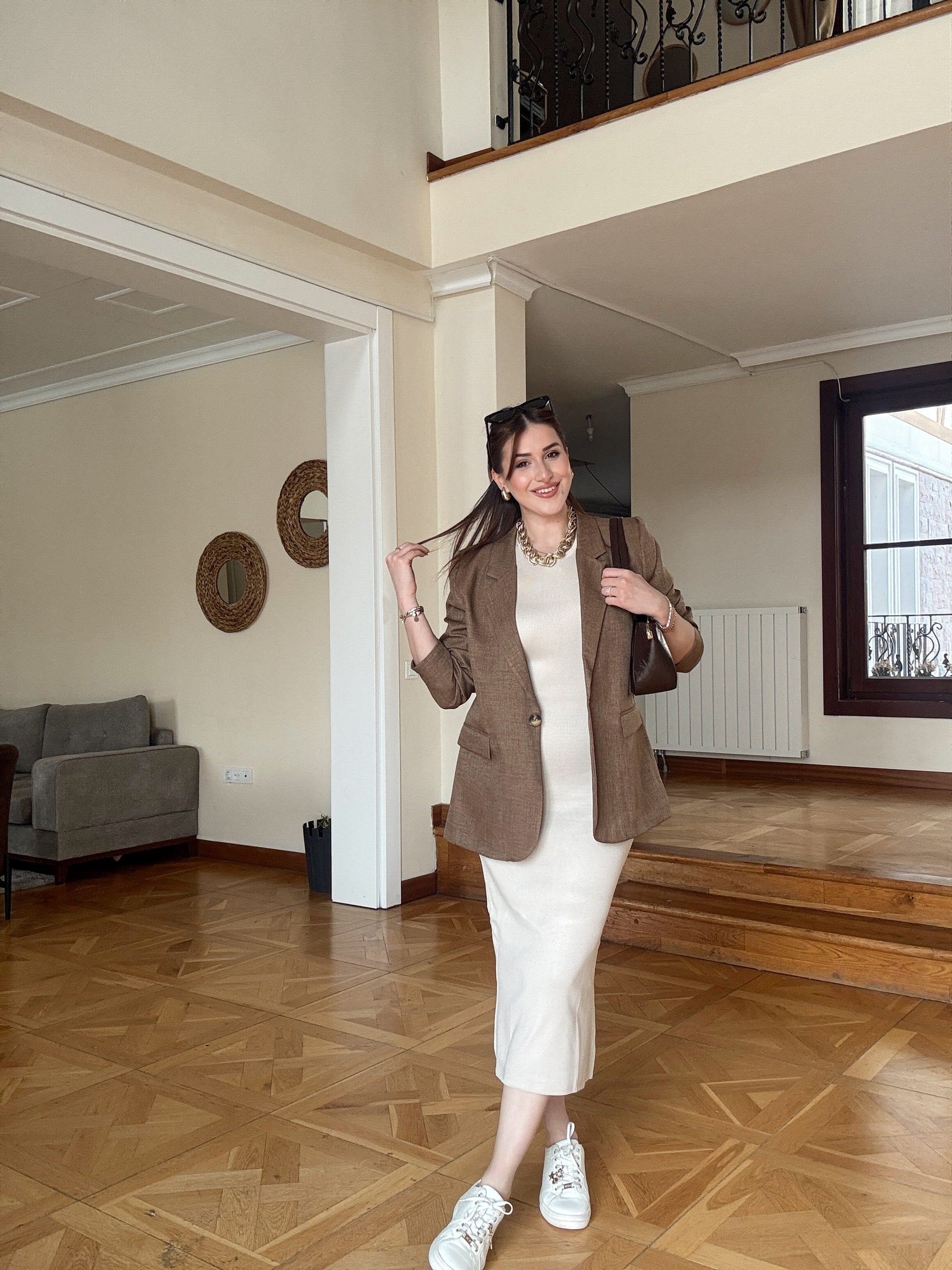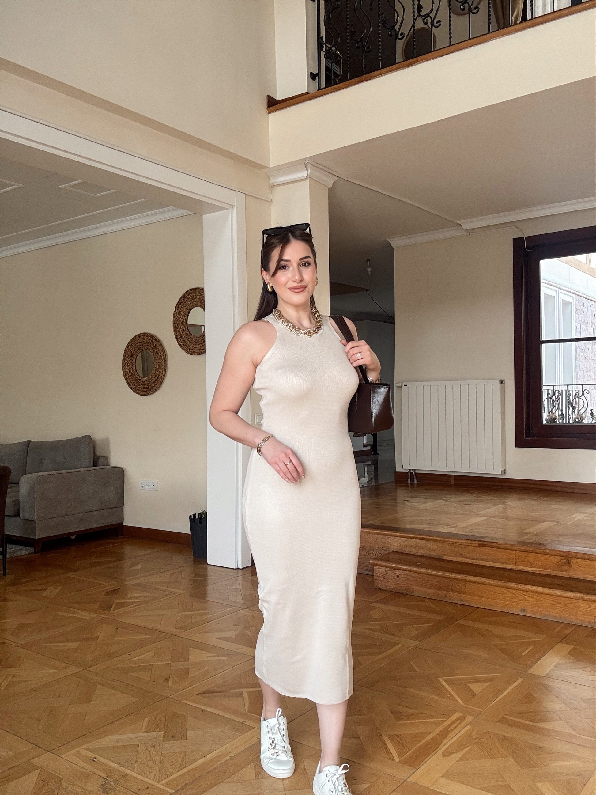 Kolsuz Triko elbise Bej