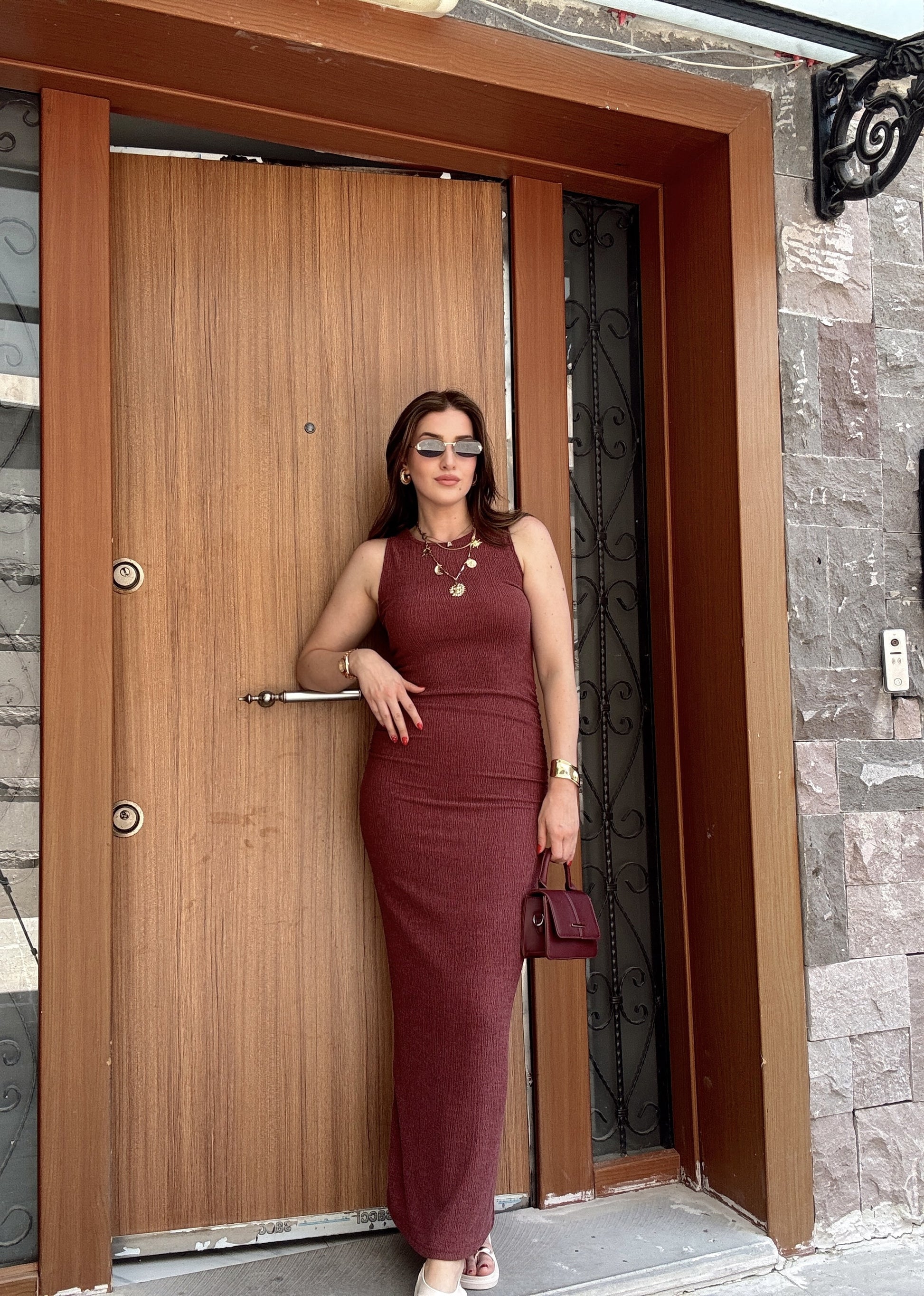Krinkıl yan lastik büzgülü kolsuz elbise BORDO